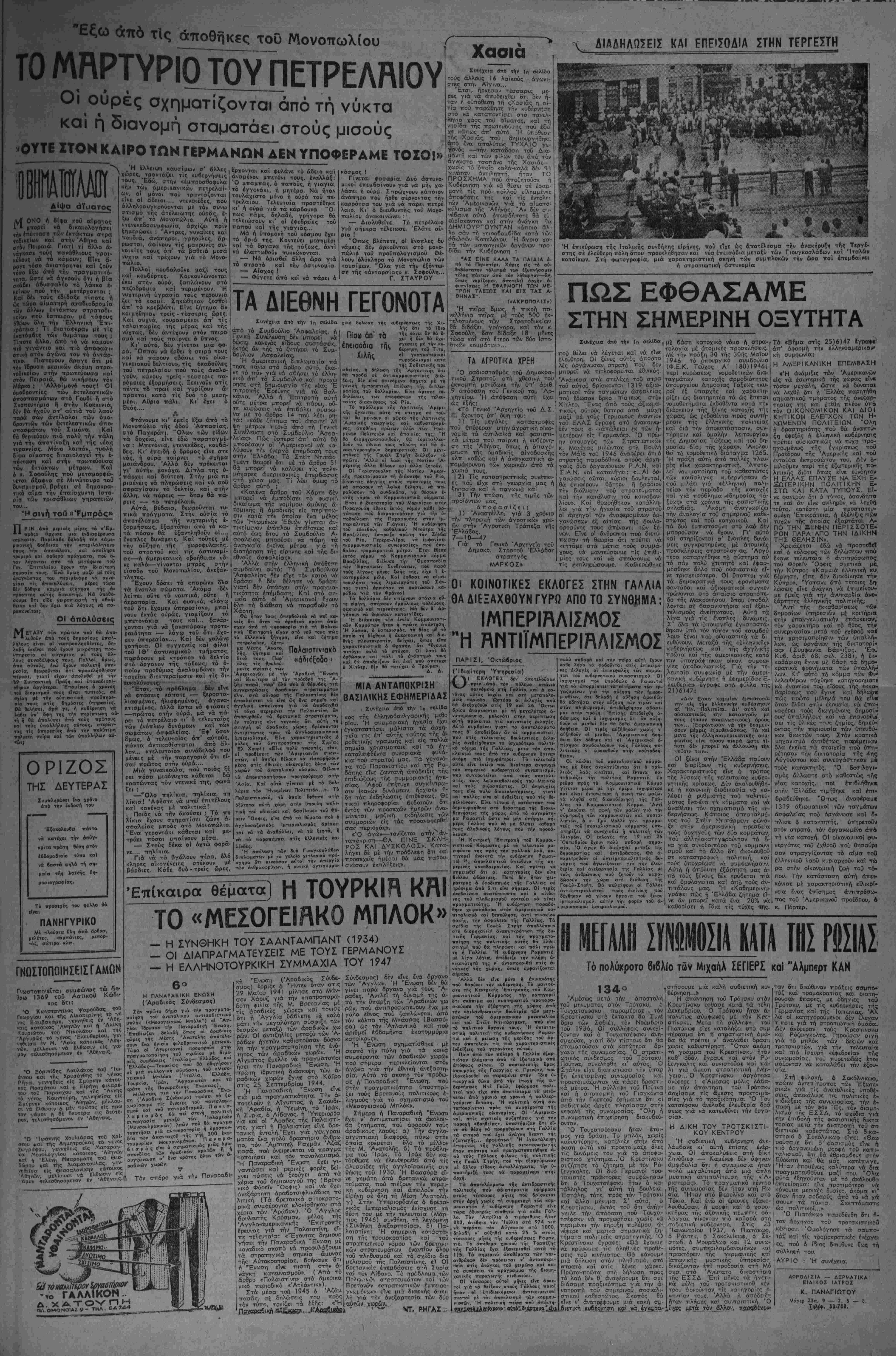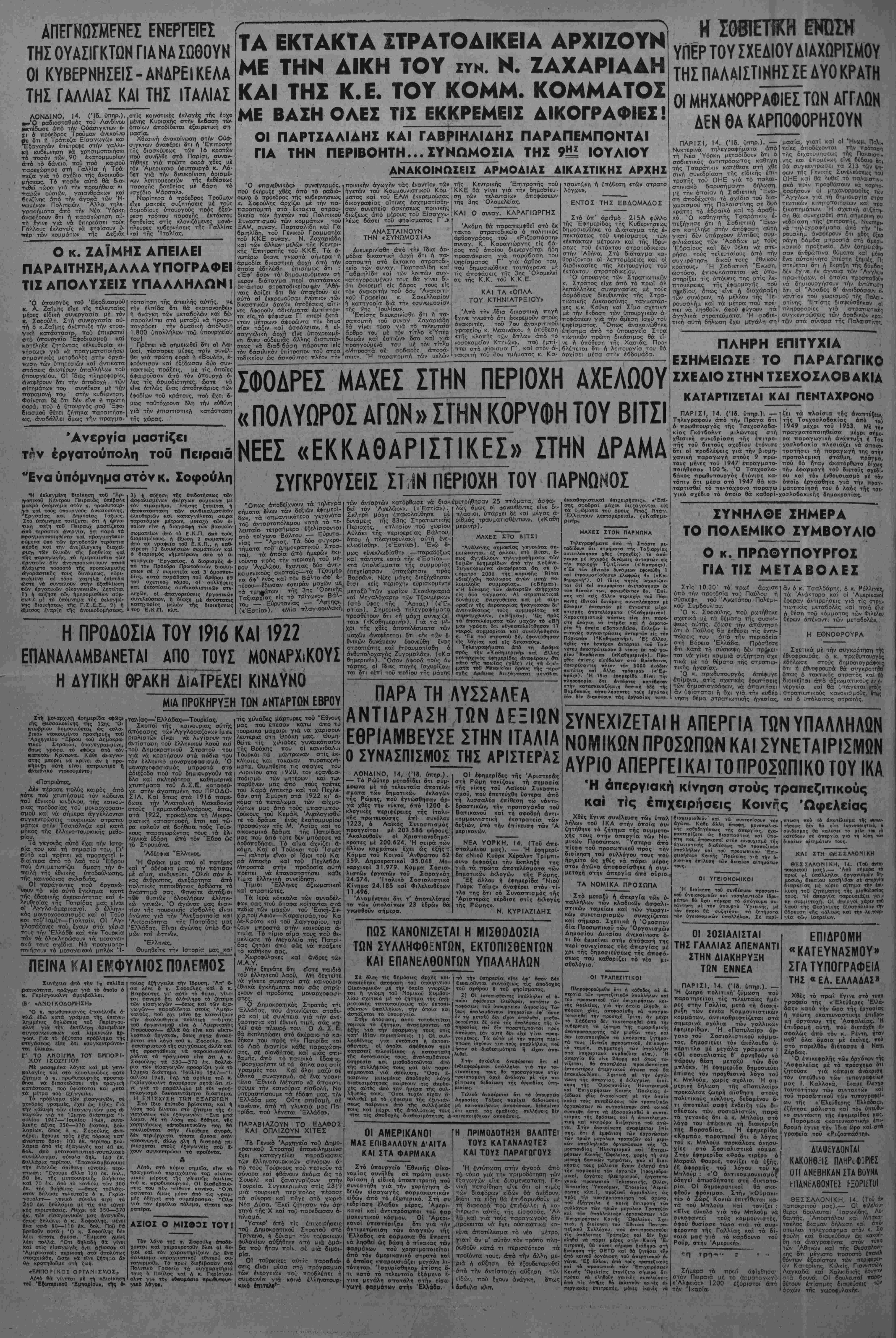 καια μα< γιά τό κάρβουνο τού Ρούρ, στήν Άμερική». Σημερα τό πρωΐ άφίχδησαν στόν Πειραια μέ τό άρματαγωγό «Άλφειός» 1200 έξόριστοι άπό την Ικαοία ΕΠΙΔΡΟΜΗ «ΚΑΤΕΥΝΑΣΜΟΥ» ΣΓΑΤΥΠΟΓΡΑΦΕΙΑ ΤΗΣ «ΕΛ. ΕΛΛΑΔΑΣ» Χθές τ ό πρωΐ ϊγινε στό τιιιτο γραφε'ιο τής «Έλεύθερης Ελλά¬ δος» κατά την ώρα τής εργασίας ή πρώτη «κοτευνοστικη» έπιδρο- μή όργάνων τής Ασφαλείας. Ή έπιδρομή αυτή, πού διετάχθη ό* σφαλώς άπό τόν κ. Ρέντη, ήτο» καθ* όλα δμοια μέ έκείνις, ηθύ στό παρελθόν διέτασσε ό Ναττ. Ζέρβας. Ό έ τη κεφαλής των όργάνων τής Ασφαλείας μέ τό πρόσχημα 8τι ζητούσε γιά κάποια άνάκριση τόν ύπεύθυνο των τυπογραφείον μας Ι. Κολλονό, £καμε ελίγχο ταυτοτήτων των συντακτών κο:,1 τοΰ προσίοττικοϋ των τιιπογραφίΐ- ών τής «Έλεύθερης Ελλάδος», εζήτησε μάλιστα καΐ τόν ύπΐύθυ- νο συντάκτη τής εφημερίδος μας. Πορόμοια «κατει/ναστική» έττι· δρομή έγινε την ϊδια ώροι κβί 'τ" γραφεία τοΰ «Ριζοσπάστη». Δ!ΑΦ;ΥΔΟΝΤΑΙ ΚΑΚΟΗΘ:ΊΣ ΠΛΗΡιΦΐΡϋΣ Οί) ΔΝίΐΒΗΚΔΝ ΣΤΑ ΒυΥΝΑ Μ1ΑΝ6ΛΘ0ΝΤΕΙ γΞΟΡΙΠΟΙ ΘΕΣΣΑΛΟΝΙΚΗ, 14. (Τοΰ ά» ταποκριτοΰ μας).— ΟΙ Φΐλελ:ι>-