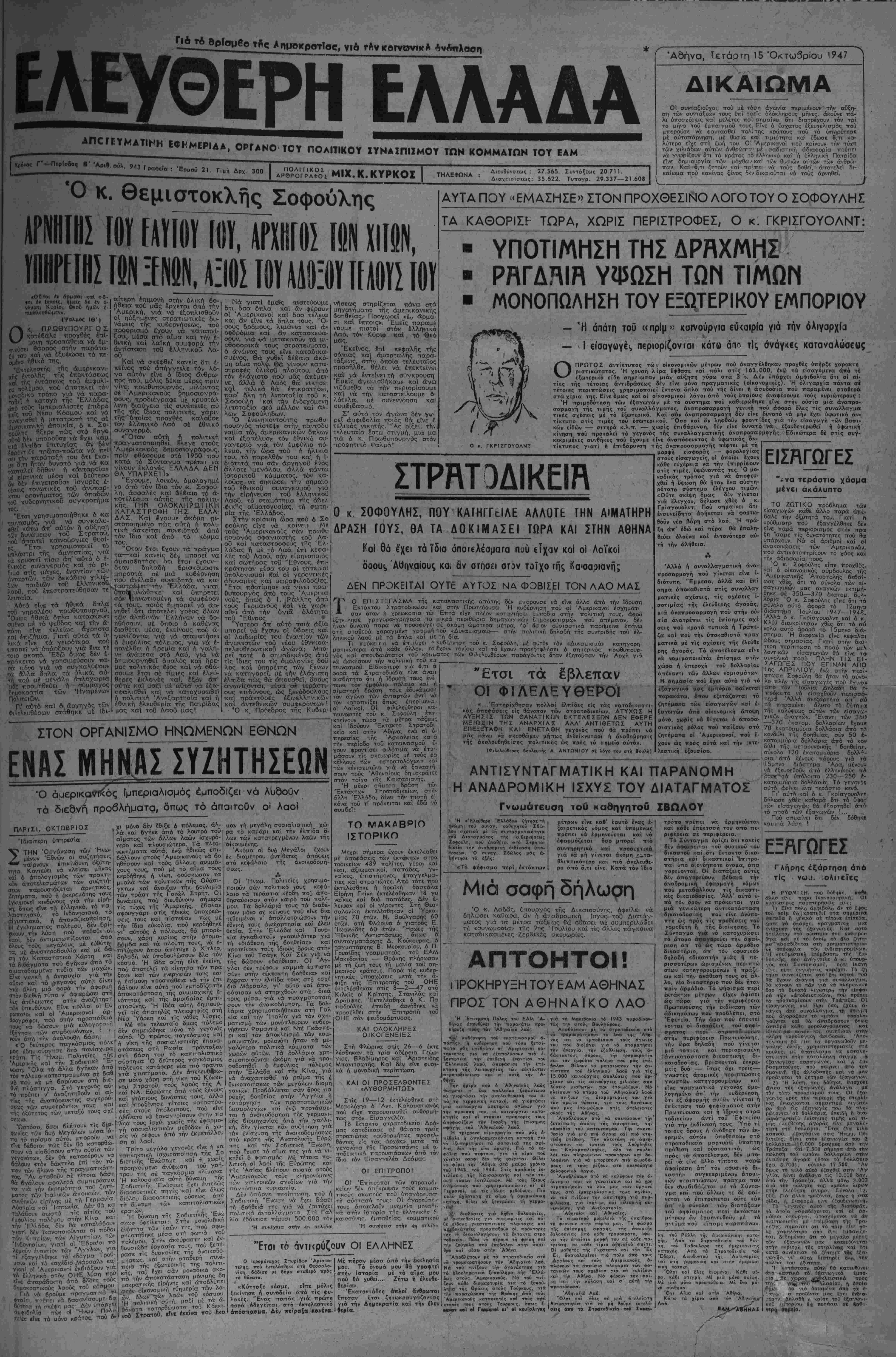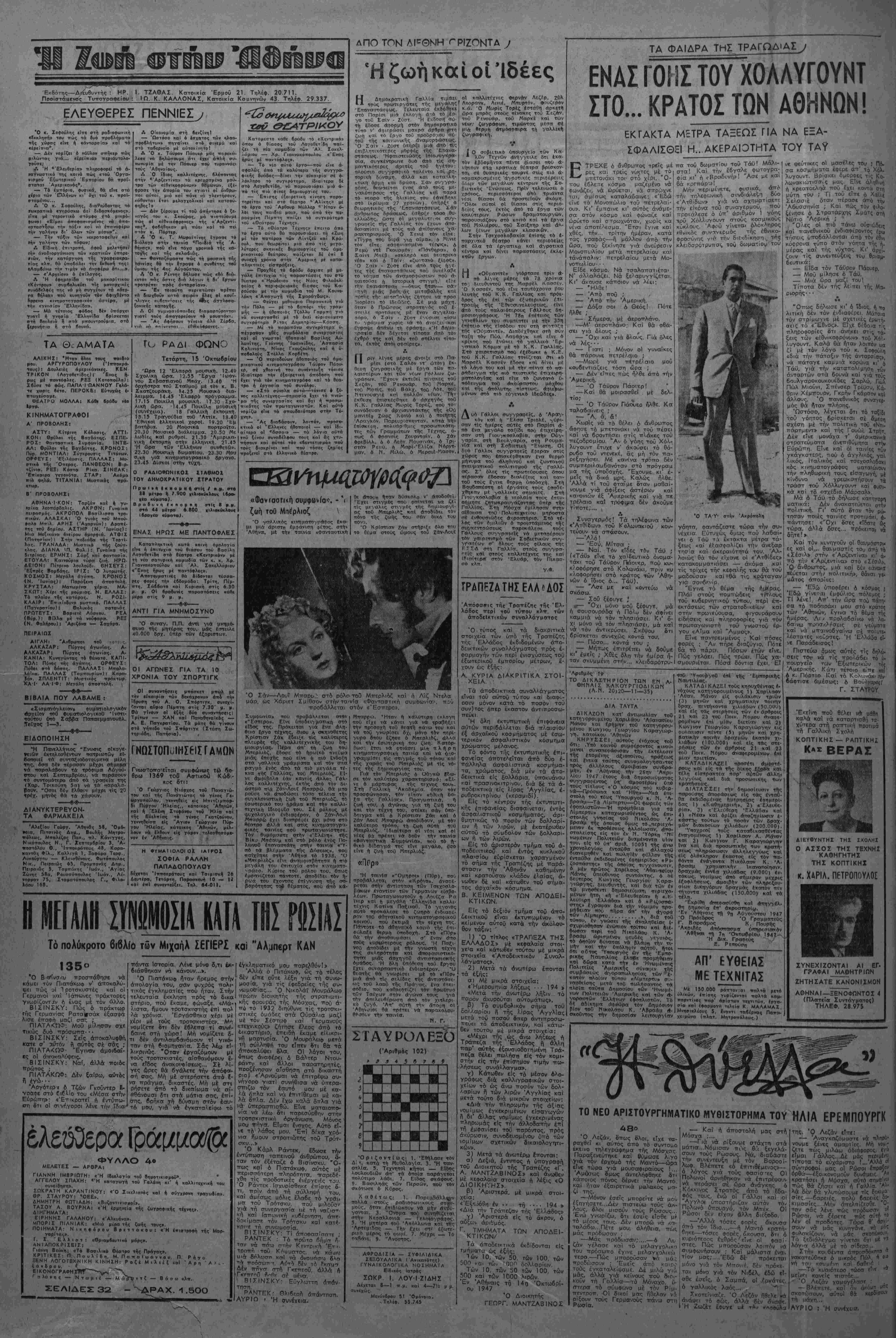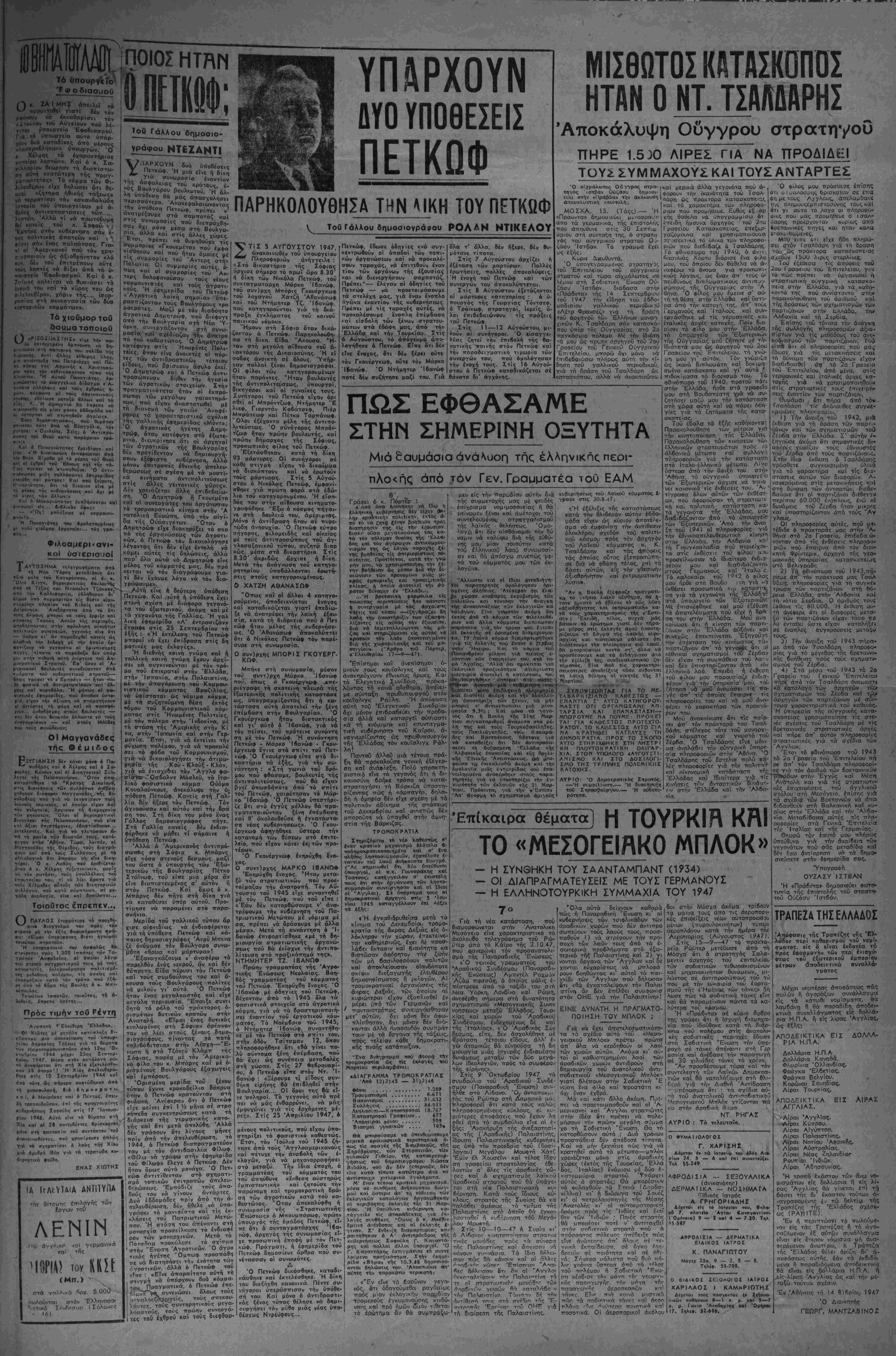 σιν <.Παναγισ» "Αρτης». 'Από το τη. λεγράφημα αϋτό έξάγεται δτι οί επι· Αέσεις των άνταρτών κπεξετάθηο-οιν ο- πό τόν 'Αχελώο έγγύτατα πρός την ττι- ριοχή τής Άρτβς. "Οσον Αφορα τα Α. ποτελίσματα- των βύο αυτών βιιγκρού- σεων, τό έπίσημο τηλεγράφημα άναφ{. ρει ίτι «έκ των ήμετέρων έτρβνμοτί. σθησαν βύο», ένώ γιά τοΰς άντϊρτις λέει... εφονεύθησαν 21. Στο σημερινό δεΧτίο τοθ υπουργείον Δημοσίας Τάξεως ττεριλαμβάνεται καϊ τηλιγράφημα άπό την Καβόλλα, μέ τό όποΐο λανσάρΐται καΐ επισήμως η νέα σκευωρΐα τής 'Ασφάλκιβς ΚηθσΧλβς γιά την άνεύρεση 220 ίίπλων στιι θέβη Καρά-Όρμσν τής Καβάλλας. ΤΑ ΕΚΤΑΤΑ ΣΤΡΑΤΟΑΙΚΕΙΑ ΟΙ ΑΙΚΕΣ Ο' ΑΡΧΙΣΟΥΝ ΜΕΧΡΙ ΤΟ ΣΑΒΒΑΤΟ Ή αρμοδία διεύθυνση τού υ¬ πουργείον Στρατιωτικών μέ 4γ- γραφό της πρός τόν εΐσαγγελέα τθΰ Πενταμελοΰς 'Εφετείου ζητεί η ω έώ μ την Αποστόλη των ^ δικογραφιών, πού άΦορουν τ ματα ττού έμπίπτοίν στό ψήφι σμα Γ'. Στό μεταξύ ό διοικητής της Α¬ μύνης Πρωτευούσης ΰποστράτηγος κ. Γοΰλας, ποΰ μέ διαταγή τού κ. Τ.τράτου, θα άσκεΐ την ποινική άγωγή, συνεργάσθηκε σήμερα τό τφωΐ μί τό διοικητή τού δικαστι- κοΰ τΜήματος τής περιοχής τού έκτάκτου στρατοδικείου ταγματάρ χη κ. Σταυρόπουλο, προκειμένου νά όρισθοΰν ό πρόεδρος καΐ τα μέλη τής πρώτης δικασίμου τού ίά βτρατόδικείου·, πού προ δ θά άί ί άκου ρα, πύ ρ Λλέπεται δτι θά άρχίσει τίς συνε- δριΑσεις τβυ τό άργότίρβ μέχρι τό Σάβδατο. Έν τφ μεταξύ εκλή¬ θη τηλεγραφικώς δπως £λθει στί)ν Άθήνα άπό τή ©εσσαλονίκη κοΐ άναλάβει καθήκοντα έττιτρότΓου στό, στρατοδικεΐο ό στρατιωτικός διίαστικός σύμδουλος γ' τάξεως ταγματάρχης κ. Στασινόττουλος, μέχρι τώρα έπίτροπος στό ίκτα- κτο στρατοδικεΤο Θεσσαλονίκης. Ό ύπουργός των Στρατιωτικών κ. Στράτος σέ ερωτήση των δή- Μοσιογράφων εάν στό Εκτακτο στρατοδικεΤο Αθηνών θά παρσπίμ φθοΰν οί ήγέτες τής Άριστερός, εδήλωσε δτι τό ζήτημα «ε'νβ κη· Θαρά δικαστικής φύσεως καΐ δτι άρμόδιος εΤνε ό ύπουργος τής Δι- καιοσύνης». "Ο ύποιιργός της Δικαιοσύνην κ. Λαδάς ττού ρωτήθηκε γισ τό Γ- διο ζήτημα απήντησεν ώς_ έ^ς1 .■ ©ά γίνει δ,Τΐ λέει τό ψήφισμο». ΟΙ ΑΜ-Ρ1ΚΑΝ01 ΑΡΝΟΥΝΓΑΙ ΝΑ ΔΕΧΘΟΥΝ ΤΗΝ ΕΙΣΑΓΟΓΗ ΤΗΣ ΑΝΑΓΚΑΙΑΣ ΠΟΣΟΤΗΤΑΣ ΦΆΡΜΑΚΟΝ Νέβ *ξύτ—η βκχφωνίσ ίεεδηλώβη μεταξυ των "Αμερικανόν άφ" ενός κσί των ύ—ρεσιών τ*ϋ ΟπουργεΙου Έθνικής ΟΙκθνομίας κοΛ β&χ, «κίΐρο- σώπων των φσρμσκεμπόρων Αψ' ίτί ρου, γ»* τό ςητημα τής εΐσαγωγής φαρμακων. Συγκεκριμένσ, ένώ οί "Ελληνες ίζήτησατν νΛ ιΐσίτγονται κογτ* μήνα 250.000 φιαλΐ&ια ττενιχιλ λίνης, οί 'λμερικανοι 45έχβΐ>κ«ν μό¬