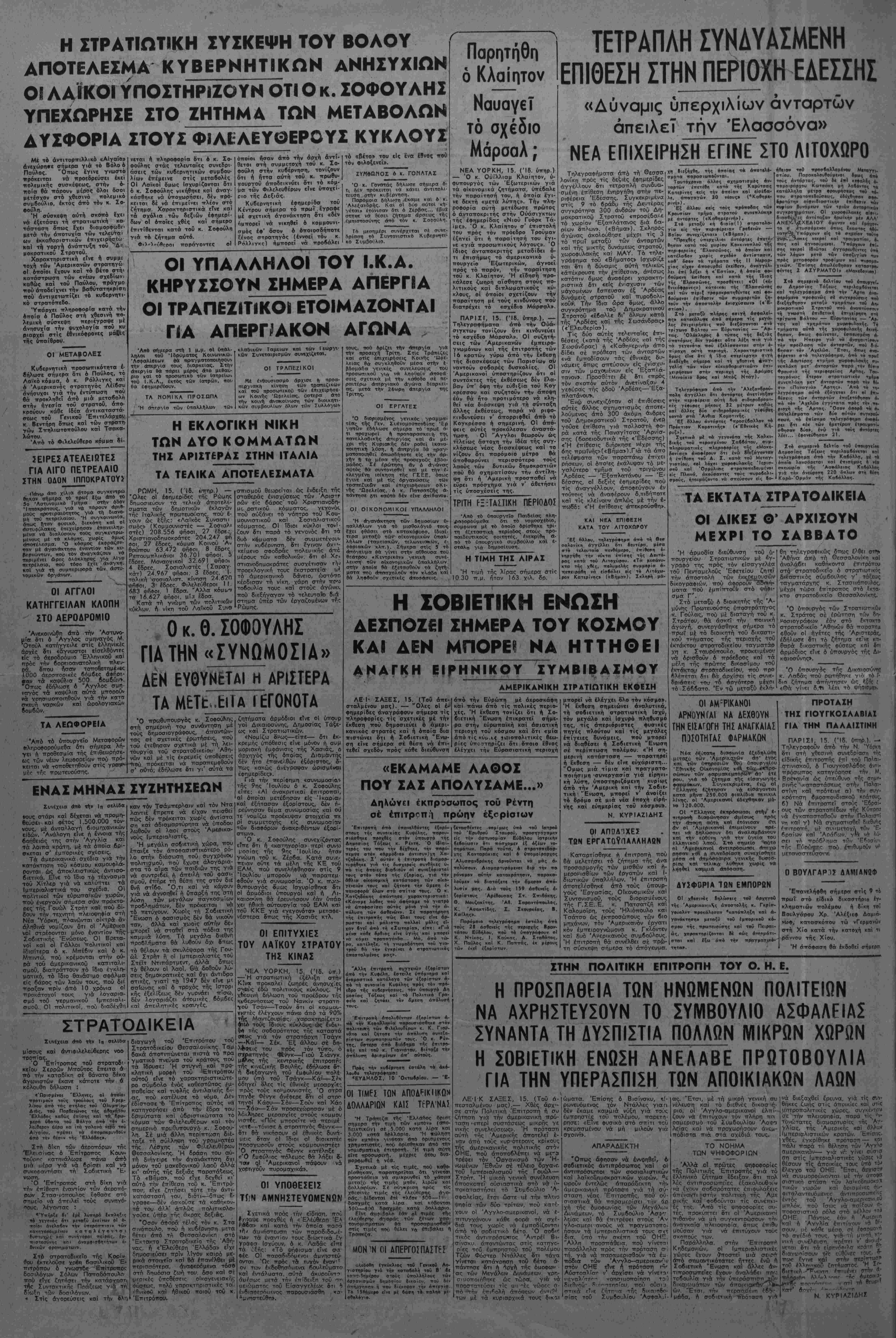 άπό τό σο6ιετικό 6έτο. Ό σο6ι<· τικός άντιπρόσ&χτος Άντρέϊ Βι- σίνσκυ. άπσντώντας στΐς κατηγο- οίες τού έμπρηστοΰ τού πολέμου Τζών Φόστεο Ντάλλες δτι τάχα γίνεται κατανοήση τοθ 6έτο ά- πάντησε δτι ή Λρχή τής όμοφω» άς των Μεγάλων Δυνάμεων, χρη- σιυοποιήϋηκε ώς τώρα, γιά νά ποοστατεύσει τίς υιι -ές νώοεο σ- πό Ήήν έπι^ολή άπόιϋεων Α έ α ά ή ή των μέ τα κυριαρχικά τους δικαι ώμστσ. 'Ετπσης ό Βισίνσκκ, *.'· ρωνευόμενος τόν Ντάλλες γισπ δέν έκαμε καμμιά νύξη γιά τοϋς έμπρηστές τού πολέμου, παρετή¬ ρησε: <.ΕΤνε φυσικό στό σπίτι τού κρεμσσμένου νά μή μιλούν γιύ σχοιν». ΑΠΑΡΑΔΕΚΤΗ Όπως άφησαν νά έννοηΘεΤ, 6 σοβιετικάς άντιττρόσωπος καί οί άντπτρόσωττοι των σοσιαλκ/τικών καΐ λαϊκοδημοκρατικών χωρών, ^ ωροΰν εντελώς άπσράδεκτη τή·, άμερικανική ττρόταση γιά τή σύ- σταση νέας Έττιτροπης, πού ον· σιαστικά Θά παραμερίσει την άρ χή τής όμοφωνίας των Μεγάλην Δυνάμεων, τό Συμβούλιο 'ΛσΦ'.' λείσς καΐ Θά έττιτρέψει στούς Άν γλο-αμερι σνούς νά ττραγματοποι ησουν τα Ιμττεριοΐλιστικά τους σχ^ δια, ύττό την σκέπη τού ΟΗΕ. "Αλλη τΓΌοσπαθεκϊ, πού γίνεται παράλληλα πρός την πρόταση ο·Ί τή, γιά νά παρομερισθοΰν τα έυ ττόδιο των Άγγλο—αμερικοτνΑν στόν ΟΗΕ εΤνε ή ττρόταση ρ*' ΑύστοσλίσΓ ν' άρχίσει νά ■ι'τγγ-, γοησιμοττοίηση ΰ- ί·:τ'·ττηο'ηα, ^ποΓι βτικά εΤνε ίήτΓ'ΐιτ τής ί σίας τοΰ Συμβουλίου άς. "Ετσι, μέ τή μικρή γενική συ νέλευση καΐ τό διεθνές δικασ ή- ριο, ο! Άγγλο-αμερικανοϊ έλπί- ζουν νά επιτύχουν τόν πλήρη ππ οαμερισμό τού Συμδουλίου Άσφτ λείας καΐ νά προχωρήσουν άνεμ- ττόδιστα τπά στά σχέοιά τους. ΤΟ ΝΟΗΜΑ ΤΩΝ ΨΗΦΟΦΟΡΙΩΝ λ Άλλά οί πρώτες ψηφοφορίες τής Πολιτικής Έπιτροπής γιά τό έλληνικό ζήτημα έδειξαν 8τι πολ λες άντιπροσωπεΐες έξακολουθοκν νά έχουν σοβσρότατες έπιφυλάξειτ άττέναντι -στήν πολιτική τής 'Αμϊ ρικής καΐ φοβοΰνται τίς συνέπει- έζ της. Άπό τίς ψηφοφορίες συ- τες, προκύπτει δτι οί 'Αμερικανοϊ ττιθανόν νά μή συγκεντοώσουν τη*- άναγκσία πλειοιρηφία, δττως έττιθυ μοϋσαν γιά νά επιτύχουν τούς σκοπούς των. Ποράλληλα, στήν 'ΕπιτροττιΊ Κηδεμονιών, οί (μττεριαλιστικές χώρες εχουν ι"/ποστεί μιά σειρ<^ άττό στ1μ^^ντικότατε^ ή"ττες, ένώ Λ Σοβιετική "Ενωση και δλλες άν¬ τιπροσωπεΐες ίγουν άναλ-ίβει ττρ'·. τοβουλίπ γιά την ΰπερσστπση^ιφν α γιά την δικαιωαάτων των ών. "Ετσι, την ■ηιρσπ,άίντι μάδα, Λ σοδιετική ττρόταση βσ γι* νά διεξαχθεΐ ϋρευνα, γιά τίς σνι- Θήκες ζωής στίς άποικίες κα'ι ιπις μπτροπολιτικές χώρες, συγκέντρ',' σε ' την πλειοψηφία, παρά τϊς( *ν· τονώτατες διαμαρτυρίες τής Ά,'- γλίας, τής Άμερικής καΐ δλλκκ ίμπεριαλιστικών κρατών. Έπίσης. χθές, έγκρίθηκε πρότσση — πάλι παρά τή Θελήση των Ά οτμερικανών— γιά νί: γίνει ο-ρ στΐς Ιμπεριαλιστικές κώρίί V θέ ί άί ρ ς μπεριαλιστιές κώρί V θέσουν τίς άποικίες τους υπό το^ Ιλεγχο τοΰ ΟΗΕ. Ετσι, αρχισή νά συμμορφώνονται μέ την άττοφο: σιστική στάση των λαΐκοδηιιακρτ τικών χωρών καί όρισμένες όμ- φιταλαντευόμενες άντιπροσΐοτΈΐ'ί έντός τοΰ Άγγλο-αμερικσνι,θ'θ μπλόκ, πού ίσως νά παίϋουν «■ ποφασιοτικό ρόλο στό ιαέλλον τί» ,ΟΗΕ. Πάντως, εάν η Άμερΐ'·π και ή Αγγλία έπιτι'ιχου" νά δ'· σουν, ιιέ κάθε μέσο, σέ έφσρμο·"ΐ τό σχίδιό τους, γιά ~ιΊ μ^κοή Υ"· νικ-ή σονέλευση. πρίπει ν' σνο^ νεται δτι τα είρΓνΟΛιλσ κράτη Ρ διανω^ίσουν τ,ί'ς ε'-θΰνες τους, "' ποις ?γινε κΰ! στην περ/τττωϊ'1 τοθ ίλλπΜΐχου εητήυατος. Η *9" βΐΓΤΐκή 'Τνοηη ίπιυίνει στην Λ- κβτ Λ τΓταΓ'··Γ ν ηττ! τΛ " ι*"~-·'^"ίτη Ν. ΚΥΡΙΑ2ΙΔΗΣ
