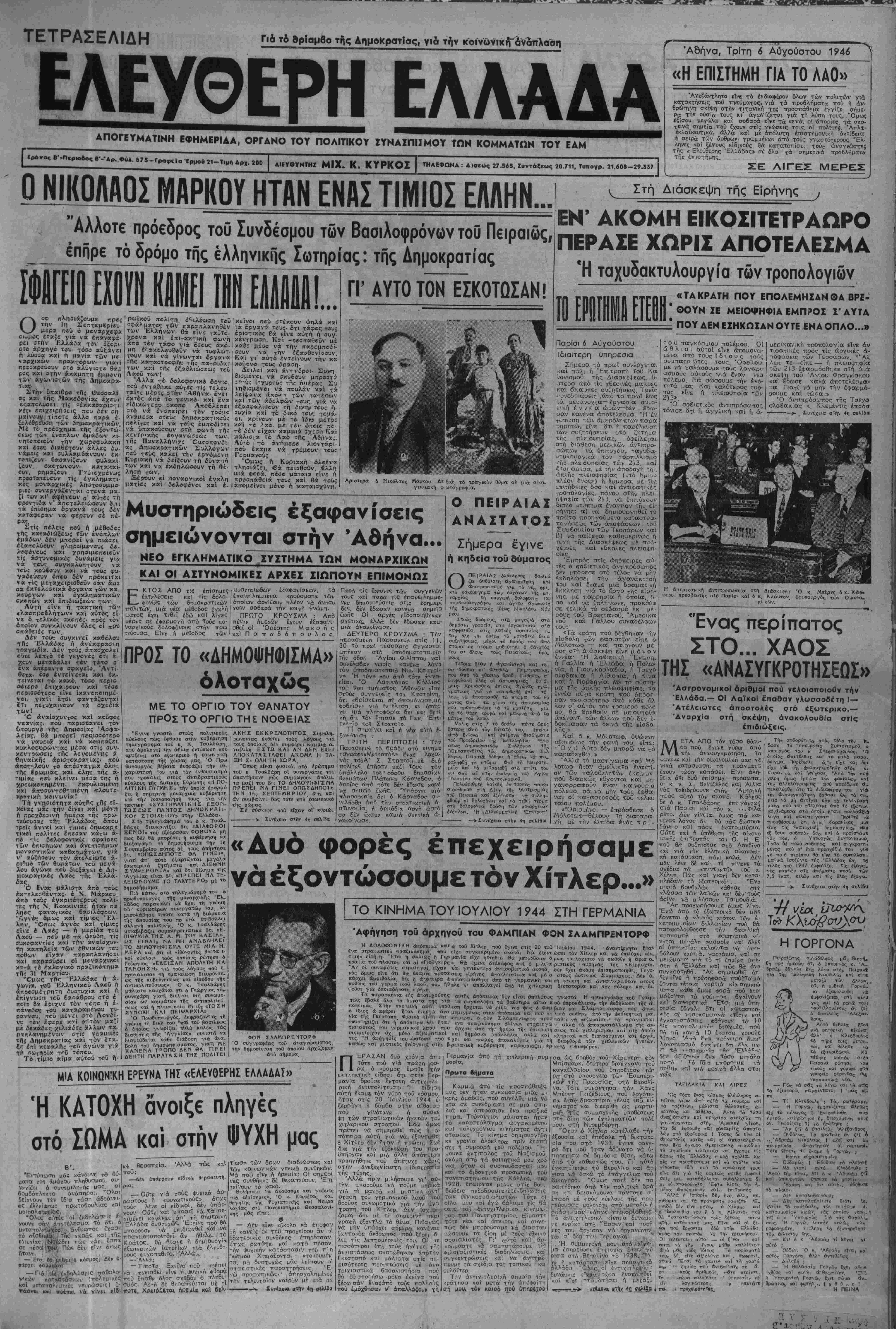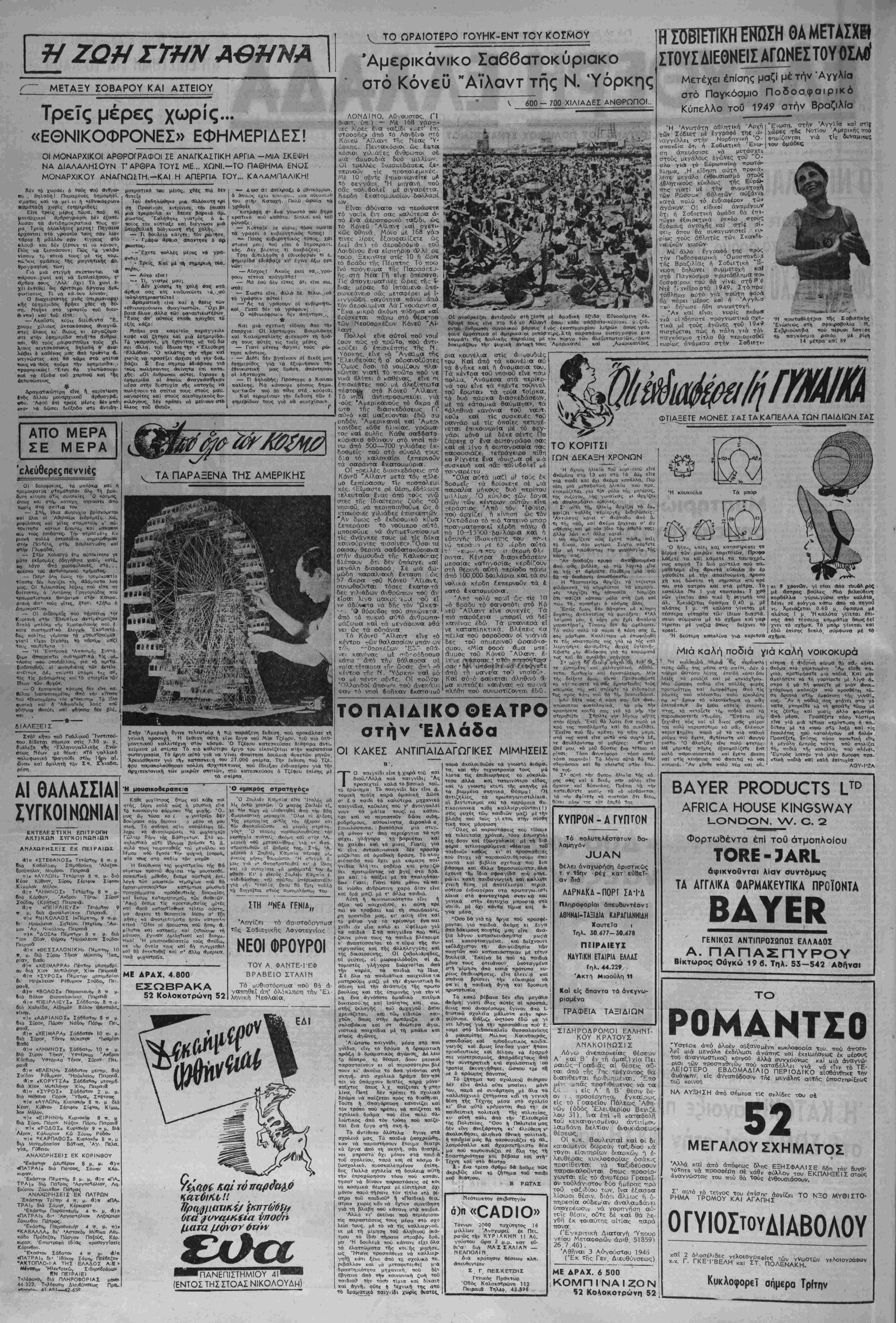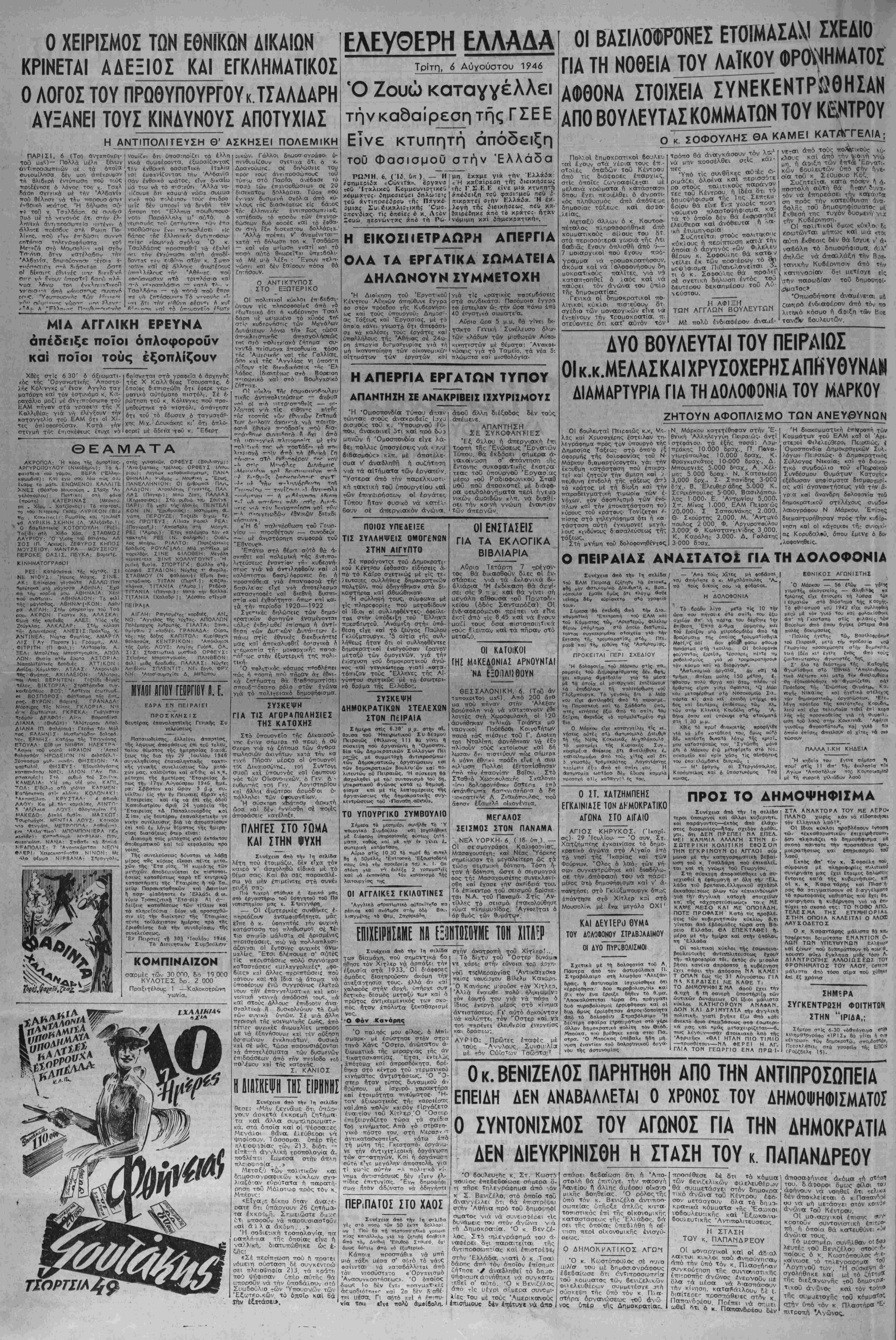 Άδήνα, Τρΐτη 6 Αύγούστου 1946