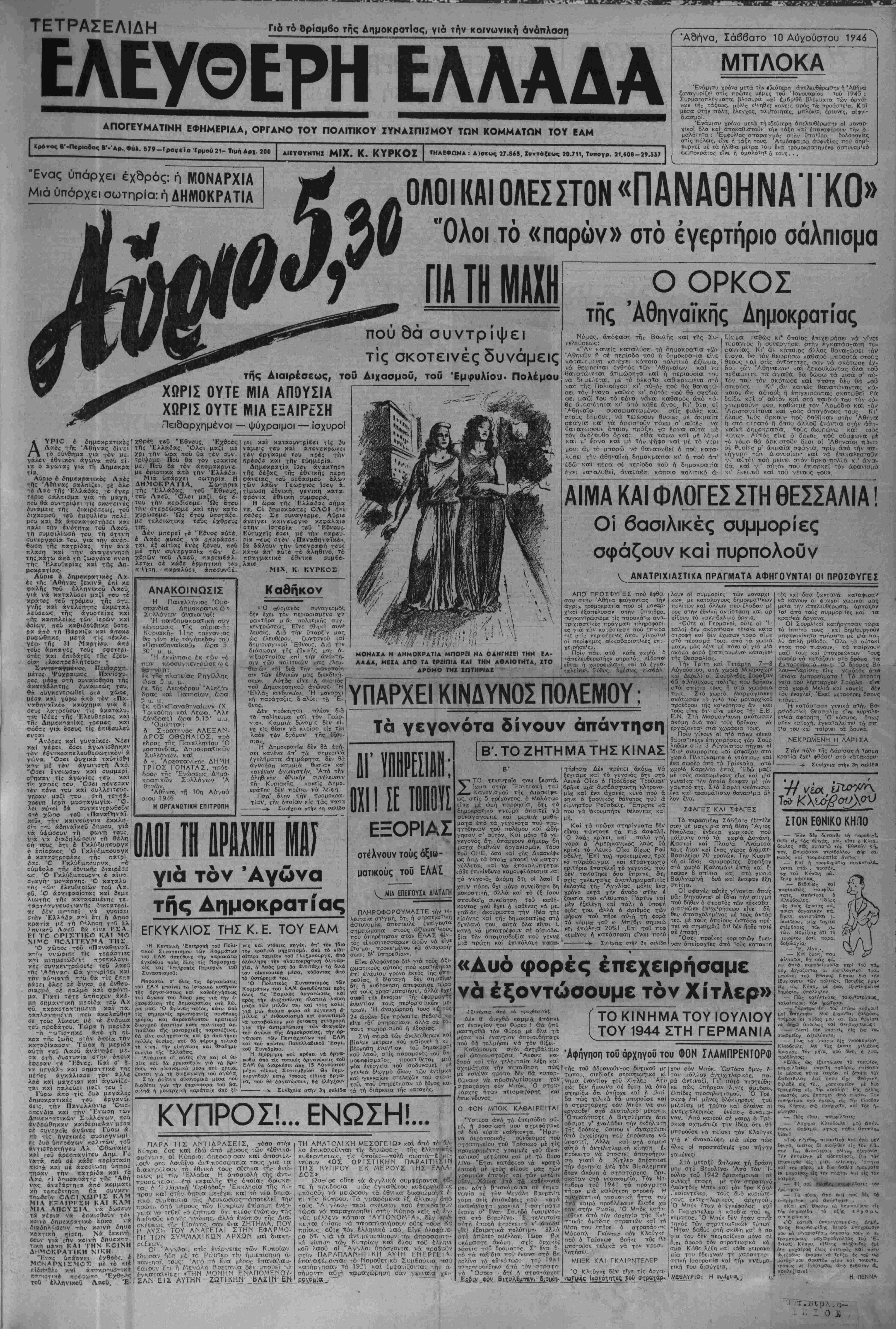 "Ενάμισυ χρόνο μετά την #3εύτερη άττελευββρο>ση> ή Άθή"ν<ί ξανοτγυρίζε1 στϊς πρώτες μέρες τοΰ Ίοτνουαρίου τοΰ 1945 : Συρμα-οπλέγματα, βλοσυρά και έμ6ριθή βλέμμαια των όργά- νων τή: τάξεως, μόλ'ς κ'νηθεί κανείς πρός τα προάστε'σ. Κ αί μέσβ στήν πόλη. έλεγχος, ται/τοτητες, μπλόκα, έρευνες, αΐφνΐ- διασμοϊ. 'Ενάμισν χρόνο μετά τήιδεύτερη άπελευθέρωση» ο! μοναρ- χικοΐ δλο καΐ άποκαθ.στοΰν την τάξη καΐ έπαναφέρουν την ό- μβλότητα : 'Εμφύλ'ος σπαραγμό: στήν ΰπαι9ρο δολοφθνίες στϊς πόλεις, είνε ή τάξη τους. Αιμόσψαιρα άσψυξίας πού δημ1- ουργεϊ μέ τα ήλίθια μέτρα "Ου Ινα -ρομοκρατημένο άστυνομ'κό ψευτοκράιος εΤνε ή όμαλότητ α τοας. . , •Ενας ύπάρχει έχσρός: ή ΜΟΝΑΡΧΙΑ Μιά ύπάρχει σωτηρία: ή ΔΗΜΟΚΡΑΤΙΑ ολοικαιολεσστον«ΠΑΝΑΘΗΝΑΊ'ΚΟ» "Ολοι τό «παρών» οτό έγερτήριο σάλπισμα ΠΑ ΤΗ ΜΑΧΗ πού δα συντρίψει —· ι Α ΥΠΟ β δημ*κρατικ&; Λ*ό; της Αθήνας ίίνει το ούνθημχ γιά χον με. χλ^· εθνικόν άγώνα πβύ ΐί- νέ ό αγώνας γι« τή Δ τί». Αίίριο 6 <5ημβκρ«τικος Λ»ο; τής Αθήνας αχλπιζει, αέ βλβ τέ Λαβ της Έλλάίας. το έγΐρ τήριο σάλπιαμχ γιά τή μάχη, ηίί> θά ουνχριψει τίς οκβχεινές