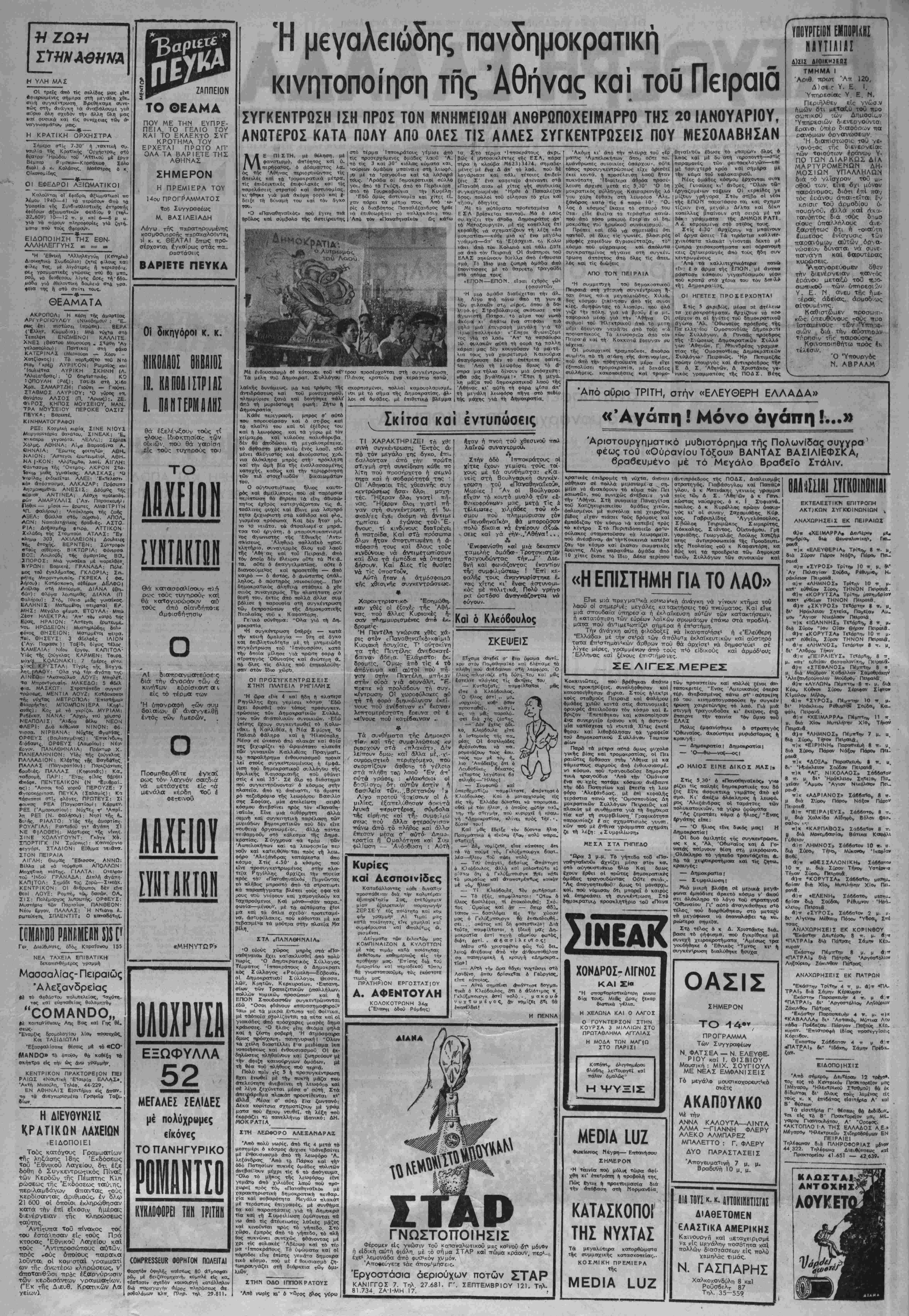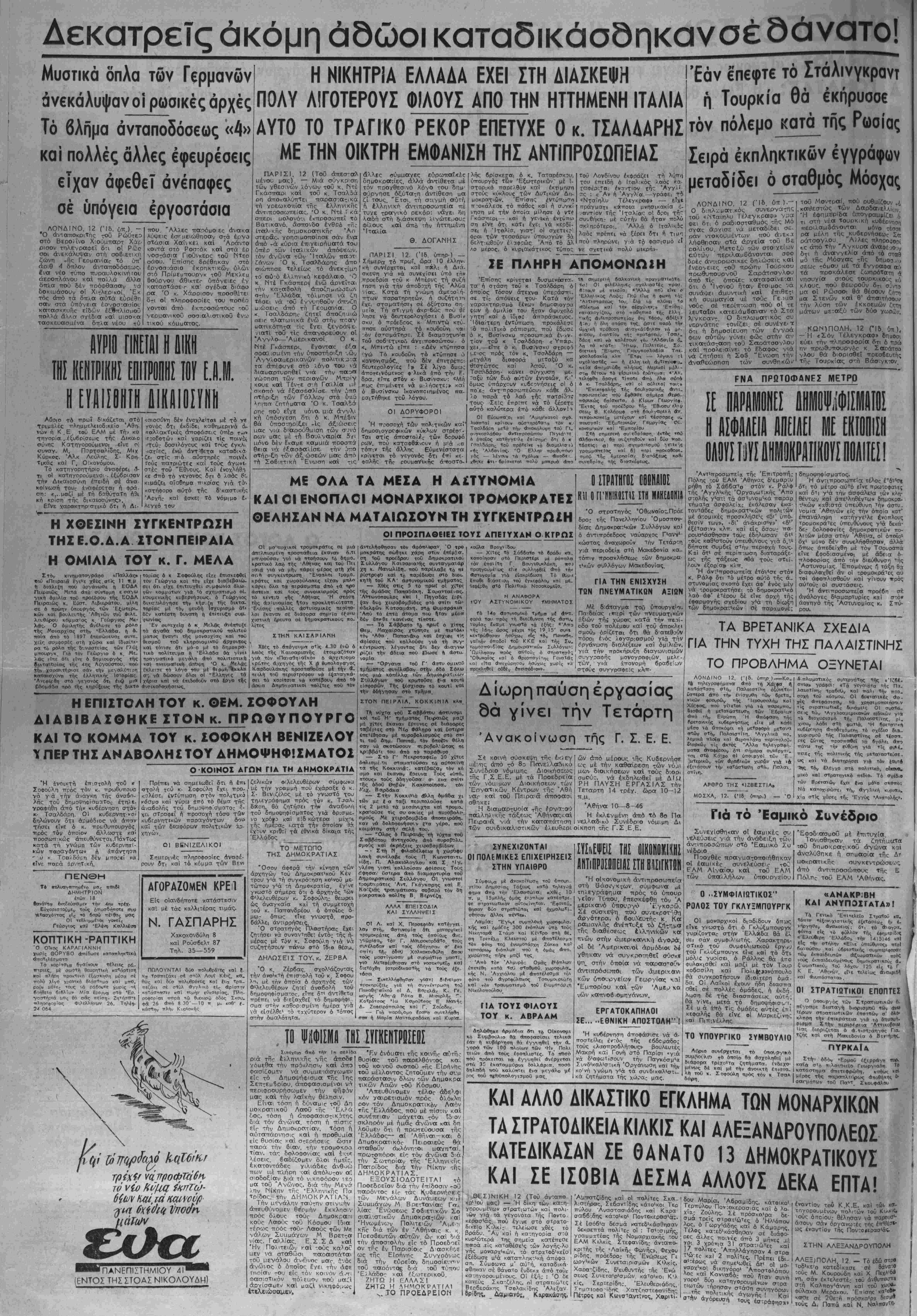 νήργησιν ανακοινοί; 6τ, τά *<αγρ«. φέντα είς τό φύλλον τής έφημερι&,ις «Έλεθβερη Έλλάδσ» την 14)5)46 κσΐ είς την στήλην «ΕΙιι ύττεύθυνος» ττεοΐ βααύσου κα! ύβρισΤΐκής συμτΐερΐφοράο τών εκτταιδευτών αξιωματικών πρός τούς έκπαιδευομένους δημοκρατικού(: α. ξωμστΐκούς τού λόχου 125 είς τ0 Γ Κ Ε. Αθηνών, ςΓνι τελείως ανακριβ^ καϊ άνυττόσταταη. ΟΙ ΣΤΡΑΤΙΡΤΙΚΟΙ ΕΠΟΠΤΕΣ] Ο ύπουργός των Στρατιωτικών 6. ΐΓίγραψε διαταγή 6«)ρισμο0 τών αν·» τίοων στρατιωτικών έηοττών σ' 6λ6- «λτιοη την έηικρατεια γιά ιο βημοψ'Ι. φισμα Στήν περΐφίρεια "ΑττικοΡοιβ 'ιας διοριζεται 6 ά.τ,ιστ^αηγος Για. τζής και στή ΜοΛεδονίσ 6 Βε»ιήρη<;. ΠΥΡΚΑΪΑ δάρη. ί ήν ηΡ6ς κ Τσα* Ι μέρος τής Ι φαΓμάτων τοθ Παντ Σκουφάλου ΚΑΙ ΑΛΛΟ ΔΙΚΑΣΤΙΚΟ ΕΓΚΛΗΜΑ ΤΩΝ ΜΟΝΑΡΧΙΚΟΝ ΤΑ ΣΤΡΑΤΟΔΙΚΕΪα1(|ΜΚαΤΙλΕΞΑΝΔΡΟΥΠΟΛΕΟΣ ΚΑΤΕΔΙΚΑΣΑΝ ΣΕ 0ΑΝΑΤΟ 13 ΔΗΜΟΚΡΑΤΙΚΟΥΣ ΚΔΙ ΣΕ ΙΣΟΒΙΑ ΔΕΣΜΑ ΑΑΛΟΥΣ ΔΕΚΑ ΕΠΤΑ! ροις ^ ως τής_ Είρήνπς Συγγρόνως διά την εΰρεϊαν δηυοσίει.'Γ"ν τοΰ παοόντοι; δ1 ά τοΰ τύτιου 'Ε/λάδθ' καΐ ίξοηερικοΰ ΖΗ1Ω Η ΕΛΛΑΣΙ ΖΗΤΩ Η ΔΗΜΟΚΡΑΤΙΑΣ ^ ΤΟ ΠΡ0ΕΔΡΕΙΟΓ4 ·....ΘΕΣ)ΝΙΚΗ 12 (Τοθ άνταπο κρ'τού μας) — Ή δίκη των κατη¬ γορουμένων στρατιωτών κοΐ πολι- -ών γιά τά γεγονότα τής Ποντο κερσσςάς. ττοΰ έγ.νε στό στρατο- δικΕϊο Κιλκΐ; τελείωσε χθές τό βράδυ. "Αν καΐ ή κατηγορία σ:ά κυριώτερα της σημεΐα κατέπεσε τταοά τίς καταθέσε'ς των λογής-λο γης μοναρχΐκών, τό στρχτοδ'κεϊο έξέδωσε μιά καταπλρ.κτΐκή άπόφα ση. Σύμφωνα μ' αύΤή, καταδικά- «χθηκον σέ θάνατο ενδεκα άπό τοϋε κατηγορουμένους. ΟΊ έξη; : Ό δέ κανεΰς Σκα-ζέλης, οί στρατιώτες Βεοβεράκης Τσολακίδης Άλεξαν δρίδης Δαοό Κά Άμττσχζίδης καΐ ο! πολίτες Σκα. | λιστήρας. Σεδανΐίδης κάτο'κοι Τεο ' Άναστασιάδης καί Κχρα- Ι ής κάτο'κο1 Ποντοκερασ'ά;. Σέ Ισόβ'α δεσυά κστεδ'κάσθησαν δεκαεπτά ο! γοαμματέας τής Νομαρχιακής __ ΕΑΜ Κιλκίς Στεφανίδη; άνταπο- κριτής τής 'Λαίκής Φωνής», Φεχου ρίδης. πρόεδρο; τής 'Ενώ.σεως Γί ωργ'κών Συνετα-.ρισμών Κ'λκίς, Χαρα-ζίδης, δ'ευθυντής της 'Ενώ σεως Συνετα'ρΐσμών κάτο'κοι Κ·λ κίς. Σερτερίδη;. 'ΕλευΘεριάδης. 5"ιμ"ΐοφοΜδης Χαχζηστεφανίδης Πέιρςς καΐ Κωνσ'τοιντΐνος, Χαριτι- οκερασ>α;. σμά τρείς σχρατ'ώτέ ό 'Ηλι'