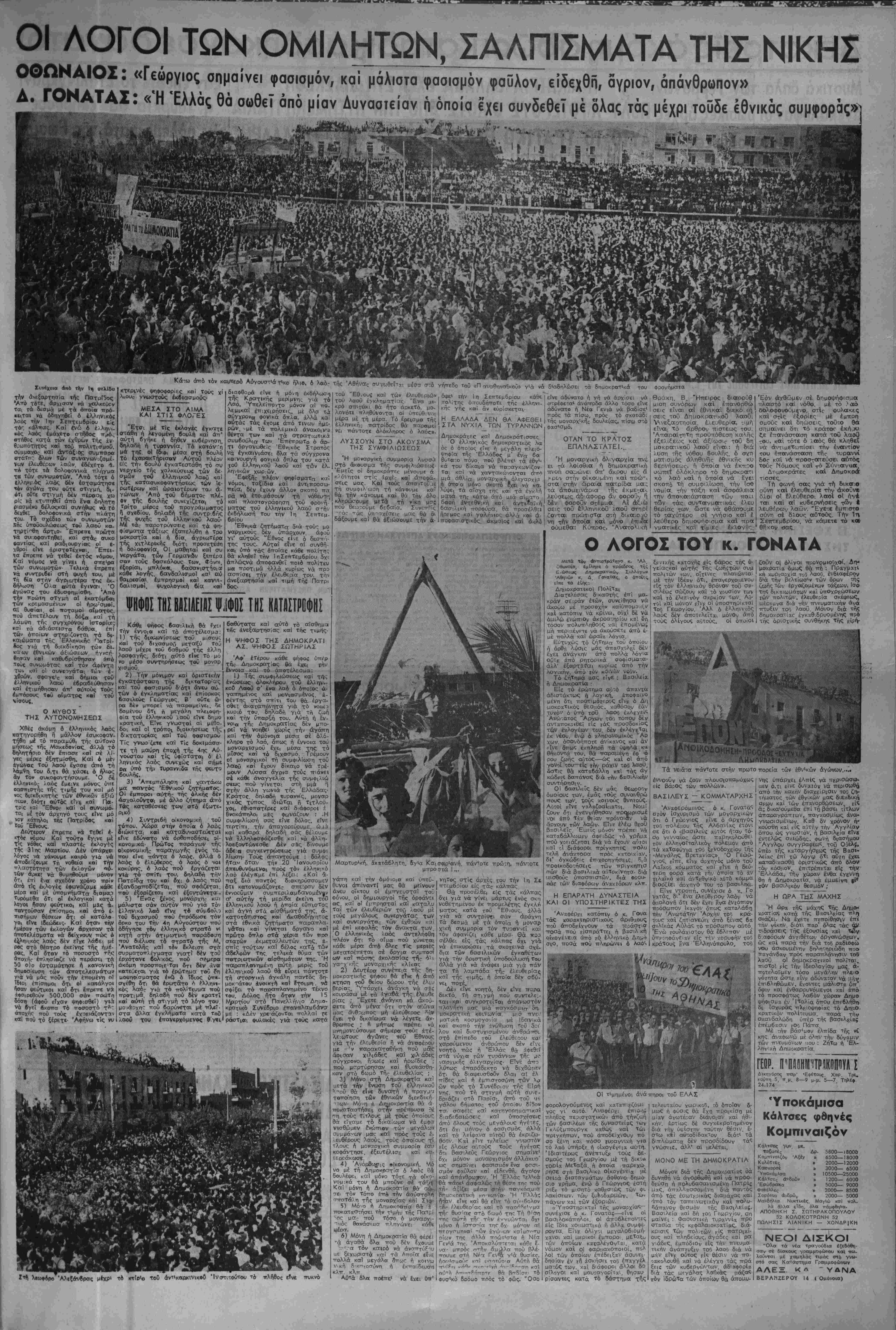 £β<5οι βλων των άοτ/υνομικών τμημχτων. οέν μπόρεσαν' νά άναχαιτίαουν τ.έ> <5ημ«- κρατικό Λαο άπβ ιβϋ νά καταπλημμυοίοει καΐ Τ© γππεδ* καί τα δβυναλάκΐα κ*ί τη λε?υιρέο« Άλεξχνδ,ΐας κχ χί< ηχΡέίουί χαί τβϋς έξώαχεί, γιά νά δώσει τό «παρών» στβ πρβακλητήριβ τής Δημβκρχτίας· β Η χβεοινιΊ συνκέντρωοη εδωοε τάν Ορκ* χοΰ Λαοΰ. Τβΰ Λαβΰ μα« άποςρατι- βμένου νά μην έπιτράΛει πβτέ νά παραβι* σθεΐ ή δέλροη τής μενάλη*; ί·λληνικήί πλ'ΐβ ΨηΦί*ς. νά αη γυοίσε» πβχέ πιά 6 Γκλύξ- μητουργκ καί νά άνακηουχΡεϊ ή Δηιιβκρ* τί» αάν το έρισχικβ κ*ί μόνιμβ πολίτευμα ϋ'Κλλάδ Ό Στρατηγός Αλεξ "Οθωναίος πού 6 λόγος τού υπήρξε ίνα ίχ;γμα πίστεως στή νίκη τής Δο,μοκρατίαο τϋ,,ί "Οπβιβς δημβκρατικέις «Τίε αύτβ τβ χ. τέλειωχβ χΰιιχ νά κ»τχκλύΓ»ι τα πάνχχ, ί ιιπορεΐ νά ιτή Λβκίυαΰε ?νχ συνα·35ηιτα δ Έν& άντίβεχα χό δέος καί ό τρό- μ€ς κχχελαδε τοΰϊ άνάξιβυ; κυδερνήχες κχί τα βργχνά χου; πού ξεπβυληοχν άκομιι κχι τ* Ίερα και χχ βοια, κχι κχτχέχοχνιζβυν και κχτχτυραννβ0ν χην Κλλαόα μονβ ν ι* νχ επιτύχουν την έπιστρβφή χβΰ Ι'κλύ: μπουρνκ- "Κτσι ή Δημβκραχία κέρδισε χην πρώχη μάχη. Οά κερώίοει καί χλλες άκομη, ίυσκο λωχερες χραχύτερες κοιι οκληροχερες «ι, την 1η Γεηχϊμβρίου Γ.«τύ θά ένταφιχίέι έ. ριστικά δ,χι ύπολενμαχχ άπβμείνύυν Ίι; χότε τβΰ «ρχσιβμοϋ. τβύ μβναο)τιομοΰ τή: συνερνκοίχε τ?|«; κ«πηλεί«£ γιά νχ μίι μπβ ρεσβυν ιτβχέ ·ά άνχκύψυυν, Στπ 6αρΐι·/ ττέχρ* πΐιΐυ ίά βχεπχαει τβν χάςρβ βλων αυτών των σκβχεινών δυνά.με. ων τα ένωμένχ χέριχ των 'ΚλΛήνων 6ά νράφβυν : <ι"Ή Δημβ/.ρ*χί« άπήλλαξε τβν ίλληντ- κβ Λχβ άπω τβν κικταοαμένβ ξένβ πβϋ ι σπειρε χην έδνικη διχόνβιχ καί τ«ν έμςρύ- λιβ πβλεμο. »Ή Δημβκρχτΐχ άπήλλχζε τβν ίλληνι κβ Λαο άπβ τβύς κάπηλ(»υί χήί άγνβτητα; καί των ιτα-τριωχΐκδν αΐσθημχτων τβυ, χβϋς π·«ντβτεινούς κχ μβιραίους όλετήρες χ?, Πατρίίας »'Η Δημβ/ρατία ιιέ την ένβτητα βλ«ν των Έλλήνων καί τη βυνεονχβΐ* τ*υς. άβ- νίίει τ© κχινβύογιβ κεφάλχΐ'» τήί ίστβοίΐ'ς τοΰ Λχ«ΰ : τ<Κ άνχνβννήοβως τίς .Ελλά. Γ<^ Ο ΛΟΓΟΣ ΤΟΥ ΣΤΡΑΤΗΓΟΥ ΟΟ0ΝΑΙΟΥ «Μετά τας νόθους εκλογάς, ή συκοφαντία της αύτονομή- οεως, ή τρομοκρατία — άγριωτέρα καί της χιτλερικης — οί φόνοι, οί καννιβαλισμοί, αί ένοπλοι δυνάμεις κατά τού λαοΰ: έ'τσι προετοιμάζουν τό ν οθόν δημοψήφισμα...» ΔΗΜΟΚΡΑΤΑΙ! ΠΡΑΞΑΤΕ ΤΟ ΚΑΘΗΚΟΝ ΣΑΣ! Ό Πρόεδρος της Ενώσεως_Δημθκηα-ΐκών Συλλόγων Αθηνών τέως ΆρεοπαγίΐΗς κ. Δ. Γονατάς την ώρα πού έκψωνεΐ ιόν λόγο τού •Ο ΰπέροχος λόγος ποθ ίξεφωνη. σε χθές στόν «·Πσνα9ηναΤκ6» 6 πρό- εδρθς τής Παντλληνιου Ενώσεως Δημοκρατικήν Σι>λλόγων στρ<ΐτη- γός Αλεξ. "Οθωναίος έχει ώς ε¬ ξής: ,», ΔΓ.υοκράτεο καί Δημοκρά- τισσες, Την Τη Σεπτεμδρίου καλεί¬ ται 6 ' Ελληνικάς Λαός νά έκ,τε λέοει £να καθήκον τού πρός την Πατρίδο: τού νά άποφασί πει ιαέ ποιό πολίτεοΜθΐ θέλει νά κυ'δερνηθΓΪ Τό καθήκον αύτη είναι τό ύττέρτατο καθήκον τταν:ός πολίτου και είναι Ί,οό- τιμο ιαέ χό καθήκον ιτοθ έκττλη ηοΤ 6 στρατιώτης δταν έ μέ τό τουψέκι στά γέρια τ ξ Της Πατρίδος τού ιγμΓ κατά των εξωτερι¬ κών έγθρών τού, ττροασπισ-ης τήΓ ελευθερίας, τής άνεξαρτη- σιας καί της τιμνίο της. Καί λένο τό καθήκον αύ·ό Ισόταιο, τό ε!α ιοχ τό α^λο, διότι την 1η Σεπτεμδρίου καλείται ό Ελληνικάς Λαός υπό συνθήκας εΐδικάς νά προασπισει την ά- ?εοθεοία -ου την άνεε,αρτησία καί την τιμή τού. Ή ήμ^ρα αυτή. άσ/έ-ως ή- αερομηνίθίς, έτοΐμάζετθίι καΐ προετοιμ,ά^εται έπιμ,ελώς Λπό την έπογή πού άττό' τ»ν.4Λΐίϊ !·ΐε- οιά της Ελλάδο^ώς ΐίιν' άΛλΓ, οί πραγματικοΐ "Ε5λην?ς και "Ελληνίδες πάσρς ήλΐκίας ιιέ τ