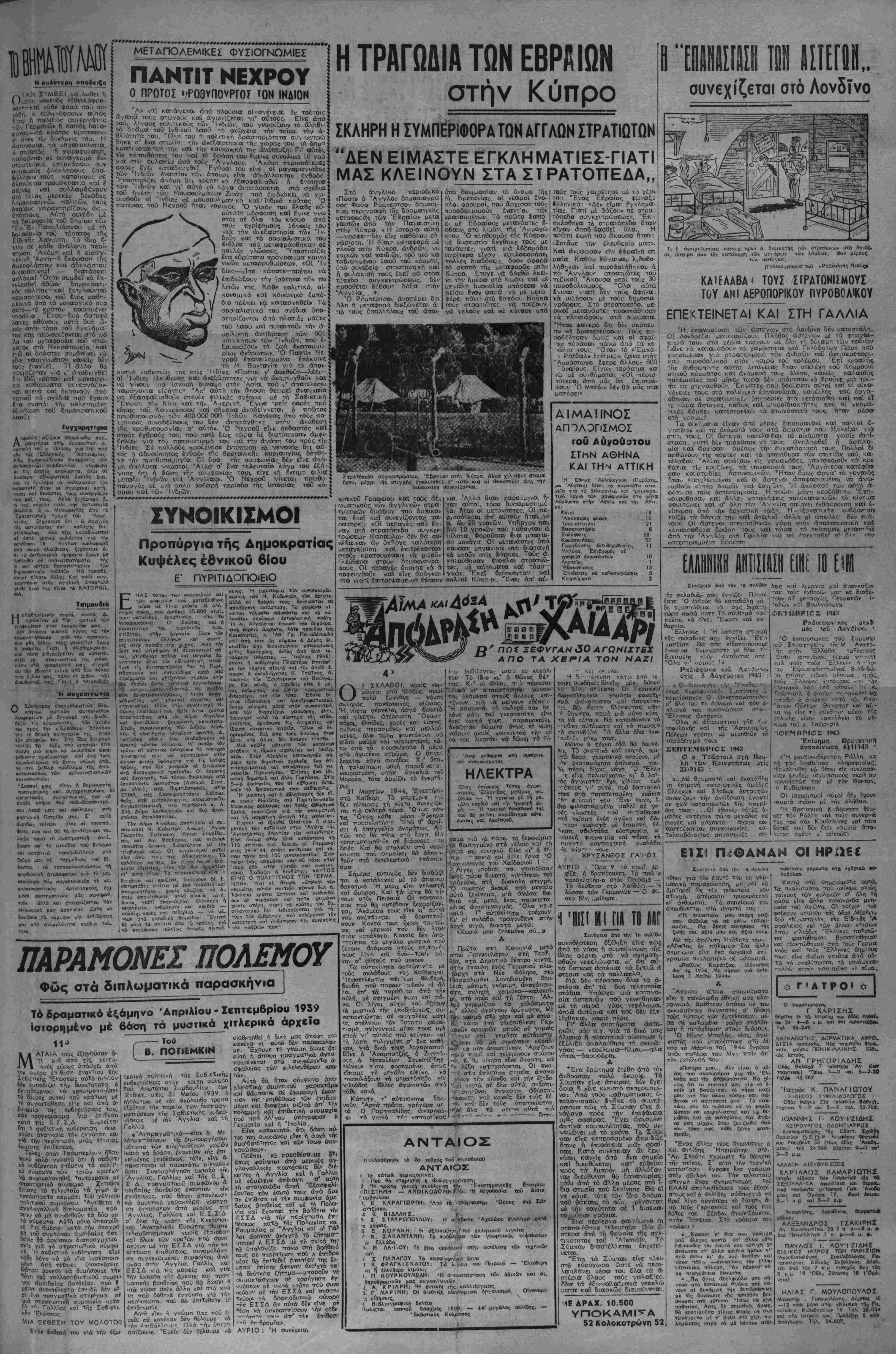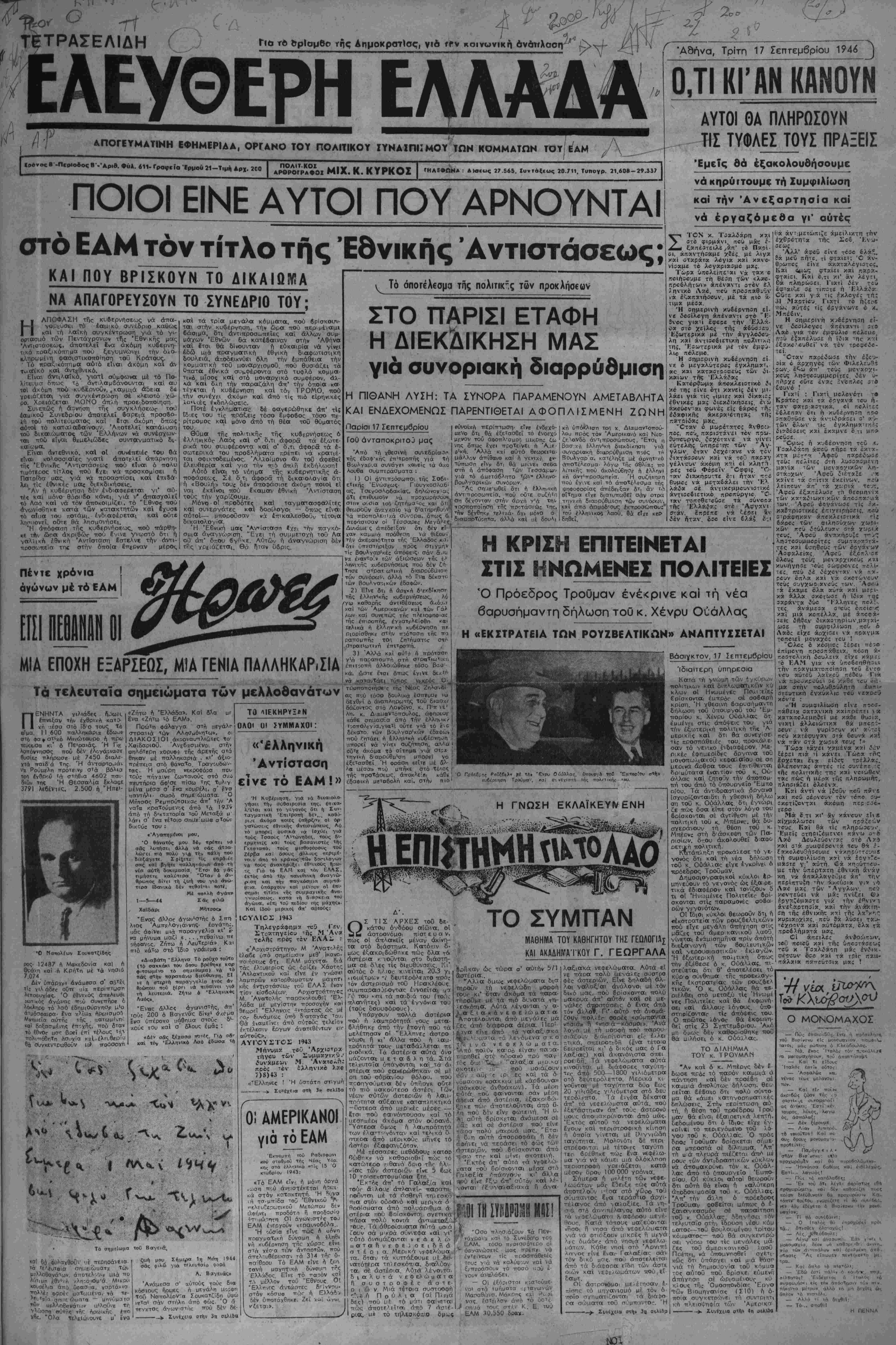 ΐτοιηΐβυμε τή θέση των <λ#σ- προ6λήτω» άπέναντι στβν βλ ίηνικό Λκέ. ττβύ πρβίπκθΐ'ΐν ν» έξαπχτήοουν. μβ τα πιό χ- τιμχ μέαα. Ή βημερινή κυδέρνηοη εΐ- νβ ίβίίλβνη άπέναντι οτ* "Κ- 3νβς γιατί εφερβ την Έλλχ- οα βτο χείλος τή; ά6ϋβι:ι; ϋξωτερικά με την λπ καί άντΐσοέιετική πΛι της. Ίΐσωτερικά με τόν έμφύ- λι« πόλεμ«. Η αηιμ:ρινή κυδέρνηίη :ί νέ 6 μεγαλυτέρας έγκληιιχτ, | άς και κατχστΌ'-Φεύ; των 5ι καιων Παρίσι 17 Ιεπτεμ6ρίου Γοϋ άνταποκριτοϋ μας Πέντε χρόνια άγώνων μέ τό ΕΑΜ ΜΙΑ ΕΠΟΧΗ ΕΞΑΡΙΕΩΣ, ΜΙΑ ΓΕΝΙΑ ΠΔΛΛΗΚΑΡ.ΣΙΑ Τα τελευταία σημειώματα των μελλοθανάτων Άπό τη χθεσινή τής έ&αφ'κής επιτροπής γιά Τη Βουλγαρία συνάγϊΐ καυεΐς τα ά·/.ο λουβα συμπιρασματα : Ι) Οϊ οΥντιπιόοωποι τής Σθ6ι- 'Ενωσ^ως· ΓιουγκοαλαΟ άς. Τσεχοσλοβακίας, δηλωνον'α*, ότι έπιθυμοθν νά πραχωρπυοΐΛ στην οοϋια ιοϋ ζητήμα[ος και οκ θεωοοΰν άναγλαΐο νά δ'ατηρηθυ'Λ'1 τα προπολεη'/.ά σύνορα, όπως αι-·- —--,·■-' ■■ πεψάσιοαν οί Τέσσαρα Μεγάλεί,, &'«οοορΤυ;ητα, Δυνάμε ς άπεδειξαν ότι δέν εί¬ χον καμμιά ττρόθτση νά θι£οΐ/. τ#Ίν άκειαιότητα τής Ελλάδος κα, ότι υπεστήριξαν πρός στιγμήν τίς βουλγαρ'κές απόΦε'ς· σάν άιΐυ να έναντο'ν των άξιώσεων τής ε/ ληνινής κυβερνήσεως τού 6έν ίή Τησε στ'ρατ ωτική διαρρύθμιση των συνόρων, άλλά τό "να δέκατΐ' των Βουλγαοικών εδαφών. 2) Είνε δτι ή αρχισή δ'εκδϊκηθΓ τής έλλην'κτ>ί κυβερνήσεως, λό