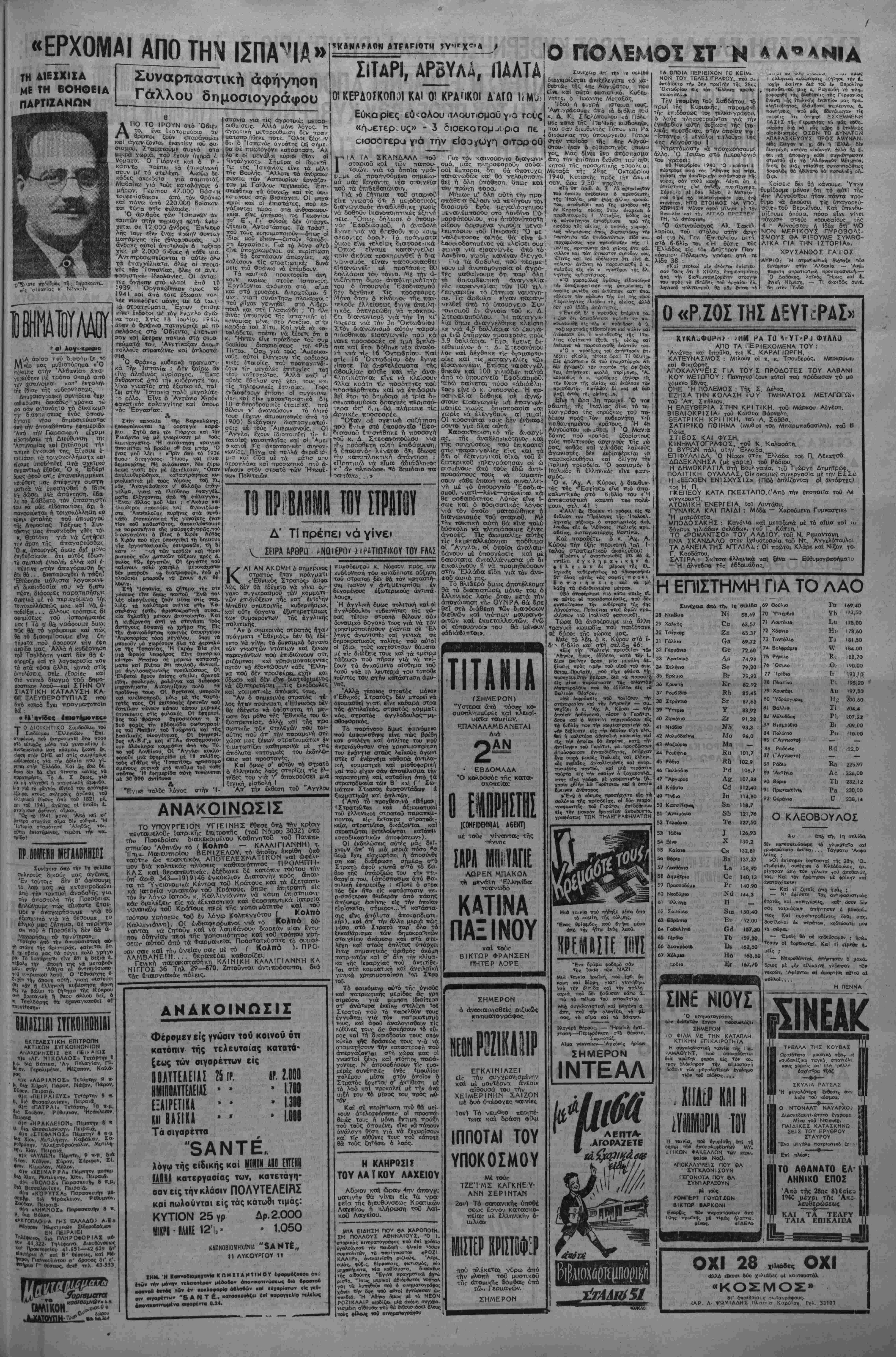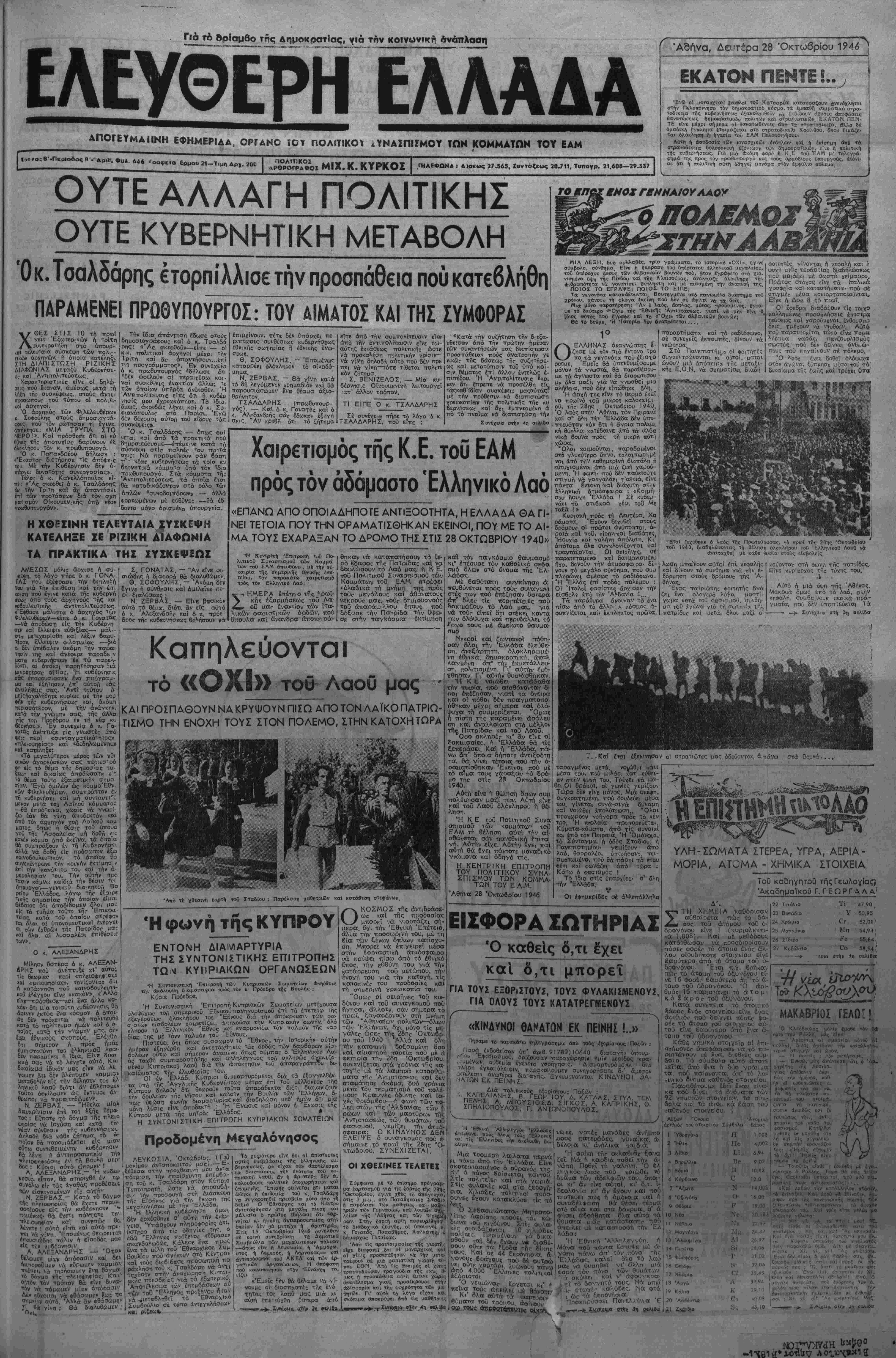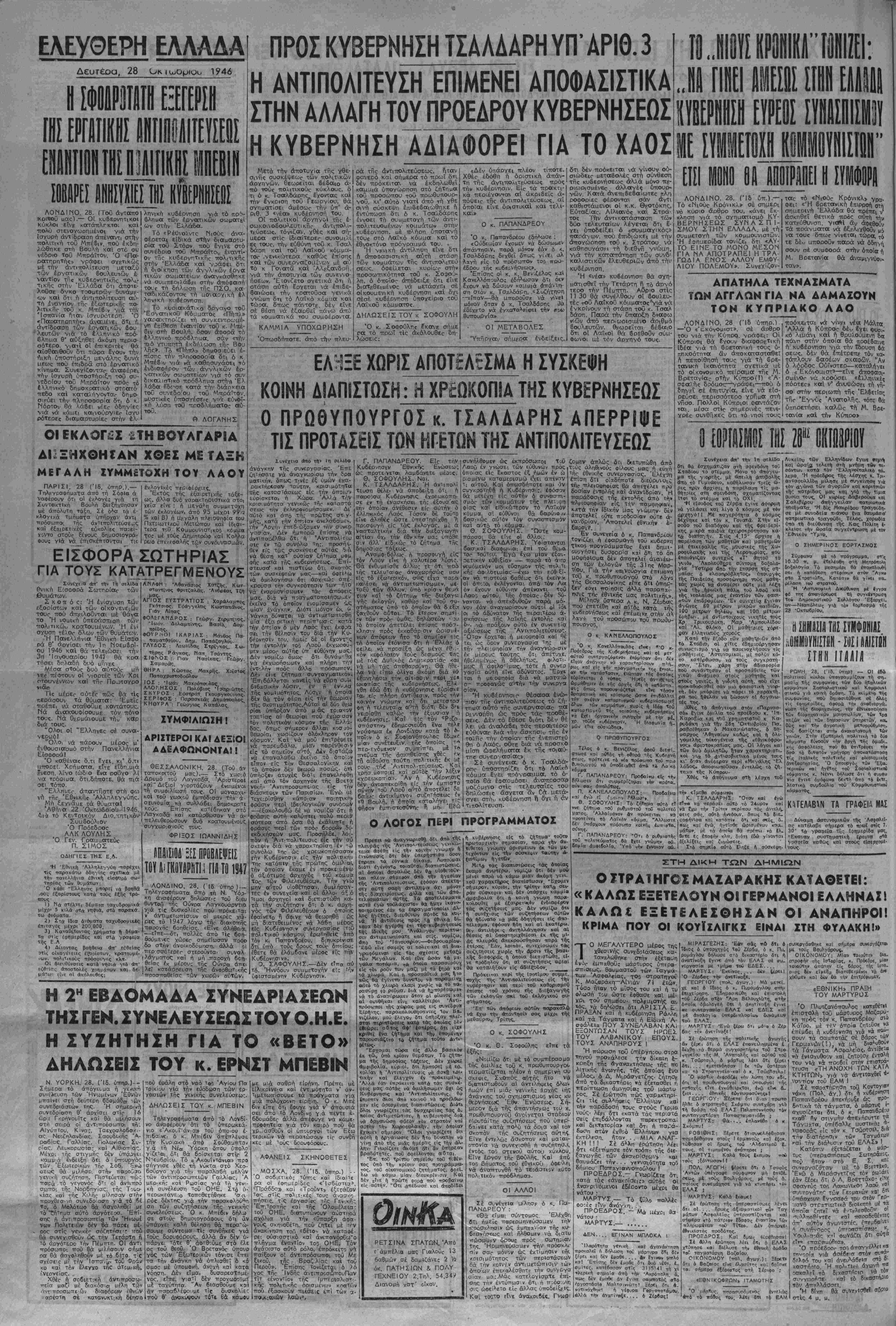 πιπέδου. Ή Άντητολίτευσ.ς ε<ρ. νεν δτι επρεττε νά προσέλθη ε!(^ τάζκβθ'Ιδίαν συσκέψεις μαςαύτάςΓ μέ την πρόθεσιν νά διαπιστωθη γρεωκο—ίαν τής ττολιτικής ιήο κυ βερνήσεωο καΐ δχ: έμττνεουένη ά ττό τό πνεΰμα νά δν.ατη,στώση τή» Συνέχεια στην 4η ρής α ρί ρη κόμμστα ύττθ τόν 'διθ ποωθυττουργό. Στά κόιιματοτ. τή; Αντιπολιτεύσεως, τα όποϊα έχσι θά καταδ'κάζονταν στό ρόλο τ«ν Απλών *ςτυνοδοηΓΟοων» — άλλά φορτωμένων μέ εύθθνες —θά έδ δοντο ιιόνο όρΐσμένα ύ'τοΐ'ΡγεΤα. Η ΧΟ5ΣΙΝΗ ΤΕΛΕΥΤΑΙΑ |ΥΣΚΕΨΗ ΚΑΤΕΛΗΞΕ ΣΕ ΡΙΖΙΚΗ ΔΪΑΦΩΝΙΑ ΤΑ ΠΡΑΚΤΙΚΑ ΤΗΣ ΣΥΣΚΕΨΕΩΣ ΑΜΕΣΟΣ μόλις άρχισε ή συ- «ψη, τό λόγο ττηοε 6 κ. ΓΟΝΑ¬ ΤΑΣ ττού εςέφρασ* την έκπλη^ή τού γΐά την έπ.θεση καΐ την ίτ· «ι·ση ττού ίγινϊ κατά τής κυδερνή «ια: άττό τούς άρχηγούς ^ης κοι νοδουλευτικήτ όντΐπολπεύσΕωι: «Έφθασε μάλιστα ό άρχηγόλς ιόν Φ.λελευ(/ΐ.ρ«ν—εΐττε ό κ. Γονοτά€ —νά αποδώση είς την Κυβέρνη σιν καΐ έλλειψιν εύ&ξίας— μαλ στη μιτεχιιρίσθη καί λέξιν βαριι- τίραν, έλλειψιν φιλοτιμίας —5'ώ τ, δέν υπέβαλεν ακόμη την παοαι ιτισίν της καΐ άνέφερε παραδε ν μστα κυβερνήρεων έν Τω παρεν &ο;τι, αι όττοϊαι παρητήθησαν 5ιά μικρβΐέραο αίτίας. Ή κυβέρνησις οόχ έπαρουσιασεν £να ττοόνρα^- μα κοΐ εζήτησεν έη' αϋτοΓι ίο^ άντιλήψεις σας. ΆντΙ τούτοι» ϊι μΡΪΧιΊσχολήβητε κυρίως μέ Την μο,) •ήν τη: κυβερνήσεως και, άκόυη περισσότερον, μέ την άνάγ<ην, ά την γνώμην σας, τής άλλα το,", Π'ροέδρου έν τή νέα κι, σί» Έν συνεχίςι ό κ Γο Σ. ΓΟΝΑΤΑΣ. — "Αν είνε ο» σιώδης ή διαφορά θά διαλυθώμεν ©. ΣΟΦΟΥΛΗΣ. - Άκόμη δέν έγινβ ή σύνθρσις καΐ όμιλεϊχε ·τ^- θΐ διαλύσεως ; Ν ΖΕΡΒΑΣ. — Εΐε Ρασ.κόν αύτό τ6 θέμα. διότι δν είς αύηο ό κ. Άλεξανδρήο καΐ ό κ. τγρορ δοοο τή? κυβεονησεως θρλήσουν να Χαιρετισμός της Κ.Ε. τοϋ ΕΑΜ πρός τόν άδάμαστο Έλληνικό Ααό «ΕΠΑΝΩ ΑΠΟ ΟΠΟΙΑΔΗΠΟΓΕ ΑΝΤΕΟΟΤΗΤΑ, Η ΕΛΛΑ_Α ΘΑ ΓΙ- ΝΕΙ ΤΕΤΟΙΑ ΠΟΥ ΤΗΝ ΟΡΑΜΑΤΙΣΘΗΚΑΝ ΕΚΕΙΝΟΙ, ΠΟΥ ΜΕ ΤΟ ΑΙ- ΜΑ ΤΟΥΣ ΕΧΑΡΑΞΑΝ ΤΟ ΔΡΟΜΟ ΤΗΣ ΣΤΙΣ 28 ΟΚΤΩΒΡΙΟΥ 1?4θ» Ή ΚΓντρΐχή Έπιτροπη ΤυΟ Πο- λιτικοθ Συνασπισμοθ των Κομμ* των τοθ ΕΑΜ απευθυνει, μί την εύ καιρΐα τής σημερινάς έθνικής ίηΐ· τείου, Τί>ν ναρακάτω χαιριτιβμ6