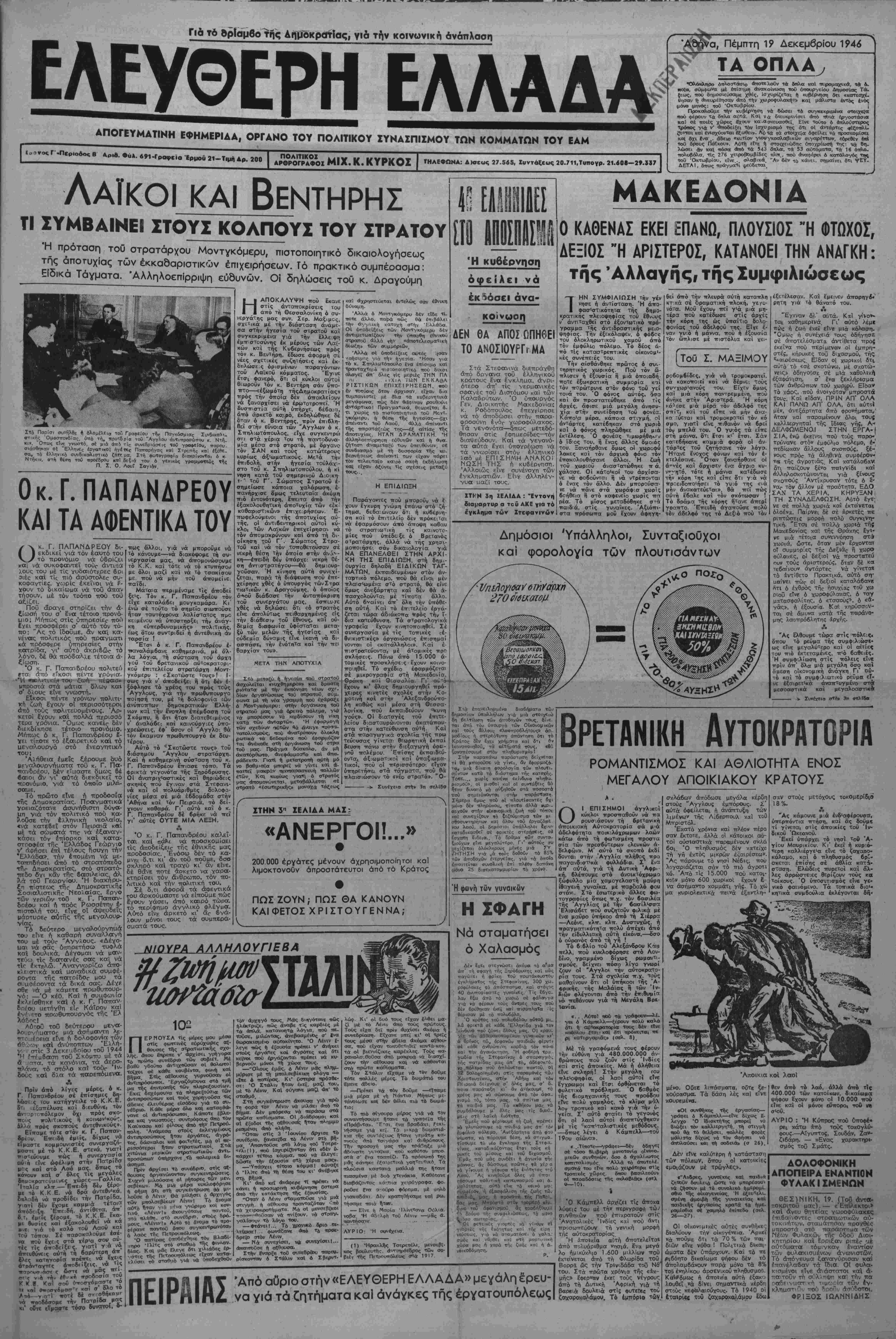 ν<·· ν στίς 3 Δεκεαβοίου τοΰ 1944 Η ίττέιιβαση τοΰ Σκόμττυ μέ τα α 'ΐοτα. τα κανόνια. τα άερο- τχλάνα, τό οτόλο καΐ τούρ Ιν- δούς καΐ δλα τα τταοεπόιΐενα. Α Πρΐν άπό λίγες μέρες, ό κ. Γ. Παττανδρέου σέ έπίσημες δη- λώσεις τού κατήγγειλε τό Κ.Κ-Ε. Βτι ^.έξαπέλυσε καί διευθύνε, τον άντ'^ρτοπόλεμον δχι ττρός σκο· «ούς ιτολιτικούς η κοινΜνΐκου:, 4λλά πρός σκοττοΰς άντεθνικους». Εϊπαμε τότε στόν κ. Γ. Πατταν- βρέου. 'Ετηιδή εμείς, δίχως να ειμαστε κομμουνιστές συνεργαζο- μοστι μέ το Κ.Κ.Ε. στενά, γιατι ιτιστεύουμε ττώς ή συνεργασΐα αύτη είνε ώφέλιμη στήν Πατριδσ μσς καί στό Λαό μας_, οπως^ το κάνουν καΐ σ' ολες τις Μεν",ει5 δτΐυοκροπτ ύμΐνες χ&ίρεζ—Γ<χΑΛ»ο;ϊ Ιταλία κλπ—Επειδή δέν ξέρ° με τό Κ.Κ Ε. νά δρά άντεθν'κα, δηλσδη νά πρσδίδει την Πατριδα. γιατι δέν ίχομε καμμιά τετοια άττόδειξη. "Επειδή. άντιθετα, ^άπ β,τ, εμείς ξέρομε, τό Κ.Κ.Ε.,έκα¬ με βυσίες καΐ έξακολουβει να κα ιινε γιά τό καλό τού Λαου και Τού τόπου Σέ παοακαλοΰμε ίσε- να ττού ϊχεις στά χέρ'α σου^ αυ- τές τίς άποδείξεΐΕ, γιατΐ γ α νό. άπευθύνεις αότίι τη 6αρυτερηκβτ^ βλες κβτηνορία πρέπει να ^ """ ς ώ—ι νά μα? 1Γ?1; βΓ'ς ν.Α την έβνκί» προδοσια τού Κ ί β. Κοτ! σ<Λ όποσχόμαο-τε ■'ό τι «β! «-οσγ6Μ0«ττΡ κο' σ δλο το ΛιΑ—γ,στ) τίοτέ δέ σκ-ΦθηκοϋΓ νά ττ-οοδόβτομε την Πατριδο μοί κι' οθτβ ιΐμαστι τόσο ουνατο». «- ττιος άλλοι, γιά νά μποροΰμε νά τό κάνουμε—νά διακόψομε τή συ- νεργασία μας, νά άπομονώσουμε τό Κ.Κ. καί τότε νά τό κτιπΐήσοιΐ με 8λο· μαζι καϊ νά τό τσακίσου με. ποΰ νά μην τοΰ άπομείνε. παίδι. Μάταια περιμέναμε τίς άττοδεί ξε'ς. Τόν κ. Γ. Παπανδρέου τόν εΤχε καταλάβει^ μουγκαμάρα. ΚΓ ένώ σέ τουτο τό σημεΐο σιωποθσε ήτοηι^ ταυτόχρονα λαλίστατος προ κειμένου νά ύποστηρξει τήν άνάγ- κη «ύπερδυναμικής» ττολ'.τικής, κως ότου σι/ντριβεΐ ή άντεθνική άν ταρο-ία ! "Ετσι ό κ. Γ. Παπανδρέου έ- πανολάμβανε καθημερινά, μέ σλ- λα_ λόγια, τή σύσταση τοθ άρχι >οΟ τοθ βρετανικοΰ αύτοκρατορ;-