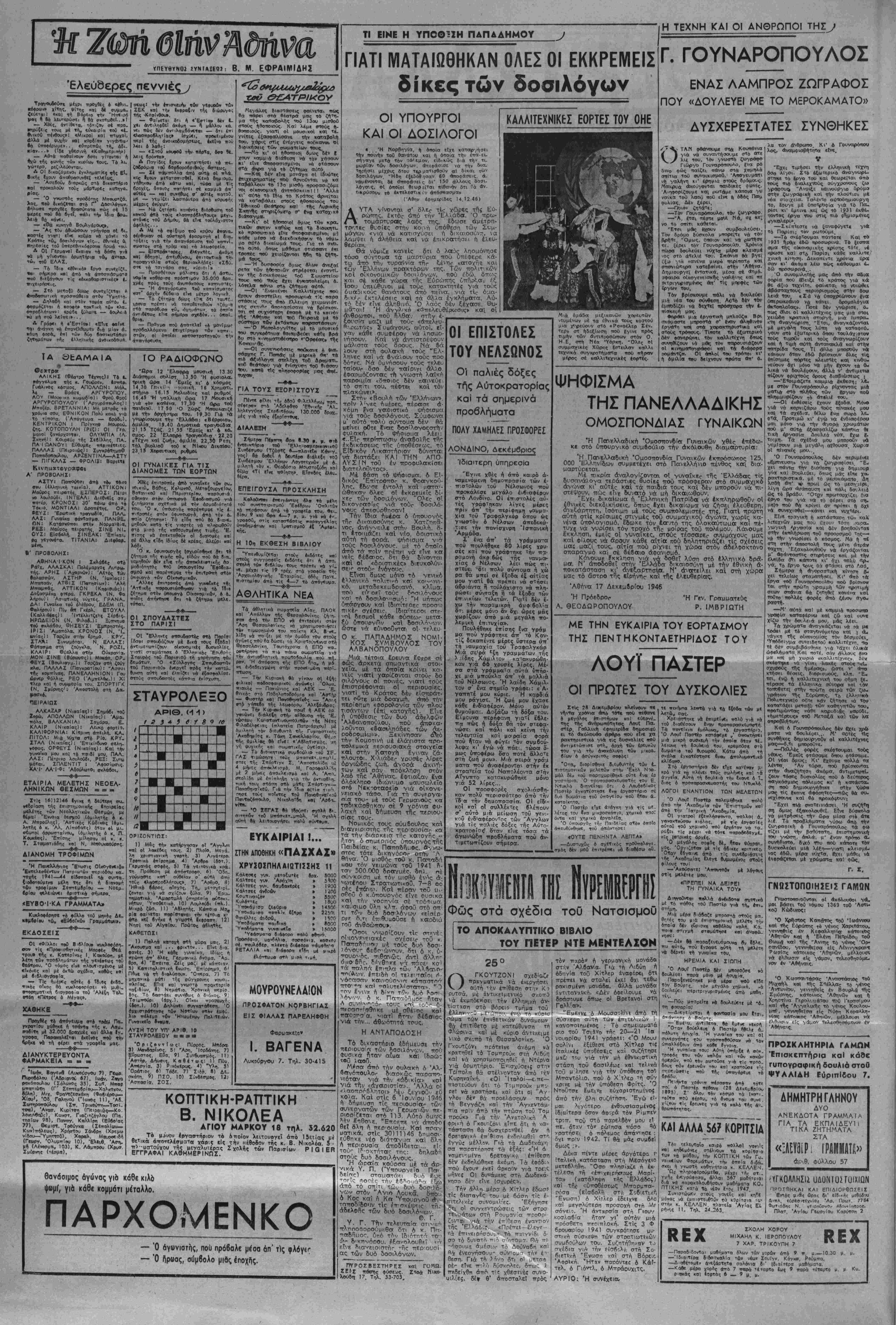 τρόπος γι* ν" Αποδείξει τ*ν Ισχυριαμό της «τι οί <*ντάρτες <»έξ,οπλ[- ^ονται καΐ ένισχύονται Βξωθεν». Αύτά τα στοιχεία δφείλει νά προσκομίσει κοΗ 6χι ίνα... ά&ειο «κυτίον γιουγκοσλοφικών σιγαρέττων, ευρεθέν έιιΐ τοθ δρους ΠάΙκου». Αυτή είνε ή στοιχειωδηο υποχρεωθή της: νά δτμ λώσει ίϋν καΐ πόσα 4πο τα 543 οπλα, τα 53 αύτοματβ, τί 16 Μλα. πολυβόλα, τίς 276 χειροβθμβΐδες κΛλι., πού Αναφέρει ό «ατάλογος της τοθ Όκτωβρίου, είνε... σλαβικα:. "Αν δέν τ6 κάνει, σηιμαίνει δτι ΥΕΥ- ΔΕΤΑΙ, δπως πρώγμαΤι ψεύδεται. Παγκόσμιον άώ ΣτόΠσρισι συνήλθε ή όλομέλε,α τοιΊ Γραφείον ^ Πγόσμιον ΣυνδικπΜ στικης θμοοττονδιας, ύττ4 τή. τιροίδρία τού "Αγγλοι; άντ,ττροσώττθυ κ Νι«_ κιν. θττως είνε γνωστό, »ε μ,ά άττ!, τίς συνεδρ.άσί,ς τοθ γραφίΐου, ττοφοι!. σιασΒηκαν οί Ελληνες έργατικθ] ήγέτεΓ Πατταρηγας κα! Στρατής καΐ 4ξ£Βε σα» το ελληνικδ σννδικοΛιστικό ζήττ, μσ. Στή φωτογροτφία διαχρίνονΤ01 6 κ Ντηκιν. οί*, θέση τοθ ηροίδρθυ κβ! δεξιά τού ό γενικάς γραμματεύς Ττς Π. Σ, Ο. Λουί Σαγιαν. Οκ. Γ. ΠΑΠΑΝΔΡΕΟΥ ΚΑΙ ΤΑ ΑΦΕΝΤΙΚΑ ΤΟΥ Ο κ. Γ. ΠΑΠΑΝΔΡΕΟΥ δι- εκδικεΐ νιά τόν έαυτό τού τό προνόμιο νά ύδρίζει καϊ νά συκοφαντεΐ τούο άντιπα λους τού μέ τίς γυδαιότρ.ρες 6ρι οιές καΐ τίς ττιό άσύστολες συ- κοφαντίες, γ,ωρίς έκεϊνοι νά ¥■ •χούν τό δικαίωμα νά τοϋ άπαν τήσουν, ιιέ τόν τοόπο τΐού τού αξιζει. Ποΰ αρανε στηρίζει την ά- £ίωσή τού σ' £να τέτοιο προνό- ιμιο; Μήπως στίς ρπηρεσίεΓ τιοιΊ ίγει προσφέρει σ' αϋτό τόν τό- πο: "Ας τό "ιδοΰο.ε, αν καί κα- νένας πολιτικάς ποΰ -ραγματι κά πρόσφρ.ρε ΰπηρεσίες στήν ηατρίδα, γι' αύτά ακριβώς τό λόγο, δέ θά πρό6αλχε τέτοια ά- ζίωση. "Ο κ. Γ. Παπανδρέου πολιτεύ εται από εϊκοσι πέντε γρόνΐα· **Η ^τβλντικηΊτ τού ζ-ωή- πέ(3«σ* Γ ζη πέβοσ μττροστά στά μάτια δλων και σ' δ λους είνε γνωστή. Εϊκοσι πέντε γρόνων πολιτι- κή ζωή έ'γουν οί περισσότεροι άπό τούς πολιτευομένους. Άρ- ιχετοΐ έγουν καί πολλά περισσό τερα γρόνια. "Ομως κανείο δέν διεκδίκησε τέτοιο προνόμιο. Μήπως ό κ. Γ. Παπανδρέου 6- γει τίποτε τό έξαιρετικά καί τό Ιΐεναλουιργό στό ένεογητικΛ τού; Άλήθεια εμείς ζέρουμε όυό μργαλουργή ματα τοθ κ. Γ. Πα¬ πανδρέου, δέν εΐααστε δυωο 6έ βαιοι άν γι* αύτά διεκδικεΐ τό ττθονόμιθ, γιά τό όποΐο μιλή- σαυε, _Τό πρωτο είνε η ιτροδοσίοι της Δημοκρατίας. Πραγματικά νοειαζότανε άσυνήθισ—ι δύνα- ΐιπ γιά τόν τΐολιτικό πού κα- λοθσε την έλλπνικη νεολαία; «νά κατεβεΐ στόν Πειραια κ«ί μέ τα σώματά της νά έξαναν- κάσει τόν έττίορκο καί κατα- στροφέα της "Ελλάδος Γεώργιθ ν* άφιΊσει επί τέλους ησυγη την *Ελλάδα>, την έπομένη νά με-