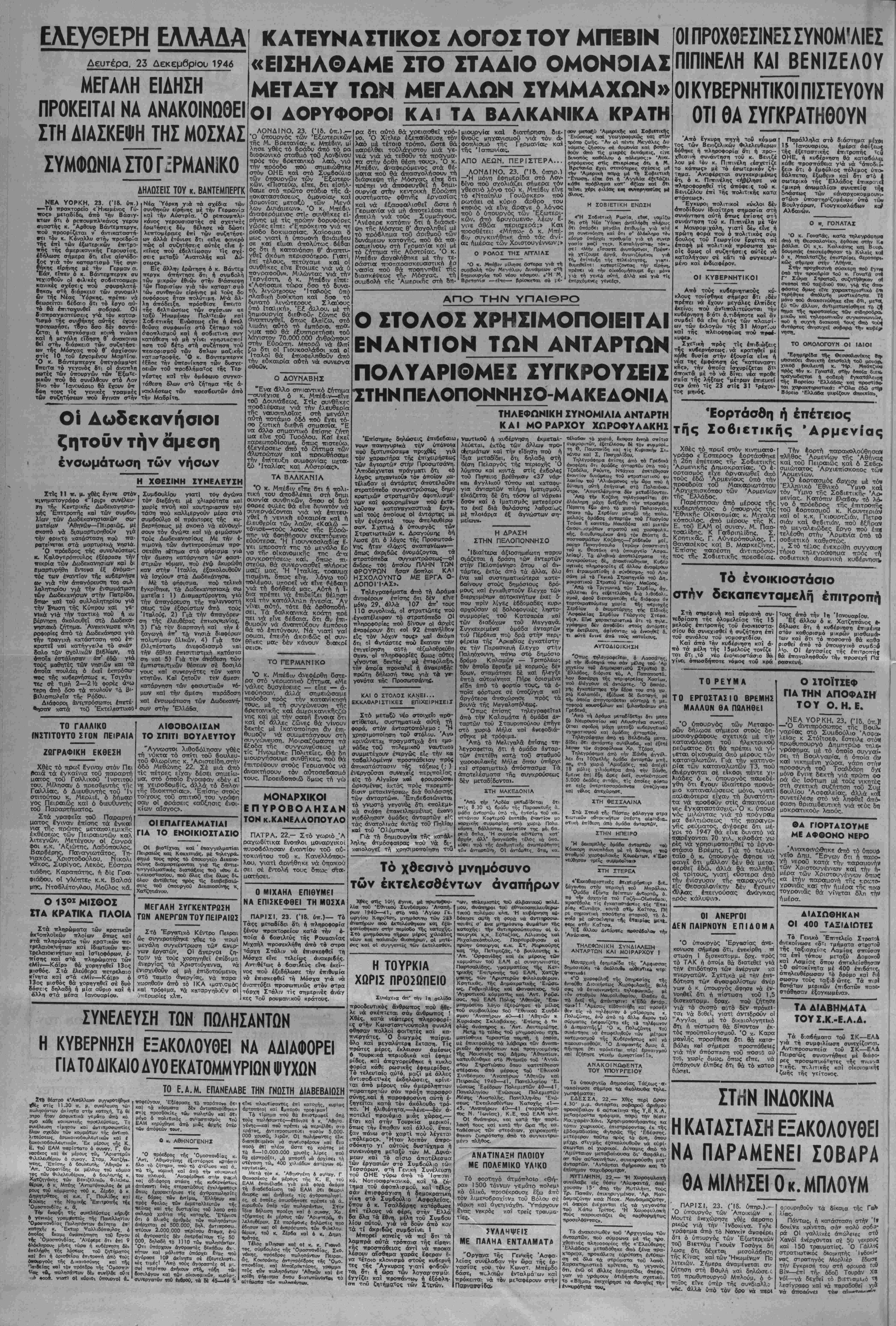 ρες^ ττροσωπικότητες τί|ς ·πν<Μ'Λ τ'·<ής, ιτςλιτικής καί ο!κονομική| ζωής τής γείτονος. ΣΤΗΝ ΙΝΔΟΚΙΝΑ Η ΚΑΤΑΣΤΑΣΗ ΕΞΛΚΟΛΟΥ0ΕΙ ΝΑ ΠΑΡΑΜΕΝΕΙ ΣΟΒΑΡΑ ΘΑ ΜΙΛΗΣΕΙΟ κ. ΜΠΛΟΥΜ ' ΠΑΡΙΣΙ, 23. (Ίδ. ύττηρ.).— Ό ύπθυργόο των Άποικΐών κ Μουττέ ανεχώρησε χθές άεροπο ρΐκώς γιά την Ίνδοκίνα. Τηλε γράφημα άπό τό Νανκίν άναφέρει δτι ά ύπουργός των "Εξωτερικών τοΰ Βιετνάμ Γκουέν Τοσόγκ δή λωσε δτι δέχεται μεσολαβήση της Κ ίνας καΐ τών Ήνωρένων Πό λιτειών. Σημερα άναμενεται συ¬ ζητήση στή Βθυλή και δηλώσε.ί. τοθ τΓρωθιτπουργοΟ Μπλούμ, ό ό- ττοΐος είνε υπέρ τής σι/νδιαλλί ν_. άλλΑ υπό Τόν δρο νά πβρι Φοουρηθούν τά δίκαια τής Γα<ν λίας. Πάντως, ή κατάσταση στήν *!· δοκίνα κρίνεται σάν πολύ σοδΛ" ρά ΟΙ γαλλΐκές άπώλειες στό Χανόϊ άνέρχθνται σέ 50 νεκρους καΐ 150 τραυματίες. Ό Γάλλος στρατιωτικάς δΐοιιχητής Ίνδο<'"' νας στρατηγός Μορλιέρ εδωσε την εγκριθή τού στΛ φρουρά γ°" Βϊν—επί τήΓ 6δοΟ Τουράν Χ« νόϊ—νά δεχθεϊ τό βιετναμΐ/ό τ» λεσίγραφο καΐ νά παραδοθεί γι& νά άπθί&ύνει τ4»