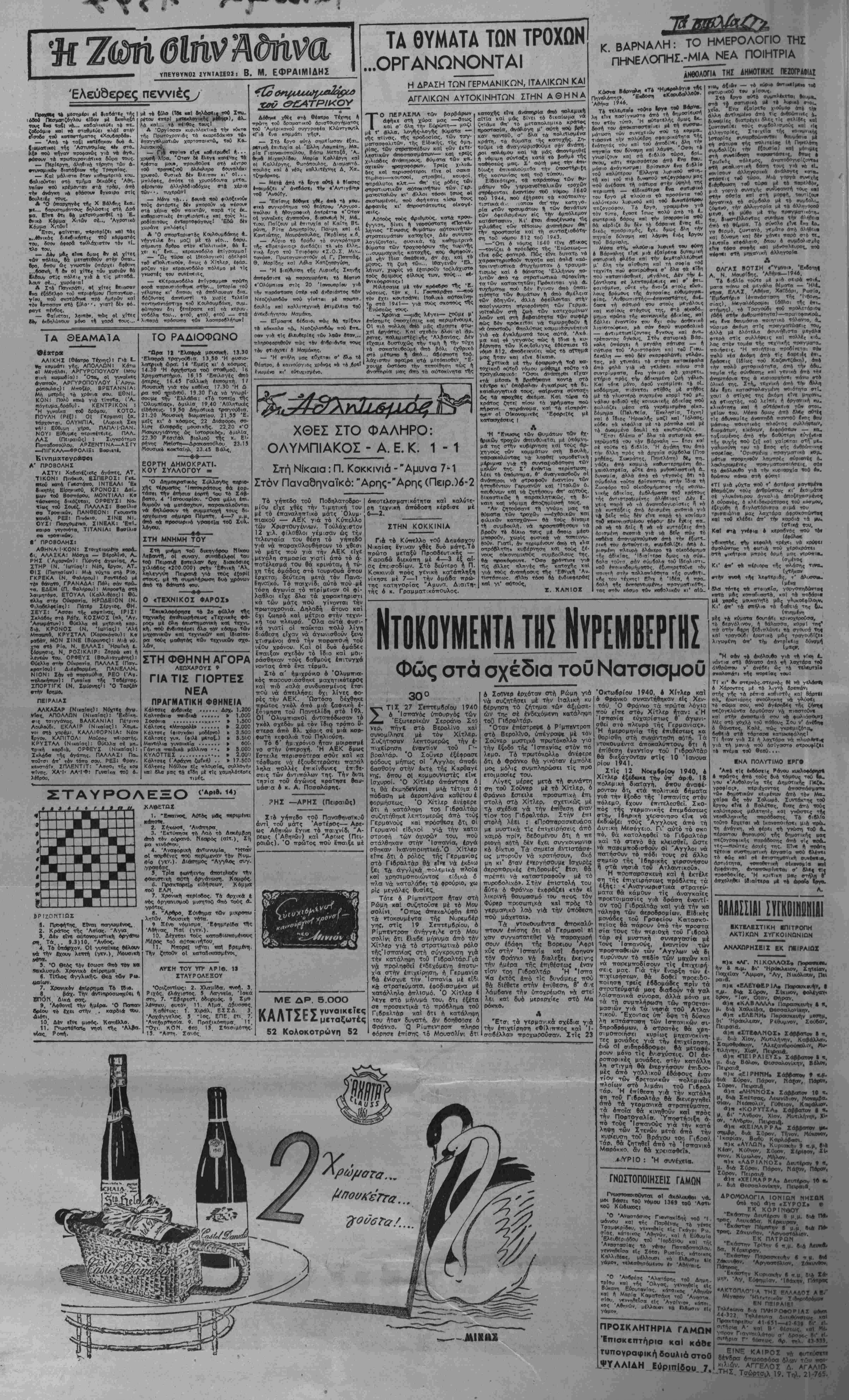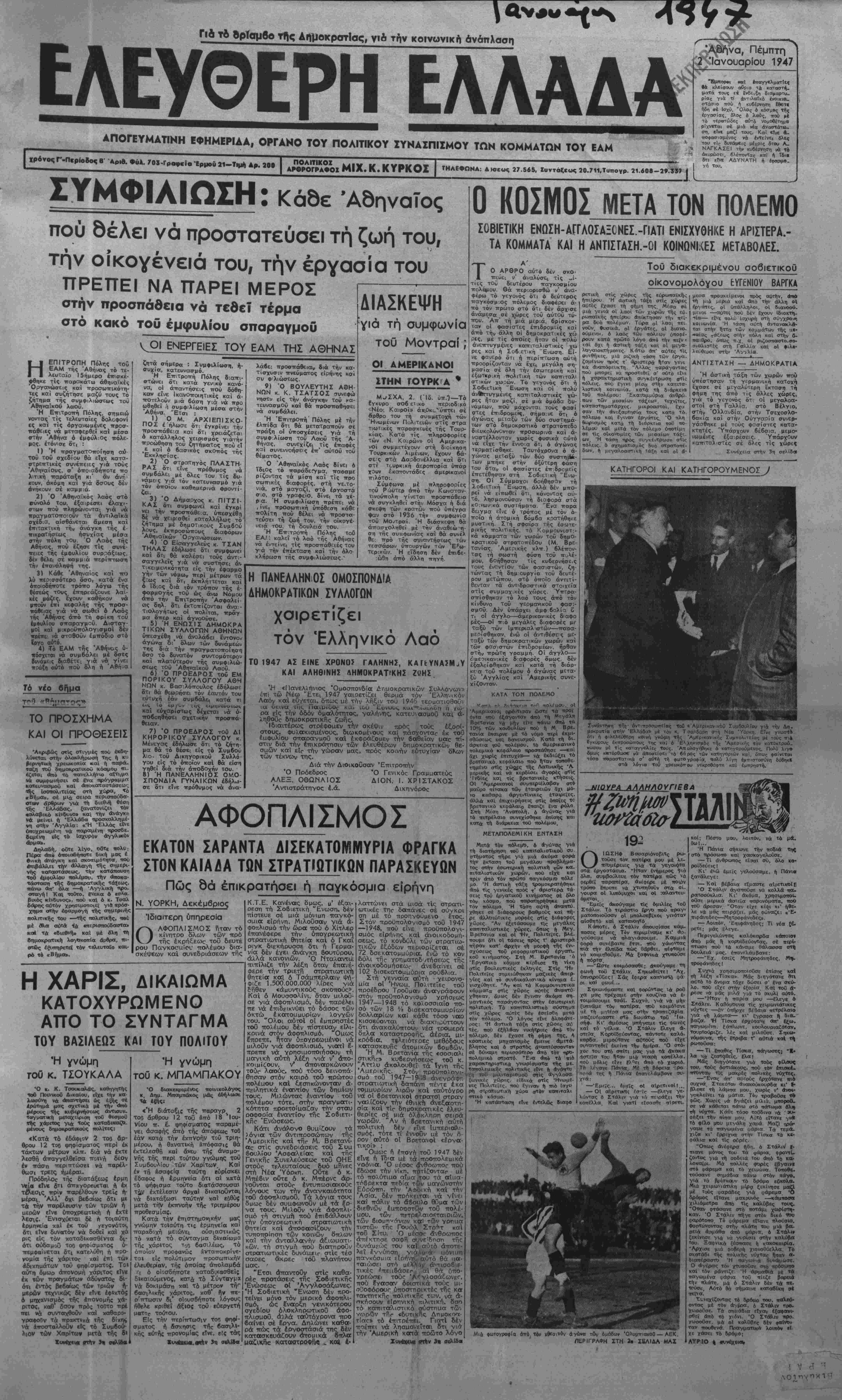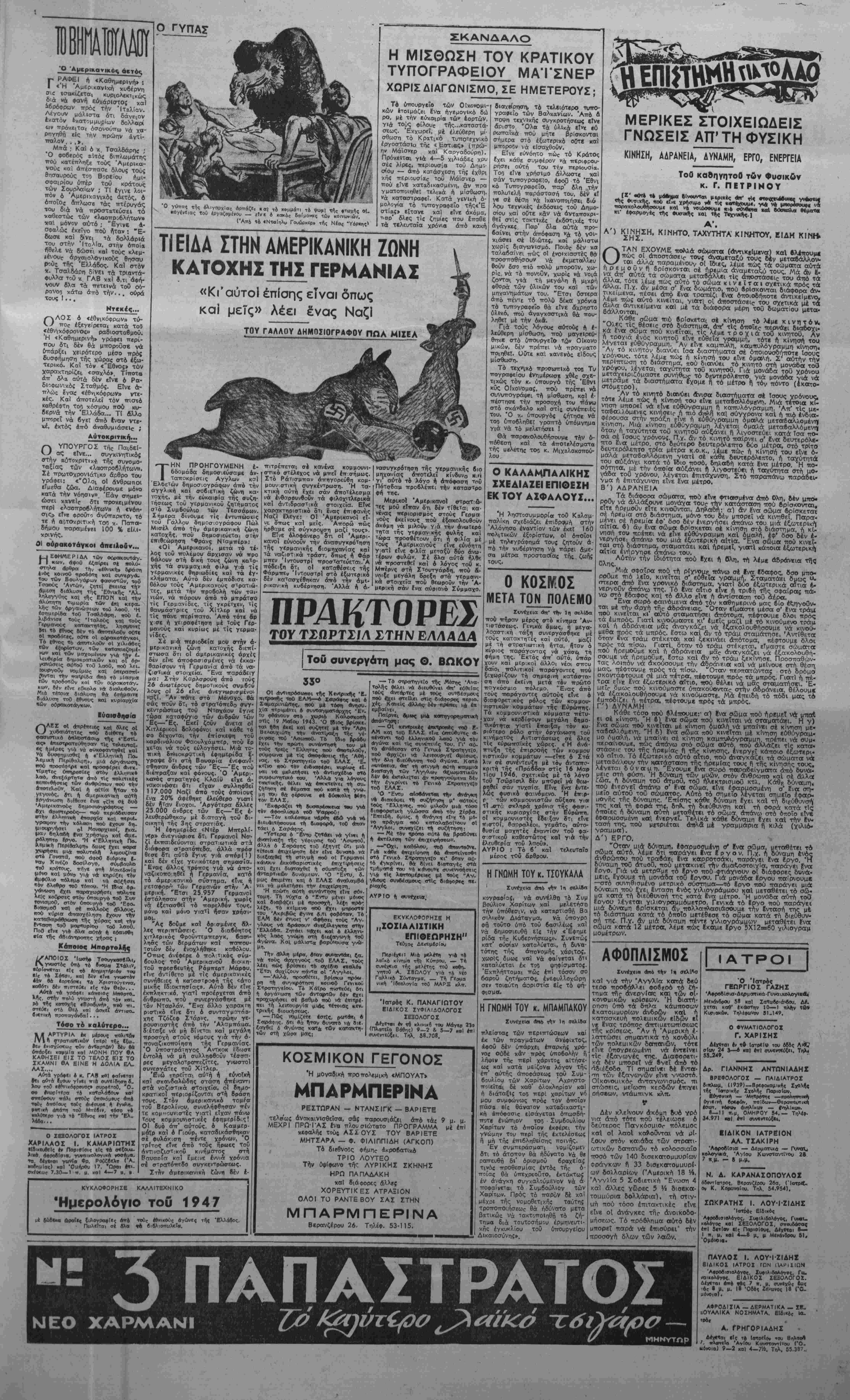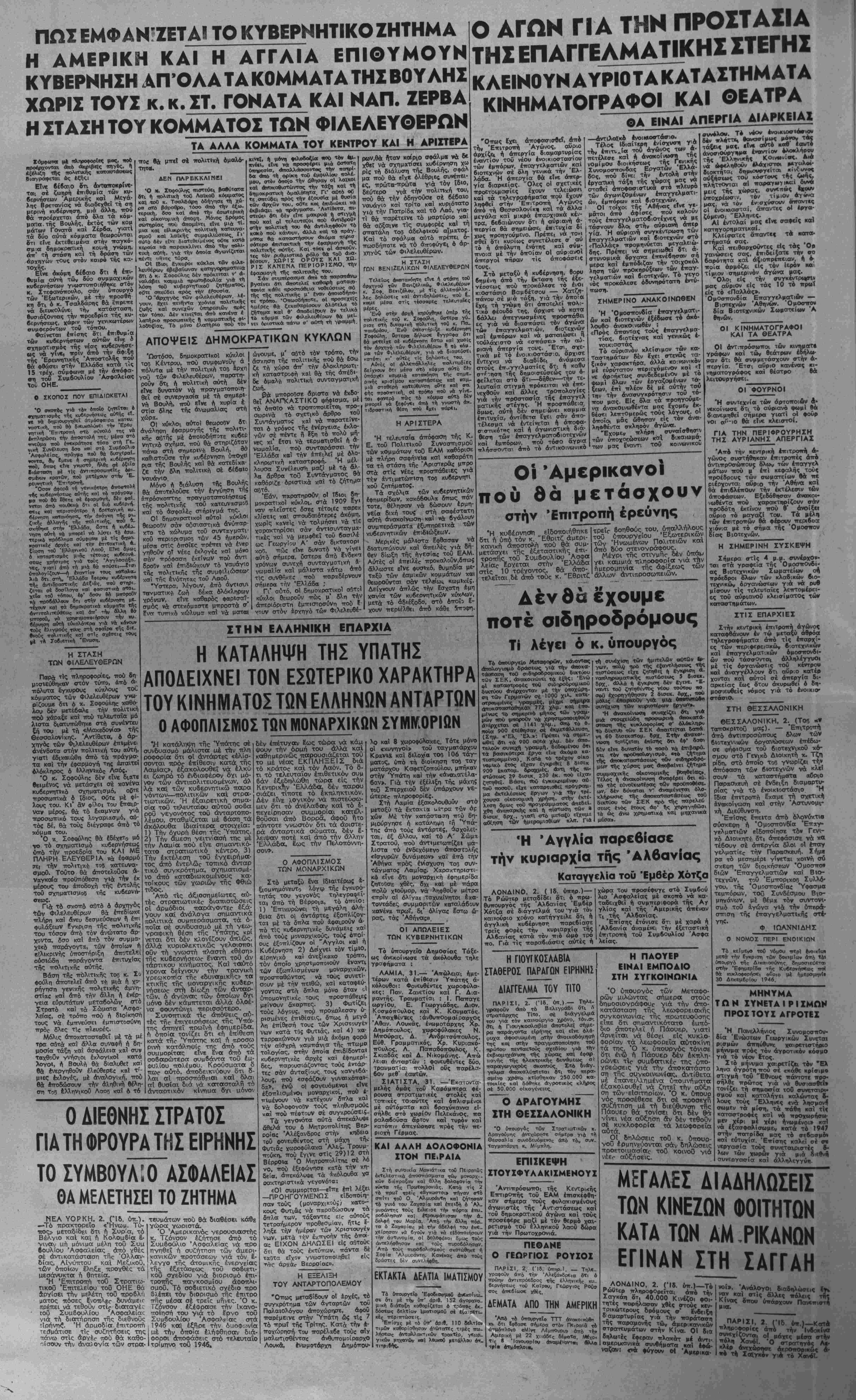 ες και τίς όργανωμένες ττρο<τ- ττάθειΐς νά μεταφερθεί καί μέσα οτήν 'Αθήνα ό έμφύλ Ος ττόλε- μος, ετόνισε δτ( : 1) Ή ττραγματο—οίηση α» τού τού σχεδίου θά εΤχε κατα- στρεττΐΊκές σννέπειες γιά τους Άθηναίους, σ' ότϊΌΐαδηττοτε πό λιτική παράταξη κι' αν αντ,- κουν, άκόμη και γιά δσθυς δέν άνήκουν σέ καμμιά. 2) Ό 'Αθηνα'ικός λββς στό ■τύνθλό Τού, εξαιρέσει ελαχί¬ στων πού πληρώνονται γιά «/β πραγματοπο'ουν τα άντιλαΐκά σχέδ;α, αίσθάνεται αμεση καΐ έτπτακτική τήν άνάγκη τής ε¬ πικρατήσεως ήσυχίας μέσα —ήν ττόλη τ-θυ. Ό Λαός τής Αθήνας; ποΰ εζησε τις ^ συνέ- πειες τής έμφυλίου συρράξεος, (έν θέλει σέ καμμιά περίτττωση την έπανάληψή της. 3) Κάθε Άθηναίος καΐ πθ λύ ιτεθ'.σσότερο ρσο, κατά ευα όιτοιοδήτΓοτε τρόττο λόγω τής θέσεώς τθυς^ έπηρεάζουνε λαι- κες μάζες, ε'χουν καθήκον νά μττούν επι κεφαλής τής προσ¬ πάθειας γιά υσ σωθεϊ ό Λαός -της "Αθήνας άττό τή φρίκη τού έμφυλίου σπαραγμοϋ. Δισταγ- ρθΐ καΐ μικροϋττολογισ;μθι 6εν πρέττε. νά σταθθϋν έμπόδιο στό ϊργο αύτό. 4) Τό ΕΑΜ τής Αθήνας υ- πόσγ,εται να συμβάλει μέ 8σίς δυνάμεις διαθέτει γιά νά γίνει πράξη αύτό -ού 8λη ή Αθηνά Τα νέο 6ημα «■- - - ΤΟ ΠΡΟΣΧΗΜΑ ΚΑΙ ΟΙ ΠΡΟΘΕΣΕΙΣ Ακριβώς —Ις στιγμίς πού έκβη- λώνεται στήν ολοκΐλήρωσή Της ή κυ Λερνηιτΐική χρεωκοπκχ «αί ή παρα¬ ταθή ·κκ} δημοκρατΐΐκοΰ κόαμου πι. ίζεται αΐιτό τό ττανελλήινιο αΐτι,ιμο. νά ουμφωνήσει σέ £ναι πρόγραμμη κοπευναιαιμοθ καί Λητοκκχταστάσεω', ιίς ΙσοΐΐολιΤεΙας στή χώρα, *ό «Βήμα», σέ μΐ£ σειρα ττεριο—ούδσ- <η«*ν «ίρθρων γιά τή διεϋνη' θέση Τής ' Ελλάδος. ξανατονιζει των •όλαρικο κΐνουνο» καΐ την άνάγτη να μείνει ή 'Ελλά&α προσκολλημέ¬ νη στήν Αγγλία: «.Ή "Ελλάς είνε ϋιίοχρεωμένη νήΐ ·παραΐμίνη Ο6μένη Είς τό Ισχυρόν &ρ!μα». Δηλαδή, οθτε λίγο, οθ' . Πέρα άητο 6ποια6ήποτε δική μας έ •νίκη (ϊνάγκη καΐ οηκοττι+ιότηΓτα, πού *ΐτφάλλει τήίν αλλαγη τής σημερι- νής κοπαιστάσεως, την κατάπαυση τοθ ίψΐφυλίου πολέιμου, την «ποκα- τάσταση τής δημοκρατικής τό:(εως πανω Οιτ· 6λα —η "Αγγλιικί| προ- «η«γή! ΚσΛ τουτο, ενε,κα 6 εσλβ βικός «Ινδυνος», πού καΐ ο κ. Τσαλ δάρης αυτόν χρησιμοποιεϊ για πρόσ· χηιμα οπήν ΐψαρμογή τής οημερΐνή πολιτικάς τού —τής — λιτικής, πβί μέ σλα αύτά <β — ερισ— ύδαΐστα» κα» τ* «διεβνη» καΐ μί δλη «ή βηιμοκρατΐική λογθκοπΐα άρθρα, πι¬ στώς εξΐΛτηρετεί τόν τβλευταϊο και- ρο τό «Βί>μα».