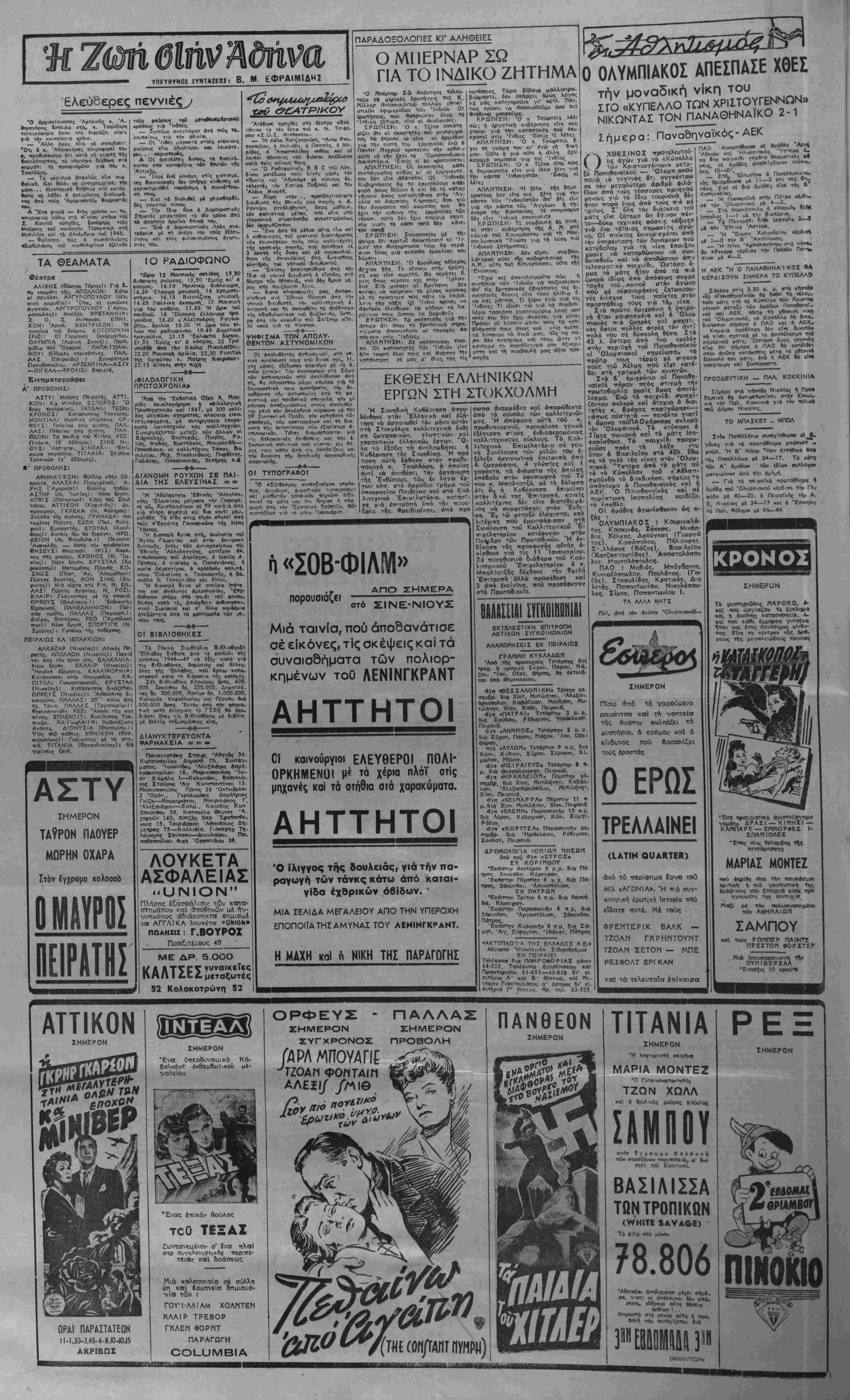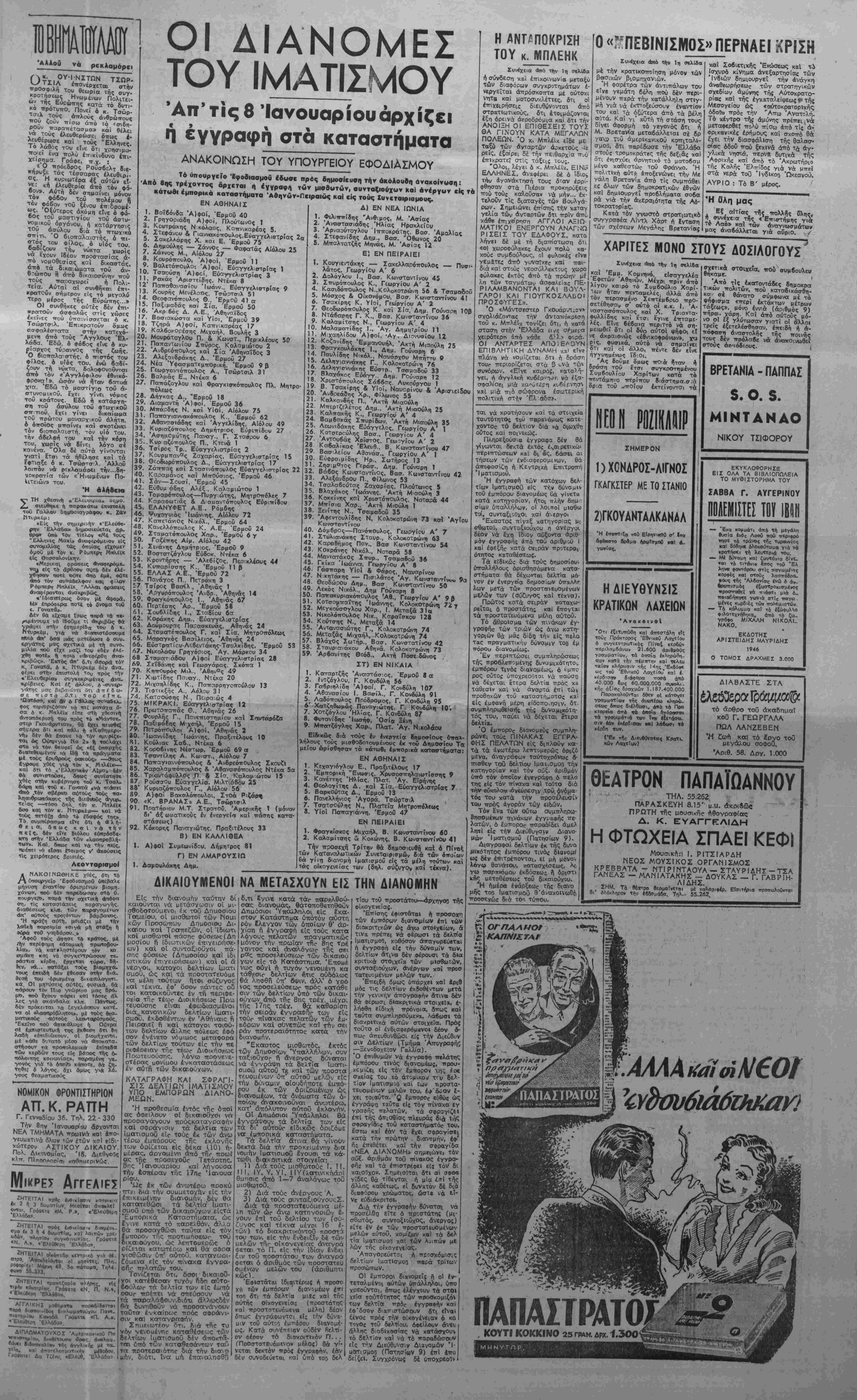 <τχα. ___ Τ0 ΕΝΟΙΚΙΟΣΤΑΣΙΟ ΘΑ ΓΙΝΕΙ ΜΕΙΩΣΗ ΤΟΥ ΘΕ Μ ΤΟΥ ΜΙΣΘΩΜΑΤΟΣ; Ό ύπουργός τής Λικαιοσύνης κ. Χατζηπάνος ανεκοίνωσε σήμε¬ ρα δτι δέν άπθκλείεται νά συνέλ 6ει αϋριο ύπουργικό συμβούλιο πού θά ά^χοληθεϊ και μέ τίς δια τάξεις των άρθρων έκείνων τού ε¬ νοικιοστασίου πού άφοροΰν τό Θε μιτό μίσθωμα καϊ γενικά τα πολ λαπλάσια,^ τα όποΐα Θά κανθνι- σθοΰν σέ έπίπεδα χαμηλότερα Των ήδη όρισθέντων. Τ5ΕΧΟΙ ΑΝΤΙΠΡΟΣΩΠΟΙ Άνακο.νώθηκε αρμοδίως δτι στΐς 15 τρ. ϊρχονται στην ,ΑΘήνα δυο Τσέχοι άντ·.πρόσ«οποι γιά έμ πορικές δναπραγματεύστ.ις. Ο ΙΤΔΛΙΝ ΕΥΧΑΡΙΣΤΕΙ ΤΗΝΚΕΝΤΡΙΚΗ ΤΟΥ ΕΑΜ Ό έδώ επιτετραμμένος τής Σθ βιετικής "Ενώσεως κ. Τσερνίτσεψ έγνων^οττοίη— (—ήν κ.Ε. τοΰ ΕΑΜ δτι ό στρατάρχης Στάλιν τόν έξουσιοδότησε νά τής διαΛι βάσει τίς εύχαριστίες τού γιά τα συγχαρητηριο: πού τοο απηύθυνε μ« την εΰκσιρίχ των γενεθλίων τού. Ιδία γνωστοττΌίηση έν.ανε ό κ. Τσερνίτσεφ χαϊ στόν ττρόϊδρθ τοθ Ελληνοσοβΐετΐκοΰ Σανδέσμου συν Κιτσίκη. ΟΙ ΑΝΕΥ ΟΗΤΕΙΔΙ ΙΕΡΟΕΞΕΤΑΖΤΑΙ ΘΕΣΣΑΛΟΝΙΚΗ 6. (Τοθ ά* τ-αποκριτοθ μας).— Δύναμη 150 δνευ Θητειος χ«ροφυλάκ»ν έπέ- δραμε στο Μεταλλικό τοθ Κιλ κις και προέβη σέ όμαδΐκές συλ Αηψεις, ξυλοδαρμους γεβόνΤων κο1,λεΐλασίες σπιτιών. Άπό τούς συλληφθέντες γέρους μετεφέρθη- βαν 65 στό Κιλκίς. ^Η περιφέρε.σ είνε αναστατη. Ο ΠΡΟΕΔΡΟΣ ΤΡΟΥΜΑΝ ΘΑ ΑΠΕΥΟΥΝΕΙ ΔΙΑΓΓΕΛΜΑ ΛΠΟΨΕ ΣΤΟ ΚΟΓΚΡΕΣΣΟ ΤΙ ΘΑ ΥΠΟΣΤΕ ΡΙΞΕΙ ΝΕΑ ΥΟΡΚΗ. 6. Πδ. 6πΛ. —Τηλενραφουν άπό τή Βάσιγ¬ κτων δτ( ό πρόεδ·ρος Τοοϋιααν β« τταραστεΐ στη σηαερινη κοι- νίι συνεδρίαση τήΓ Βουλης και Περουσιας κα| θά άνακοινώσει το προεδρικό διάννελαα ιιέ τή ευκαιρία τής ενάρξεως των έο νασιων τοϋ νέου Κονκοέσον. Στό διάννελμα θά τονίζεται δ¬ τι έπιβάλλετσι η δισηΊρτιση των οημρρινων σνέσρων αέ τού<- οεπουιατΐλικάνους κα1 στά βασι κά τού σημεΐα θά συνιστά αε- τοιοττάθεια τόσο σττιν νουοθε- σ!σ εναντίον των έργο—ικών ά- πεονιων 8σο κβϊ στά ζητήμοττα τοθ πεοιοοισμοθ των Φορολογί¬ αν καΐ γενικότερα σττι δασ-ιο λονικίι πολιτικη. 0ΛΠΑΓεΤαι. δτι 6 ?· Βά ολοκληρωσει την στ τού πρός την συντηρτντικη μρ- οιοα των Δημοκρατικών κσί 9α διεοουνει τό γάσα« ποθ 'όν νω ρκει αιτό :ούς άριστεοού,- δη- «θκρστικους, των οποίων Λυρϊ- ται 6 κ. Ούάλλας. Ό -ροσανα *χ». θά τόν Φέοει τιλησιέστεοα στους Ρεπουμπλικάνους. θά Ε- νει άπθφσσιστικτΗ σημασίαστην ίιΐΦάνιση τού τοίτου κόιααςν—ογ. τιου άπεφασΐσβη ττ τελευ'αΐε- Ι^'0^· οτ*ι "ενάλη συ..·.ίντρώ ^ Ιη° Ν1 ,Υ60^^· Ό Άϋερι ^94 έτηδίώζει στβν μέσο οοό· "° «β τους Ρεττχ)υιΐττλι«ότνους. τους όποιους θά προσπαθήσει νώ πεισει νά μή θελήσουν νά έκ αεταλλευθοΰν την σημεοιντί " ^εια κο.τάστσση νιά κοιιματι- κους νόγους σγετιζριΐένουτ μέ ^'^^ές έκλον*- τοθ τοΰ Ρώ ί ΛΪ*661—^ ττΡακτορείο ότι 6 κ. Τροθμαν πιστε6ει οθΡει νά συνεονασθεΐ αέ Ρ1πο^ττλ.κάνουΓ στήν έ- έπθικοδομτιτ,κοθ νοαο , κινωνικ ς εΐρήνπς σττ, ΐ Ηνω~ Πο -ινμη είσ κσι σπ