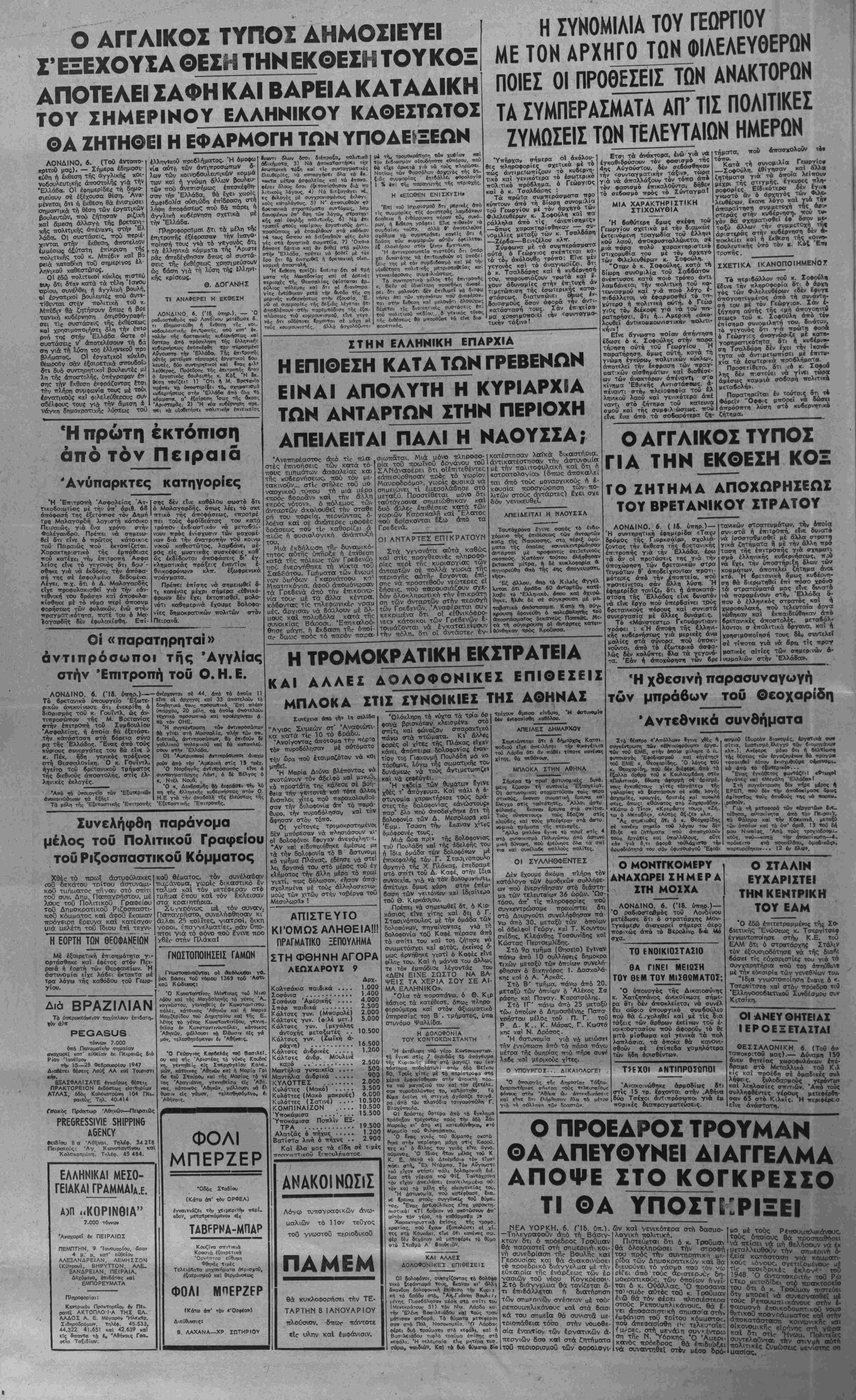 Ή συντηρητΐκη εφημερίδα «Τα<υ δρόμθς τής Γιορκσάιρ», σχολιά- ζοντας την Εκθέση τής βρετανικής επ'τροπής γιά την 'Ελλάδα, έρω τα αν οί προτάσεις της _γιά την άποχώρηση των δρετανικών στοα τευμάτων Θ' άποδείχνονταν ττροτι- μότερες άπό την ^ποπτεία, πρίι τΓρθτείνεται σάν δλλη λύση- Ή εφημερίδα τονίζει δτι Α άποκατά- σταση τής ' Ελλάδος είνε δυνατόν νά είνε ίργο πρΰ 6περ6αίνει τρυς βρετανικους ιτόρους και οτυνιστά συνεργασία μέ δλλες δυνάμες. Τό «Μάνστεστερ Γκθυάρντιαν» γράφει : «Ή αποψη τής έλλη*- κής κυβερνήσεως γιά μερικές άν» μαλίες στά σύνορα ιτού ΐιπθκι- νοϋνται άπό τό έξωτερικό ασφα¬ λώς δέν κβλύπτει βλα τα 'γχγονό- τα. 'Εάν η άποχώρη<~! των 6ρε τανικών οττρατευμάτιον, την όποία συν.στά ή έπιτρΟπή. είνε δυ^ατό νά ίσθσταθμισβεί μέ δλλα στρατ^ γικά ζητήματα ή μέ την αλλη προ ταση τής έπιτρθπής γ^ιά σχηματι σμό έλληνικής κυβερνήσεως, που νά ε'χει την υποστηρίξη δλων των κομμάτων, αποτελεί ζητημα άνο» κτό. Ή βρετανικη δμως; κυβερνη- ση βά δ'ερωτηθεΐ επι ποσο χρόνΟ τα στρατεύματά μας €εΤνε δυνστό νά παραμένθυν στήν 'Ελλάδα δ- που ό έλληνκός στρατός καΐ ή χωροβιυλοκή. ττοϋ τελευταία όργα νώθηκαν καΐ έκπαιδεύθηκσν άπό βρετανικές άποστολές, μεταβάλ- λονται » επολιτικά δργανα, και ή χρησ'.μθττοίησή τους δέν συντελεί σέ τίποτα γιά νά άρει τίς πραγ μοτικές αίτίες των σημερ.νών ά- νομαλιών στήν 'Ελλάδα». Ή χδεσινή παρασυναγωγή των μπράβων τοϋ Θεοχαρίδη Άντεθνικά συνβήματα Ο ηρ «τή,υρα τούς Τ€λίιτ~ίοι,Γ φίνοι* στΛν 'ΑΘιτλι 6γ ΑνττκΒικΑσίκ κα εϊπε 8τι ίλή»9ησαν δλα Τα ιιέτοο γιά τή σθλληψη των δραστών Στό θέατρο «Άπδλλων» Ιγινε χθες ή ουγκέντρωση των «έθνικοφρόνων» έργα. Τόν τοΰ ΕΜΕ, στήν όποία μίλησε ό ύ_ φι/τΓθυργός 'Εφοδιαο-μοΟ καΐ «ήγέτης» τοθ ΕΜΕ κ. Θεοχαρίδης. Ό λόγος τού κ. Θεοχαρίδη, πού δίν οιέφερε άπό τα £ζαλλα άρθρα τού κ Κουλουμδάκη στόν «Πολιτικό», ϊδωσε άφορμή σέ όρισμί. νους έγκαβέτους χϊτΐς «έργάτες» Τή»; γαλαρίας νά ξεσπάσουν (τέ κάβε λθγής άσχημΐΐς, κρανγές, βρισιές καΐ ποοκλΑ σεις, δπως[ «θάνοπος στό Ζαχαριάδη», «Κάτω ό Τΐτο», «Κρεμαστε τους» «Ζή., τω^ό Μεταξάς», «ΑΟτός βξιζε» κλπ. "Ας σημειωθεϊ βΤι Α κ. θεοχαρίδης σε κανένα σημεΐο τοΰ λόγον τού δΐν ίθιξ* τα ζητήματα ποΰ άπασχθλοθν τούο έργώτες καΐ ίηταλλίλους, οθτε κάν γιά δ,τ ι άφθρ& τοθλάχιστο την αρμοδιότητά τού σάν ύφυττθυργθϋ 'Εφοοι οσμοΰ (δωρεάν διανομές, έργοτΓικά οχ· σΐτια, Ιματισμό,ϊλεγχο των βιομηχάνον κλπ.). Ανέφερε μόνο δτι ή βελτίωσι) τής θέσεως των εργαζομένων θά πραγμ· τοποιηθεϊ «δταν ένισχυβοθμε οί'κονομι. κά άττό Τό έξωτερικό*... "Ενας έγκάθετος φωντάζει: <Φτο>χοΙ