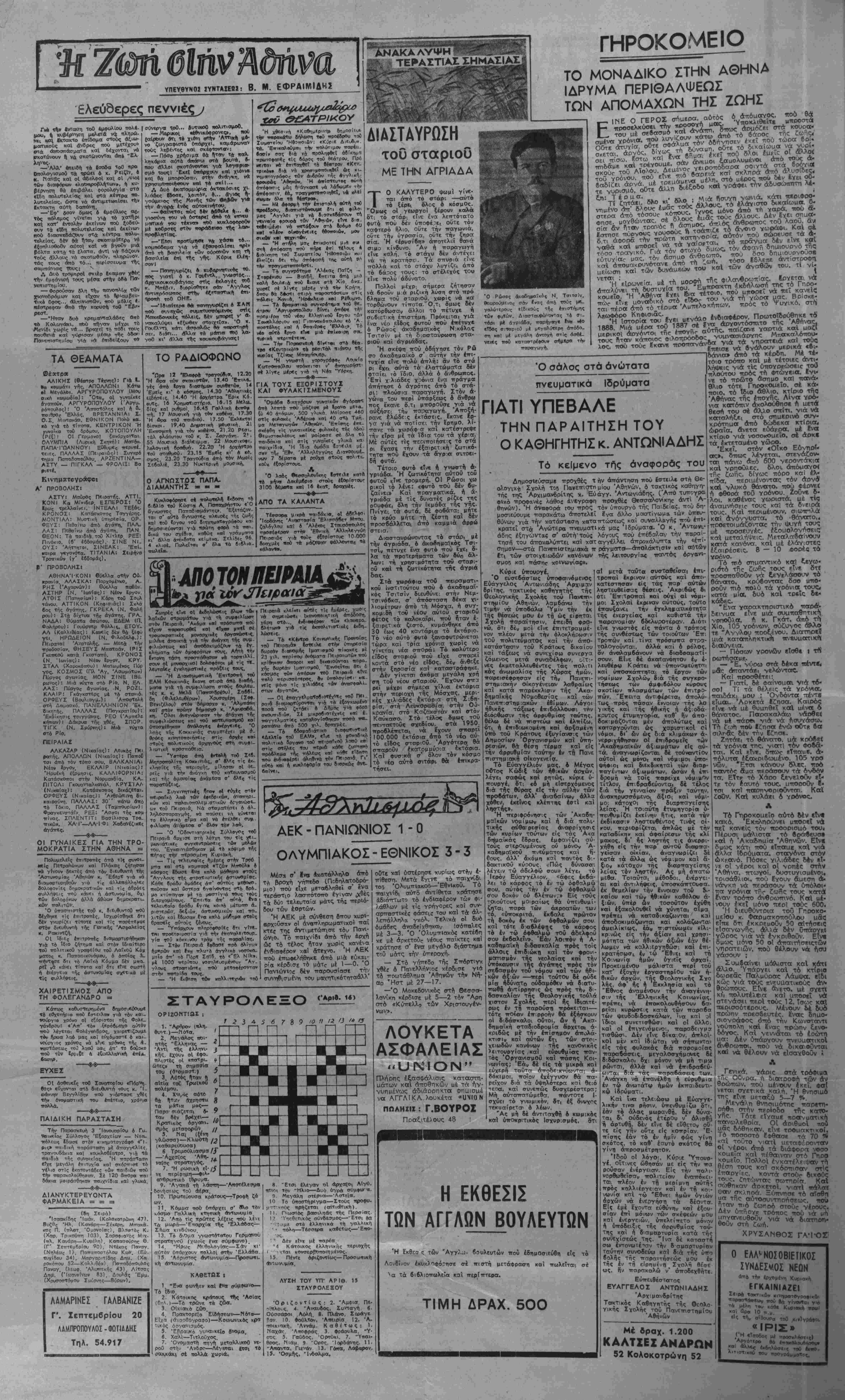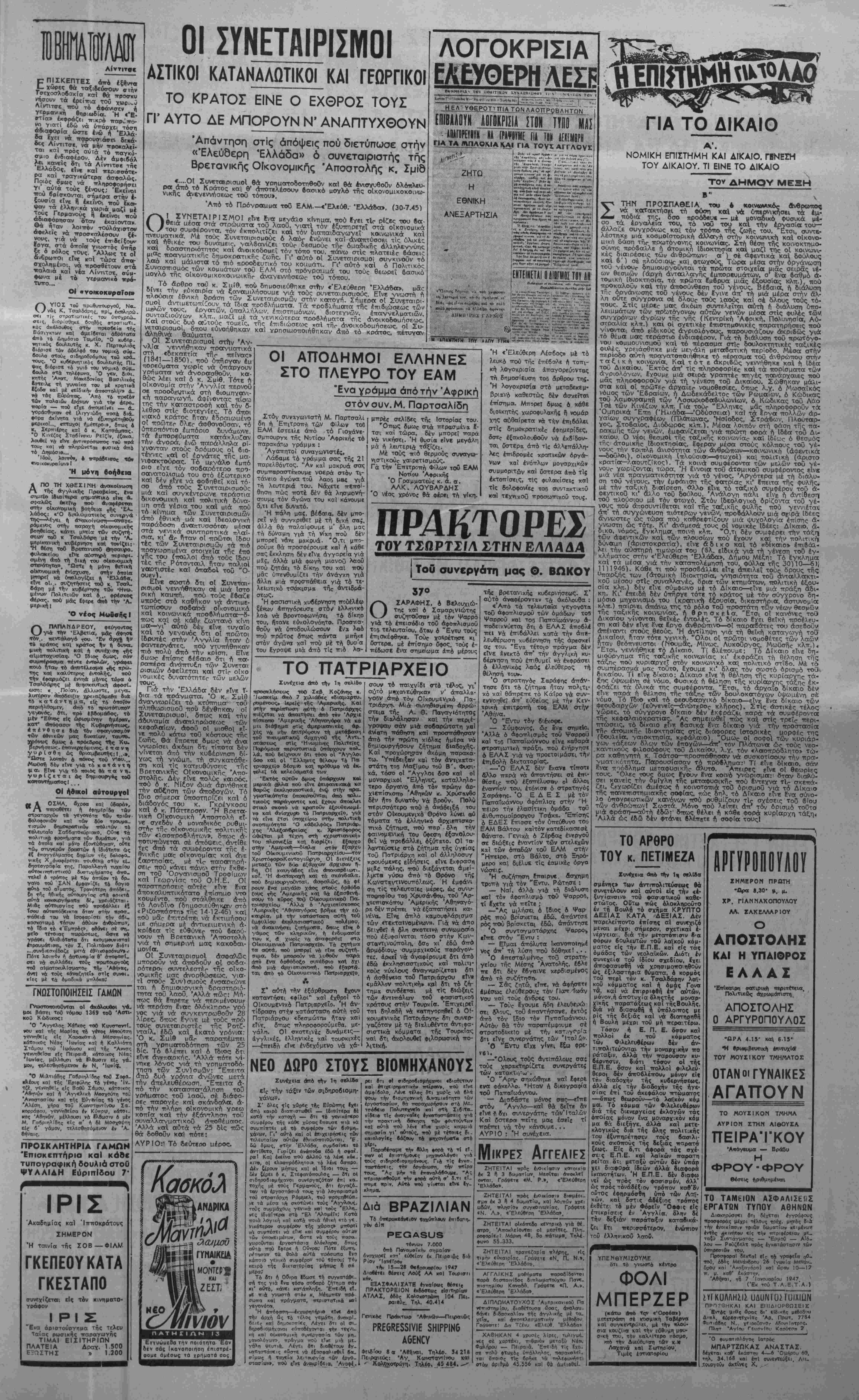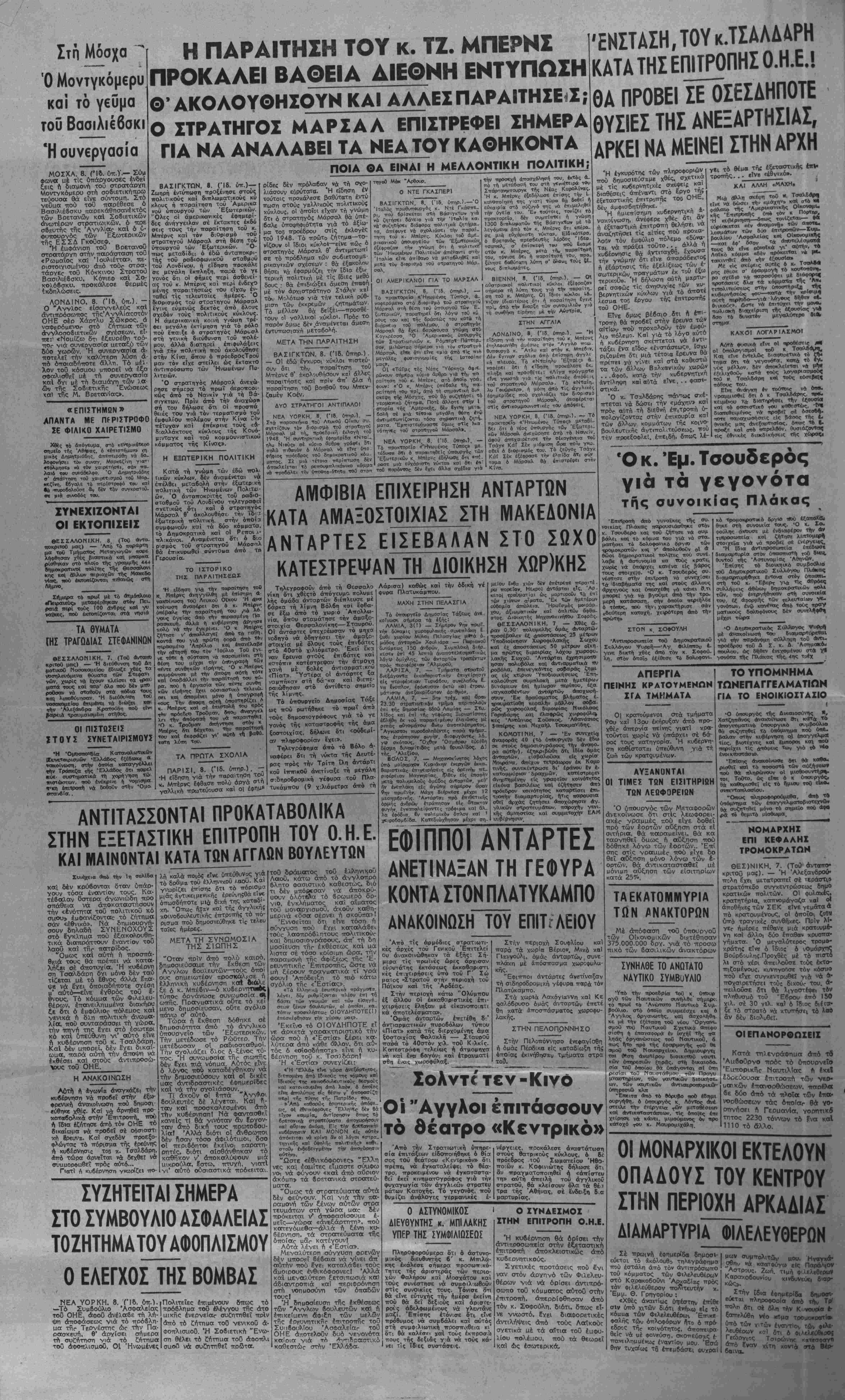 τού υ. Τσαλδάρη κο* τούς ε6σεΡ<^ ηόθοιχ: τού. Είνε 4ν*γκη εν τούτοις ·α οιβ. νρομμισβεϊ δτι 6 κ Τσολδόιρτκ., —·. κειμένου ν^ δκτττρήσίι τήν έςουσίβ κσΐ τό φσσισΤικ* τού καβεστώς, 'ΪΗΙ διοΛεβειμένος ν* ττροβεΐ οί δσιοβν ποτε τκΐοοτχωοήσεις είς Ρ*οο< τής ία θνιχής ματς Λνεξαρτησΐας, &πωο Τβ (. ιτραζε κοί στ6 ττσρίλθόν, θυσιάζοντο»· τίς έβνικές διεκδικήσεις ΐής χώρβ^ι Ό κ. Έμ. Τσουδερός γιά τα γεγονότα τής συνοικίας Πλάκας ΈτιΛροττη Λτ6 γυνσΐκες της ου. νοικίας Πλάκσς τκφουοιάσθηκε στόν κ. Τσοαδίΐρό καΐ τοθ ζήτησε νά συμ βάλει κσΐ τ6 κ6μμα τού γιά νά στσ- μσΐτήσει τό δολοφονικό δργιο των τροιμοκρστών καχ V Λιΐολυθοθν οί * βώοι δη,μοκροτιχοΐ τκ>λϊτε<; κου συνέ. λα^ε ή άστυνομίο: κο τοθς κρστε, χωρίς νά οπάρχει κσνένσ είς 34ρος τους στοιχεΐο. Ό κ. Τσουδερός συ. νέστησε στην έτΐιτροπη νά συνεχίσει Τ4 δισβήμστά της κσΐ στούς άλλους «Ιρχηγούς και ύ—σχέθη να κσνει σ,Τι μπορεΐ γιά νά Ργοΰμϊ 4ιτ6 την τρο- μερη κατάσαση, σήν διτοΐα περιήλθε 6 τόκθς, τίθύ την, χβραικτήρισε σάν «6ευτερη κατοχή, χειρότερη Αιτό την "ώτη» ΣΤΟΜ κ. ΣΟΦΟΥΛΗ 'Λντιιΐροσωπεία τοθ ΔημσκρστμκοΟ Σιιλλογου Ψυρρή—*Αγ. ΦιλΙιτιτθυ ί- γινε δεκτή χθές άπτύ τόν κ Σοφού¬ λη, στόν όποΐο εξέθεσε τό ΒοΑοφονι- κό τρομοκροπικό δργιο κου £ θηκε στή συνοικία τους. Ό κ. Σο- φούληΐ ήκουσε μέ ένδκΐφέρον τήν Ο» τικροοωπεία καΐ ζήττσε λεητομερΙ^ στοιχεϊβ γιά νά ττρο^εϊ σέ ενέργειβς, Ή Ιδία βντιτιιροσωΐΐείοΐ έπέδωσβ δι«μαρτυρ1α στόν ύποοσηκττή τοθ δΚ(^ θυντοΰ της 'Αστυνθιμίσς Αθηνών. Έττίσης τό Βιοικηικό συμβούλιο τοθ Δηιμοκροπικοϋ Συλλσγου Πλάκας διαμαρτυρηθή» {ντονσ οτον ύπαοκι. στή τοϋ κ. "Εβερτ γΐΛ τίς ΟΘρόες στΑλήψεις άβόχύν δτνμοκρστικών «ολ* των, τκΛ ένεργήθηικισν στή συνοικΐβ τού, (£. άφορμής Των τελευΤαίιον Υ*. γονοτ<οτν, ένψ κοίνένοις Απ0 τούς «ρ«χν μοττΐικούς δολθφόνους δέν σννελήθθ·, μέχρι τώρο Ό Δημοκρστικός ΣύλΛ&νος ρή μέ ανακοινώση τού διαμσρτύρεΤΠΙ γιά την τταρανομη σύλληψη τοθ ανΤι. προέδρου τοΰ Δ Σ. κ. Δ. Ά—μακδ* πουλου, ώς 6τθεν ένεχομένου στ* Υ« γονοτα Της Πλάκας τής, 4ης Τρίχ ΔΠΕΡΓΙΔ ΠΕΙΝΗΣ ΚΡΑΤΟΥΜΕΗΩΝ ΖΓΑ ΤΜΗΜΔΤΑ 0| κροτΓούμενοι στά τμήματα 9ου ·χαι 13ου εκήρυξαν άπό προ- χθέο άττεργία ττείνΓΐς γιατϊ γρα- τοΰνται χωρΐς νά ΰπάρχει σέ 6ά- ρο< τους κατηγορίβ. 'Η κυβερνη- ση καθίσταται Οπεύθυνη γιά τή ζωπ των κρατο,υμένων- ΑΥΞΑΝΟΝΤΑΙ ΟΙ ΤΙΜΕΣ ΤΩΝ ΕΙΣΙΤΗΡΙΟΝ ΤΩΝ ΛΕΩΦΟΡΕΙΟΝ Ό ύπουργός των Μεταφορων ανεκοίνωσε δτι στΐς λεωφορει- ακέο νΡσμιαές_ πού εΐγε δοθεΐ προ των έορτων σΰξτιση στά εί σιτήρια, θά παρσμεινει, θά κα τορ-νηθεΐ δαοχ; ή αυξήση π,οθ δόθηκε λόνω των έορτών.. Επί σης στίς νραμ.μ.έΓ ποθ ρ.Τγε δο θεΐ _αοξηση μόνο λόνω των έ¬ ορτών, θά άντικαταστοοθεΐ ιιέ μόνιμη αυξήση των εΐσιτηρίων κατά 25%. ΤΑΕΚΑΤΟΜΜΥΡΙΑ ΤΟΝ ΑΝΑΚΤΟΡΩΝ _Μέ ότπόΦοοΎ) τοθ όττουρνοΰ των ΟΙκονομΐκών διρτέθησαν 375.000.000 δργ. νιά τό πρόσω πικό των δσσιλικών άνακτόρων ΣΥΝΗΛΘΕ ΤΟ ΑΝΩΤΑΤΟ ΝΑΥΤΙΚΟ ΣΥΜΒϋΥΛΙΟ Ύττό τήν ιιροϊ.δρΙσ. ΤοΟ κ ύτίθυρ ογθ των Ναυτικών συνήλθε' σήμερ<. τό ιιρωΐ τή "Ανώτατο Ηαυτικό Συμ- βούλιο, στό ότιοϊο συμιμείσχε και 6 "Αγγλος δργανωτής, κσΐ άσχολήθτ) κε μέ την εξετάση τοθ νέου Όργα~. σμοθ τοο ΚαυτιΚο0 Σχετικά *τεφο σισθη ή έττσναφορά έν Ισχήΐ της „« ληας ίργανώσεως τοθ ΝαυτικοΟ 4 πως ήτο προ τής έφαρμογης χοθ θ» αμου τοθ ΝαυαρχεΙου. Δημιουργή τ«ι 9»ση άνωΐέρου διοιΚΓττοο νσυτι κων 6—ρεσιών ξηρδς, στή δικαιοδο- σ(α τοθ 6ηο(ου θά όηαγοντβι «Ι ΰιτη ρεσΐοτι Τού Νστ <ττ*9μ<χι τβν Προγυ μνοκΓΤηρίων, των ναυτικων διοικήσε- ων, των ναυτικόν αντιαερο— ρικ