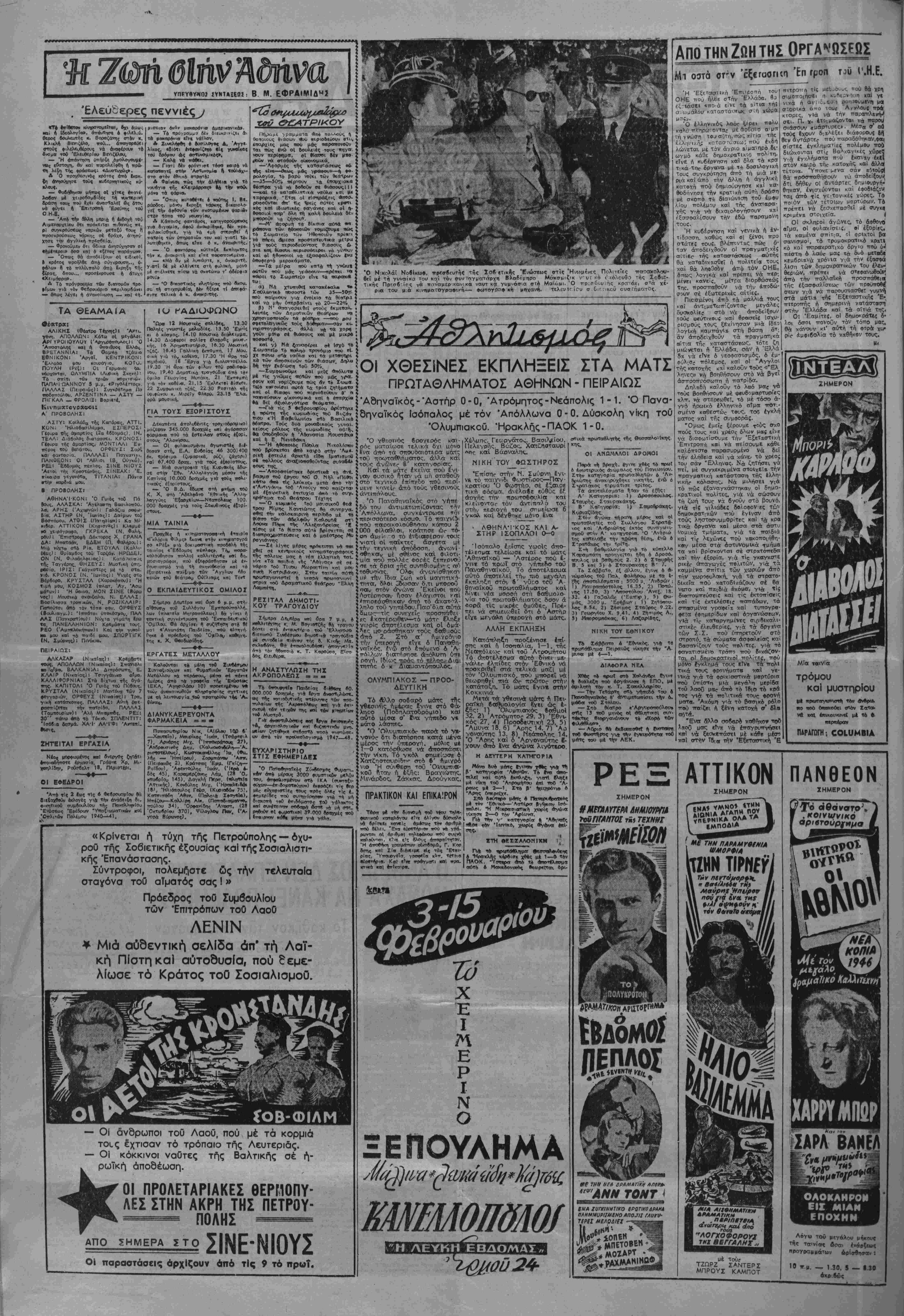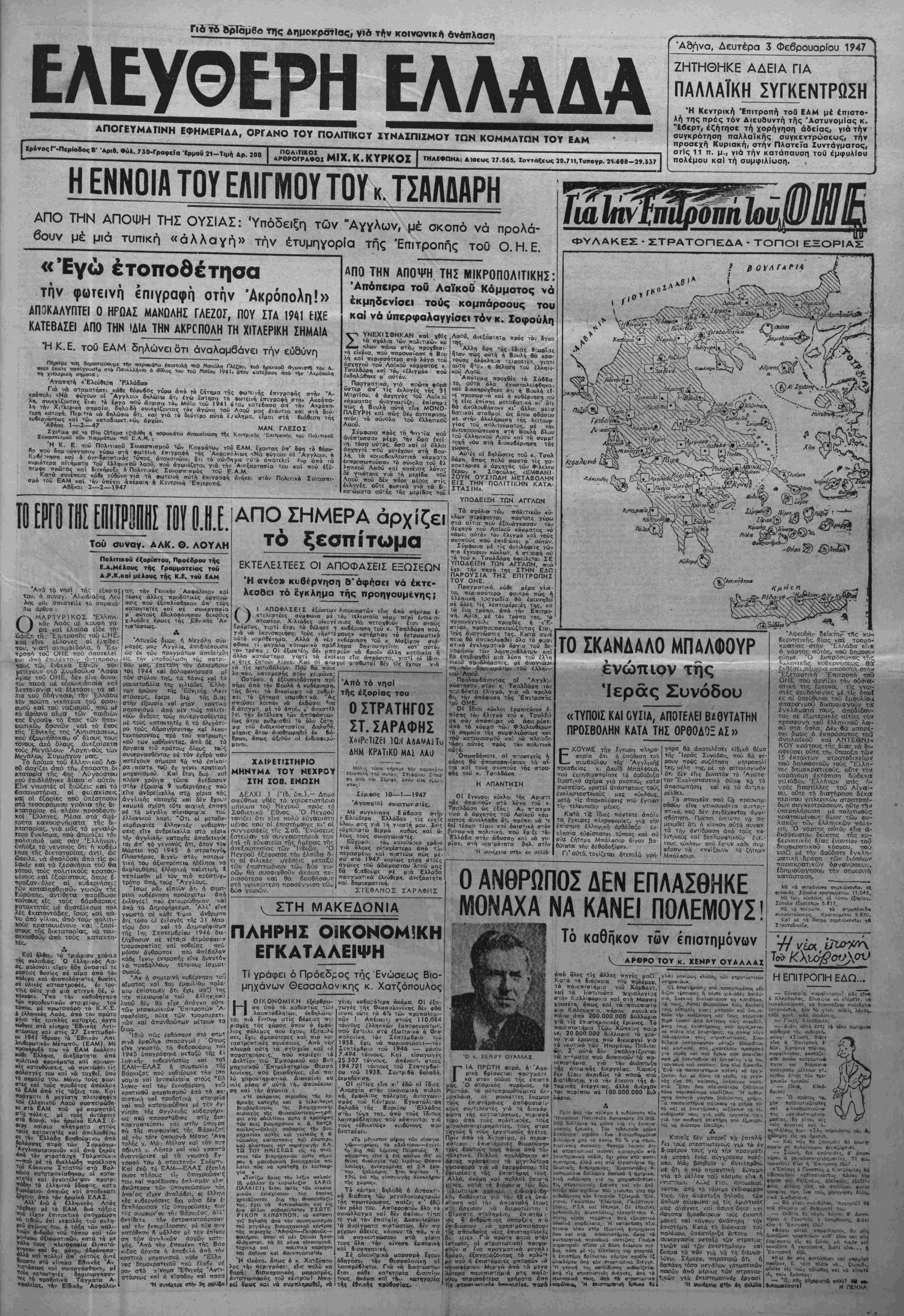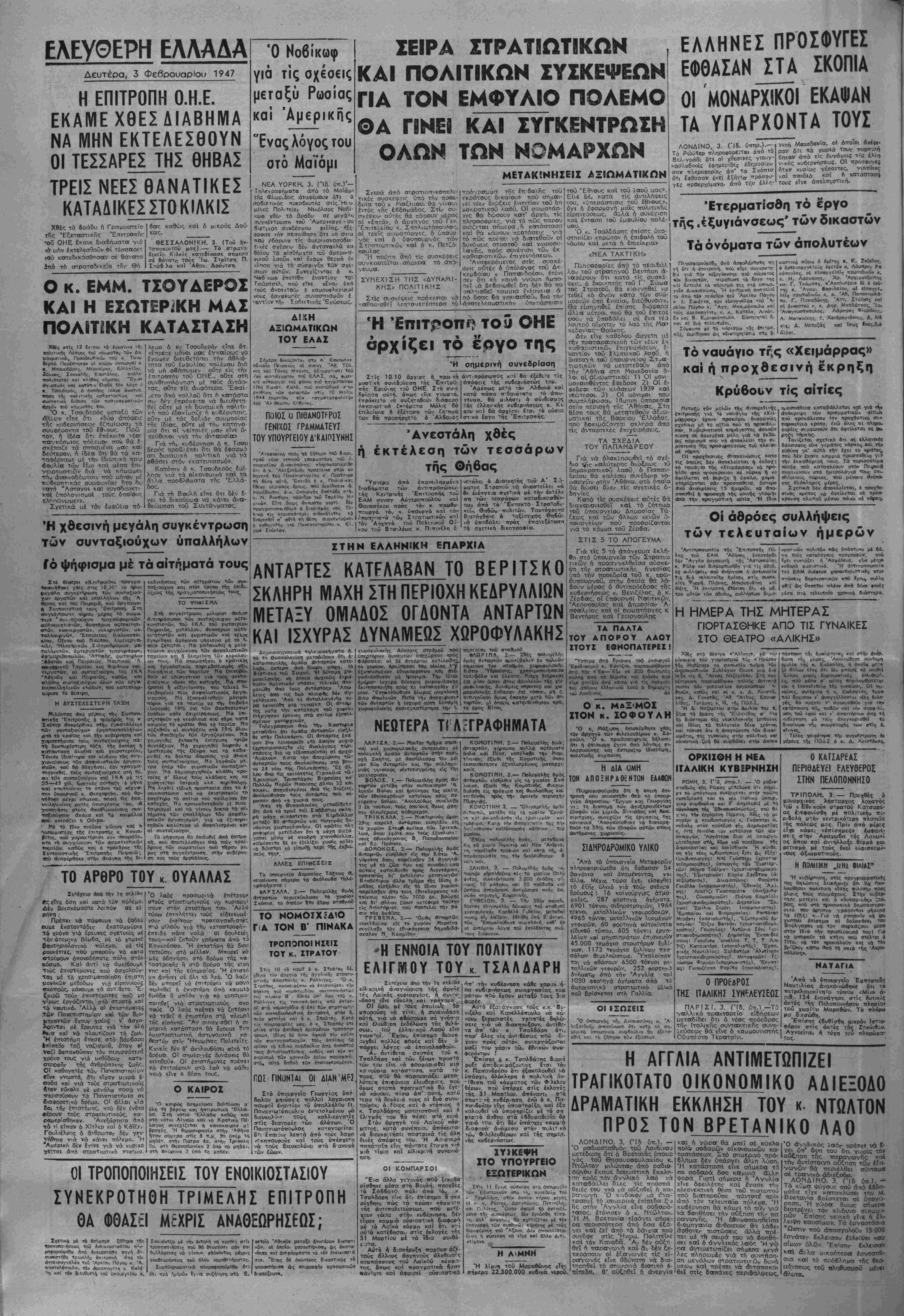 ΤΗΛΕΦΩΝΑ: 4>ο<:«ς 27.5«5. Ιυντάζβος 20.711,Τυηογρ. 21.«ββ-29.537 Η ΕΝΝΟΙΑ ΤΟΥ ΕΛΙΓΜΟΥ ΤΟΥ κ. ΤΣΑΛΔΑΡΗ ΑΠΟ ΤΗΝ ΑΠΟΦΗ ΤΗΣ ΟΥΣΙΑΣ: Ύπόδειξη των "Αγγλων, μέ σκοπό νά προλά- βουν μέ μιά τυπική «άλλαγή» την έτυμηγορία τής Έπιτροπής τού Ο.Η.Ε. 'Αδήνα, Δευτέρα 3 Φεβρουαρίου 1947 ΖΗΤΗΘΗΚΕ ΑΔΕΙΑ ΠΑ ΠΑΛΛΑΪΚΗ ΣΥΓΚΕΝΤΡΩΣΗ Ή Κεντρική Έπιτροπή τοΟ ΕΑΜ μέ έπιοτο- λή της πρός τόν Διευδυντή τής 'ΔστυνομΙάς κ. "ίθιρτ, εζήτησε τή χορηγήση αδείας, γιά την συγκροτήση παλλαϊκής συγκεντρώσεως! την προσέχη Κυριακή, στήν ΠλατεΤα Συντάγματος, στΐς 11 π. μ., νιά την κατάπαυση τού έμφυλΐου πολέμου καΐ τή συμφιλίωση. «Έγώ έτοποθέτησα την φωτεινή επι γράφη στήν 'Δκρόπολη!» ΑΠΰΚΑΑΥΠΤΕΙ Ο ΗΡΩΑΣ ΜΑΝΩΛΗΣ ΓΑΕΖΟί, ΠΟΥ ΣΤΑ 1941 ΕΙΧΕ ΚΔΤΕΒΑΣΕΙ ΑΠΟ ΤΗΝ >ΑΙΑ ΤΗΝ ΑΚΡΓΠΟΑΗ ΤΗ ΧΙΤΛΕΡΙΚΗ ΣΗΜΑΙΑ