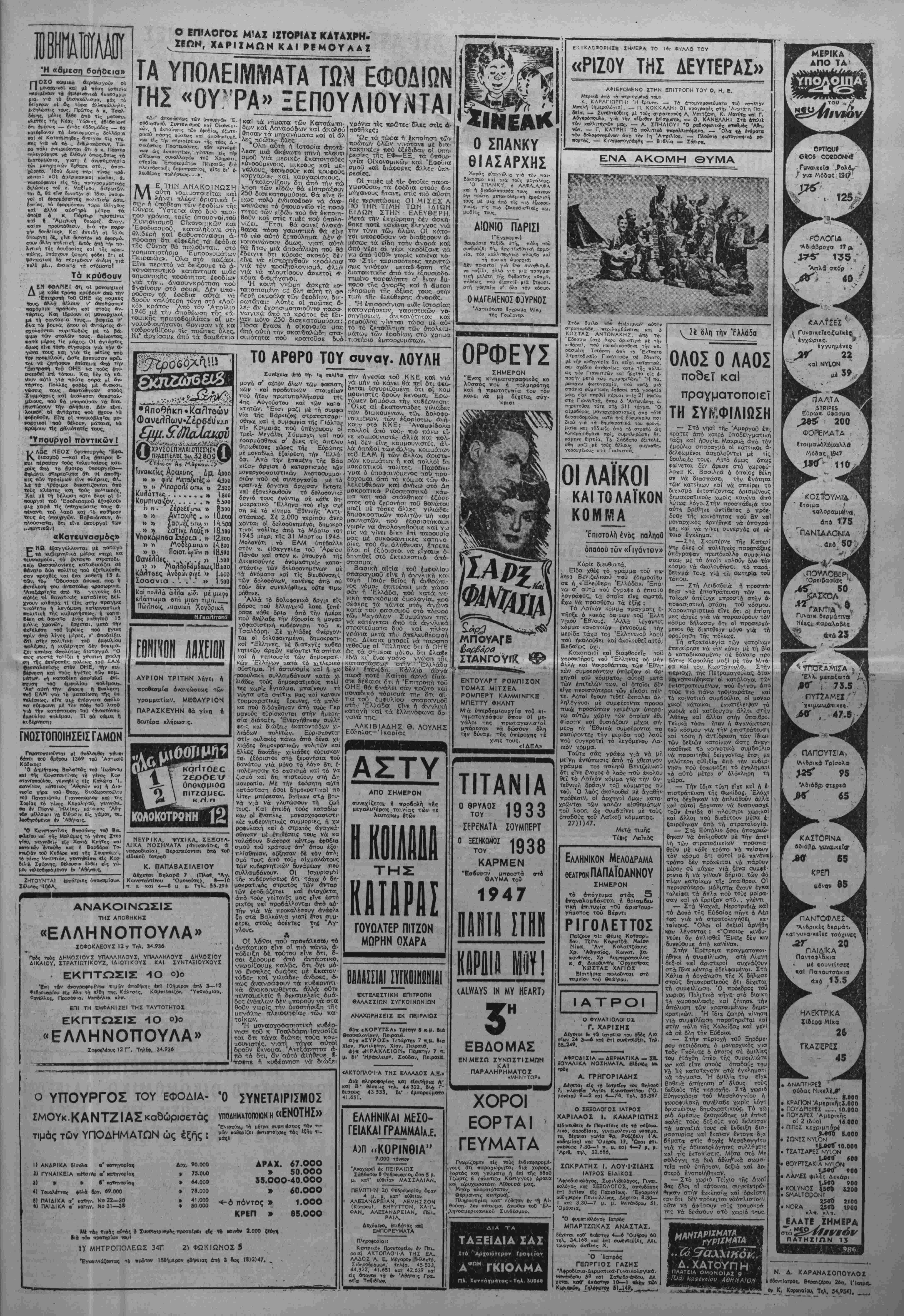 Φκό τού βργανο γραφονται σήμ£·Ρ<» τα εξής: «...Γιά νά μποροθν να »· χωνται ί,πίσημα οί δολοφόνοι τού Βούλγσροι νά Τ6ν σαρκάςουν μεσα στήν Ιδία την πριοτεύουσά τού! Γιβ νά μ—ροθν τα κτήνη πού στέλνει 6 Τίτο, να τ4ν προκαλοθν κκΐ νο τ*ν Ρρϊζοον κάτω Λπ6 τή σκια τής 'Ακρο- πόλεως». ΝΑΥΑΓΙΑ Αιτβ τό ύπουργεϊο 'ΕμτΓθρικης Νβυτιλισς άνακθινώβηκϊ 8τι τβ ττετρελαιοκίνητο τύπθυ «ΜΊν» ά- Ρ'9. Τ 34 έναυόγησε στ'ις δυτικώς οκτες τής Πελοττοννήσου πλησίον τού χωρίου Μαραθών. Τό πλήρΜ μα_ διεσωθη. 'Εττίσης έβυβίσθη μικρόν Ιστιο¬ φόρον οττις άκτές τής Ζακύνθοιι· τος. Η ΑΓΓΛΙΑ ΑΝΤΙΜΕΤΩΠΙΖΕΙ ΤΡΑΠΚΟΤΑΤΟ ΟΙΚΟΝΟΜΙΚΟ ΑΔΙΕΞΟΔΟ ΑΡΑΜΑΤΙΚΗ ΕΚΚΛΗΣΗ ΤΟΥ κ. ΝΤΟΛΤΟΝ ΠΡΟΣ ΤΟΝ ΒΡΕΤΑΝ1ΚΟ ΛΑΟ ΛΟΝΔΙΝΟ, 3. (Ί6 ύπ.). — Ο ρσδιοσταθμΟΓ. τού Λονδίνου ΐαετέδωσε δτι 6 Βρετςχνός υπουρ νός^ τοϋ θπσαυροφυλακΐου κ. Ντωλτον μιλώνταΓ άπό ραδιο· οώνου £κααε δραμστικη £λ ό λό λ α ρμη κκλη οη πρός τόν άγγλικό λοχό νά κοααδάλλει δλες τίς ττοοσπά Θειές τού γιά νά αύε,ηθεΐ ή πα- ραγωνη Ό κίνδυνθΓ νά ίνα- τροατρΐ τό σημερινά έπίπείιο ζο ής σττιν Αγγλία είνε σοδαρό- τοτός, ετόνισεν δ κ. Ντωλτον. 'Η Μ. Βρετανία είσάγει σήαε- οα περισσότερσ άττό 8σσ έζά- γει κσΐ ζεΐ άπό τα δάνεια τιού συνηψε στίς Ήνωα. Πολιτεΐρς κπΐ τόν Κοτναδδ. "Αν δέν αύίχ θεϊ ή παρανωνη καί αν δέν ξρ- ττεράσουν οί έδαγωγές τίς εΐ- σαγωνές είνε άδύνστο νά δισ- τηρπθεϊ τό σπυρρινό βιοτικό <- πίπεδο, θ' σύξηθεΐ ή άνεργία καΐ. τί γώρα θά μπεΐ σέ κύκλο πολυ αοδαρών οΐκονομικών κα- ταστάσεων. Στό σηαερινό ·πρό- δληιχσ δέν ύπάργει άλχη λύση. Η κατάστασή είνε σηαεοα τό οο σοδαρά δσο καμμιά αλλρ Φρρά ΓιατΙ σήμρ.οα Λ Άννλία είνε δφειλέτπς καΐ έΎασε τΊν ΐ:λρ.ονεκτιΚΓΐ θέστι τοθ πιστωτού που διατηροθσε ττάντοτέ πρϊ» άπό τόν τελευταϊο πάλειιο. "Η κυβέρνηση θά κάαρΐ τό πίίν νιά να βοηθήσει την α<5ζη(— τήτ πσ ρανωνής. Ή έβνΐκοποιηθεΐσα διοαηγανια άνθρακος θΓ"ί λάδΐι άφθονεΓ πιστώσεις τϊλλά πρέ· ττει αέ τί) σε'θά τού νά βοηθπ- σει καΐ 6 άννλικάς )αό«: Ή γώ οα άντιιιετωπίζει στΊιΐεί>α μενά