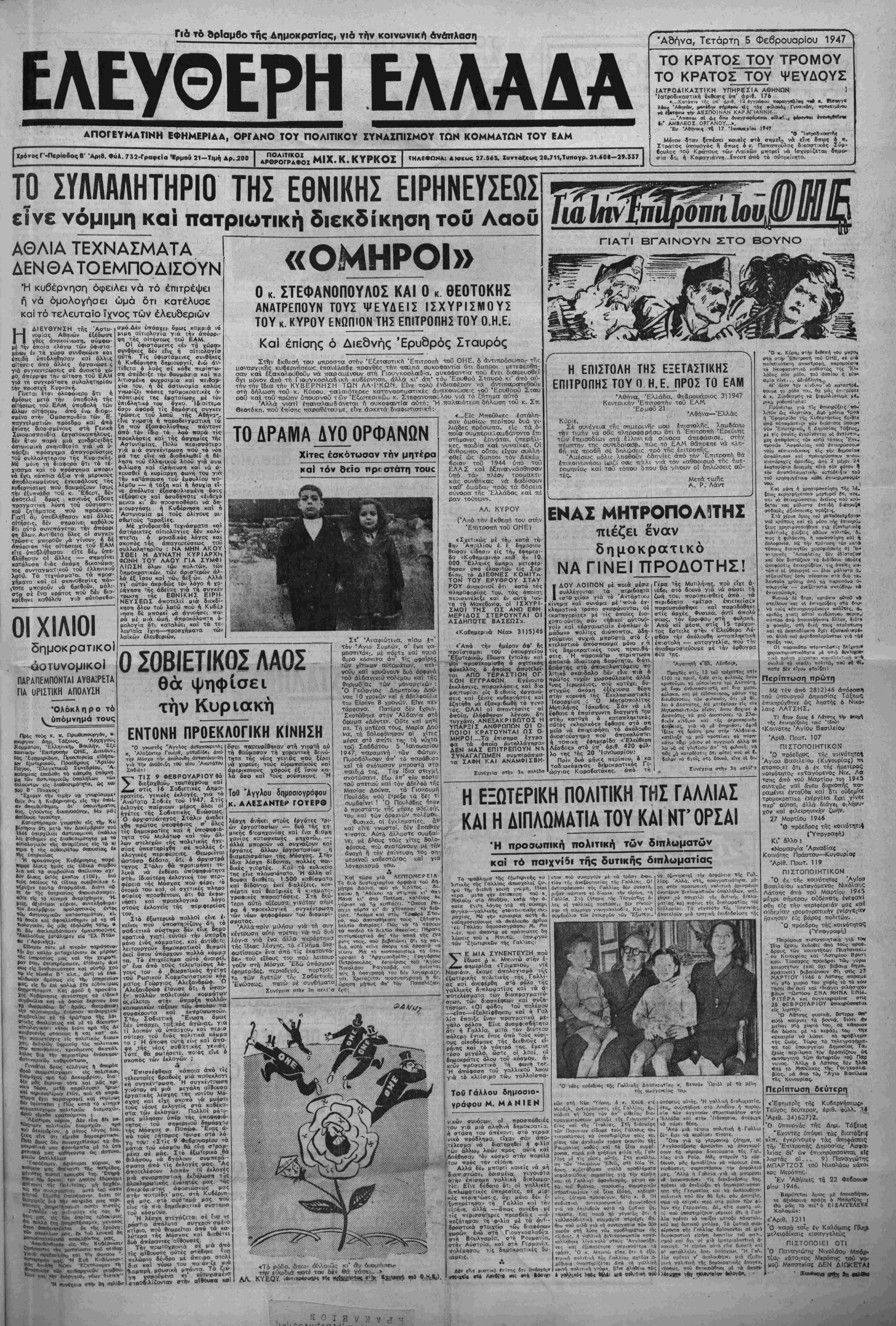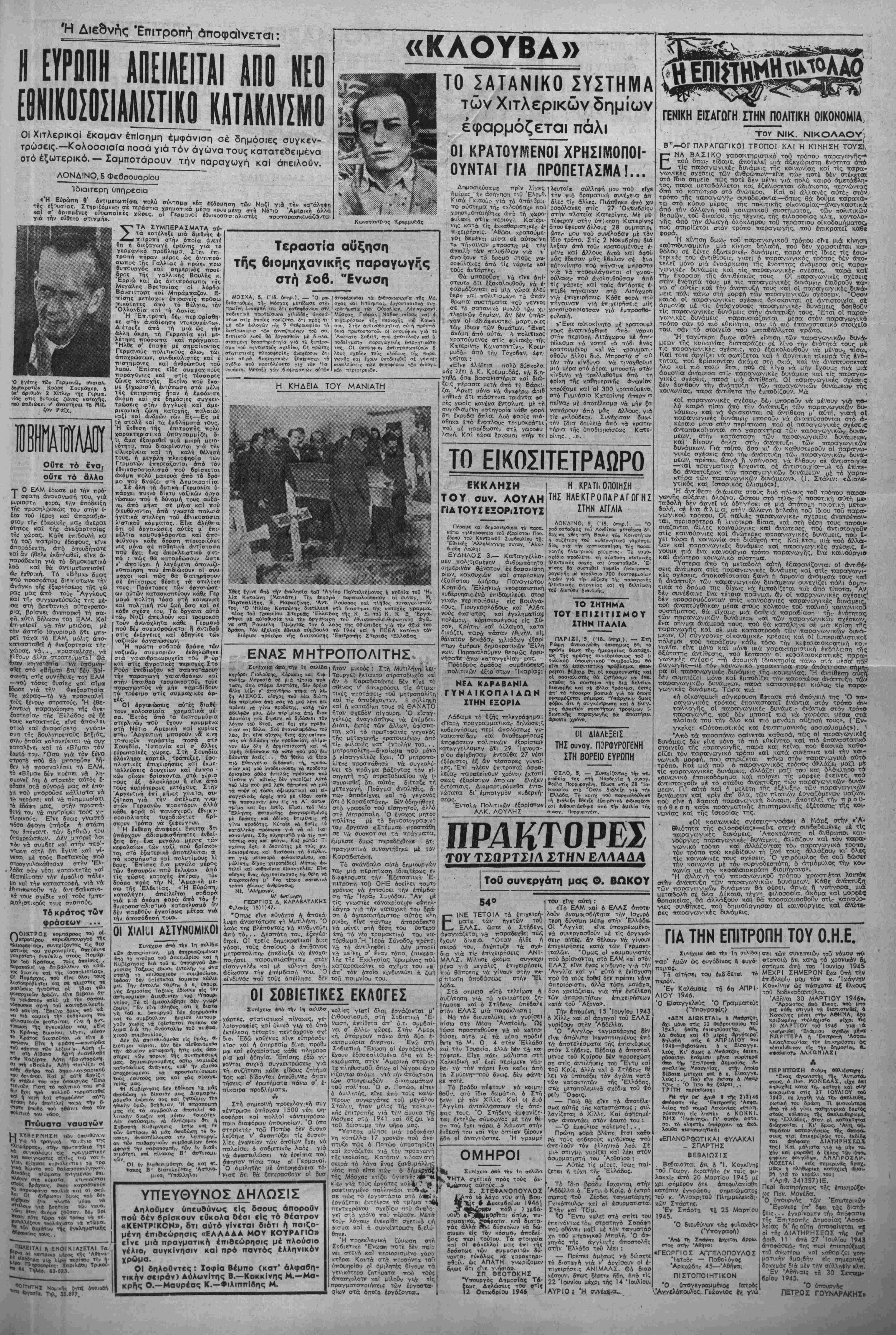 ...Άπασαι αί ώς αν» αναγροφομ«ι— φύλετ,Ι... ε4ρβν*αι 1ιιΐιι>»χ<ι1ιΐΜ •ι* ΑΜΒΛΕΟΧ ΟΡΓΑΝΟΥ...». •Εν 'Αβηναΐί τί 17 ΊανβνβρΤβυ 1»4Τ *©■ Ίβτροβικβοτηβ, Μόνον ίταν ξεπίατει κανιΐς —4 «τημιΤο να είνε 8πως ό ». Στράτθς ΰπουργός τ όπως ό κ. Ποπτο—οΰλος δικαστικός Σύμ- βουλος τού Κράτθυς των Λαίκών μπορεΐ να Ισχυρίζεται δημο- σίβ δΐι ή Καραγιάννη...£πεσϊ άττό τό αύτοκίνητο. ΑΘΛΙΑ ΤΕΧΝΑΣΜΑΤΑ ΔΕΝ Θ Α ΤΟΕΜΠΟΔΙΣΟΥΝ Ή κυβέρνηση όφείλει νά τό έπιτρέψει ή νά όμολογήσει ώμά ότι κατέλυσε καί τό τελευταίο ϊχνος των έλευδεριών Η ΔΙΕΥΘΥΝΣΗ τής Άστυ- νομίας Αθηνών έξέδωο-ϊ χθές ανακοινώση, σΰμφω- με την όποία «λόγω των υφιστα¬ μένων έν τη χώρα συνθηκών» και ίπε'δη ύττεδλήθησαν καΐ αλλ-.ς αίτήσεις άπό άλλες όργανώσε.ς γιά συγκεντρώσεις σέ άνοικτό χώ ρθ( απερριψε την αϊτηση τού ΕΑΜ για τη συγκροτήση συλαλητηρίθυ ίήν προσέχη Κυριοκή. Γίνεται έτσι όλοφανερο δτι ή άμεσως μετα την ύποβολή τής αίτήσεως τού ΕΑΜ ύποβολή τί>ν