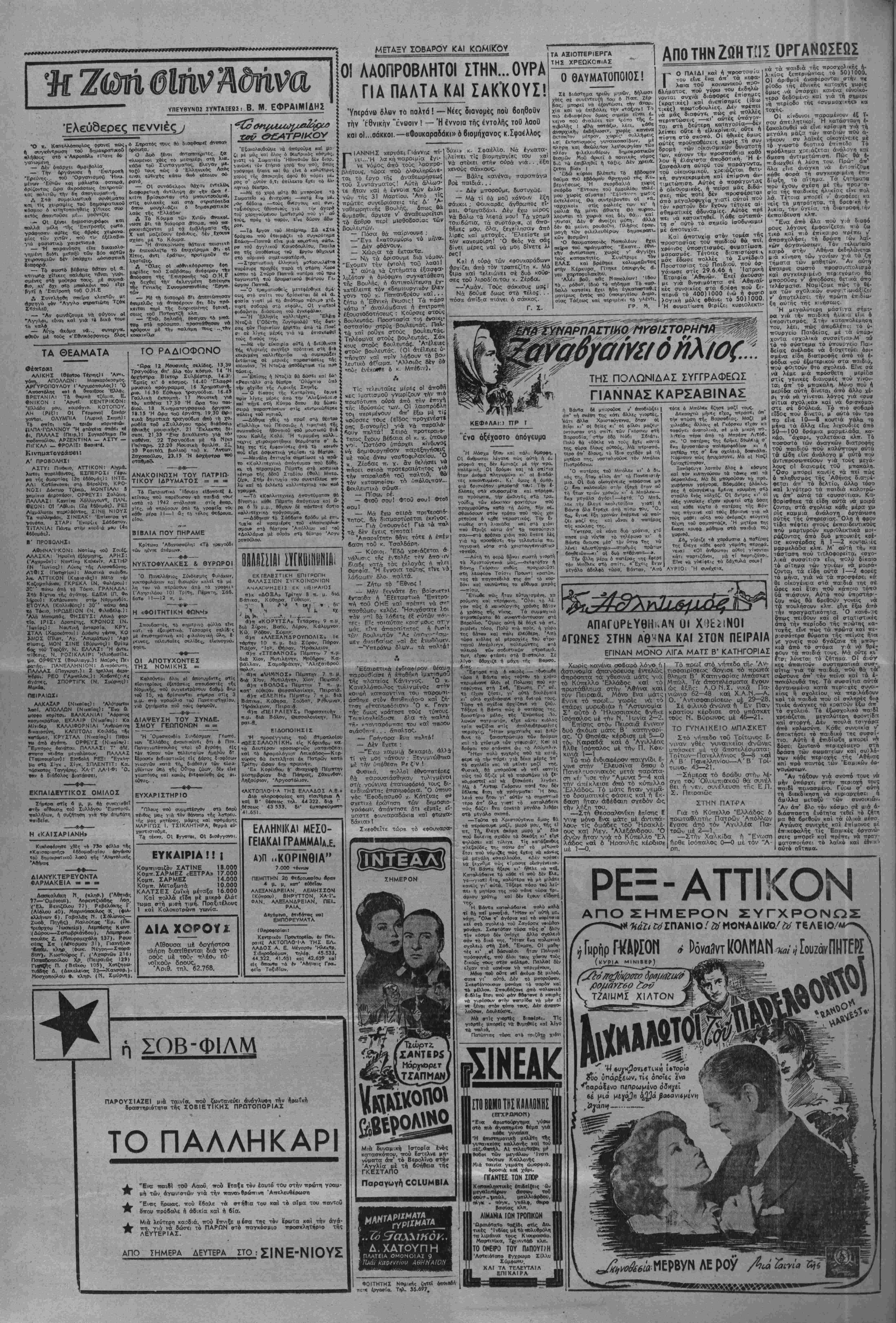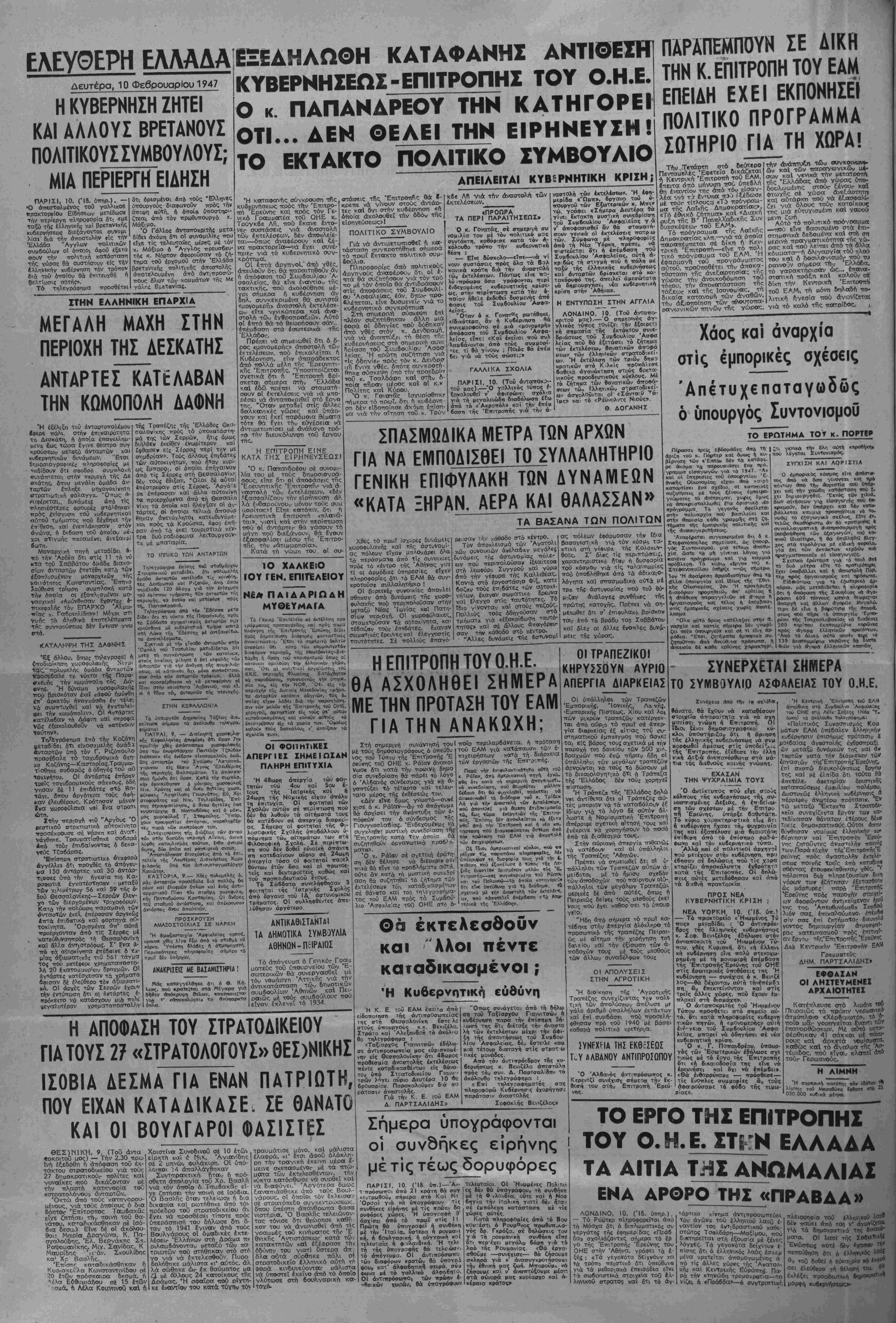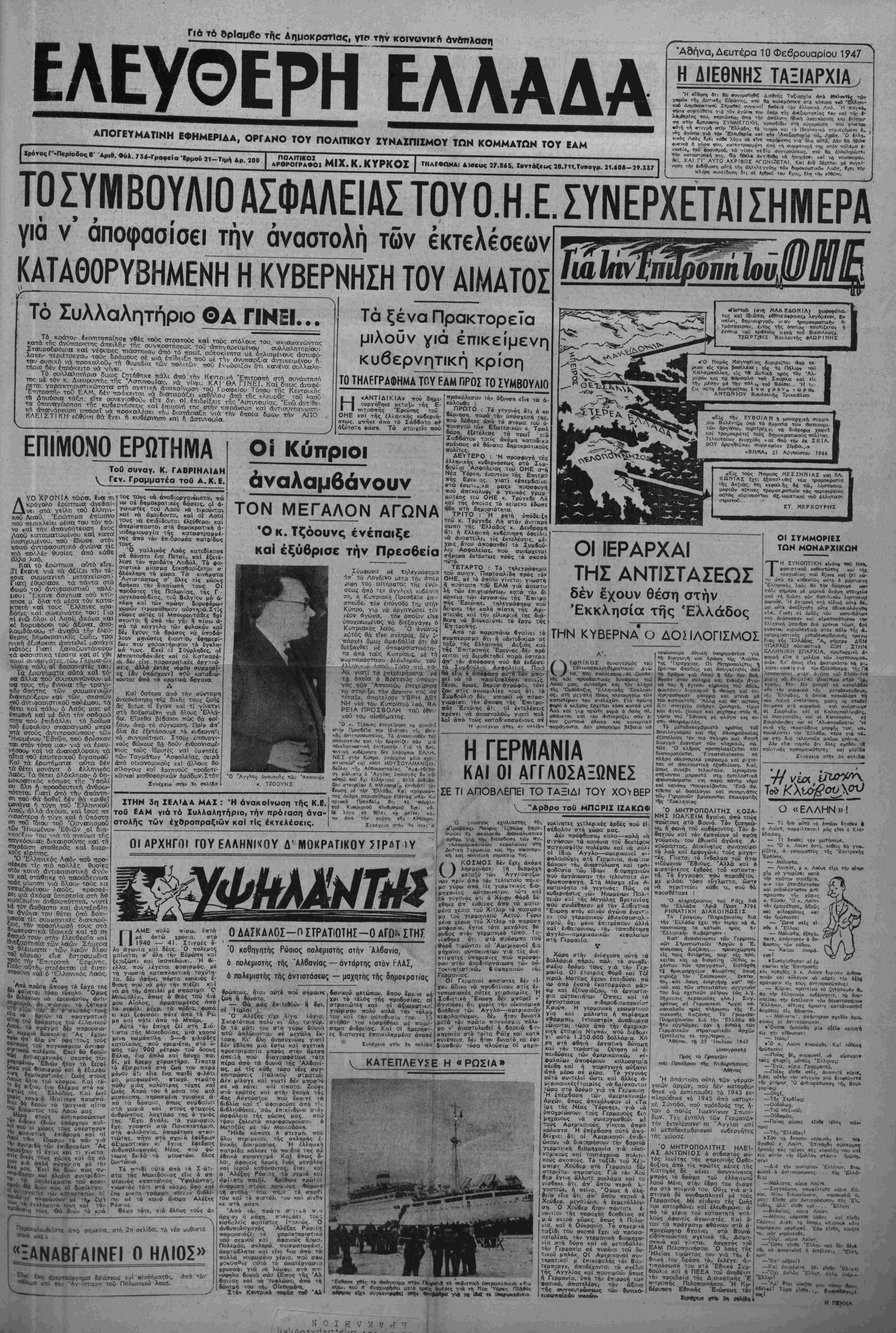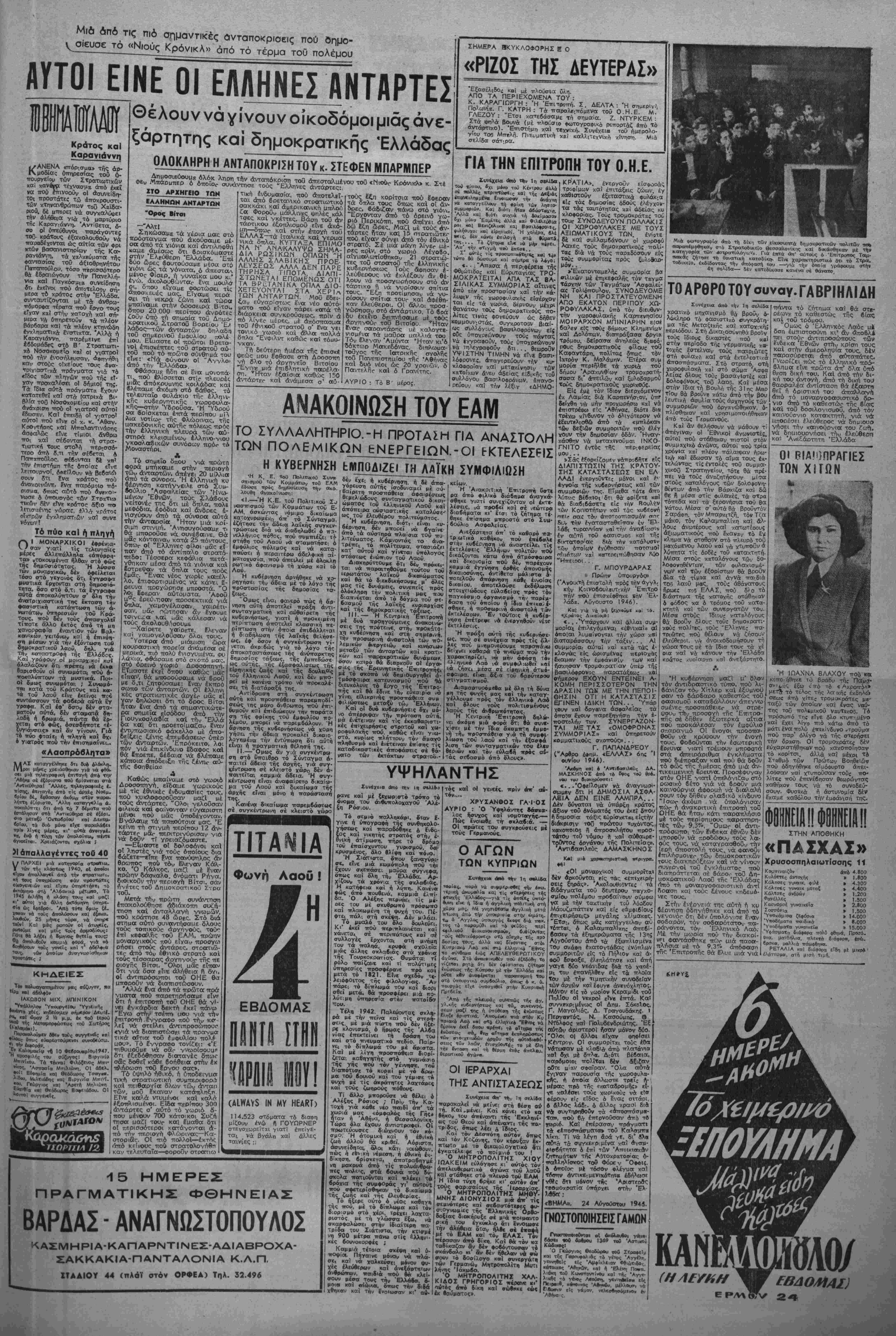 την κατο— ροφή της. θά <ίθίλ« αντίβεβα νά ήσνχάσ* ι κβΐ νά νοικοκυριυ. θεΐ. ΚΑΙ Π' ΑΥΤΟ ΑΚΡΙΒΩΣ ΛΓΩΝΙΖΕΤΑΙ. Καί ίνφ δέχεται μέ συγκι¬ νηθή τήν εκδηλώση αυτή τής αλληλεγγύης των δτιμοκρατικΛν Λαών, ϊχ-ι τήν ττλήρη συνείδηθτ) δτι οί έχβρο! τβυ ϊχου, ίλη την εώθύνη. ΤΟΣΥΜΒΟΥΛΙΟ ΑΣΦΑΛΕΙΑΣ ΤΟΥ Ο.Η.Ε. ΣΥΝΕΡΧΕΤΑΙΣΗΜΕΡΑ γιά ν άποφασίσει τήν άναστολή τόν έκτελέσεων ΚΑΤΑΘΟΡΥΒΗΜΕΝΗ Η ΚΥΒΕΡΝΗΣΗ ΤΟΥ ΑΙΜΑΤΟΣ Τό Συλλαλητήριο ΟΑΓΙΝΣΙ... 'δέν^έ ν-ές τοίκ: <~?ο~~: «Λ »ός στόλον τού. σκιαμαγώντας ^^ ΠΓ Λης σϋνκοοτήαρως τοΰ ά—γορευμένου συλλαλπτποίου: 1 νέΦυοες ιπάστηκαν άπά τό -οωτ. αύτοκίνπτα ι_έ όττλισιιένοικ: άστυΦύ- ν τουο δρόαους σέ »_ιά επιδείξη πού μέ την άνυπαρξία άντικειμένου τϊ- Κ^°υΤί1 μηδια τών πολιτών ^ εγνώριζον δτι κστνένα συλλσλη δένέπΡ^κ^?το^άΤνεί Τό συλλαλητήριο βαως 'ζτιτήθηκε πάλι άττό την Κβντο.κη Έτητροττπ στή συνάντησή της μέ τόν κ. Διευρυνττκ της Ασπονομίο.ς, νά νίνρ,ι. ΚΑΙ ΘΑ ΠΝΕΙ. ΚσΙ όπως άναφέ- ρετσι γαρακτηριστικωτστο: στϊ) σΥΕτικη ανακοινώση τού Γοαφείου Τύπου τής Κεντρικής _^πιτροιττΐΓ τού ΕΑΜ, δέν ποόκειται νά διαταράξει καθόλοο άπό τής πλευοας τοΰ λαοΰ ττί Δηιιόσια τάζη. είτε συνενισθοΰυ είτε δγ, οί έπιδρίξεις της 'Αστυνουίας 'Ευώ άντίθε- τα Οποτναγωρηση της ^κυδερντισεοο καί έπιαονη της στήν τ:σοάι/ομη κοτί άντισυντανματι- ^.^^ώοευση απορει Λ προκαλέσει ττ,,, διαταράξη νιά την όποία 6αωΓ την ΑΠΟ ΚΛΕΙΣΤΙΚΗ εύθυνη θά 6γει τ) κυβέρνηση καί ή άστυνοαία. ■ Τα ξένα ΠρακτορεΤα μιλοΰν γιά έπικείμενη κυβερνητική κρίση ΤΟ ΤΗΛΕΓΡΑΦΗΜΑ ΤΟΥ ΒΑΜ ΠΡΟΣ ΤΟ ΣΥΜβΟΥΛΙΟ Η«ΑΝΤΙΔΙΚΙΑ» -ου δημι- ουργήθηκε μετσξυ τής Ε- πιτρθπής Ερεύνης τοθ ΟΗΕ και τής έλλην κης κυβερνή¬ σεως, μπήκε άπό τό Σάββατο σί όξύτατη φάση. Τα στοιχεϊα ποΰ ΕΠΙΜΟΝΟ ΕΡΩΤΗΜΑ Τού συναγ. Κ. ΓΔΒΡΙΗΛΙΔΗ Γεν. Γραμματέα τοθ Α. Κ. Ε. Δ ΥΟ ΧΡΟΝΙΑ τώρα, Μνο: πι κρόγολο έοώτηιαα άνεβαι- ν*, στά γείλη τοθ έλληνι- κοθ Λαοΰ. Έρώτημα έπίμονο ττού ττερικλείει μέσα τού τόν πό- νο καΐ την άπονοήτευση ενός ΛαοΟ κατααατωμένου καί κατα Ληστευυένου, τιού ί-δωσε στόν Ή,οινό άντιφασιστικό άνωνα τίς —ό πολλέΓ θυσίες άπό καθε ,«, λαό. . , , Καΐ τό ένρώτη,μα αυτό είνε. ιΤΙ ϊκανε νιά νά άεί£.ει τίιν τέ: ιτοια συιαμαΥΐκίι μετανειριστι · Γιατΐ εθυσίασε τα Τϊάντα στο βωμό τού άντιφασιστικΰ (πολέ¬ μου: Έκανε άσνηαα που κτο- ,ιτησε μ" δλα τα μέσα τόν κατα- κτητη καΐ τούς Έλληνες τ,ρο- ]6οτες καϊ συνερνάτεο τού; Ι ιο τί έν» δλοι οί ΛαοΙ, άκόμα και οί δοουφόρθι τοΰ άζονα. άπο- Λ.αυ.δάνουν τ* ά.γαθά τήο· έλευ- βερης δημοκρατικής ζωής. τρα Γνικη έξαίρεση αποτελεί αονάγα (ήώτός: Γιατί ξοτνσζωντόΓνεψαν τα οασιστικά τέρστα καΐ οί γβε οιν^ϊ σ-Ί/ερ>άτε£; των Γεραοϋ·ων