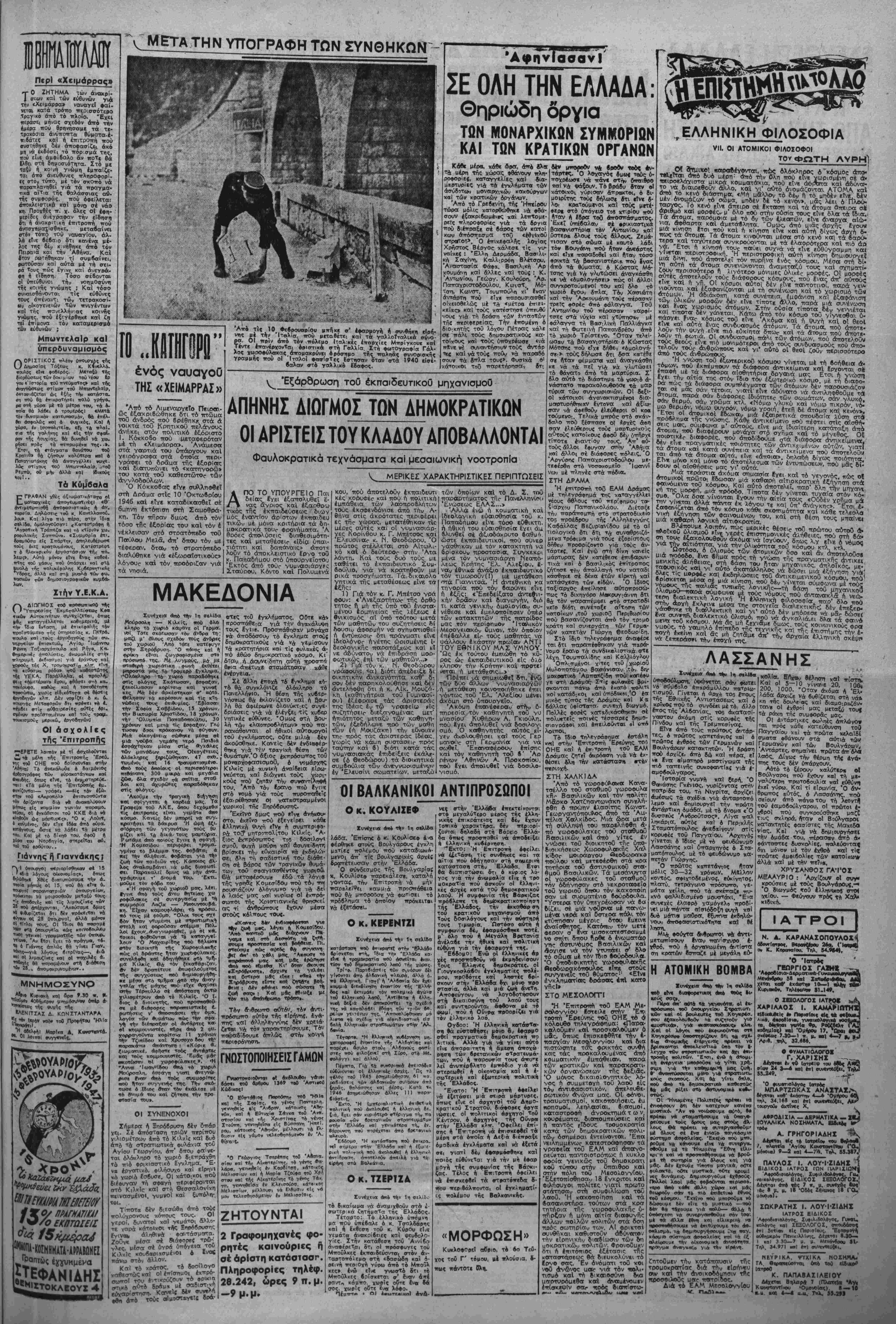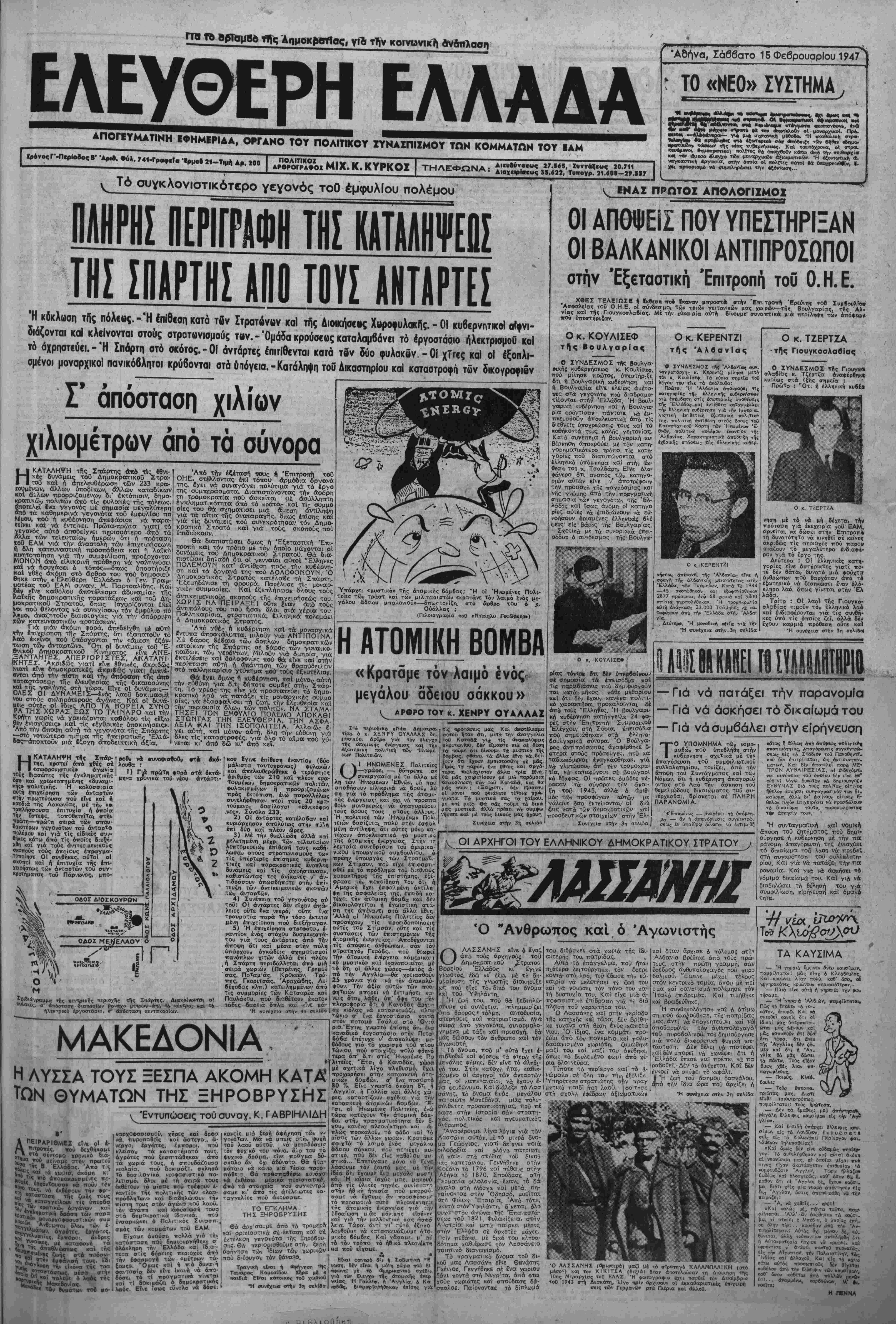 ι ^ τά« γ^λν ςια«ικΓτικ<ι*γ. γι «ςοντοττικη «- νβγκασηκη «ργοκτία, —ην όποία οί —λ{τες αύτοι *4 όκοχρΐωθνθ», ε. χεχ κροοριομο να συμ/κληράκπι τη» 4ς*ντω<—... ΠΛΗΡΗΣ ΠΕΡΙΓΡΑΦΗ ΤΗΣ ΚΑΤΑΛΗΨΕΡΣ ΤΗΣ ΣΠΑΡΤΗΣ ΑΠΟ ΤΟΥΣ ΑΝΤΑΡΤΕΣ Ή κδκλοση τϋς πόλββς.-ΊΗ έπ(θ€ση κατά τδν Στρατώνων καΙ τιΐς Διοκήθ€»ς Χ«τθθ·υλακΓΐς. - ΟΙ κυβερνητκοΙ σίφνι- διάζονται καΐ κλβίνονται οτοος στρατωνισμούς τ«ιν. - Όμάδα κρουσεος καταλαμβάν<ι τό ίργοστάσιο ήλβκτρισμου κοΐ τό άχρηστ€ύ€ΐ.-ΊΗ Ιπάρτη οτό σκότος.-ΟΙ άντάρτες ^πιΗθενταο κατά τβν δύο φυλακων - ΟΙ χΤί€ς καΙ οί έξοπλι- σμένοι μοναρχικο. πανικόβλητοι κρύβονται στά ύαόγεια.-ΚαΓάληψπ τοθ Δικσστηρίου καΙ καταστροφή των δικον/ραφιών Γ άπόσταση χιλίων χιλιόμετρον άπο τα σύνορα Η ΚΑΤΑΛΗΨΗ ττίς Σπάρτης άπό τΛς_έθνι- κές δυνάμεις τοθ Δημοκρατικοϋ Ζτρα- • ■ τού" καΐ ή απελευθέρωση των 233 κρσ· τουμ,ένων, άλλον ύποδίκων, άλλων καταδΐκων καΐ άχλων -ροορι£ομένων δι' έκτόπισιν, δημο- κροπικών ιτολιτών άπό τίς Φυλσκές της πόλεως, αποτελεί ίνα γεγονός με σημασία μεγσλύτερη άπό τα καθημερινά γενονότσ: τοό έμφυλίου πό λέμου, πού ή κυβέρνηση απεφάσισε νά τταρα- ϊείνει καΙ νά έντείνει. Πρώτα-τ.ρώτα γιατΐ τό " όνος αύτό άποδεΐγνει ττρρισσότερο άπό τα α των τελευταίων ημερών δτι ή πρόταση ΧθΟ ΕΑΜ γιά την άναστολή των έττΐγειρήσεων·. Λ 8λη κατευναστική προσπαθεία και ή λαΐκή Κινητοποιήση γιά την συμφιλίωση, προέρνονται ΜΟΝΟΝ άπό εΐλικρινη -ρόθεση νά ναληνεύσε» καΙ νά /ισυγάσει ό τόπος—δπως υποστηρίζη ΚαΙ γθές άκόμη στό αρθρο τού ιτθύ δημοσιευ- βηκβ στην «'Ελεϋθερη Έλλάδο» ό Γεν. Γρσμ- ■ιατέας τοθ ΕΑΜ συναγ. Μ. Παρτσαλίδης. Καί ιέν είνε καθόλου άποτέλεσιΐα αδυναμίαν τής λοΛκής δημοκρατικής παρατάξεωο κθί τοθ Δη- Ιαοκρατικοΰ Στρατοϋ, δπως ισγυρίζονται έκεϊ *νοι -ού θέλοντσς νά συνεγίσουν τόν έμφθλιο πό λκμο, άναζητοϋν διαιολονΐες γιά την άπάρριψη ϋων κατευναστιώ προτάσεων υοπ ίέν κατευναστικών προτάσεων. Γιά μίαν άκόμη ψορά, άπεδείγθη μέ οβύττ» έπιγείρτΐοτι τήρ Σπάρτης, δτι έξαπατοϋν τό ΙΧαό έκεΐνοι πού ύπόσγονται την «αμεση έξ6ν- τωση των ανταρτών>. Οτι οί δυνάμει τοθ Έ·