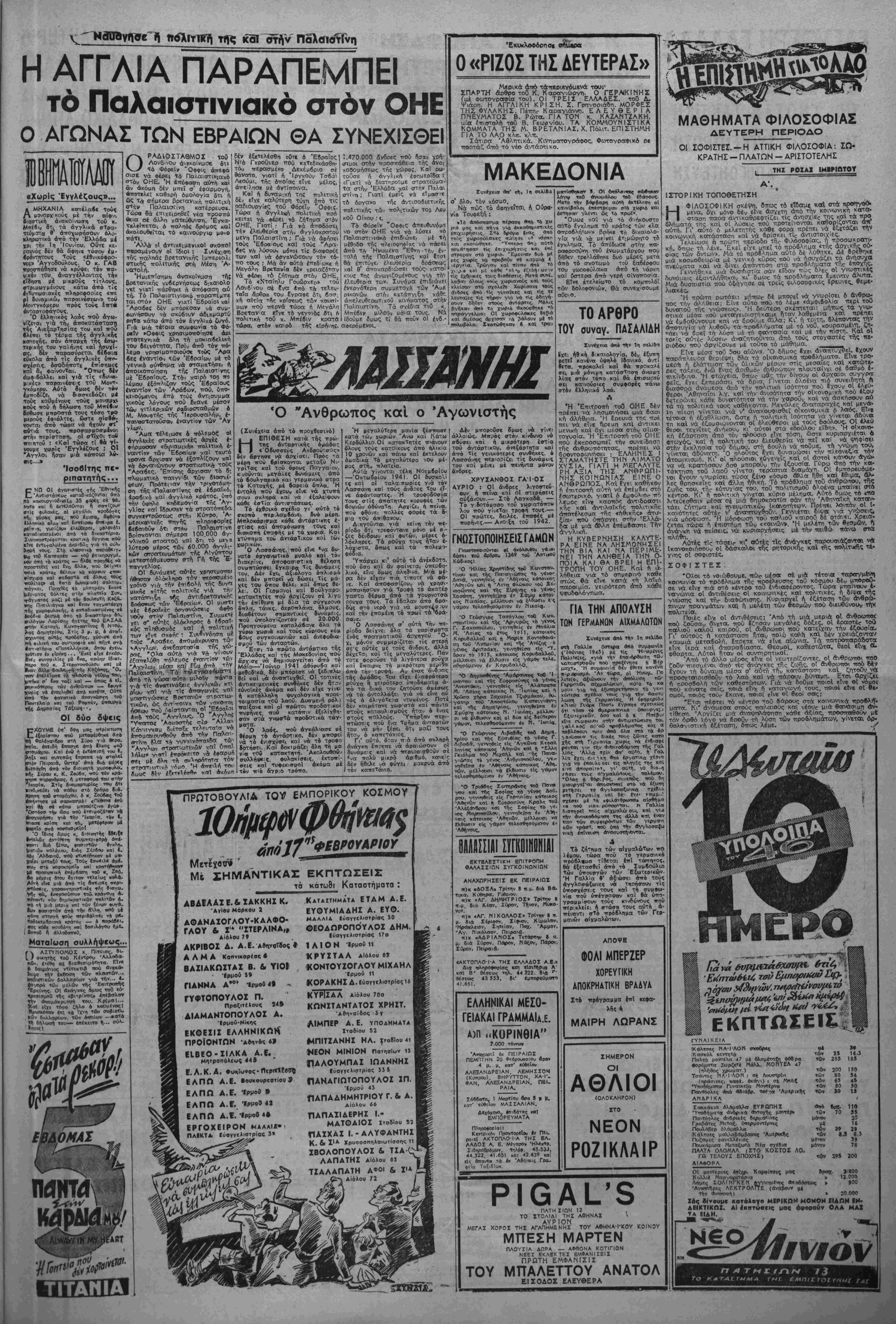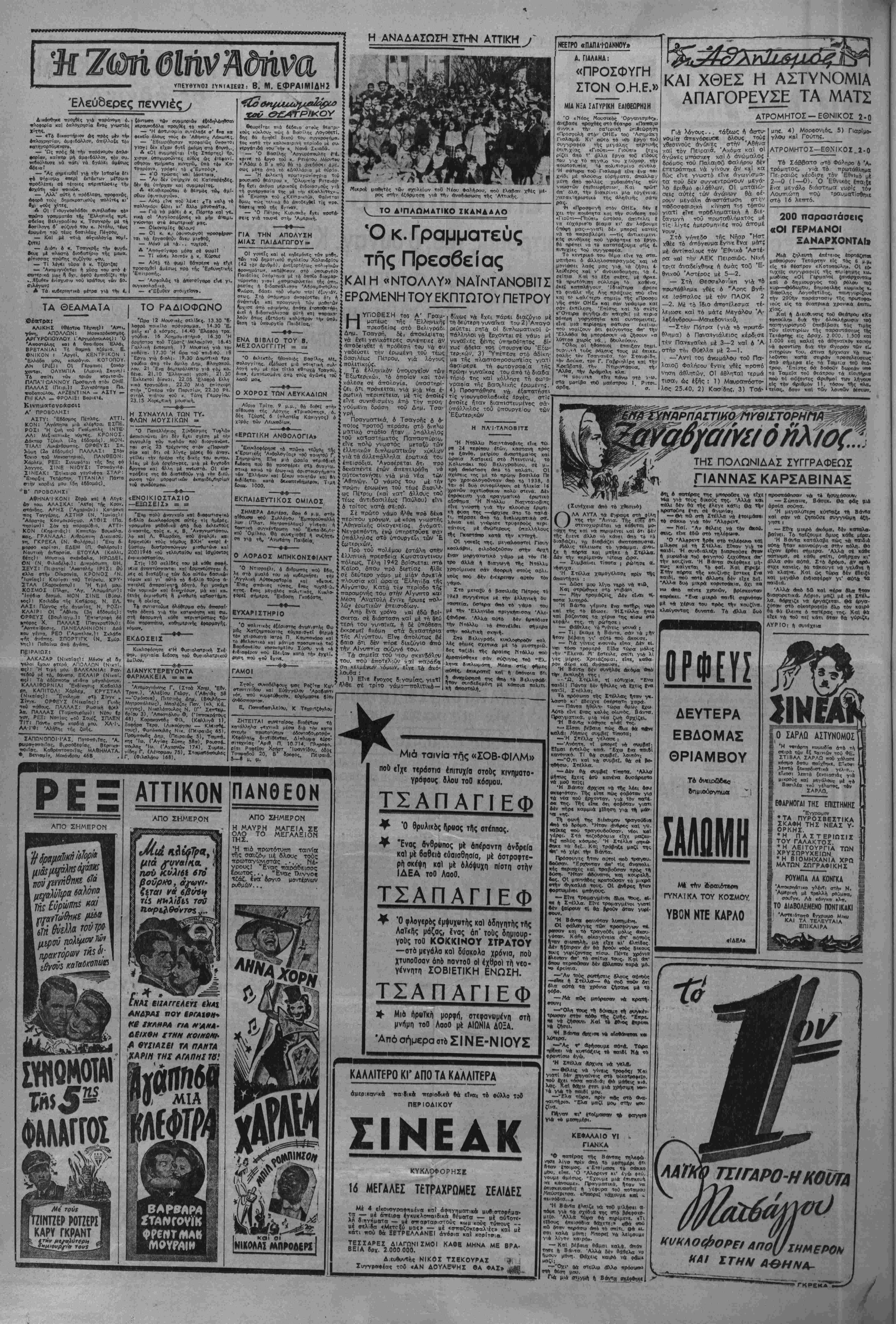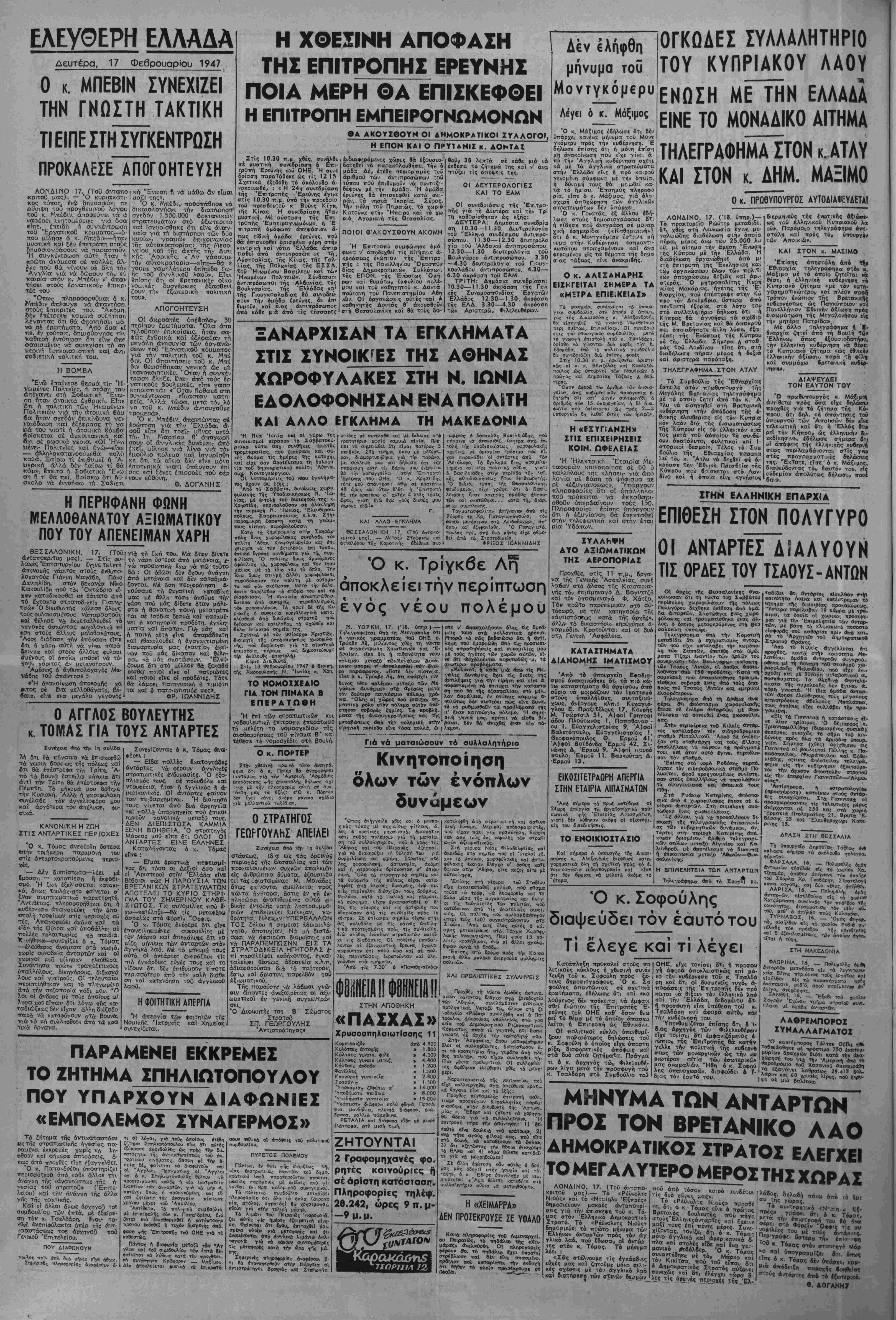 Τσαλδάρη κσΐ αφθρά αυτόν κβ< τήν κυβέρνηση τού. Ύπενβυμίζεται ίπίσης δτι Α 1· δ θς άρχηγός τών Φιλελεύθερον εΤχε τονισε^οτι έμφσνιζόμευθς ε¬ νώπιον τής 'ΕπιΤροπης θο: κάτην γελλκ τη» πθλιτ·κή τής κυβερνη σεως τών μοναρχΐκών ώς την κυ ριωτεραν αΐτία των» εσωτερικώ» μας άνωμαλιών. Ήδη ό κ. ΣοΦού λης ϋπαναχωρών, διαψεύδει ό ί- διος τόν έαυΤό τού. ταδΐδει *Π άντάρτες «ισηΧΑαν κοινότητα Λαΐνα καΐ κατεστρΐψαν Τί οίκημα τής διμοιρίσς τφοκαλύφΐως. "Υστερα τταρέλΛβαΐ' 19 κάρρα μέ τρο. «ιμα, τα όποϊα οί χωρικοΐ ηροσίψι- ραν γιά τή« Έπιμελητεία των αντ—· των, μέ βαση τό κλΐμακωτό ποσοστο εΐσφορας πού κα&όρισε πρίν άπο και. ρύ τή Άρχηγεϊο τοθ Δημοκρατιειοβ ΣτροποΟ θράκης. •Λπό τ6 Κιλκίς αγγέλλεται βη ηροχθές, κοντα οτήν κοιν6τητα η*· λανθίοι;, όμάδα Λιταρτών ο^γκροΛ. οβηκε μί τη βύνσωη τβθ στα&μοΰ X»- ροφυλακής Μιλσνθίου, ηοί) ειχε ενι· οχυθίϊ καΐ μέ Βύναμη μεταρατ«ο0 α. ηοσηασματος. Τα αΛηθινα αποτελί- σιιατα της συμτιλοκής δέν Ιγιναν «- κάμη γνωστά. Ή Ιβια ομάδα ανταρ· των αφησ» ίλεύβερους τούς μεγα-νοϋς κτηνστρόφους αβελφοϋς ΜπαλάσΝα, τους οποΐους «Ιχι συλλάρει Τήν «ρβ· γουμένη. «Είς τα Γιαννιτσ* ή κατάστασις Λ· ν* λίαν κρίσιμος. "Ο βήμαρχος κ. Τριανταφυλλίοης (διορισμιιος φυσικα) ΐίίπέμτιει συνεχώς τό σημα τοθ κιν- βύνους πρός ολα τα αρμοοι·»- ί—«ρ. γεία. Σήμερα (χθές) αψίχθησαν εις Γιοτννιτσά οί ΒοιΑευταΙ Πέλλης κ. Πα- πα&όπουλος, Λτϊκ,ράτογλου «αί Εύβυ- μιάίης, οΐτινες αττέστειλαν τηλεγρίΚ. Φημα είς την κυβέρνησιν ί^αιτούμε- νοι την «μέσον αττοστόλην οτρατοθ *ίς την ίπαρχίαν Γιαννιτσων—'Αλμ». πίας». Άντίστροφα, ί| «στροττολογίβ» (προσχώρηοτι) κάτοικον στούς ανταρ- τες συνεχίζεται. Στβ Γιαννιτσα οί προσχωρήοαντες τίς Τϊλει/τσϊες μΐρες ανέρχονται σέ 250 καΐ στα χωρία 'Ερμακιά Πτολεμαΐδος 21, Βρυτά Έ· 6ί~ής 25 καΐ 'ΕλευθεροχόγΗ Κοτ»ι- Ρίνης 15. ^ ΔΡΛΣΗ ΣΤΗ βΕΣΙΑΛΙΑ Τβ ύπουργεΐο Δημοσίας Τάξΐως Μ κβίνωσε σήμερα τα άκόλουβα τΐλεγρα- φήματα: ΦΑΡΣΑΛΑ, 16. — ΠοΧιιμίλής 4μ4< αντορτών ϊησήλθε είς τό χωρίον Χά. τζηαμάρ, οπόθεν άττηγβγε τό» ίπα5όν τοϋ Σούρλα Χρ. Γκοδαρην. Στρατολογή οοβα κστ6π|ν κα) 6ύο νίθυς, άττήλ9.'ν. ΛΑΡΙΣΛ, 16. _ Πολυμϊλής 4μ4ϊ άντορτ-ών, εΐσελβοθσα είς τό χωρίον Χστζάμποτση συνέλαβϊ τ<>ν ττρόείρο τής