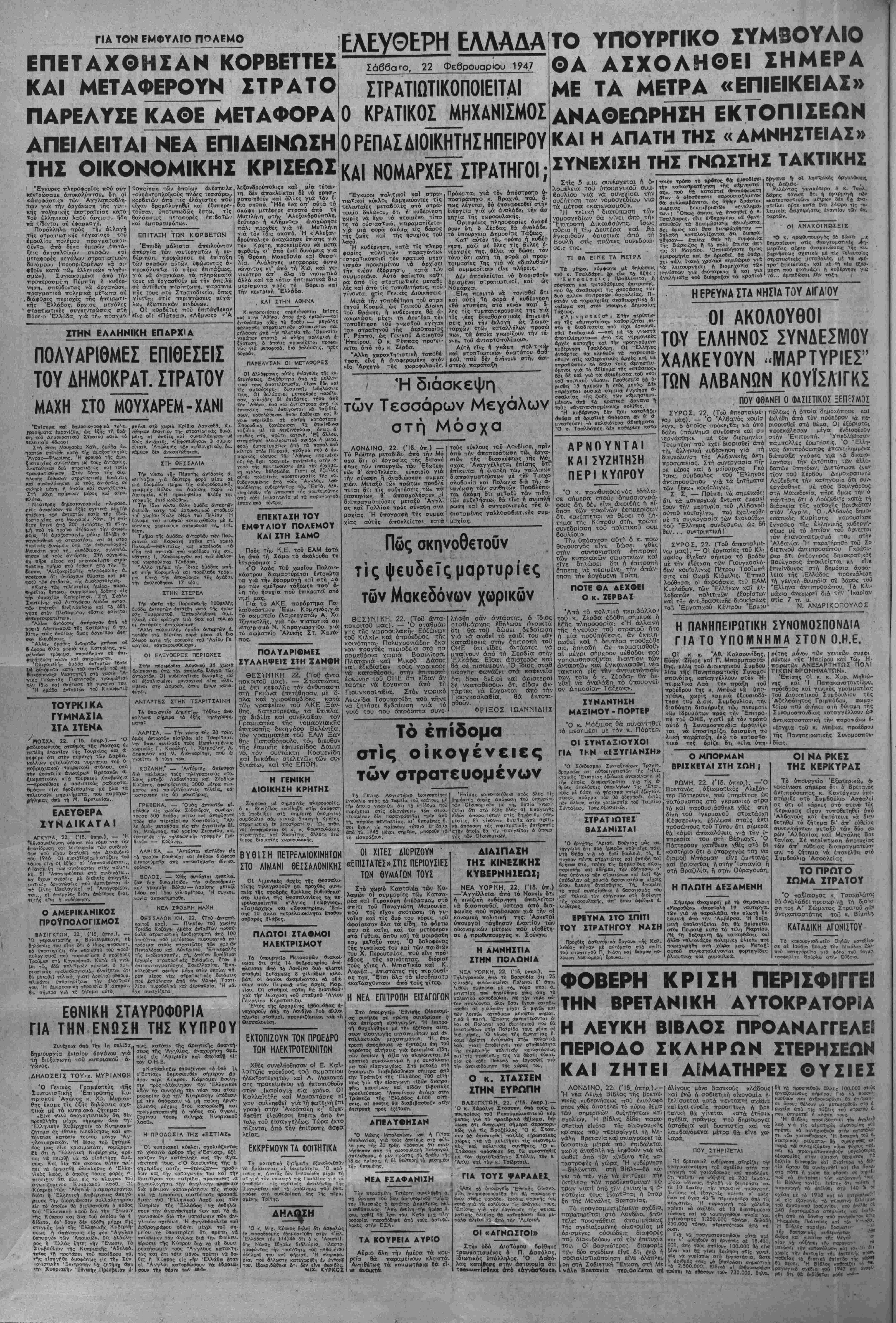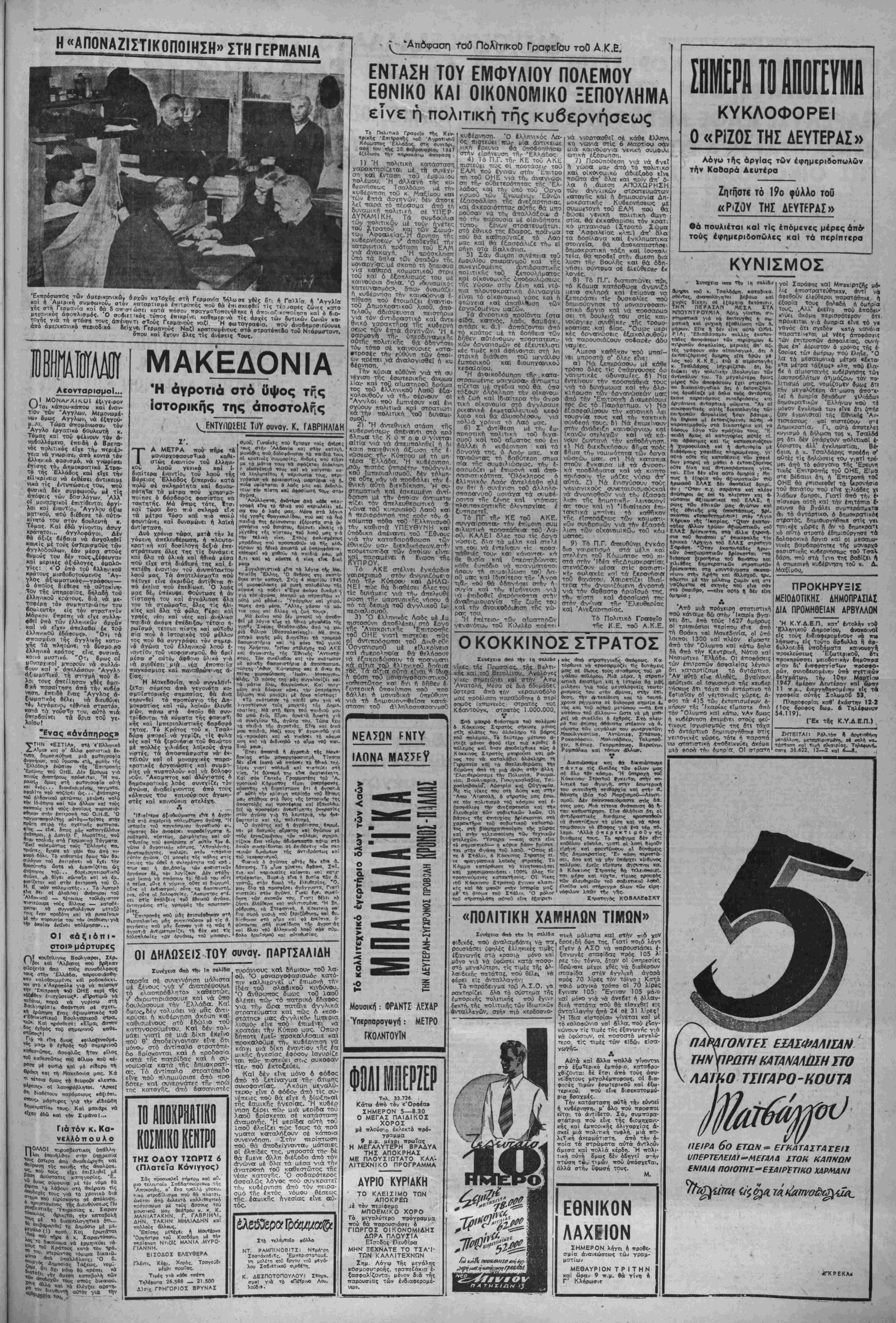 τερ Πάττερσ&ν. ττοΰ ύπηρέτη<τε ώζ κατάσκοττος στό γερμανικό στρα τό καΐ παρθιχχιάσθηκε χθές στή δίχη τού γερμανοΰ στρατάρχη Κέσσερλΐγκ, εδήλωσε στούς 4ντι πρθσώπους τοΰ Τύπου δτι σήμερα θά κάμει άποκοΛύΨεις γιά την ύ· πηρεσία τού στή Βέρμοτχτ. Ό Πάττερσον κατί*θεσκ χθές στό δι καστήριο δτι ό ΰπαρχηγός τθ3 να ίισμοϋ Μπόρμαν εΤνε ζωντοτνος καϊ βρίσκεται ή στήν Ισπανία ή στή Βραζιλία, ί στή-ί Ούραγουάη. Η ΠΛΩΤΗ ΔΕΞΔΜΕΝΗ Σήμερα αναχωρεί μέ τό ατμοπλο.ο «Μαραθών» αποστόλη 19 ναυτεργα. των γιά να παραλάβει τήν ττλωτή δ»- ξαμβνή άπ6 την 'Αμβερσα. Ή δίξα. μένη ΟπολογίςεΤαι δτι βά βρίσκετσ. στόν Πειραια κατά τα τέλη Μαρτίου Μί τή δεξαμενή θά καταφθΛσει κλΙ αλλο «πλεονάζον πολεμικό ύλικό» πού παρεχι^ρήΒη σΛ χώρα μας. Μεταζ"; αΰτοθ συγκαΓταλένονται φορτηγΐδες ά καΐ ρυμουλκά. ΟΙ ΗΛ ΡΚΕΣ ΤΗΣ ΚΕΡΚΥΡΑΣ Τό ύπουργεΐο 'Εξωτερ.κών <► νεκοίνωσε σήμερα ότι ό Βρετανός άντιπρόσωπος κ. Καντόγκαν ΰπε- στήριξε στό Συμβούλιο Άσφα»εί σς ό'τι οί νάρκες στό στενό τής Κερκύρας εΤχαν τοποθετηθεΐ άιτό Αλβανοΰς καΐ έπρότεΐνε νά δι.'ϋ θετηθεΐ τό ζήτημα δι" άπ' εύθείσς συνεννοήσεως μεταξϋ τών 66ο <» ρων_ Αλβανίας καΐ Μεγάλης Βοε Τανίος. _Σέ περίπτωση άποτυχίας των άπ' εύβείας διαπραγματεύ'Τ'· ών, τό ζήτημα νά έπανέλθει στό Συμβούλιο Άσφολείας. ΤΟΠΡΩΤΟ ΣΩΜΑ ΣΤΡΑΤΟΥ Ό ταξίαρχος κ. θά άναλάβει ττροσωρινά τή ση τοο Α' Σώματος ΣτρατοΟ άά τοϋ κ. ί ΚΑΤΑΔΙΚΗ ΑΓΩΝΙΣΤΟΥ Τό κ~ουργιοδικεϊο θηβι&ν κατεδίκβ- σεοί Ισόβια δεσμά τόν Νικίλαο Ζ»λη ποϋ κστηγορΐΐτο γιά φδνο ΤοΟ τσγιΐ% τσοφαλΐτη Θούρλα σΤίιν Εύβοια. ΦΟΒΕΡΗ ΚΡΙΣΗ ΠΕΡΙΣΦΙΓΓΕΙ ΤΗΝ ΒΡΕΤΑΝΙΚΗ ΑΥΤΟΚΡΑΤΟΡΙΑ Η ΛΕΥΚΗ ΒΙΒΛΟΣ ΠΡΟΑΝΑΓΓΕΛΕΙ ΠΕΡΙΟΑΟ ΣΚΛΗΡΟΝ ΣΤΕΡΗΣΕΩΝ ΚΑΙ ΖΗΤΕΙ ΑΪΜΑΤΗΡΕΣ ΘΥΣΙΕΣ ΛΟΝΔΙΝΟ, 22. (Ίδ. ύττηρ.).— Ή νέα Λει/χνι Βίδλος τής βρετα- νικής κυβερνήσεως ττού έ/υν.λθφό ρησε χθές αποτελεί τό κύρΐο θέμα των ( σημε^ρινών συζητησεων καί σχολίων. Η βίβλος δίδει παρα- στατΐκη ίΐκόνα της ο'.κθνθμικής κρίσεωί πού π-ερισφίγγει τή Με· γσλη Βρίτανία καΐ σχιαγραφεΐ τα δρσστΐκά μέτρά; πού έπιβάλεται χωρ'ις άναβολή νά ληφθούν γιά νά σωθεΐ άπό τόν κίνδι/νο "της κθτ- ταστρθφη; ή χώρα. Ή κυδέρνηση —δηλώνεται στή Βίβλο—^Θά «β- νει τό πάν Υιά νά έπΐτύχει την εκτελέση των προβλεπομένων μέ- τρων γΐοττΐ άπό την έτπτυχία ·?( ά- ποτυχΐα τους έξαρτΠται ή ϋττθΐρ ξη της Μεγάλης Βρετανίας. Τό προγραμματιζόμενο σχέδιο, παρατηρεΐταΐ στό Λονδϊνο, άπθ- τελεΓ προσπαθεία άπομΐμήσεως £ σχεδιαζομένης οΐχθνθμίας μέ όρ-σμένε; ούσιώδεις δι«φθρές πού διακυβεύουν χά! την έπιτυχία τού. Ο! βασικότερες διαφθρέ; των δύο σχεδίων είνε δττ ίνώ η σοσιαλιστικοποίηση εΤνε όλόπλευ Ρη στπ Σοβιιτική "Ενωο—, στή Με νάλη Βοπτβνία ' πιθιθρίϋτατ, σί ολίγους μδνο βοσικούς κλάδθυς καί έν« ή σοβιετική οΐκονθμίχ έ- ξελίσσεται κατά πενταετή σχέδιοι καί έχει εθρεϊχ προοπτΐχί, Λ Βρε τανική θά _γίνεται κατά έτήσια σχέδιβ, πράγμα πού δημτουργεΐ άστάθεισ: καΐ δυσπιστία κσί τα λαμβανόμενα μίτρα θά εΤνε χα· λάρα. ΠΟΥ. ΣΤΗΡ1ΖΕΤΑΙ ?Η βρετανική κυβέρνη— σΤηρΙζει τΑν τ ραγματοποΐηση τοθ σχεδίου —ήν πά- Γ«γωγή τοϋ γαιάνθρακος καΐ ιτροδλέπε Μι ττρέπε, νά ούξηθεϊ σ| 200 εκατΐμ. •-;010■ τόννρυς δηλοδή νά ξίπεράσε Ι·;"010■ τόννρυς, δηλοδή νά ξίπεράσε, κα. τα 10 ίκατομ. την πίρυσινή παραγωγή τπισηί; οί έςαγωγές πρέπε, ν" αύξη- Οουν σέ 6γκο 40 % τκρισσότε,» άπό τί- τΓΡυσινές Η παραγωγή τοθ χάλυΓ,ος πρτιτει νά άνέλθε! οέ 13 ίκατομμύι,α τόννους καΐ νά νανπηγηθοΰν πλοϊα χω "ΪΛ'",1!1!1105, '·2-0.000 τόννων, δηλαδίι 50.000 τόννο, περΐσσ6τερ0, ^ π£ Γιά_ νά τ