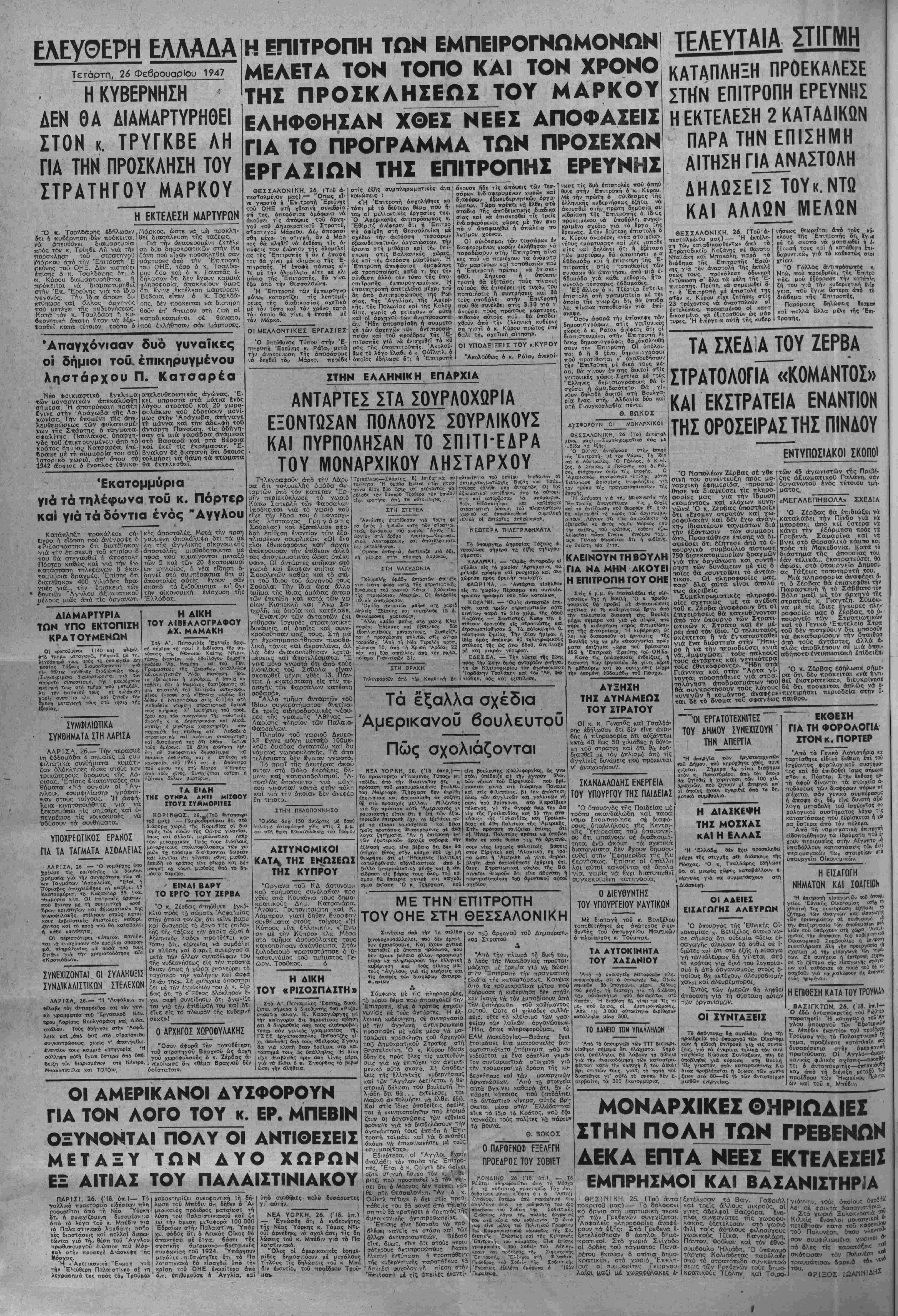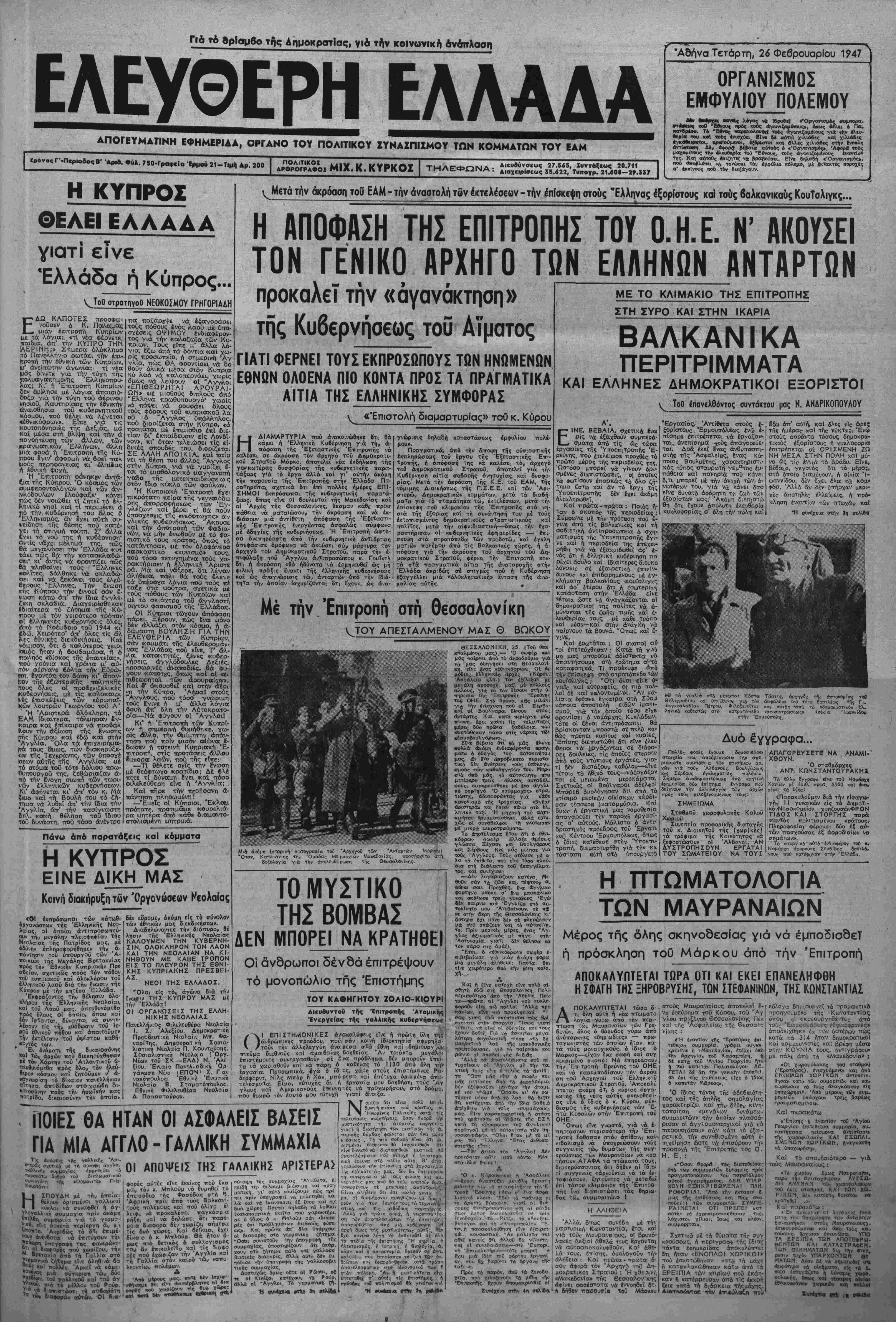 <ρόνο<Γ·.ηερ,ο5οςΒ' Αρι·. ΦύΑ. 750-Γραφείο 'Ερμοδ 21—Τ,μή ΔΡ: 200 ΜΙΧ Κ Άοήνα Τετάρτη, 26 ΦεβρουαρΙου 1Ο47 ΟΡΓΑΝΙΣΜΟΣ ΕΜΦΥΛΙΟΥ ΠΟΛΕΜΟΥ *■>■)» ε—«εί, λογο< νβ 1»ρυ·ε( «"Οργήν»-ιΑς βυμ—«χχ. η —Ο 'ΒΒνου* «ΐρ*ς τοός άν»ν·ζομ«νους>, δια*; Μλιι * Πά.