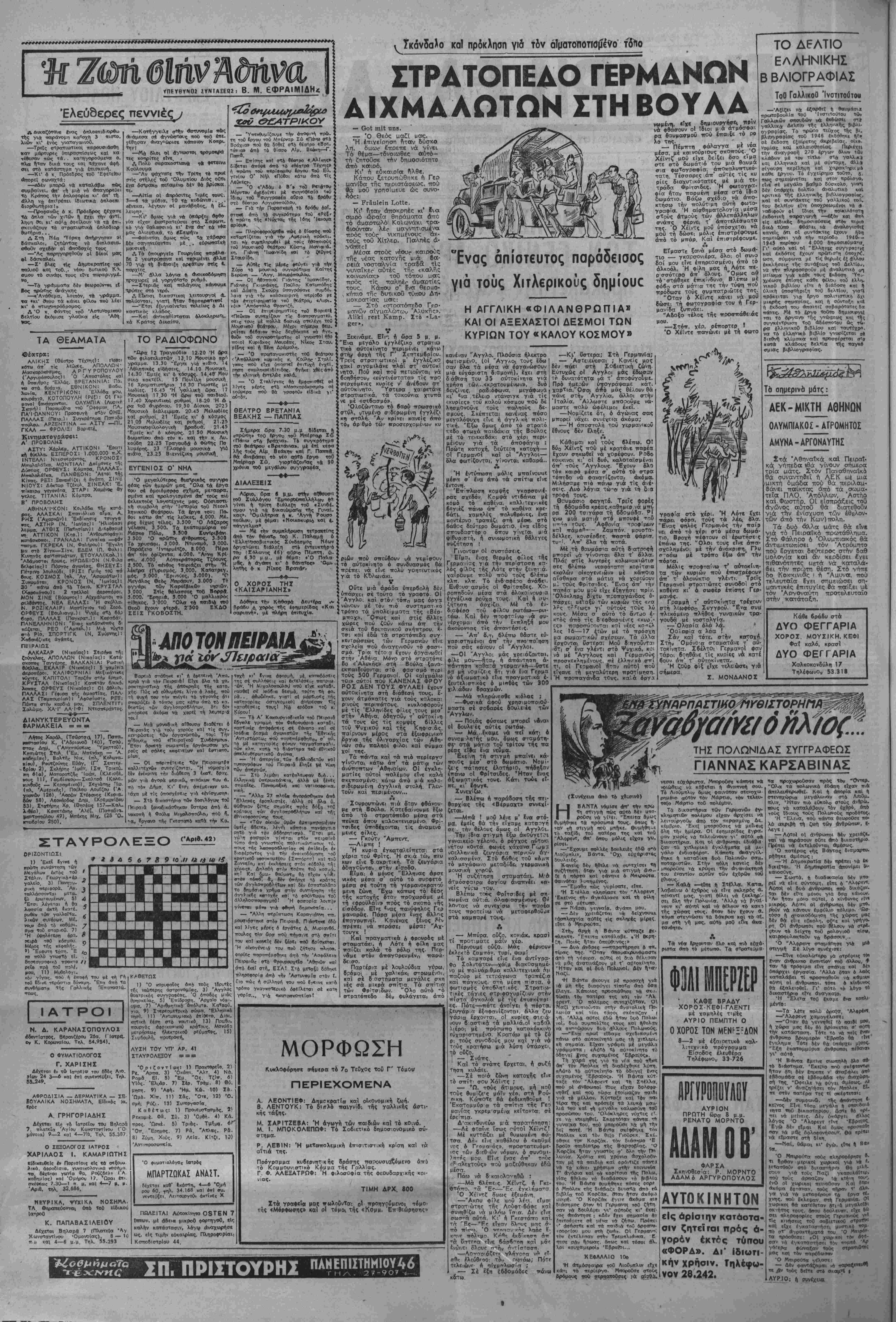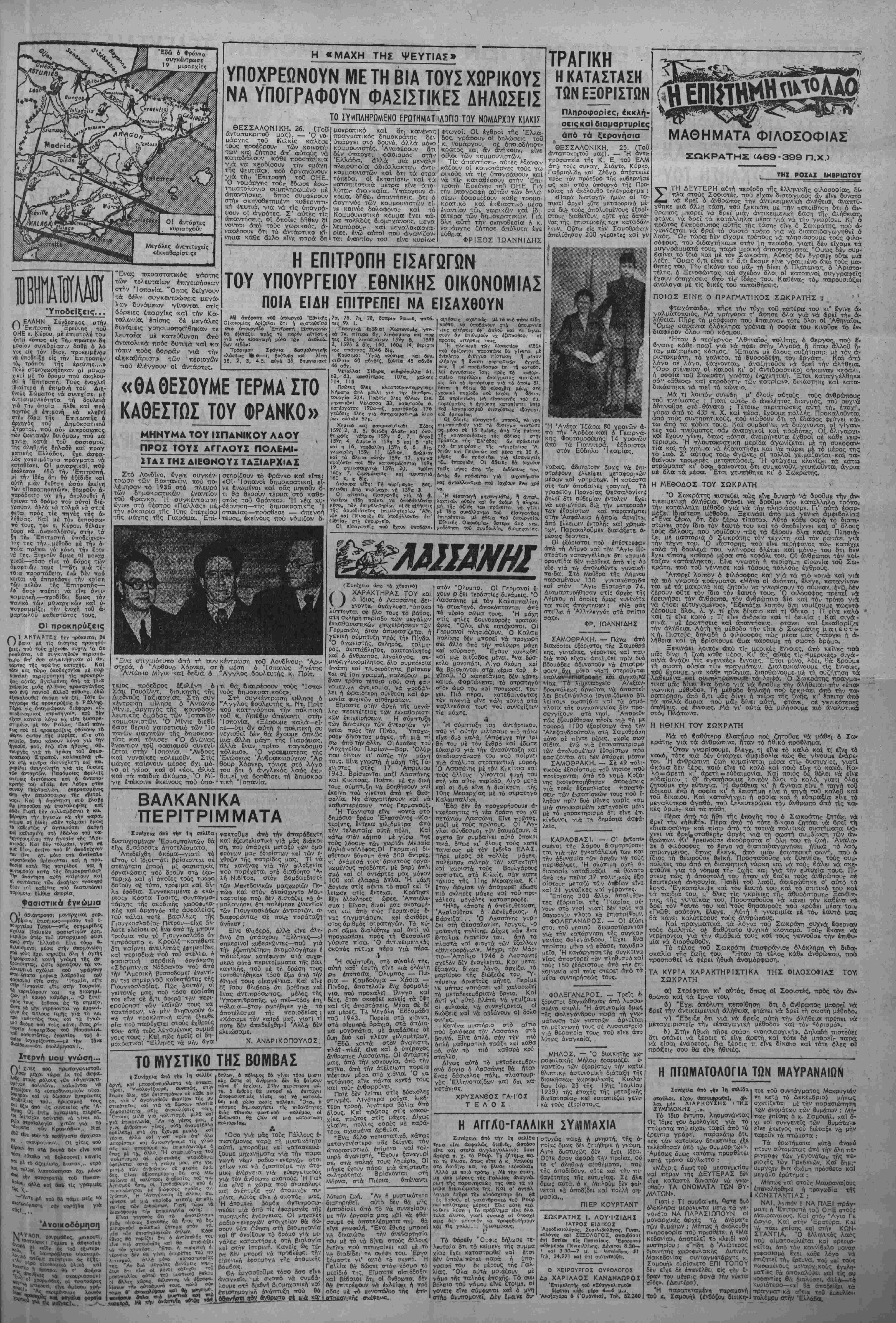 ΰπθυργεϊο Οίκον<"μικών. Η ΕΙΣΑΓΟΓΗ ΝΗΜΑΤΩΝ ΚΑΙ ΣΦΑΓΕΙΟΝ τ!ι Ή ίπιτροπή εΐσαγωγδν τοθ Λβου». γείου "Εθνικής θΐκονομίσς ««τ* ^ χθεσινή Της συνεδριαση ίξήτσσι ζήτη,μα τών άναγκών καί εΙσσγΥ^ τών έριονημάτων σέ συνοι-ασμό (■· την ίπεξεργασΐα των άποθεματων λιών πού ύπάρχθυν οτή χωρ°. 'Λν νοντας την απόφαση τοθ κοβερ ΟΙκονομικοΟ Συμβουλίου ή έπιτ{κ«1 ουνε,πληροσε δλη την προεργασΐα τ-ί| ηή έ ή ΐ τω 'ΊΙ1*" δλη την προργ χεηκή μέ τήν εΐσαγωγη των ' των. Σέ σννεχεια ή έπιτροπίι ί(ή**· σε τό ζήτημα τής εΐσαγωγής οψβΥ11" ών καΐ καθόρισε τα ποσά πθύ θά «' σαχθοθν για νά ,καλύψουν τί"; «νάγ«<ί ενός τρΐ/μήνου. ΟΙ ΙΥΝΤΑΞΕΙΣ Τ4 συνίλβει κων ξεις, θ γμα ό: λβει (π6 η ηροεδρεία τοΰ ύπουργοθ των ΟΙκονομι κων ή εΐδική έπιτροπίι νΐα τίς συντα ξς γιά ν* έγκρΐνει τελικα τόν συν- ταχθέντα Κώδικα Γυντι4ξεων, πθο Θ6 ύποβληθεϊ για κύρωση στη Βουλή "Ιΐς γνωστόν, στόν καταρτιοθέντα Κ ώ δικα προβλέπεται ή Οψωση των συνΤΛ ξεων στο: 80—86 % των αντιστοΐχων μισθων ίνίργεΐοις. Η ΕΠΙΘΕΣΗ ΚΑΤΑ ΤΟΥ ΤΡΟΥΜΑΝ . ΒΑΣΙΓΚΤΩΝ, 26. (Ίδ. ίητ )— Ο έδώ άνταποκριτής τού Ρώ«· ερ παροτηρεί: 'Η κατηγορία τθΟ'ΑΥ γλου ύπουργοΰ των Εξωτερικώ* κ. Μπίβιν εναντίον τού προίδρο" Τροΰμον γάι τό Παλαιστινισκό "Α τημα, προξένησε κατάπληξη "σ' δυσαρέσκεια στήν άμΐρικο*"" πρωτεύθυσα. Οί Άγγλο—όμ£Ρ'· κανικές φ,λικές σχέσεις—ιτροσβέ· τει ό άνταπθκριτης—έπεσκ:άσ9^ καν άπό τή διένεξη μετσξΰ Τοί προέδρου των Ήνωμένων ΠολιΤίΐ ών καί τού κ. Μπέβιν. ΜΟΝΑΡΧΙΚΕΣ ΟΗΡΙΩΔΙΕΣ ΣΤΗΝ ΠΟΛΗ ΤΩΝ ΓΡΕΒΕΝΩΗ ΔΕΚΑ ΕΠΤΑ ΝΕΕΣ ΕΚΤΕΛΕΣΕΙΣ ΕΜΠΡΗΣΜΟΙ ΚΑΙ ΒΑΣΔΝΙΣΤΗΡ1Α ΘΕΣ)Μ1ΚΗ, 26. (Τοθ άντα ποκριτοϋ μας).— Τό δολοφονι κό δρνιο στή μαρτυρική περιο νή τών Γρεδενών συνεγίζεται. Άσφαλεΐς π,ληροφορίες άναφέ- ρουν τα εξής: Στά Γρεδενά έ- ζετελέσθησαν 8 άοπλοι δημο- κρατικοί. Στό γωριό Σνίγοβο οί όρδές τοΰ τάγματος Πανα- ρέτου ϊκαψαν 8 σπίτια δτΐ'μο- κρατικών. στό γωριό "Εκκλη- σιά οί συμιαορίτες Γεωρνου- λαίοι μαζί αέ νωρρ.φ^λα,κ,ες έ- ζετέλεσαν τό Βαγ. Γαβριήλ και τρείς ολλους μικρούς οί γιτες άδελφοΐ Βαζούοα. Ενο- ποι_ ουνεργάτες τής γωοοφυ- λσκης, εξετέλεσαν στό γωριό ΦιλΙ τους άόττλους φΐλησΰνους ]10ιΚθύ<:Τ^κσ Κλά ΑΤ^κσ· Κανκελάρη, Φούλαν καΐ τόν έθνο- σύμβουλο Ήλιάδη. Ό ύπενωυο τΑργης Κολιάβετας παρέλαβε από τό_στρατ6ττρδο συνκεντρώ σε.'ος των Γοεεενών τούς δηιμο- κρατΐ'νθυς Τίΐόλην κ,ςχΐ Τσιοο· γιάννην, τούς όποίους ύποβάλ λε· σέ φθικτά βασανισττίρισ·. Στό γωριό Ξυλοκρρστιά ιΐ« Κιλκίς ίνοπλοι μοναογικοΐ ε' πετέβησαν κατά τοΰ καφενειον τοθ Πολυνέοη. δττου νλεντοι>