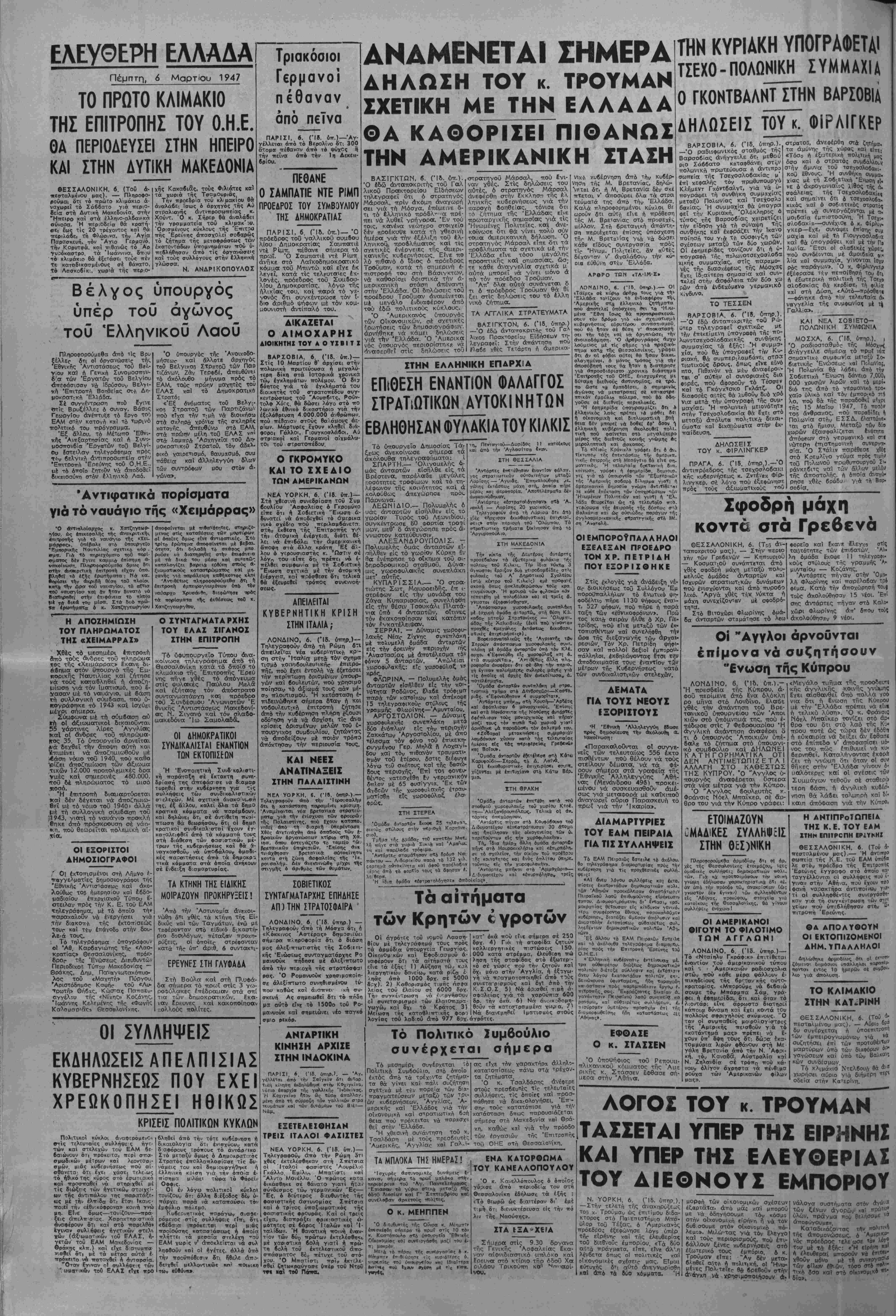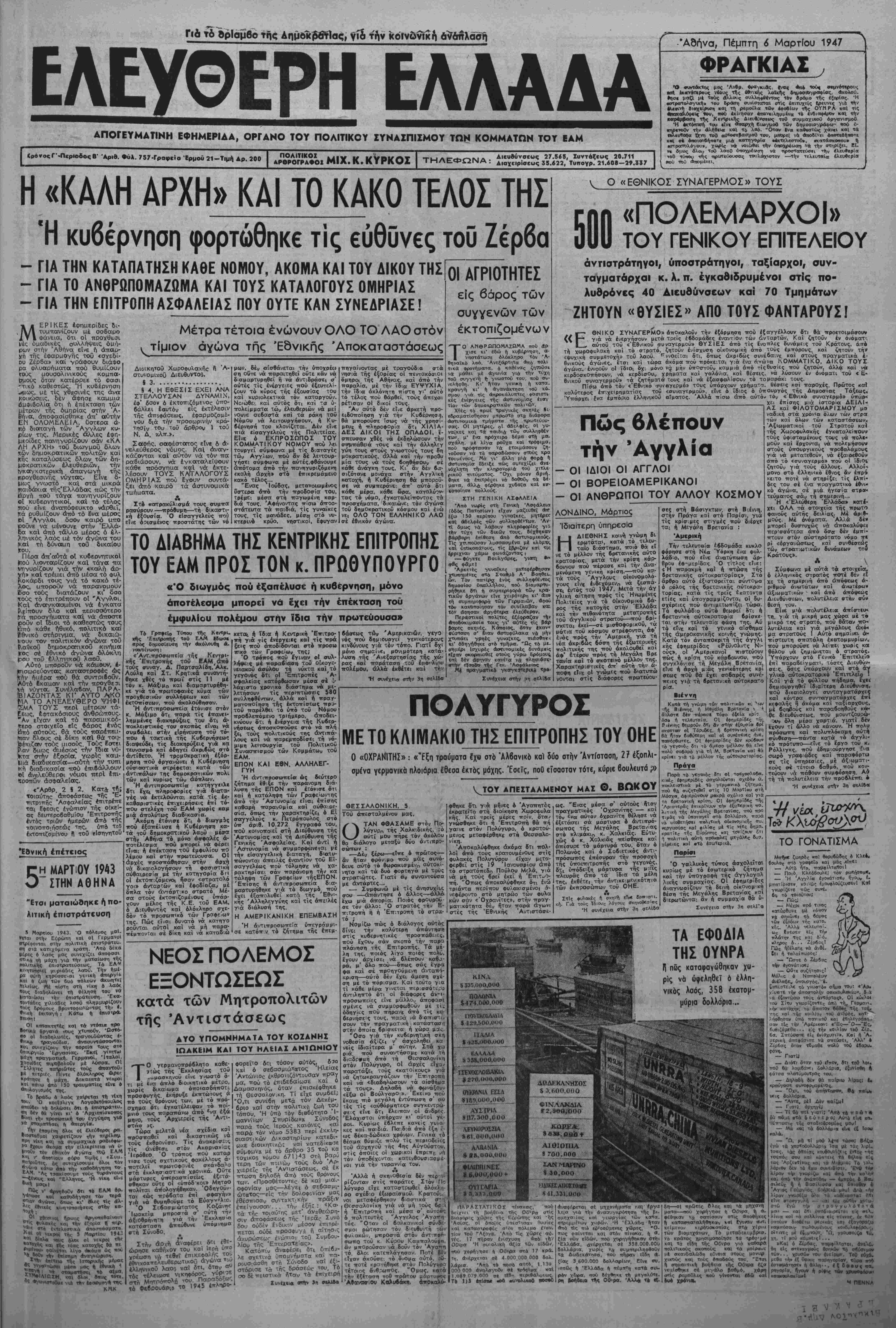 Γι& τα δρΐομβο τη< Δημοκρατίας, γίο την κόΐνώνϊκη άναίτλαση ΕΛΛΑΛΑ ΑΠΟΓΕΥΜΑΤΙΝΗ ΕΦΗΜΕΡΙΔΑ, ΟΡΓΔΝΟ ΤΟΥ ΠΟΛΙΤΙΚΟΥ ΣΥΝΑΣΠΙΙΜΟΥ ΤΩΝ ΚΟΜΜΑΤΩΝ ΤΟΥ ΕΑΜ ΜΙΥ Κ Νε*νΡΙεΌΤ ΤΗΛΓ-ηΝΔ · Αιευβύναεος 27.5*5, Συντάξεως 20.711 Ι ΐηΐΛ.Ι.ΜΙΓΐ·ν/_ | 1ΜΛΕΦΩΓΜΑ: Αιαχειρΐοεως 35.622, Τυπογρ. 21.«0β-29.8»7 | · Αριβ. Φύλ. 757-Γραφίία Έρμού 21-Τ.μή Δρ. 200 ΠΟΛΙΤΙΚΟΣ ΑΡΘΡΟΓΡΑΦΟΖ •Αδήνα, Πέμπτη 6 Μαρτίου 1947 ΦΡΑΓΚΙΑΣ Ό «υντ&κτης μας 'Λνβρ. Φραγκιας (νας *η4 νού* μφς ΜΟΙ 4κ«ν*τΐροι>ς νίους τ|(ς <*νικής λαϊκάς οημοσι&γραφίας, ακολού. •ησε μοφ μ* τ«ί»ς Λλλους συλλη^βθτας τον βρόμο της έξορΐας. Ή «οτρατολόγική» ^βο δράση συνίσταται στΐς ίπιτυχείς Ιρίυνες νια την «Μείνη οΊαχιΙριση και τή ρεμού)α των ΙψοβΙων Τί|ς ΟΥΜΡΑ κβΐ τίς ■Ι—(«(ΛΟψ«ι<( «ον, «ού ΙκΙ.ησαν *~νιιλημμίνα τί ενδιαφέρον και την Μτρ4|ΐ0αση της .Κινφικής Δΐίΐτίυνσβως το0 συμμαχικον) οργανισμοθ •Η ε*το*ισή τον> εΐν* *πβρχή βι»γμοΟ των δη*ιοσιογρ4φω-· —ίι ο-