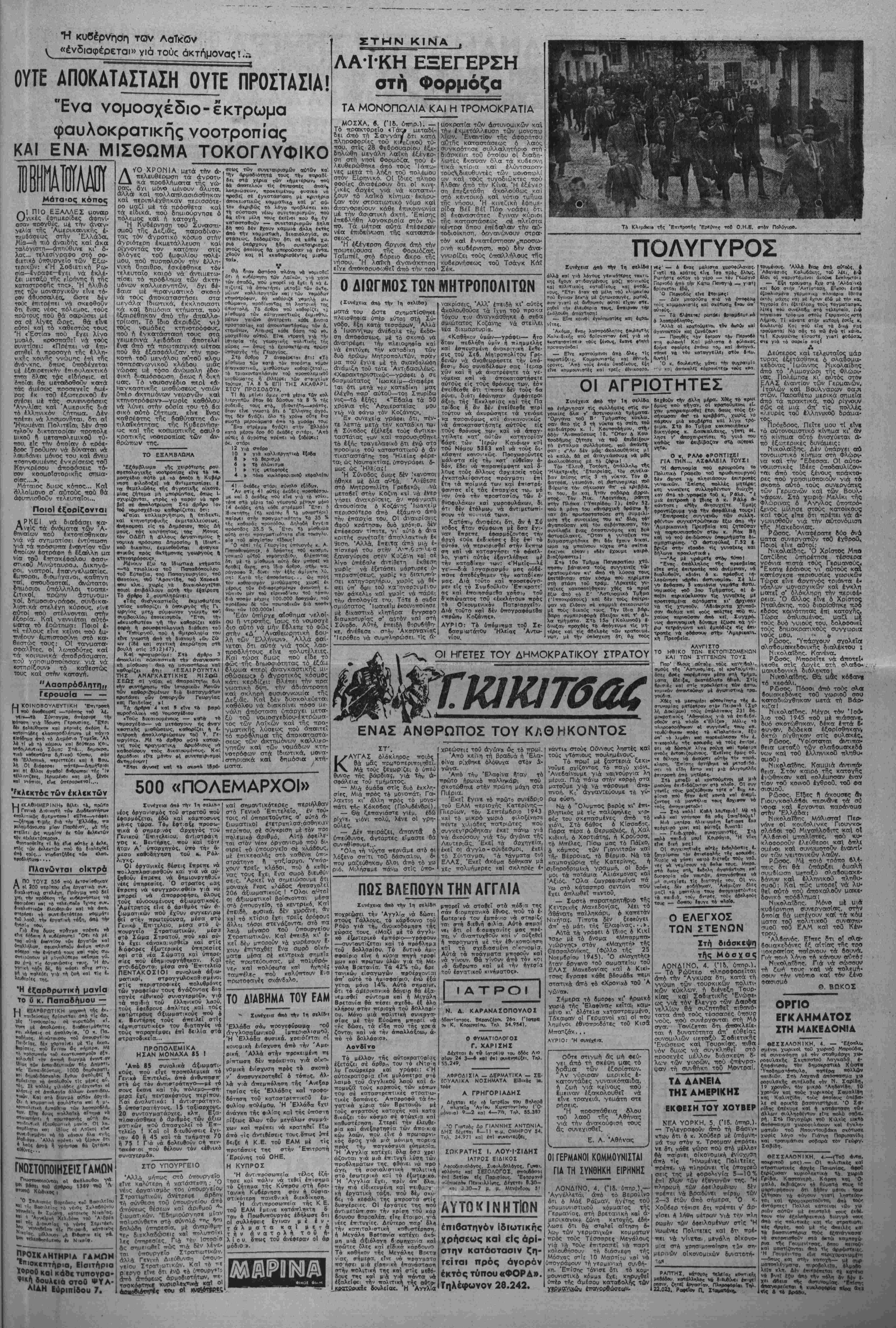 ιβθ τύ—« της πρ<Λίύουοχχς τουλάχιστον —την τελευταία ΙλιυβίρΙα κου τού «πομένει. Η «ΚΑΑΗ ΑΡΧΗ» ΚΑΙ ΤΟ ΚΑΚΟ ΤΕΑΟΣ ΤΗΣ Ή κυβέρνηση φορτώθηκε τις εύθθνες τού Ζερβά - ΠΑ ΤΗΝ ΚΑΤΑΠΑΤΗΣΗ ΚΑΘΕ ΝΟΜΟΥ, ΑΚΟΜΑ ΚΑΙ ΤΟΥ ΔΙΚΟΥ ΤΗΣ - ΠΑ ΤΟ ΑΝΘΡΩΠΟΜΑΖΩΜΑ ΚΑΙ ΤΟΥΣ ΚΑΤΑΑΟΓΟΥΣ ΟΜΗΡΙΑΣ - ΠΑ ΤΗΝ ΕΠΙΤΡΟΠΗΑΣΦΑΛΕΙΑΣ ΠΟΥ ΟΥΤΕ ΚΑΝ ΣΥΝΕΔΡΙΑΣΕΙ ΜΕΡΙΚΕΣ έφηιμερίδες δι- φανεια, ότι οί προνβε,οι Ιΐς όμαόικές ουλλήψεις όυή,- ρων στήν Άθήνα είνε ή απαρ¬ χή της έφαρμογής τοΰ «σγεοί- ου Ζερβά» καί νράφουν διάΦθ ρα φΑυαρήμ.ατο: πού θυμίζουν ίούς μουσολινικούς ικομπα- ττμούς δταν κατέρρεε τό φασι 'τικό καθεστώς. Ή κυβέρνηση *ιμως, μέ τίς γθεσινές της άνα Κθινώσεις, δέν άφησε καμμιά άμφιδολία ότι ή έτιέκταση τών μέτρων τής όμηρΐας στήν Ά- Βήνα, άποφσσίσθηικε άπ' αυτήν ΕΝ ΟΛΟΜΕΛΕΙΑ. ϋστερα ά- »ιό δκχταγή των "Αγγλων κυ¬ ρίων της. Μερυκές αλλες έφη- Ιαεοίδες πανπνυρίζουν σάν «ΚΑ ΛΗ ΑΡΧΗ» τού διωγμοθ δλων Κων δηιμοικρατικών πολιτών καΐ Κης καταλύσεως δλων τών δη· Κοκροπικών ελευθεριών, τήν (γικαγκστερικτ) άπαγωγη της ηρογ,θεσινης νύγτοκ;. Είνε ο- Ιιως γνωστό χαΐ στά μικρά ίταιοάικιο: τής'Ελλάδας πώς τήν Ιάργ,ή πού τάγα ποτνηγυρΐζουν οί κυδερνητΐ'κοΐ, κσΐ τό τέλος ίΐΐού είνε άναπόφευκτο νάρθεϊ, Ιτά ςυθμΐζουν άπό τό "ίνα αέρος 01 "Αγγλοι δσον καιρώ μπο ροθνε νά μένουνε στήν Έλλά- Βσ καΐ άπό τάλΛο μέρος ό έλ· λτινιΐκός λαός με τόν άγώνα τού |καΙ ττι δύναμη τοθ δικαΐου ΙΓου. Πέρα άπ'οτύτά οί κυδερντνπικοΐ (τού λιονταρΐζουν «αί τάγσ ιΐα νπγυρίζθυν νιά την «καλή άρ- γή» καΐ τρέμει άττό μέσα τό φυλ Κοκάρδι τους γιά τό ικακό τέ¬ λος, μποροον νά παρανομουν Ιοσρ τούς διατάζουν κι' δσο ίτούς τό έπιτρέπουν οί "Αγνλοι. ΚαΙ άνοτνκοιοιμένοι νά έγκατα λεΐττουν δλο καΐ περισσότερο (τη -ροσγήιματα «αί νά άποστε Βοΰν οί ϊδιοι τό χοοθεστώς τους Ι&πό κάθε ήθυκό, πολιτικό καΐ ϊθνικό στπριγιμα, νά ^ικαιώ- κουυ τον ττολιτικόν άγώνα τοΰ ΙΛαΐκοΰ δηΜθ.κ.ροτΓΐκοΰ ικινήιιχα ΙΤος σέ έθνικό άγώνα όλάκλη |ςιοο τού έλλπνικοΰ λαοθ. Αύτό μποροΰν νά κάμουν. *- |»Γΐσωρεύοντας ικαταστροφές ώς *Λν ήιαέρα τιού θά συντοιβοΰν. Αύτό έκαμαν καΐ τήν ττρογθεσι νύγτα. Σ ανέλαβον, ΠΑΡΑ- ΪΪΑΖΟΝΤΑΣ Κ Ι" ΑΥΤΟ ΑΚΟ ΤΟ ΑΝΕΛΕΥΘΕΡΟ ΨΗΦΙ ...... ΤΟΥΣ ττερΐ μέτρον τά- Κεως, έφτακ6σιους άνθρώπους. "Άν εΐγαν «αί τα ιταραμικοό- Ιτερο στοιγεϊο είς Φαρός ενός Ιαπά αθτοΰς, θά τους τταρέπβα- Λταν δλους σέ δΐικη καΐ θά τού- ',_. τούς μισούς. Τούς ε"—βι "Λάν 5υ.ως άιχέσως την ιδία νύ- ραα στην έξορΐα, γωρΐς καα- Ιαιά διοτδυκαστα—αυτή την τυπι Ική διαδικασία πού έπιβάλλουν ΐοΐ άυρλεύθεροι νώμοι τιερΐ επι- ίΐοοπών ασφαλείας. «"Αρβρ. 2 12. Κατα τοιαύτης αποφάσεως Μετρα τετοια ενωνουν ΟΛΟ ΤΟ ΛΑΟ στόν ^τίμιον άγώνα τής Έδνικής Άποκαταστάσεως ης ης Ασφαλείας ίτπτρεπε τοίι ?φεσις ενώπιον τής ο'.κεί- βς δευτεροβσθμίθυ ΈτΓΐτροηης έντός τριών ημερών άπό τής χοινοτΓθ-ήσεώς της, ύττό τοθ ίκτοπιζομένου Κ τού εΐσηγητού ΊΕσνική έπέτειος 5η ΜΑΡΤιΟΥ 1943 ΣΤΗΝ ΑΘΗΝΑ "Ετσι ματαιώΒηκε ήπο- λιτική έπιστράτευση ϊ Μαρτίου 1943. Ό πόλεμος μαΐ. *£Ται στήγ Εύρώπη χαΐ οί ΓερμανοΙ Ιοτρέφονται στήν πολιτική έτπο'τράτευ- «"] στά κατεχ6μεν<χ κρατη. 'Ατΐό δεκα μιρες δ λαός μσς ουνεχιξει ά,ποφοτσι "Τικο τη μάχη γιο την ματαιώση τής Πολιτικής έπιστρατεύσεως. Τό ΕΛ*Ι 1ι*ητοποιεϊ μυριά&ες λοΛθ. Την ήμί- ρα αύ'ή κηρυσσε.αι γενική άπεργιο κοι Λ (,ωή των 6υό πόλεων «κινηΤΕί "ΈΚίίως. Μί πίστη στή νίκη 6 λα6€ «ούς διαδηλώνει τή θελήση τού ν* Ιιαταώσει την έπιστράτευση. *Εκβ· ΤοιταδΓς χιλιάδες λσοΰ πλημμυρΐζουν *ους δρομους βροντο