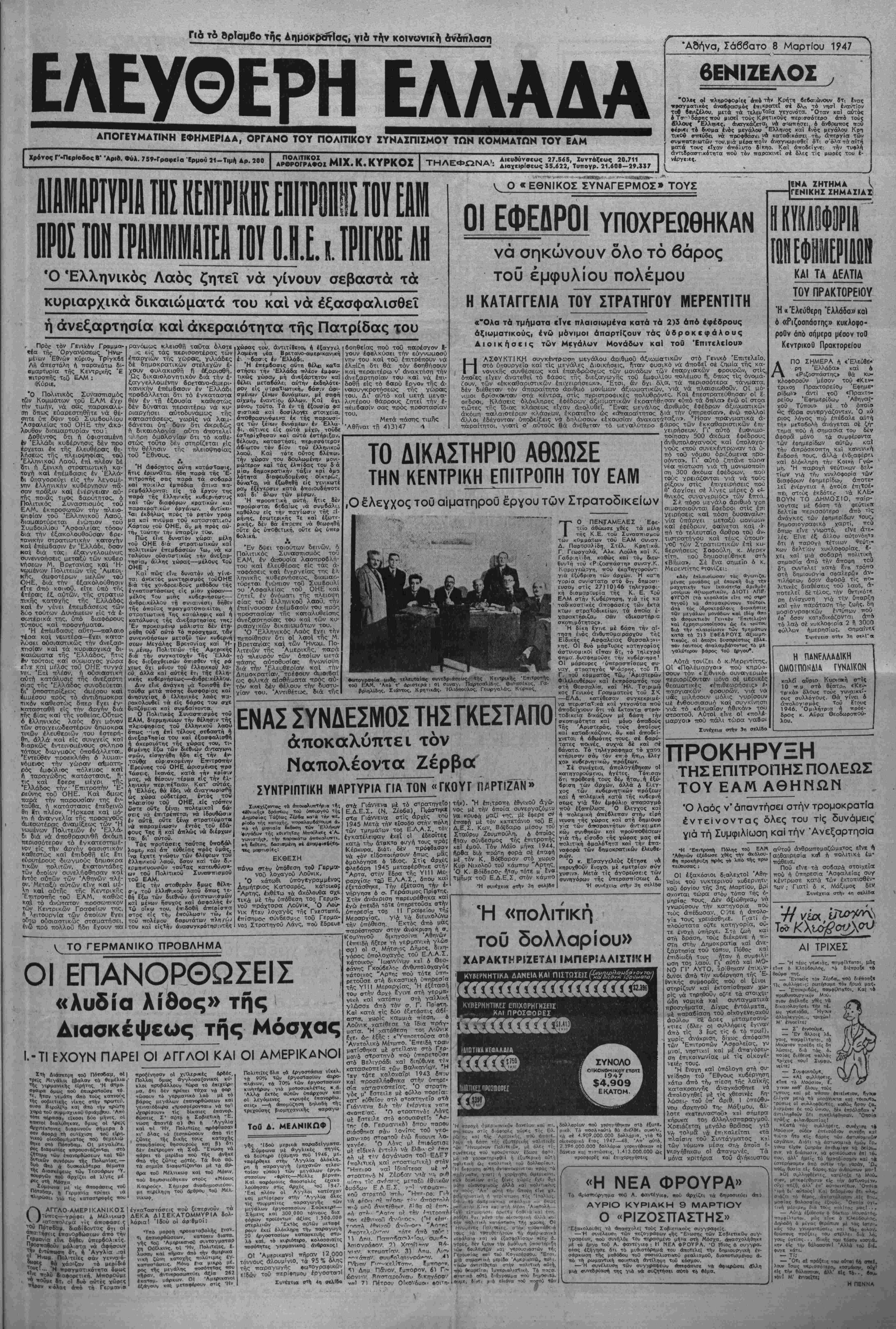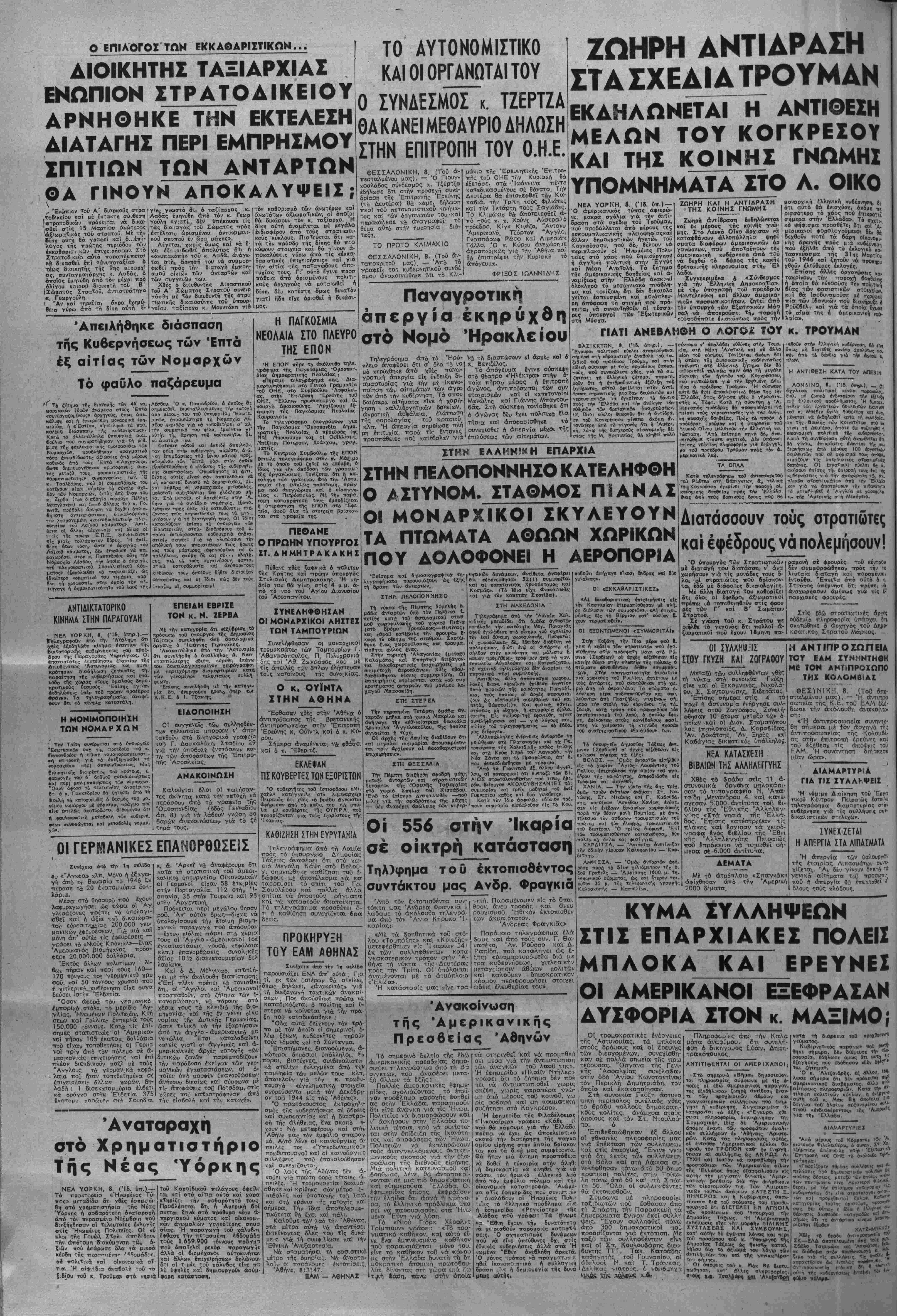 ·<τ τ^ν Άμερική'ς στή Μίσόγίιθ. Αιατάσσουν τούς στρατιώτες κα'ι έφέδρους νά πολβμησουν! Ό ύπουργός των Στρατιωτικών μέ διαταγή ιθυ διατάσσει ν' άν? χωρήσουν γιά τίς μονάδες τους ϊ· λθι οί στραΤ'.ΰτες ποΰ βρ'ισκθν- ται έδώ μέ διάφορες δικαιολογίες. Μέ σλλη διαταγή Τού καβορίζει δτι ό'λο; οί ίφεδρο, άξωμθΓΤικθΐ ττρέττει νό: τοττοβϊτηβοΰν στΐς φρου ρίς τΰν Γ' καί Β' Σωμάτων ΣτρατοΟ. ' Σέ γνώση τού κ. Στρτχτθυ ττε ριηλθβ τό γκγθνός δτι ττολλοΐ α- ξιωματικοί ποΰ ϊχουν Ιβμηνη π3· ραμονή σέ φρουρές τού κέντρον εέν ΟιιμμΟρφώθηκαν πρός την Π λ^υταία δ αταγή κα'ι παραμένοιι; ένταΰβοι. "ΕττειΤα άττό αύτό & κ. Στ.'.-άτος υπέμνησε δτ: πρέπΐι νβ ά αχωρήσΟΐΛΐ άμέσως για τίς ί* παρχιακές φρουρές. Στΐς ίδώ στροττΐωτικες άρχές ούδεμί* πληροφορία ύπάρχεΐ δή σκοτώθηκε ό άρχηγός τού Δΐμ»· κο<χπκο·3 Στρατοΰ Μάρκος. ΟΙ ΣΥΛΛΗΙΜΣ ΙΤΟΥ ΓΚΥΖΗΚΑ[ ΖΟΓΡΑΦΟΥ ΜεαξΟ των συλληφθέντοϊν χς τή νύκτα στή ο^νοΐκία Γκΰζη εΐνβ καί οί Ξεκομνηνός, Νΐν.ολά- ου. Σ. Σανταμούρης, Σιδεοάτος. 'Επίσης σήμερα στΊς 4 τό ττρωΐ ή σστυνομία ενήργησε συλ¬ λήψεις στοΰ Ζωγράφου. Συνβλή· φθησαν 10 άτομα μεταξύ των ό- —τΐων καί οί Διον. Σταματόπου λος έπ^πλοποιός, Δ. Καραβίδας, Άν. Δοκάτσης, Άν, Ξηρός κ*1 Καβάγΐος δικαστικόο ύπάλληλο;. ΝΕΑ ΚΑΤΑΣΧΕΣΗ ΒΙΒΛΙΟΝ ΤΗΣ^ΑΛΛΗΛΕΓΓΥΗΣ Χθές τό βράδύ'—Ις 11 ά- στ.υνουικά βργθνα ιιπλοκάοι- σαν τό τ,υπονραφεΐο Μ. Άπσ- τσίδπ ^Λενάνδρου 4, καΐ κσπέ- σγεσαν 5.ΟΟΟ άντΐτυιτα τοΰ βι· &λίου της Έθνικής 'Αλλπλεν- νύπς ^«Στσ· νησιά της "Ελλά¬ δος. ΈττΙσπς κατέοτρρψοη/ τίς πΧότκες καΐ Εσγισαν τα γειρό- νααφα ενός διβλίου της Έθνι κ^ς Αλληλεγγύης Πειραιώς πού επρόκειτο νά τυτιωθεΐ σή- αερα σέ 6.ΟΟΟ άντίτυπα. Μέ χδ άτμόπλοιο <Στταγκάκ<ι αφίχθησαν άττό την Άμερ'.κή 2ΟΟΟ δίματα. Η ΑΝΤΙΠΡΟΙΠΠΕΙΑ ΤΟΥ ΕΑΜ ΙΥΗΜΝΤΗΦΗ Μί ΤΟΝ ΑΗΤΐΠΡΟΐαΠΟ ΤΗΣ ΚΟΛΟΜΒΙΑΙ ΘΕΣ)ΝΙΚΗ, 8. (Τοθ απε· στοολϋένου μας). — Ή άντπτρο σω-ϊΛΐα ττϊς Κ.Ε. τού ΕΑΜ έζέ- δΜοε την άκόλουβτι άνακοίνΐ* οπ: «Ή άντιπροσωπεία συνηντΓί- θη σήμερα μέ ίόν άργηνό της άντιττροσωπείας τής Κολσμί1- πς στήν έπιτροπή ερεύνης κ/.ι τοϋ εξέθεσε τίς άπόψρις το. ΕΑΜ. Ή συνάντηση διήρκεσε μίαν ορα». ΔΙΔΜΑΡΤΥΡίλ ΠΑ ΤΙΣ ΙΥΑΑΗΦΕΙΙ 'Η νόμιμη Διοίκηση τού 'Εργπ τ'κοθ Κέντροι» Πειρα ώς Εστει,ε τηλεγράφημά διαμσρτυριας σΤήν κυβέρνηση γιβ τίς συλλήψεις οί"· δικαλιστικών στελεχάν. ΙΥΝΕΧ'ΖΕΤΑΙ Η ΑΠΕΡΓΙΑ ΣΤΑ ΑΙΠΑΣΜΑΤΑ Ή άπϊργία των ΰσ?.θυργδν της έταιρίας Λιττασμάτων συνε· χίζβτα·. "Αν δέν γίνουν δεκτβ τα γενικά αΐτήματα Τού ττροσωπΐ- κ.οϋ ή άττεργία θά έπεκτΐθεί ·>