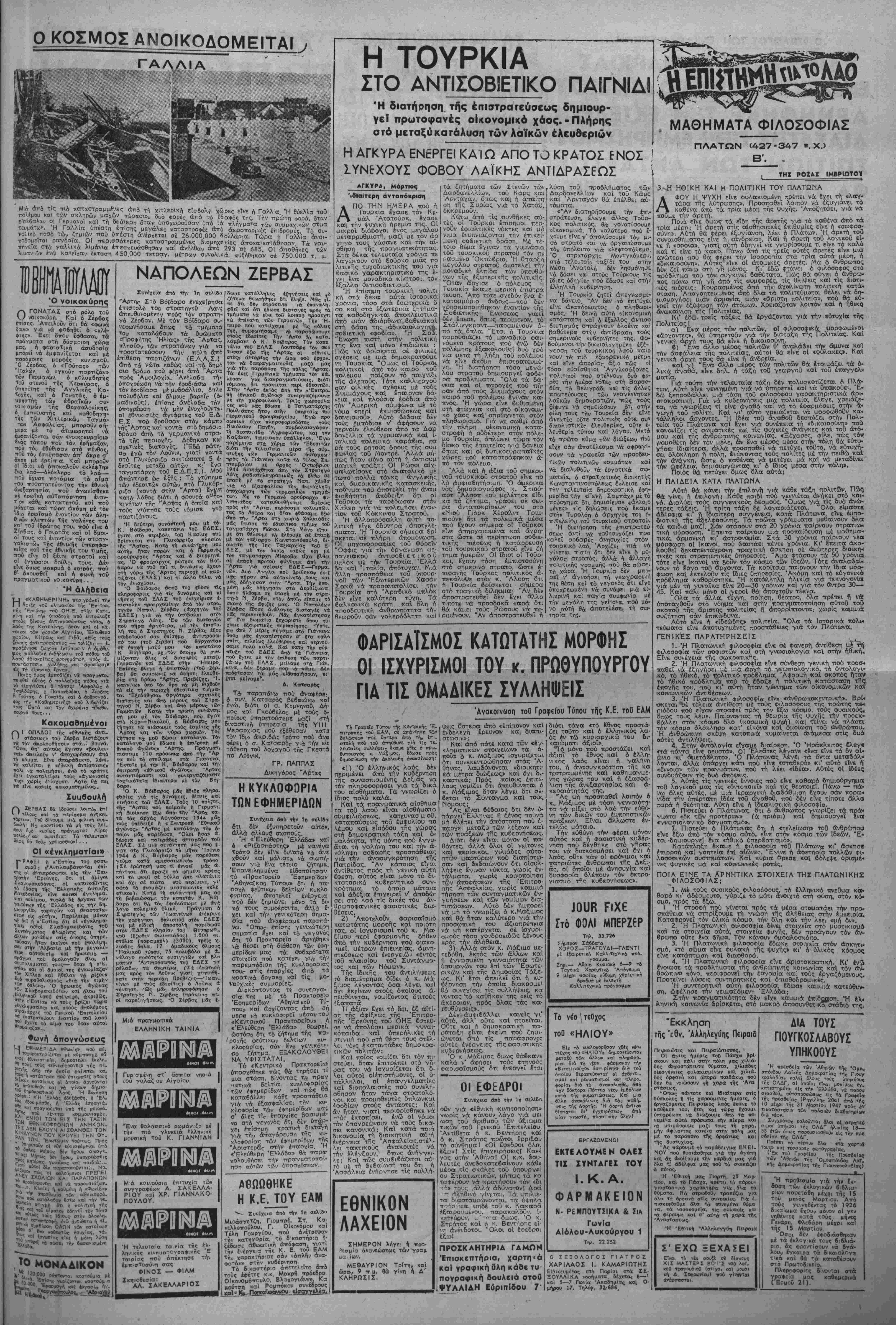 κρατικοί πολίτες, σ'.ήν ''"ρίπ£<- λη πάνω άπό 60 κα'. -*τή ΣπάΓ. τη 50. "Ολοι οί συλλΓοθέντε; θά έκτοπισθοϋν. Σύμφωνα μέ πληροφορίες ταζιδιωτών ποΰ Μφθασαν άπο τή Σπάρτη. την Παρασκευή τα ζημερώϋατα βγιναν έκεΐ συλλή φεις. "Εγουν συλληφθεΐ πάνω απά 300 δημοκρατικοΐ πού τΐοοορίζονται γιά έκτόπιση. Με ταξύ τών συλληφθέντων είνϊ χαΐ οί Σττ. Κουλουβάρης διεο θυντής ΤΤΤ. Τακ. ΚστράδπΓ. καθηγητής τοΰ Ι'υανασίου, οί άδελφοί Ν καϊ Ί. Τοάγκας, Δρλίκας γιατοός, {■ ν(»ιου.ηγ,7 ^ ο & 4 ' Πλη,ροΦο^ες άπί· την Καλα υάτα άναφ^μου. 8τι συνελή¬ φθη 6 δικηγύ^ος ίύάγ. ΔηΒΠ· τρακόπουλος. ΑΝΤΙΤΙΘΕΝΤΑΙ ΟΙ ΑΜΕΡ1ΚΛΜΟΙ; ■ Στ6 σημερινό «Βήμα» 6ημοαιεύ4ν. ται τιληροφθρΐες σύμψωνα μί τίς ο¬ ποίες οί έδώ αμερικανΐκοΐ τΐαράγον. τες έζεδήλωααν ζωηρή Οντΐβεση έναν¬ τι των προχθεαινών ιΜρόων »»ι γκαγκστερικών συλλή |ιεων τιού ίνήρ γησε ή κυβέρνηση. Σνγκεκριμίνο Ί· ναίέρο/ται τ4 εξής: «"Εγκυροι χβι οινσΐ πληροφορίαι βιηιικρίνησσν τή<. Συμμοχικην. Ιδία σε 'Λμερικανικήν <&ποφΐν Ιναντι των ηροσψάτων ΛμαΗι· «ών συλλήψεων ίν Άβήνβΐν; 'Λριατε- ρών. Κστα τάς πληροφορίας αύτάς, οί ενταύθα ΆμΓ.ρικανικοΙ κίκλοι βε· 'οροθν τόν ΤΡΟΠΟΝ καθ· δν ένηργη ΘηαΛν «Ι συλλήψεις ώς ΑΚΡΛΙ Λ- ΤΥΧΗ καΐ Ικανόν ν* πορ«Ρλάψή την ηρα—ό&ιαν των Άμερικσνών φΐλων τής Ελλάδος δτιως ίξσΐφαλίσουν »Τς αυτήν την μεγίστην δυνοίτήν Άμϊρ·- κανικήν βοήθειαν διά την ΛνιΊρβωσ.ν των οικονομικήν Της. Των Άμερικη- νίκων τούτων Οπόψεων ΚΑΤΕΣΤΗ Ε- ΓΊΗΜΕΡθε και ή Κυβέρνησις, *ττ«ν· τήσααα 8ι4 τοΰ βτόμβτος τοθ Πρωβυ- πουργοΰ «τι ΔΙΕΤΕΛΕΙ ΕΝ ΛΓΝΟΙλ των τιροβέσεων τοθ ΎπουργοΟ τή>