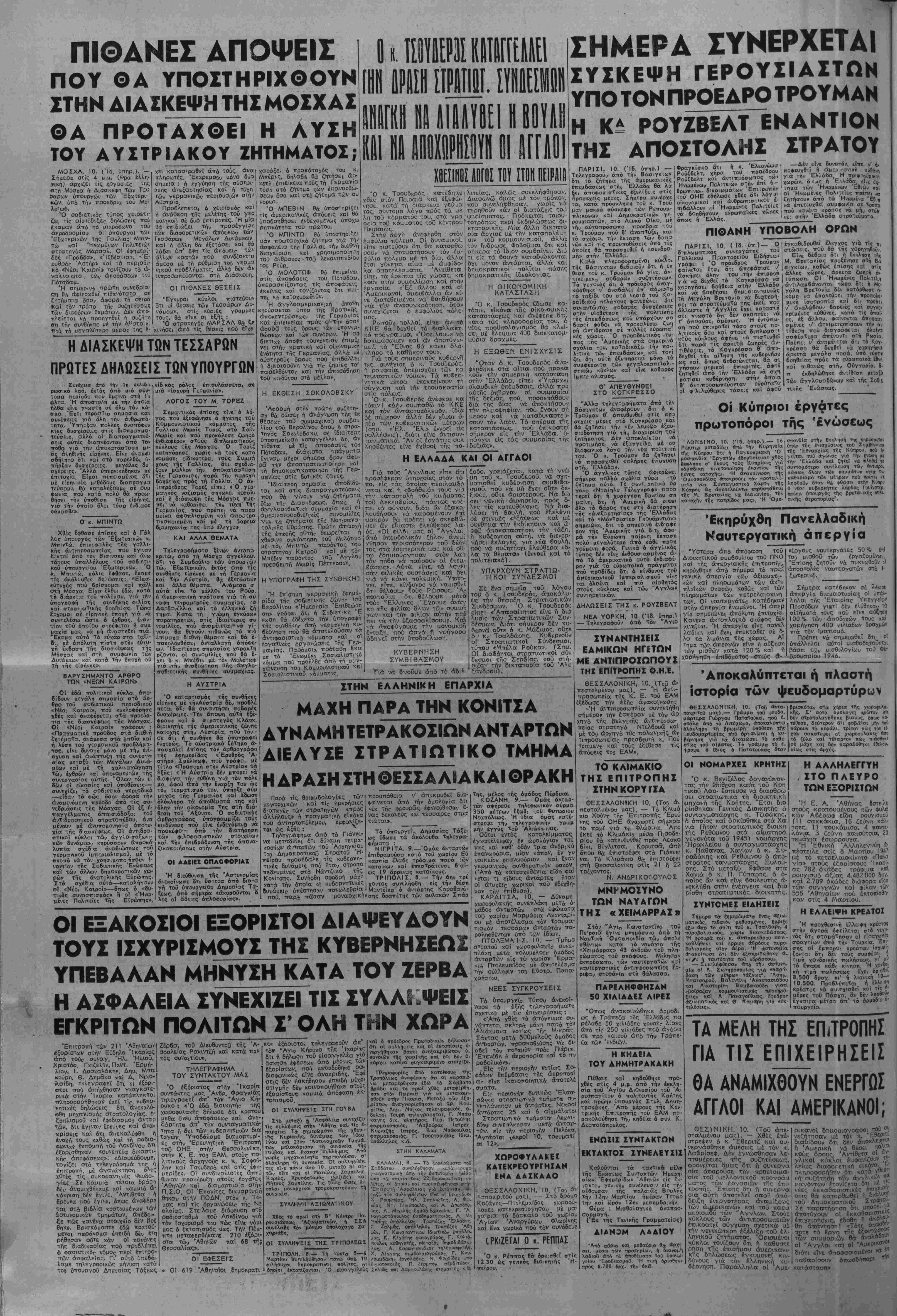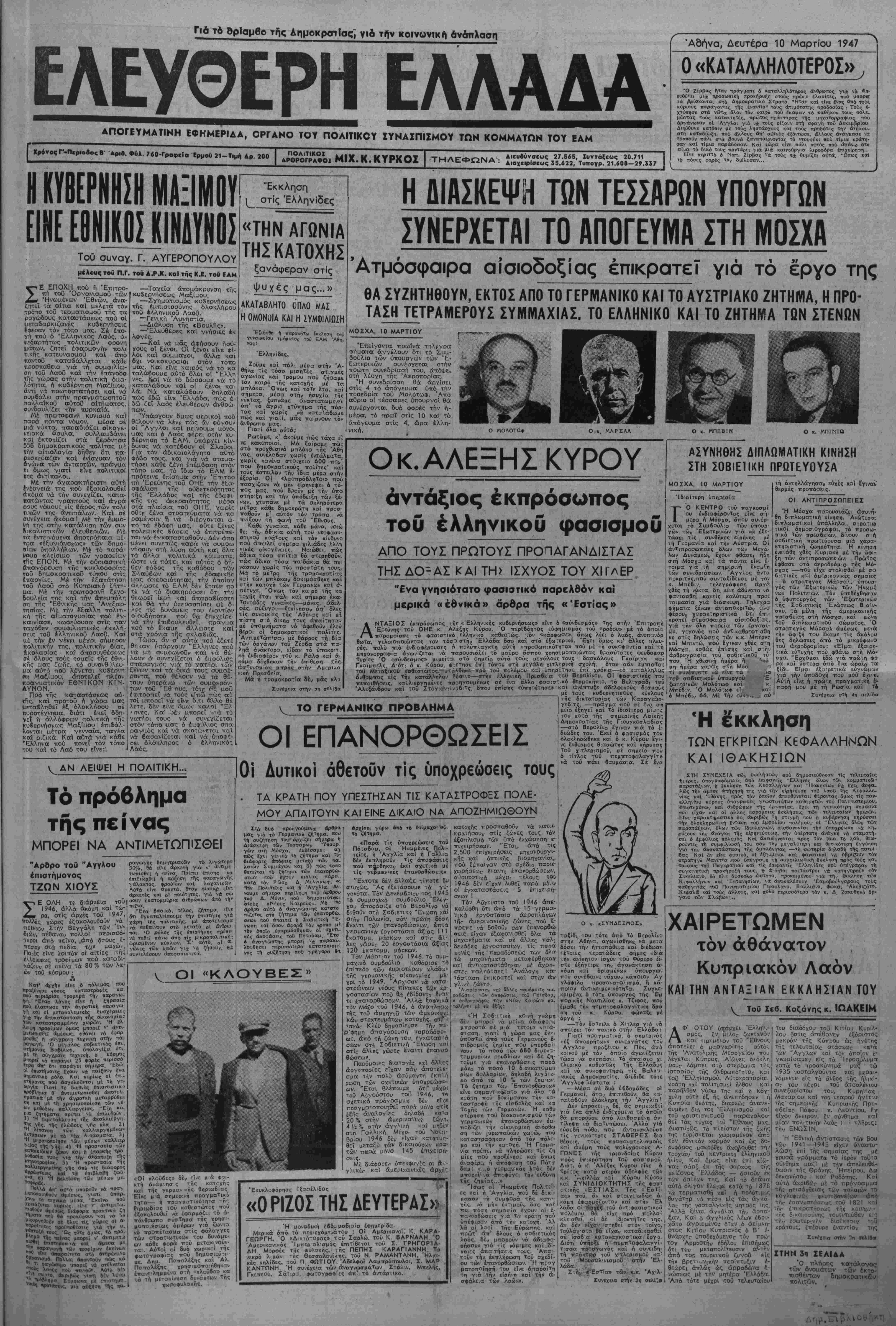 Ι Χρ6τ-οςΓ-Π«ρ<οδοςβ Άριβ. Φύλ. 7οΟ-Γραφεία ϊρμού 21—Τιμή Αρ. 200 4Ρ8ΡΟΓΡΑΦΟΙ ~ΙΑ. ΙΧ. . Α.»υ«ΰνο«ως 27.565, Ιυντάξεος 20.711 : Αιαχιΐρ|β€θς 35.β22, Τυπογρ. 21.όΟβ-2·.537 *Α8ήνα, Δευτέρα 10 Μαρτίου 1947 0 «ΚΑΤΑΛΑΗΛΟΤΕΡΟΣ» Ό Ζίρβας Ι)ταν τιράγματι 6 καταλληλΛτϊρος ανβρωιτος γιίτ, να *κ- ευθύ>ει μΐα προοωπική προκήρυξη στους πρώην ίλασΐτες, ποθ μπορή