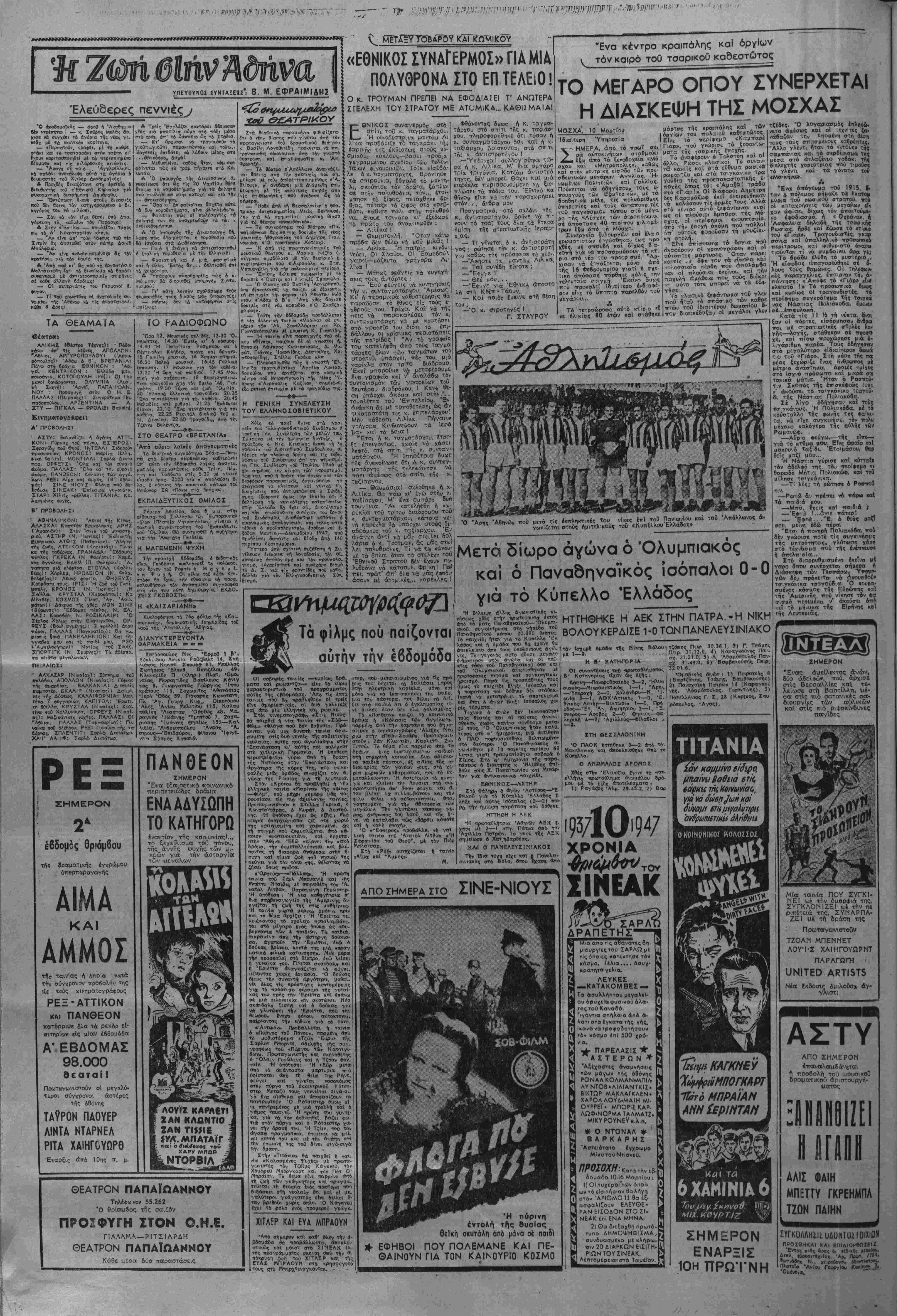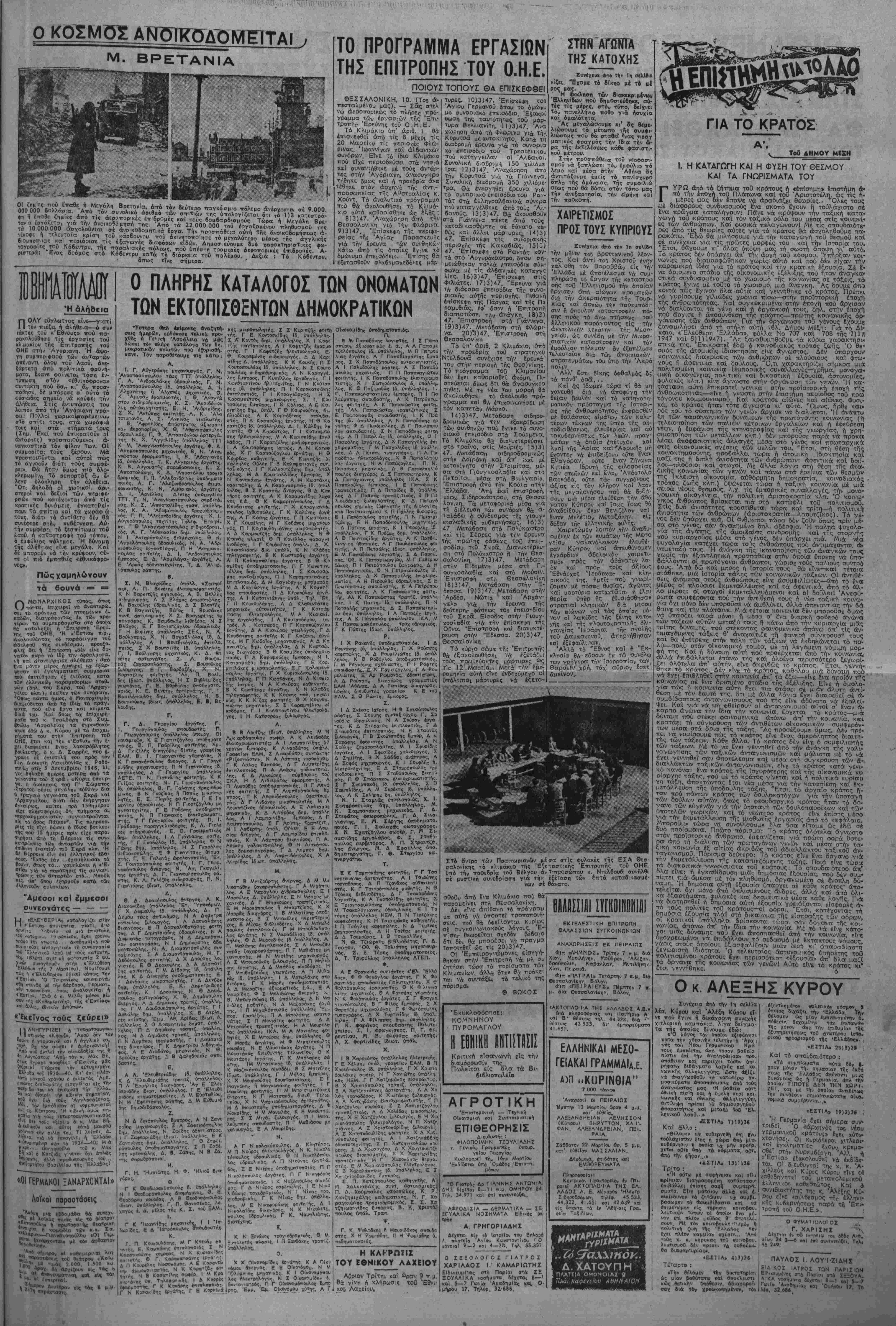 Σήμερβ Τ4 ξημερώματ<χ |να·ς βζιω. ματικ&ς, πιβσνόν μεθυσμένος. Ερριξε Εξω βττό Τ6 σιτίτι ΤΟ0 κ. ΤσσΛδάΡη 4 πυροβολισμοϋς, χάριν διασκεδάσε&χ, Ή φρουρά τοθ κ. οΥντιτΐροέδρου πσν.- κοβλήθηκε καΐ ϊρριξϊ άβρόσυς τΐυρο· βολισμούς οτ6ν <4έρα. Ή ΛστυνονΐΙα 4'οκοίνωσ! δτι δέν έξακριΒ.ώθηχε *- κί^χ ή τσυτότητσ ίοθ «δράστου». — Συνελήφθησαν βιτδ την αστυν», μΐη β'. Α. Σωτηρόιτουλος γιο ~αρ'τ· Ρ<ΐση των μέτρον τάζιως", Άσημ. Μ7ατσαρ·ο0, Βολετ1ντι Άναστασιιίδου κοί ΛΊκατερίνη Βαμβακούδη γιοτΐ «μοίραζαν κομμουνιστικές ττροχηρύ- ζεις» κοί Λ. Παναγούλιας, ΕφεδρθΓ αζιομστι»<6ς κ«ι θ. Καμβρη γι4 «ίκ τελέσεις». Η ΑΛΛΗΛΕΓΓΥΗ , ΣΤΟ ΠΛΕΥΡΟ ΤΩΝ ΕΞΟΡΙΣΤΩΝ Ή Ε. Α. Αθήνας Ιστειλε στούς κρατουμένους των Φυλα κων Αβέρωφ ειδή ρουγισμού (11 σακκΰοκια, 16 ζεύνη κά· τσες, 11 πουκάιαισα. 4 τταντϊ· λόνια, 3 ζεύνη παπθύτσιοι, 20 τεμάγια έσώρρουγα. Ή Εθνική 'Αλληλεγγϋη α¬ πέστειλε στίς 8 Μαρτίου 1947 Μέ τό πετρελαιοκίνητο «Πσνοι νία> στούς έξορίστους Ίκαρ'-