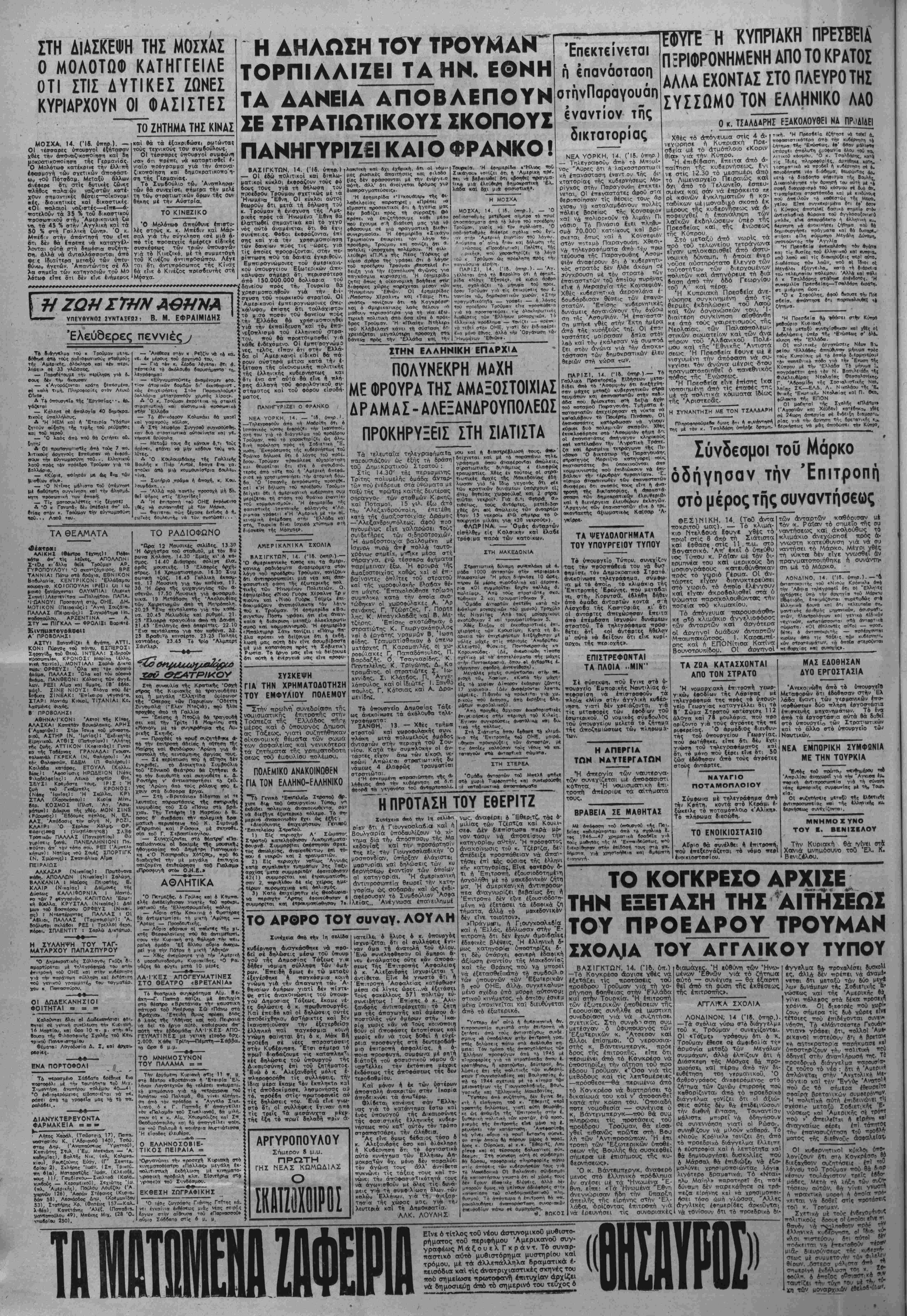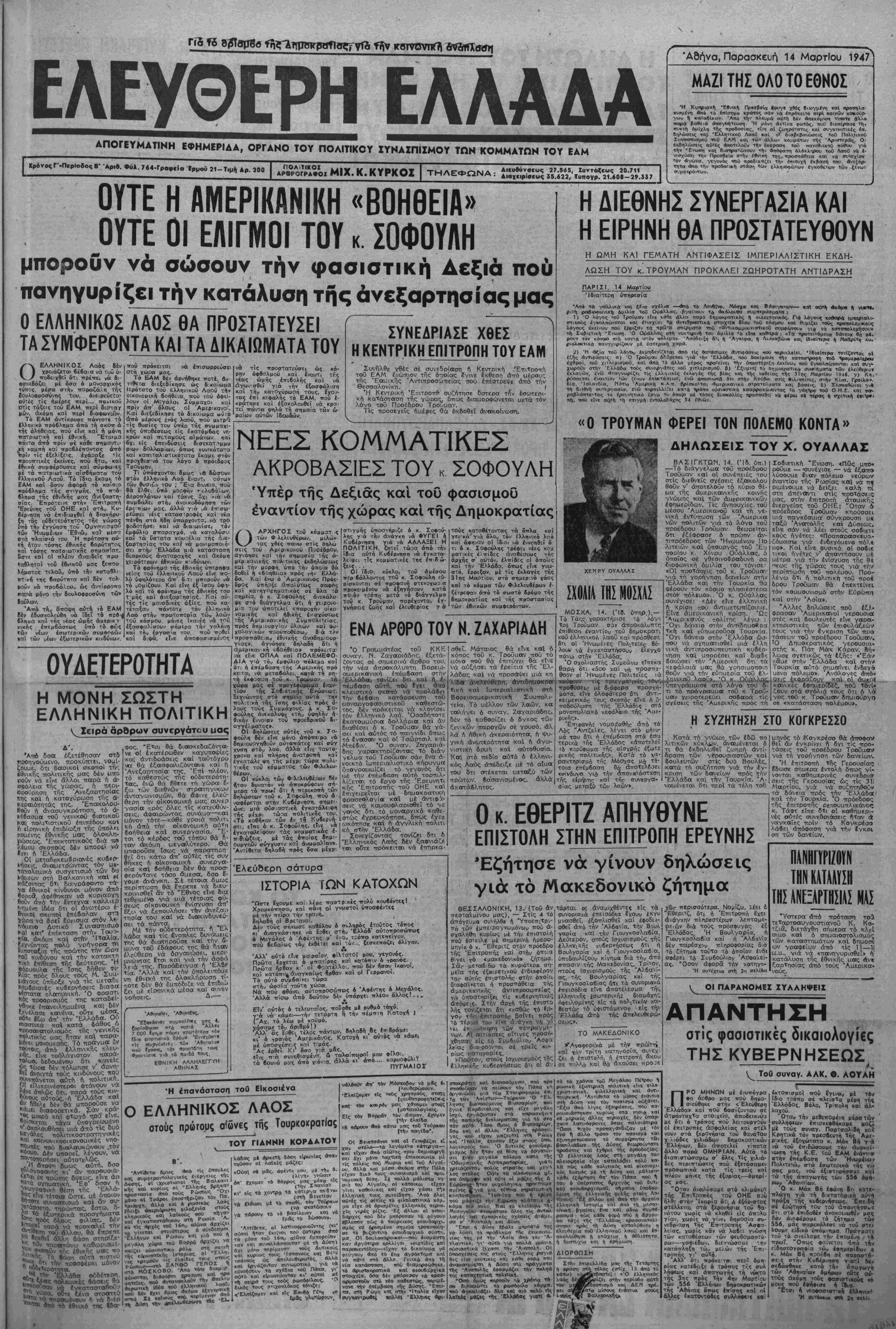 Συνα—ισμού τού ΕΑΜ καΐ των <5ίλ.λων κομμάτων της 'Λριστερας. Ο, έκδηλώσεις αύ"ές ά—τελοθν την εκφράση τού πανεθνικοθ πο&Μ γνά την -Ενωση καί διατρανώνουν την άπώψα~ ολοκλήρου τοθ ΛαοΟ νά «- νισχΰσΐι την Πρεσβΐία σ'ήν ί*νι*ή της προσπαθεία κσΐ νά συνεχίσε1 τόν άγώνα, γεγονός ιτβύ προδικ<τζει την επιτύχη ίκβασή τού, άνεξάρ- τητα 4πό την προδοΐική σταση των έλληνθφώνων έγκαβετων των ξένων ονμρ?ρόντω ΕΛΛΗΝΙΚΟΣ Λαός δίν χρειαζίται βεβαία νά τυθ ύ- ποδειχθεϊ ό'τι ττρέπε, ν« 6:- ασκεδάζει μέ οσα ό μθναρχικός τύπος, μέσα στήν παροζάλη της ίθυλοφρθ(Τύνη<; τού, όνειρεύεται ούτές τίς ήμερες ττερϊ... πανΐκαΰ Ιστΐς τάξεις τού ΕΑΜ. περί δισταγ ιιώκ. άκόμη και περί διαφωνίαν. Τό ΕΑΜ άντίκρυσε πάντοτι τό έλληνκό πρόβλημα άπό τή σκθπ ά τής αληθείας, ποΰ είνε και ή μόνη ττατριωτική καί έθνική. "Ετοιμο ηάντα άπό πρίν σέ κσθε σημαντι- Ίτή καμττή κα! προβλέπθντσς άττό ιτρΐν τίς εξελίξεως, εχάραξε τις ιτροοπτικές έκείνες, πού ή"τα,, και έθνικά συμφέρθυσες και σύμφωες μέ τα πατριωτικά αίσθήματα τού ΐλληνικθΰ Λαοϋ. Τό ϊδιο εκαμι τό ΕΑΜ και όσον άφθρά τό καί ο .ο πρόβλημα τίς στιγμής, τό ποό- βλημα .τής έθνΜς 4»ας άνεξαρττ^- ττίας. Έττρότεινε οττήν Επιτροπη Ερεύνης τού ΟΗΕ καί στή« Κυ- βέρνηση νά έτπδιωχθεϊ ή διακηρύ¬ ξη τής οόδετερότητο^ τής γώραξ υπό την έγγύηση τού Ομγοτνι των 'Ηνωμένων Έθνώ« καί μ ϊτά πλαίσιά τού "Η πρότοτση αύ- ϊή ήταν τόσης έ&νικής βαρύτη'ο», «αι τόσης παΤο·ωτικής σημασίαν, Κστε κβΐ οί πλέον άναιδεΐς πβο ταθληταί τοθ έθνΐκθΰ μας ξεττθυ Κήμστος τελθθυ ύττό την κοτταθλι Ιττ·κή της βαρύττπα καΐ δέν τολ· Ιιούν νά ττροβά) οθν, ώς άτ!ρροττο ιταρά μδνο την δουλθφροσύνη των Βούλαν. ΕΑΜ Βέν σιιθΐ' Άτγο τήυ δπθψη^ αύτίι το ν έδυσκολεύθη νά Ιδεϊ τό 6λημα και της νέας ώμης άμεοικ"» νίκης επεμβάσεως 6πδ το φι";ς (ών νίων εσωτερικώ^ συμφέρον καϊ των νέων εξωτερικών κινδύνω ν. ττου πρόκειται να έπισωρριύσει στη χωρα μας. Τό ΕΑΜ δέν αρνήθηκε ποτέ, αν τιθετο διεξεδίκησε ώς δ καίωμα ΐερότστο τού ελληνικοθ Λαοΰ την οικονομικήν βοήθειο;, πού τού όφει- λουν οί Μεγάλοι Σύμμαχοι καϊ ■αρίν άπ' δλθυς οί Αμερικανόν Κ δξδί δ ύό νβ ρην τις προ<Γτοττευσε[_ ως οφθαλμού κα! έναντι νέας ώμής έπιβολής καΐ νά •άγωνσθεϊ γιά_ την εξασφαλίση καί την κατθχύρωσή τους, £χθ^- τσς επί κεφαλής τό ΕΑΜ, που Ι- κρατησε καί έξακολουθεΐ νά κρά¬ τει πάντο ψηλά τή σημαία των ώ- Και διεξεδίκησε το δικαιωμα «κγο ραίων αυτών ίδεωδών απο μέρους ενός λαοϋ, πού μιτρά τίς θυσίες τού υπέρ τής συμμαχι- κής υποθέσεως είς έκατόμββς ντ.- κρών καί ποταμοϋς αΐμάτων καϊ 6χι είς έπενδυσεις δισεκατΐμμυ ριων δολλαρίων, δπως κυν'κότοπ'α καί καπιταλ.στικότατα έκαμε στόν προχθεσ'νό τού λόγο ό πρόΐδρος Τροΰμαν. Τί ύπόσχοντοιι δμω/; νσ. δώτουν στόν έλληνικό Λαό έναντι ούτων των ^υοης,ν τού ; "Ενα δκΐνί.ιο, ποΰ θά ελθε'. υπό μορφήν το>.υ6όλων,