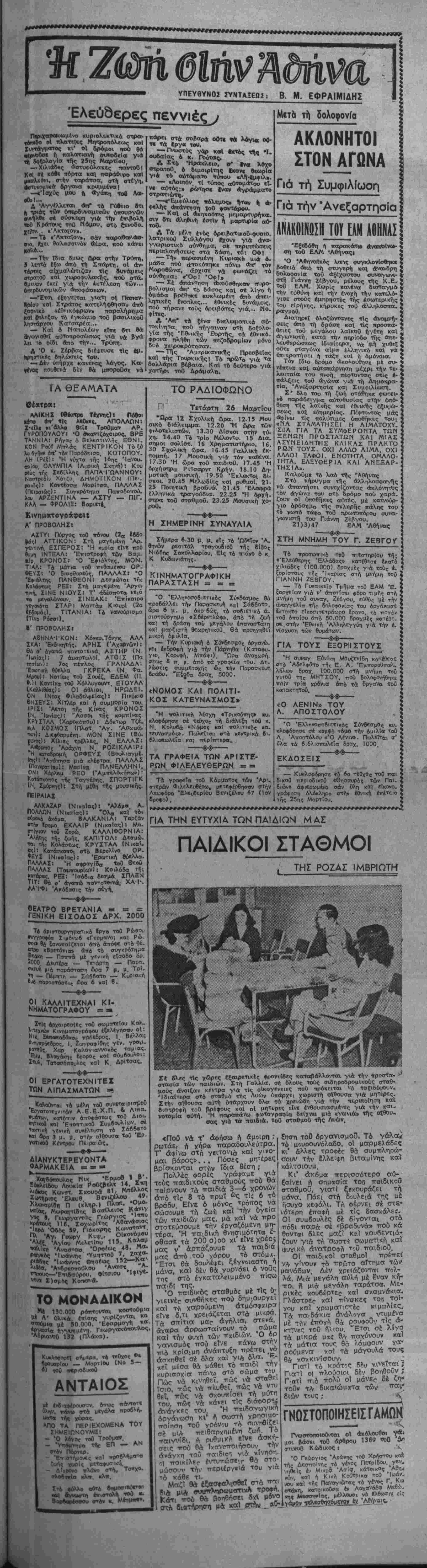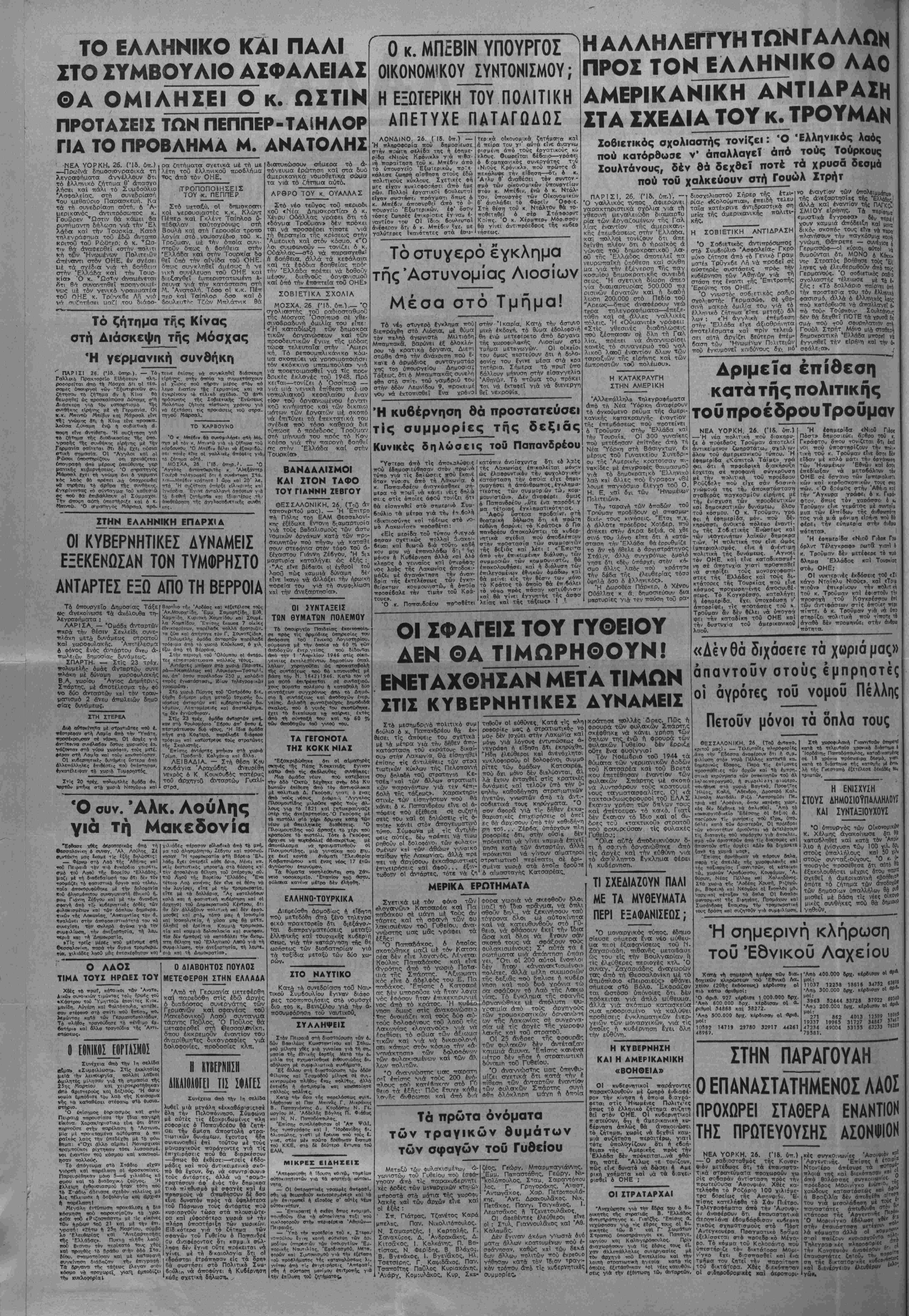 νά συνεχισθεί 6 πόλεμο<; «εναντίον δλων των συμμορίαι*!... Εΐ«ε δμως κσ] ή νέο ούτί) πίθφοση καταδικασμίνη νά κατ—Ισϊι ΓιαΤΐ βθτϊ ή ΝΟΦ ζητεί ,ά άττοσ—σβεϊ ί) «α; νά αύτονομηθεϊ ή Μακεδονία. Τή» άττόσπα— τής Μακεδονίας άττο την Έλλάδα την ζηΤοΰν ιμονβχβ ΟΙ Αι·, τονομιστές ττού όργάνωσαν, όττλίζου» «αί τροφοδοτούν οί Άγγλοι. Γ'4 «4 διοπηροΰν μίαν ίστία άνατσραχής. ΤΟ Υ ΙΤΕΡΑ άπό τα τελευταία άνατρινιαστικα ρνα γημ τα, που καΤέβασαν τ?ιν μ6α Μθ:ς στό έπίπεδο γώ- οας άγρίσς καΐ πού συνετάρη ί έό άό ό έλλς ος γρσς καΐ πο ίαν, έκτός άπό τόν ηνς Λαό, καί την άνθρωπάτητα ό"1 λ κληρη, οί άργηγοΊ τού Δηι,ιο κρατικοΰ Κέντρου απεφάσισαν να υιλήοουν. Είγαν μπροστά τους την ά- νρίο δολοφονίο: ενός άπό τθιχ Γ,ιό έπίλεκτους λαΐκούς ήνί-- τες. Ενός άπό τούς πιό Λ- ννούς, ουνεπεΐς καί θαρραλί. ούς άνωνιστές τοϋ Λαοΰ. Ένό*. άπό τούς εύγρνέστερους πνι.0 μοττυκούς άνθρώπους. Δολοφο νΐα τιού σκηνοθέτησε ή κυδίρ νπση κα| υέ τρόπο τόσο ν ι δαΐο, ττού κα'ι αυτή ή σκηνί "(α νά αποτελεί Μνα άκόαη νωοιστό έΎκλημά της. Εϊγαν άκόμη μπροστά ς την άνρία σφαγή, ικατά τόν ττιό θηριώδη καί καννιβαλικΊ τοόπο, τΐάνω άπό έζηντα άθώ ών δηυοκρατικών πολιτών, οέ διάφορες ττόλεις καΐ κωαοπδ- λεις τής Πελοπονήσου, ανάιιε οσ στούς όποίους καΐ οί 32 κρατούμενοι των φυλακών τοθ Γυθείου. Κ αί είγ,αν μπροστά τους την αναίσγιοντπ κυβερνητική διοοκή ουζπ ότι επρόκειτο τΐεοί <αύίί». οικιαο» ιμοναργικών γωρικών, ττού έζεγέρθηκαν γιοΐτι σκοΤω βηκε σέ σύγκρουση £νας αίικι πταγής κοκοΰργος, ό λογαγός ΚοτΓοαρέας, ττροδότης τοΰ "Ε- Βνους τού, πού κατέσΦαξε τή Λακωνίσ τόν καιρό της κατο νής. υαζΐ μέ τούς Γερμανούς, και ττοο την άποτελείωνρ άνε· »6νλητοςν υετά την «άπελευθέ- ΟΜοη». "Ενας ένκλημ.ατίο:ς έ Τικηρυγ'ΐιένος άπό την κυδέρνη οη καί διωκόιμενος άπ' αυτή. Αατά τα νεγονότα ί Ά τα νεγονότα ίν υττροστά τους οί κ.κ. Άργηγοι |°υ Δηυ.οκρατικοΟ Κέντρου. ,^οί κάθε λογικάς καΐ τίιιιος Ελλην θά έπερίαενε νά στιγ- υατίσουν την κυδέρνηση. Νά ^ΐν κατοοκεραυνώσουν, νά την κηταγνείλουν δηιμόσια, γιατί Η§ ττ|ν πολιτικη της άδηγεΐ την ,Ελλάδα στόν άφανισαό καί νά ιψωσουν την φωνη τους, συνηγο Οο)ντας γιά τούς σφαγιαίοαέ »ους ΐ δέ δ ς φγ διοκσμένους ττολίτες. ώ ί δ.Π'ο.ο ρτικρϋς ττολίτες. . Αντ» αυτών οί κ.κ. Σοφού- "Κ καΐ Τσουδερός, ό ποώτος ^εοισσότερο καΐ ό . δεΰτερος λινοτερο, δρηκαν την εΰκαιοια (ο άιτευθύνουν έτηκρίσεις. εΐδος πείας, πρός την έγκλημαη ^π υαφίη ττοΰ κυδεονδ καί ιαύ οοους ένοτντίον τής Άριστερας, ν,ΙΓΪτΙ κα} αύτη εύθύνεται ν ά ι<* έγκλήματα ποΰ διαπΡΛγΟη κ,ον σποκλειστικά <κα1 μόνον £Κ δάρος δικό της. Καί άκόμη νά καταγγείλουν κ?· οί δύο την Άριστερά ττα- οαταζη σαν άντεθνικιΊ. Όυέν υ Σοφούλης ΎιατΙ έ ^ε οό ΟΕ Γ φλης ΎιατΙ έιΐφθσο οτόν ΟΗΕ. Γιατΐ τταρουσ.α την άληθινη κατάσταση μί στήν ότΓθ'α τταραδέρν?ι ή ίχ Γιατί £.εγύυ.νωσρ τα Ψ&ϋ των λακέδων. Γιατΐ ττοοά- σ? τα ίεοά καΐ ά-αοάγρα οικαιώματα τού ΛαοΟ ιμα:ς την Άνεξαρτησΐα τού ικσϊ Ελευθερία. Ό δέ κ. Τσου 5. Ιΐέ υιά μονοκονδυλΐ'ϊ '«ρις καμμιά ξή! ε 6ττοθίτουμε ποτέ άλλοτε /ίί άνδρες νά έδωσαν τε- [Οιο παράδειγμα άνανδρίας και ;ΛΛειψεω; χά! τοο ττιό στοΐχεΐω- 5°υς αΐοθηματθο πολιτΐκής έντι- καί Φι-νο ύποθέτουμε ποτέ άλλοτε, ί ποΰ διετέλεσαν ττρω- χαΐ πού φΐλθδθξθύν έ"δωσαν τέ- γ, ίοναγ , νά ιο αληθινά άχαραχτηριστο ττα ρειγμα ττο'ιτικης Ιδιοτελείας. 0 άρχηγός των φιλελευβέρων ' ^ τής κοινο6ουλευτ- πγ άντιπολιτεύσεω;, λησμονεϊ 'ο ανίκδιηγητο μαρτύριο τού δή "5<ρατικοο λαοΰ έττί ένάμιση έ 0^ Βά κ?' ά τή 