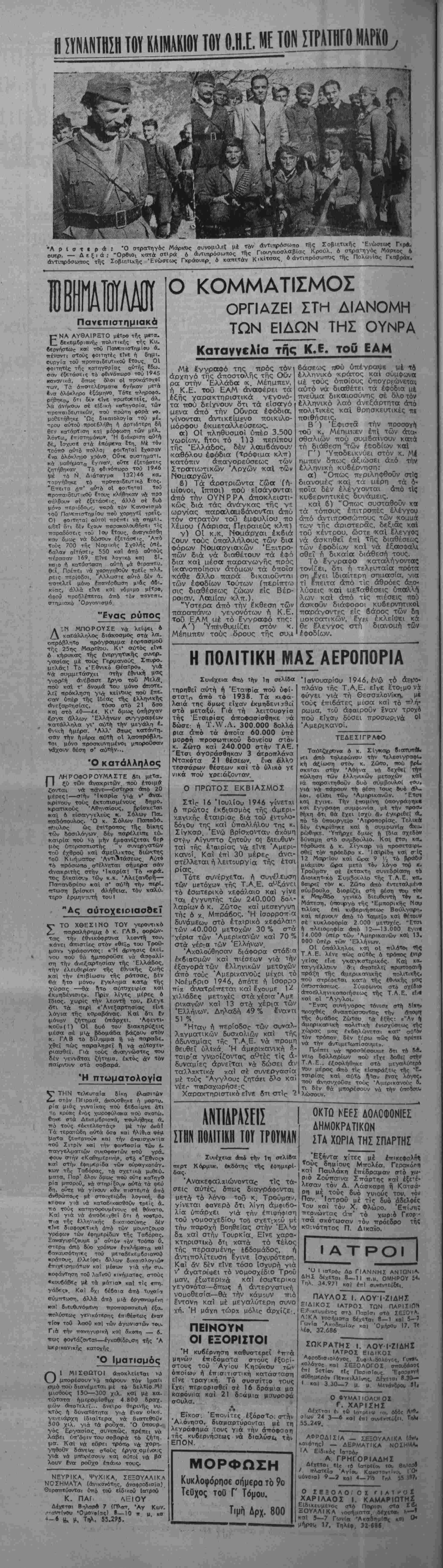 ΟΙ ύπάλληλοι και οί ιτιλΑΤθι ττ1< Τ Α Ε. λένε ττώς αΰτός 6 τρό—ς ίντρ γείας είνε γκαγκστερΐκός. Καΐ κ"- ταγγέλλουν σ ι αποτελεί ττρωαοφσνή πράξη της άμερικοτνικης πολιτικάς, ττού στρέ<(Ηεται κοττά τής έβνΐκής μ«ς ύτκιστάστως. Σύμφωνοι στ* υχέδιο Λΐτοελληνικοΐτοιήσεως τής Τ Α Ε. εΐν· καΐ οί "Αγγλοι. "Ενας συνήγορος τόνισΐ στή τΐοοχθίς αναπτύσ3«ντας την τής ομάδος Ζώτου Τα εξής: «"Αν τί Αμερικανική ττολιτική ίνισχύσρως της; χώρας μας ίκ&ηλώνετσι κατ' σύΐΐ» τδν τρόττον. δέν ξέρω πώς θα πρέτΐΕΙ νά τή-ν άντιμετχοητίσουμε». Πρίπτι ν* ■—οσθέσοοιΐϊ βπ τδ β<*-· νριο δολλοτρίων πού εΐχε βοθεί στήν ΤΑΕ. ίξοφληθΓ,κε στό μεγαλύτερ* ΐϊιυ μέρος ά»τό τίς εΐστίραξεΐς τής 'Ε- ταιρίας καΐ αύτό ήΐαν ?νοτς λογος, τού ανησυχοϋσε τους 'Αμερικανούς β- τι δέν θά μπορέσουν νά τήν οποίον, λωσουν. ΑΝΤ1ΑΡΑΣΙΪΙΣ ΣΤΗΝ ΠΟΑΙΤΙΚΗ ΤΟΥ ΤΡΟΤΜΑΝ Συνίχεκχ ατΐο την 1η σελΐβα περτ Κ6ρμικ, έκδότης τής ίφη,μερί¬ δας. Άνακεφαλαΐώνονταο τίς τά· σεΐς αύτές, δπως διαγ·ράφονται μετΑ τό λόγο τοΰ κ. Τροΰμα,', γ!νεται_ φανερό δτι λίγη άμφΐβο- λία ύπάρχει γιά την έπιψήφΐση τού νθμοσχεδίθυ τοο σχετ,χι.0 μ την παροχή βοηθείας στήν 'Ελ^ δα καΐ στήν Τουρκία. Είνε χαρα κτηριστΐκό δτί κατά τό τέλο< τής περασμένηο εβδομάδος, ι άντιΤΓθλίτευση Ιγινε Ισχυρότερη Καΐ δν δέν είνε τόσο Ισχυρή γιά ν' άνατρΐφει τό νομοσχέδιο Τροΰ μσν, έξωτερΐνά καΐ έσωτερικα γεγονότα—δπως ή άντεργοτηκγ', νθμοθεσία—θά την κάμουν πιό έ'ντονη κα) ιαέ μεγαλύτερη σννο χή. Ή μάχη χώρχ μόλιε άρχίζε· ΟΚΤΟ ΝΕΕΣ ΔΟΛΟΦΟΝΙΕΣ ΔΗΜΟΚΡΑΤΙΚΟΝ ΣΤΑ ΧΟΡΙΑ ΤΗΣ ΣΠΑΡΤΗΣ ΠΕΙΝΟΥΝ ΟΙ ΕΞΟΡΙΧΤΟΙ 'Η κυβέρνηση καθυστερεϊ *πτά μηνών έπιεομαΤα στοϋς έξορ!· στους τοθ Αγίου Κηούκου των οποίων ή έττ·σ τιστική κατάσΓαση είνε τραγκή Τό συσσίτιο τους Εχει ττεριορΐσθεϊ σέ 16 δράμια μα καρόνιΐα καΐ 21 δ^άμια μσυρο(>ά