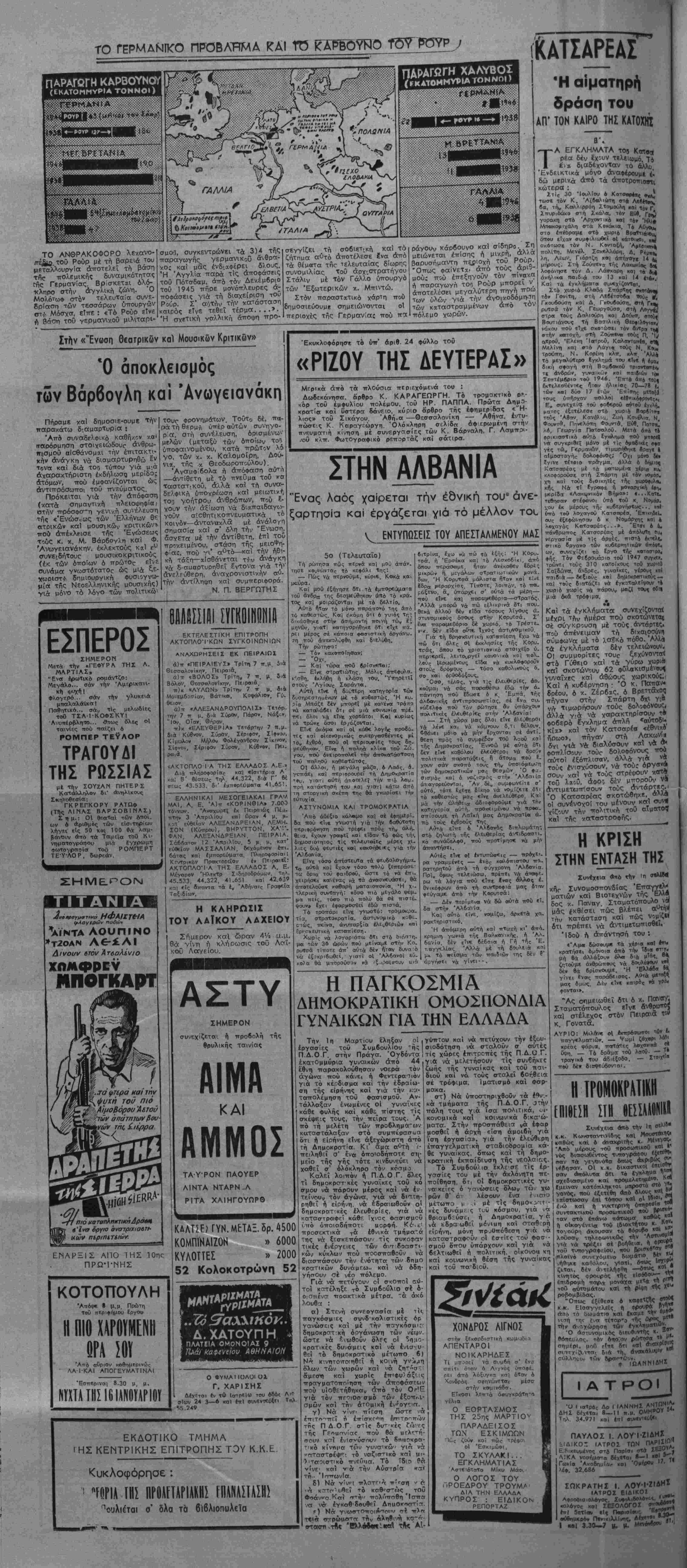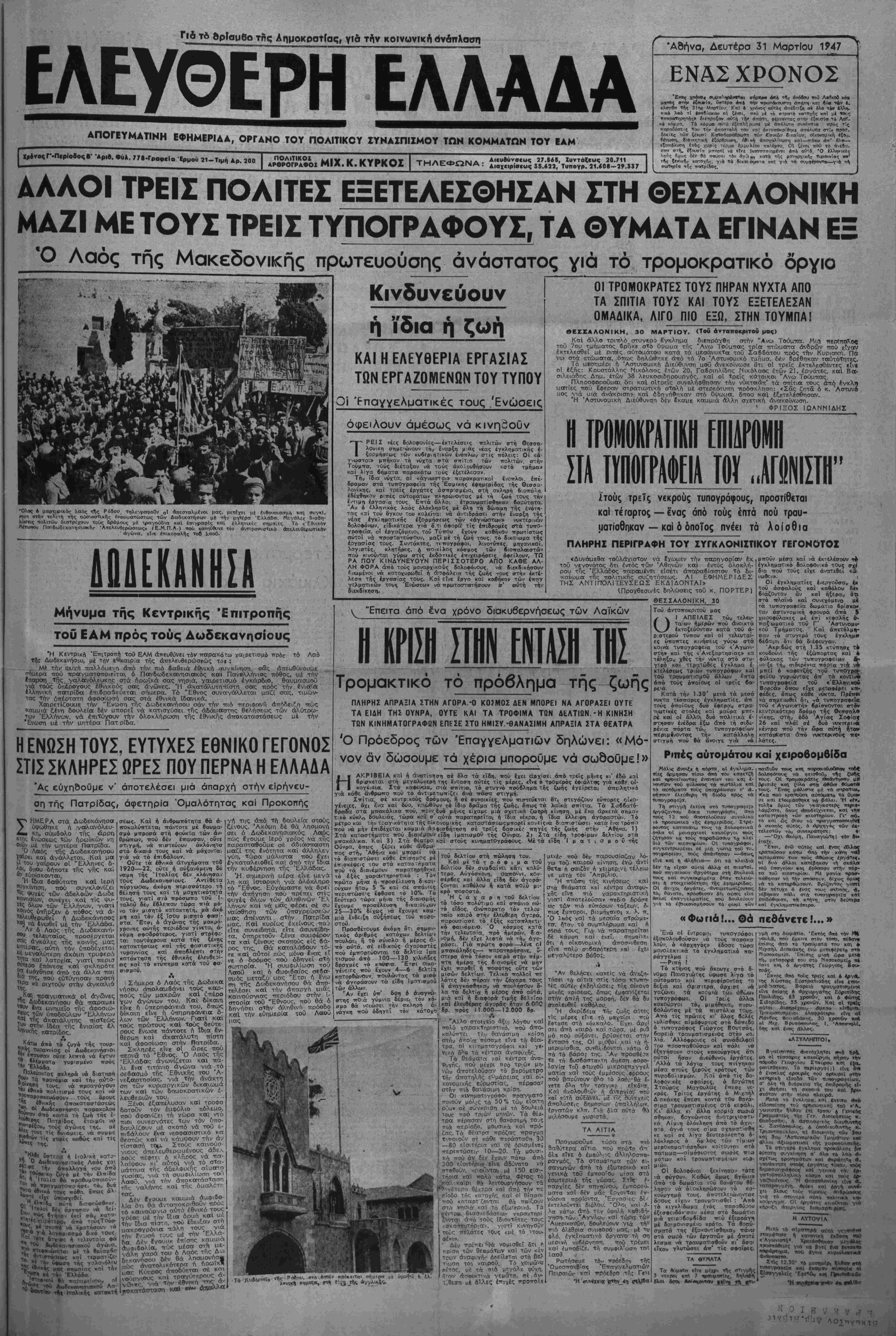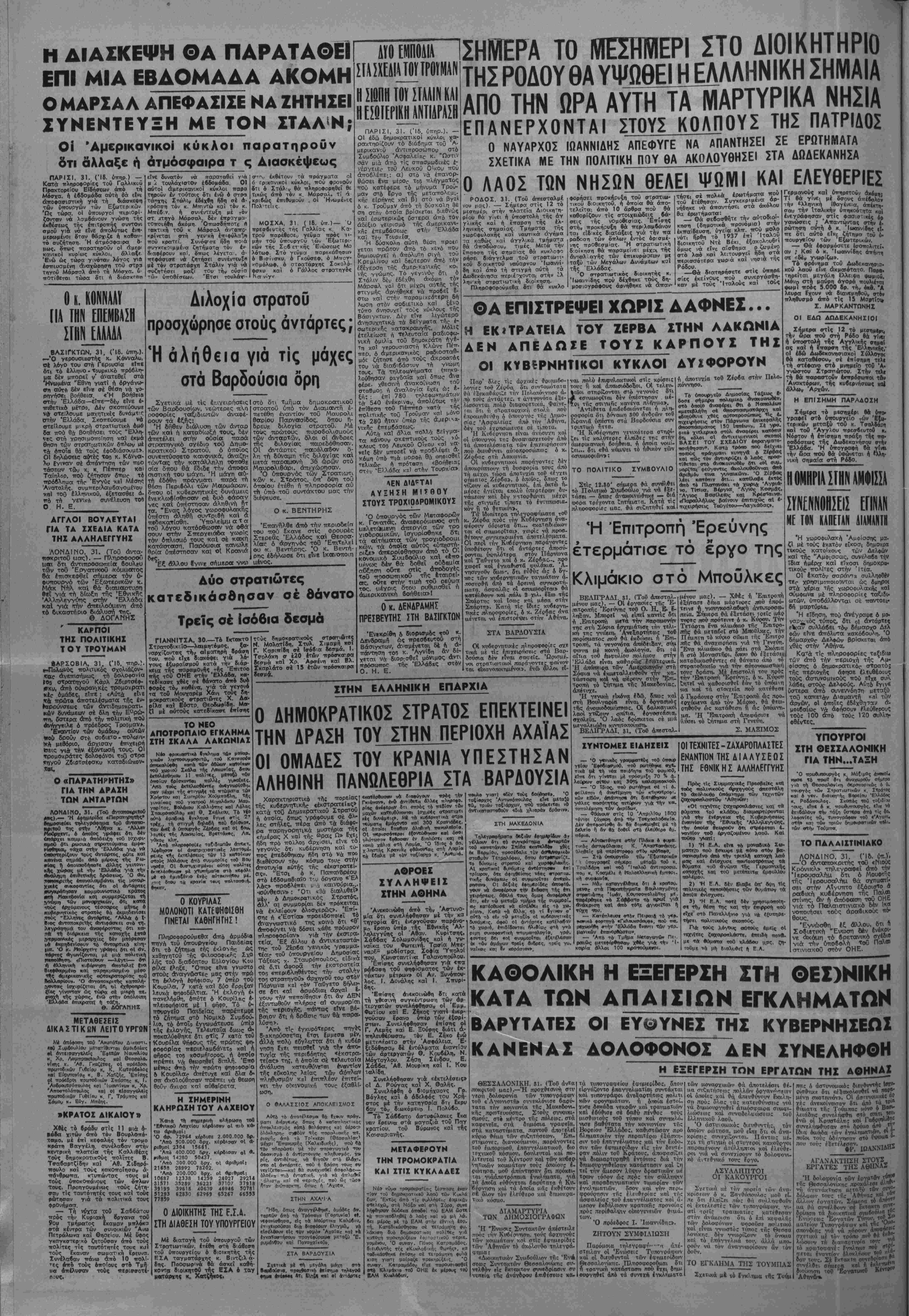 Ις στήν έξβυ»Ι«, ΰστιρα 4ιτ& την "ωτ<ίκουσ— &ηάη κσ) βίβ τΑν Ι. κλογ&ν τήζ 31η« ΜαρτΙου, Κβΐ β χρόνος βύτβ? άπί6<-ξζ <τέ ίλβ τ*» «Λλη. νικβ λ»4 τί ίττϊδίΐΛιον οί ξένοι, ττβύ μέ τ4 στρατό κβτοχης κοΐ μΐ τοις «—ρβτηρητας» διέπραξαν οντή τί|ν άπάτη, φέρνοντας στην Ιξουσία τ4 Λ*ί. κβ κάμμα. Τβ κόμμα αύτό εξεπλήρωσε, μί *ΐτΑλι/τη οννέττϊια πρός τίς πϊθαδόσϊις Τού την αποστόλη τού κκί άντ—οκοίθηκι άπολι/τα βτ]<; "«?. δοκιίς των ξίνων: Κοτταδαράβρωσι των {"νίκων βικβίων, οΐκονομική »{»υ- ίένωβη, βιοικητική ίξάρθρω—, ήβι κή άποχαλίνωση καΐ—ττάνω άπ' ίλ«— έξ—6λι—ι ενός χωρίς τιρμα έμψυλΐου πολέμου. ΟΙ ξένοι τνθύ τ6 Ανιία- σ«ν στ, ίξουσ!ο μιτορίϊ νά ιΤνί (κοινβττοιημίνοι Αττβ βντ*. Ό ελληνικ4ς λοός ίμως δέν βά ιταλίΕΐ τβν άγ.')*, κοηά τής μοναρχικ(Ε ΤυρβννΙας »·' τής ί«νικήΓ κατθχίκ, γιά τα δικϊΐ ς»μβτα καΐ γιά τβ συμφέρον»*—για τη σωΤηρ'α τής πατρίδος. [ ΛΛΛΟΙ ΤΡΕΙΣ ΠΟΛΙΤΕΣ ΕΞΕΤΕΛΕΣΘΗΣΑΝ ΣΤΗ ΘΕΣΣΑΛΟΝΙΚΗ ΜΑΖΙ ΜΕ ΤΟΥΣ ΤΡΕΙΣ ΤΥΠΟΓΡΑΦΟΥΣ, ΤΑ ΘΥΜΔΤΔ ΕΓΙΝΑΝ ΕΞ Ό Λαός τής Μακεδονικής πρωτευούσης άνάστατος γιά τό τρομοκρατικό δργιο "Ολος 6 μαρτΛ*ικ6ς λαί,ς τής Ρόδου τηλεγραφοϋν 01 απεσταλμίνοι μας, μετέχη μέ ίνβουσιασμί, και συγκΐ. »ηοη στην τελετή τής ούσΐοστικής ένσωματώσεως των Δωδεκανήσων με την μητέρα "ΕλλΛδα. Μεγάλες διαδη- λώσιις πολιτών διατρέχουν τοθς δρόμους μέ τρσγούδια καΐ έπιγραφές καί έλληνικές σημαιες Τό «"ΕβΛκόν Μέτωπον ΠθΓΛϊωδΓκανησιοχίΐΓ Απελευθερώσεως» ίΕ.Μ Π.Α ) πού κοτηύβυνε τόν άνπφσοιστικό άπελευθερωτικόν άγώνα, Εΐνϊ ΐπικεφαλής ΤοΟ λ«ο0. ΑΡΑΕΚΑΝΗΣΑ Μήνυμα της Κεντρικάς Έπιτροπής τού ΕΑΜ πρός τούς Λωδεκανησίους Ή Κεντρΐκη Έπιτροπή τοθ ΕΑΜ άπευθύνει τ6ν παρακάτω χα;ρετισμό ττροο τ6 Λαό Τή: Δωδεκζντΐσ&υ, μέ την εταιρίαι της απελευθερώσεως το« : Μί την Ψυγή παλλόιαενη «±πό την πιό δαθειά έθνικιΊ αυγκίντιση, σας άπευθύνουαε . πΐΐαερα ττού πρανματοττοιεΐται ό ΠοτνδωδεκθΛ^ισιοβκός χαΐ Πσνβλλήνιος πόθος, μ.έ την ϊπαροτη, ·τής_ γαλοονόλευκης στά ήρωΐκά οας ντχσιά, ναιρετισμά έγκάρδιο, θαυμασίΐοϋ γιά τούς ύπέρογους έθνικούς σσς άγώνες. Ή άκατάιλυτηιτίστη σας πρός την ένιαίά έλληνική παττρίδα έπιδραδεύεται σή,ιαερα. Τό "Εθνος συνοΐγάλλετοΐι ααζΐ σας, τιμών- τας την οπέοτοττη άφοσίωσή σας στά έ&νικά Ιδανικό:. Χαιρετίζουμε τΛν "Ενΐ3ση τής Δωδεκανήσου σάν την ττιό ττΕριφοτνή άπόδειζη ττώς 'καυ.μιά ξένη δουλεία δέν ιΐπορεΐ νά κτχτισγύσει της άδάμαστης θελήσεως των άλύτρω- των 'Ελλήνων, νά έπιτΰγουν την άλοκλήρωση της έθνικης άποκαταστάσεως ιαέ την Ένωση μέ την μητέρα Πατρίδα. Η ΕΝΩΣΗ ΤΟΥΣ, ΕΥΤΥΧΕΣ ΕΘΝΙΚΟ ΓΕΓΟΝΟΣ ΣΤΙΣΣΚΛΗΡΕΣ ΟΡΕΣΠΟΥΠΕΡΝΑ Η ΕΛΛΑΔΑ "Ας εύχηβοΰμε ν' άποτελέσει μιά απαρχή οτήν εΐρήνευ- ση τής ΠατρΙδας, άφετηρία Όμαλότητας καί Προκοπής ΣΗΜΕΡΑ στά ΔωδΘκάνπσσ ύψωθηικε ή [γοβλανόλευ- κη, σύμδολο τής ώρρη κτης ενώσεως τά>ν ήρωΐ'κών νη