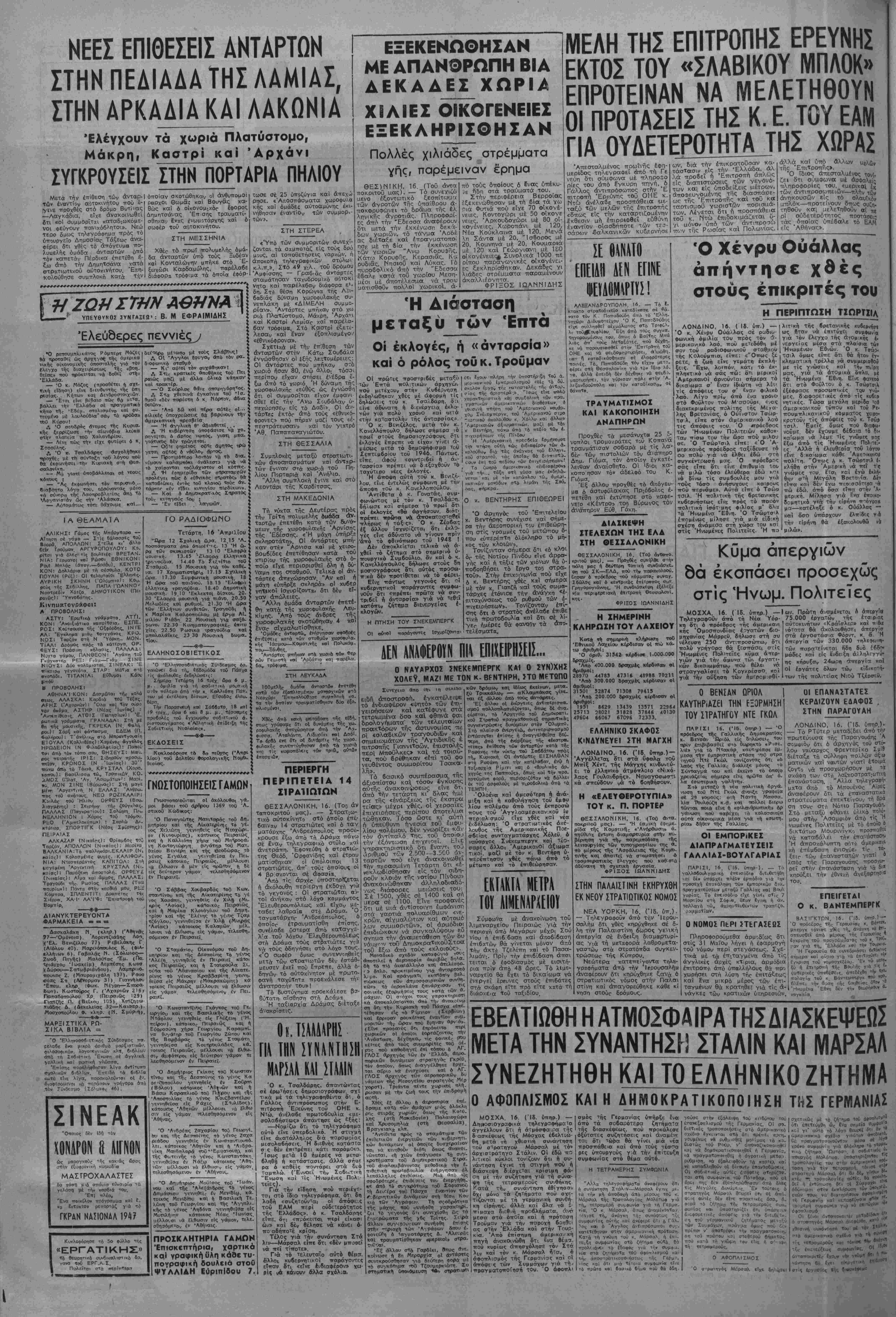 λβστιχοϋ πνεύμ—ος «ού έπικρ<χ«ϊ σέ δλον τον ίργαζόμε^ κοσμβ—· δέν μπορεϊ νβ Εχει ίλλο Λποτίλεσμσ ,—ρβ ΤΗΜ ΕΝΤΛΣΗ ΤΉΓ Λ. ΝΛΤΛΡΛΧΗΣ ΚΑΙ ΤΗΣ ΑΝΟΜΑΛΙΑΣ 'ΑΝΤΙΔΡΑΣΤΙΚΟΣ τύ- πος βρηκε τροφή νιά νά ν^/ έξαπολύσει καινούρνιο ,κΰαα, συκοφοτντικης έπιθίσεως εναντίον των προοοευτικών ου νάαεων της χώρας κσΐ ίδισίτΓ ρα τοθ λαΐκοδηιμακρατικοΰ χι- νιϊιΐατος. Τροφοδότης 6 κ. Τσώρ τσιλ 'Καί κάποιος κ. Τσάκαλς, άπεσταλμένος τοϋ «Άσοοιέ'ιτετ Πρές». Φυσικά, αυτή ή Τροφοδότη—. Τίτον ττάρα ττολύ εύττρό'σδεκττ', νισπΐ, έκτός άττό τό τίεριεγόμε ϊΐό ττκ, ήλθε Ακριβώς στήν ώ- ιρα τιού την γρειάζονταν οί άν τιδοαστικοί. "Η ττεριττλοκή τοϋ ίσωτερι- ικοΰ π,ροβλήματος φθάνρ,ι τώρσ τό όζύτερό της σημεΐο. Ό πό λεμος ττού έξαπέλυσε εναντίον τού Δημοκροττικοϋ Στρατοΰ. »άν Βστατη προσπαθεία γιά νά συνΤρίψοον την αντισταθή τού Λαοϋ, δέν άττέδωσε, ϊως τώρα. τίηοτε τό άξιόλογο, Υστρ,ρα άπό τίς άναρίθμητες Ικκαθαριστικές έπιγειρήσε ι ς ιτού ίγουν κάμρι, (ίνα τώρσ γρό νο, ή τελΕυταία μεγάλη έξόρ- Ιΐηση, ιαέ συνδυασμένη ενεργεια στρατοΰ, στ6λου, άεροπορίας. γωροφυλακης καΐ των ένόττλων ΐιοναργικών, άπόμεινε τί οστα- τη έλπίδα νιά νά καμφθεΐ ή λαΐκή αντισταθή. Είνε, λοιπόν, ττολο φυσικό νά βρίσκουνται σέ άληθινή άττόγνωση κοΐ άγωνία, ένόσω βλέπουν, ότι τιερνοΰν οί μέρες — σήμερα συιιττληρώθη- «αν όκτώ μέρρς άφ' δτου άρ γισβ ή γενική έπίβεση καΐ ό «έγκλωβισυ.ός>—>καΙ ούσιαστι