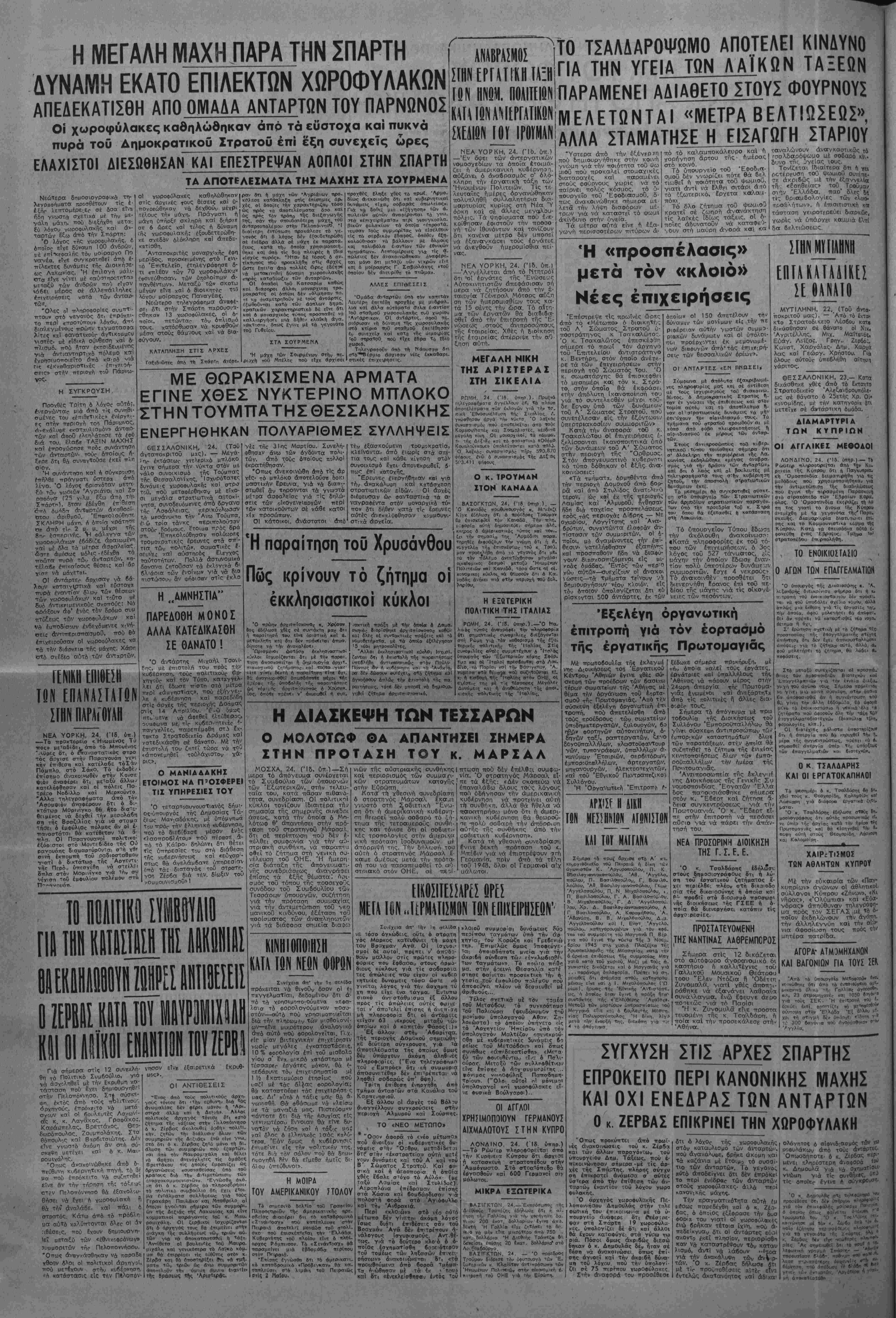 ΧΡ. Τή σΤιγμή δι» ίπτάη<ει ί'ιδητη Υ* τί 300 δαγόνια ποϋ Αγθράσβηκσ» V" ΣΥΓΧΥΣΗ ΣΤΙΣ ΑΡΧΕΣ ΣΠΑΡΤΗΣ ΕΠΡΟΚΕΙΤΟ ΠΕΡΙ ΚΑΝΟΝΙΚΗΣ ΜΑΧΗΣ ΚΑΙΟΧΙΕΝΕΑΡΑΣ ΤΩΝ ΑΝΤΑΡΤΩΝ Ο κ. ΖΕΡΒΑΣ ΕΠΙΚΡΙΝΕΙ ΤΗΝ ΧΩΡΟΦΥΛΑΚΗ % "Οττιος προκυπτει άττό πρωϊ- νές άνακθινώσεις τοΰ κ. Ζέρδα καί των όίλλων παράγοντος τοΰ ύπουργείου Δημ. Τάξεως, ποΰ έ- πεκοινώνηο-βν σήμερα ·μέ τίς άρ¬ χές τής Σπάρτης, πλήρης σύγχυ ση έπικρατεΐ άνάμεσα σ αύτές ίίστερβ οπό Την έπίθεση των άν- ταρτών εναντίον τοΰ λόχου γωρο Φυλαχής. Ό άρχηγός χωροφυλακής Πε- λοποννήσου Δημθυλάς στην τηλε ΦωίΊκήτου έπικοΐνωνία μέ τό 6- ποκργεΐρ άνάφερε δτι έττέσιηε- ψαν στή Σπάρτη 19 χωροφύλα¬ κες, ύπολογίζει δέ δτ, κσι άλλοι θά έ'χουν καταφύγε: στά γύρω γ« ριά. Πόσοι δμως ακριβώς διεσώ 6ηκαν ό κ. Δημθυλάς δέν ήταν σέ θέση νά άνακοινώσει. όπως έπί¬ σης άγνοεΐ καΐ την άκριβή δΰνσ- μη τοϋ λόχου. πού την ύπολογί- ζει σέ 75 περΗτου χωρθφύλακες. Σί άνσφορά τοκ προσέθεσε δτι ό λόχθΓ τής χωροφυλακήν στον καταιιλισμό των άντσρτών· ττού άνακάλΐΛΐιε, βρήκε άκόμη καί τα καζάνια μέ Ετοιμο τό συσοί- τιο των άνταρτών. Τό γεγθνος αότό άττοδείχνει δτι δέν έττρόκεΐ το περΐ ένέδραο των άνταρτών οτοΰς χωροφύλακες. άλλσ ττε.?ΐ κανον,,κής μάχης. Τήν ττρσγματΐκόΤητα αυτή ίμ μίθως παρεδέχθη κα! ό κ. Ζέό- 6ας. ό οποίος εξέφρασε την δι>σ