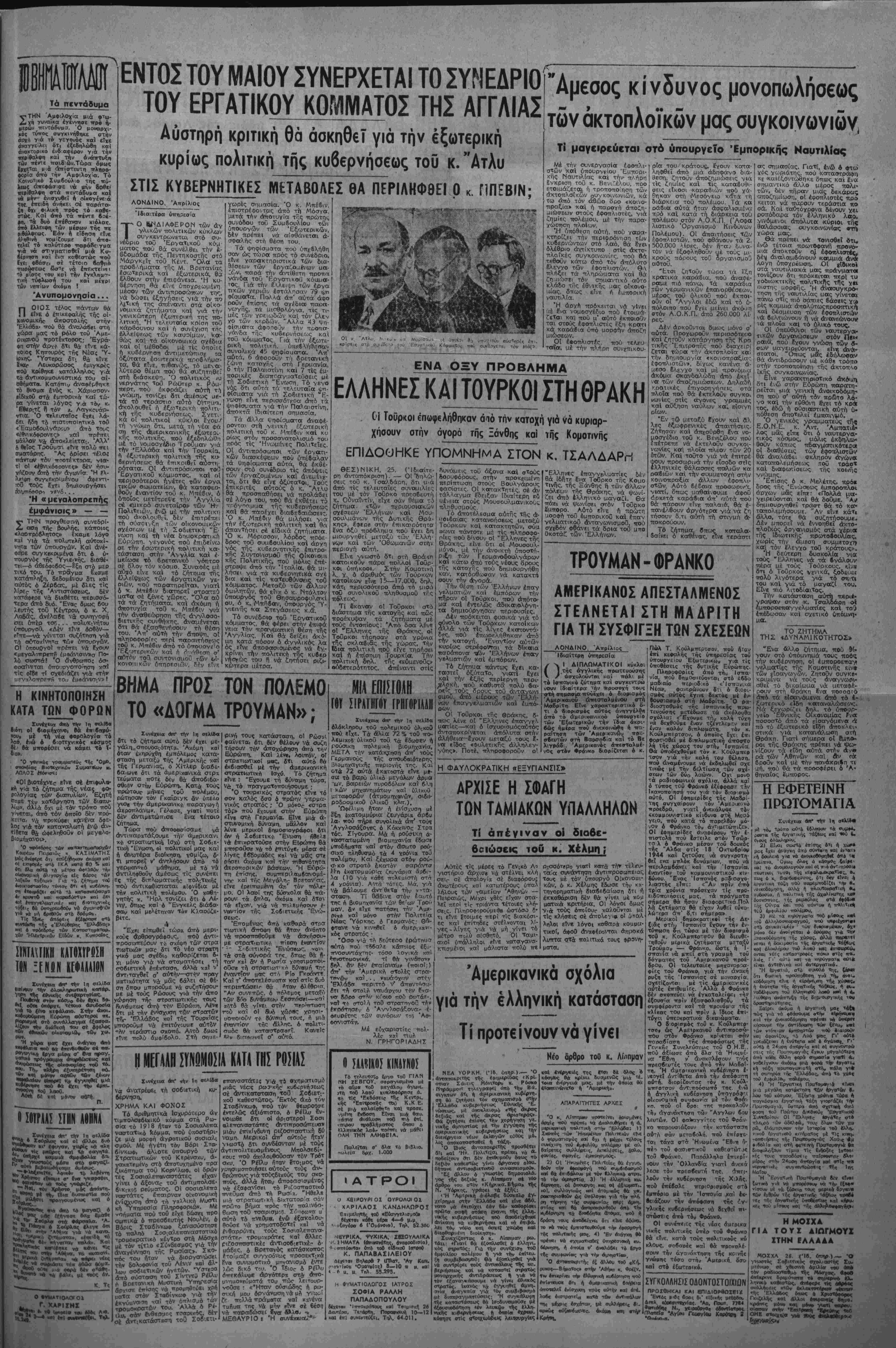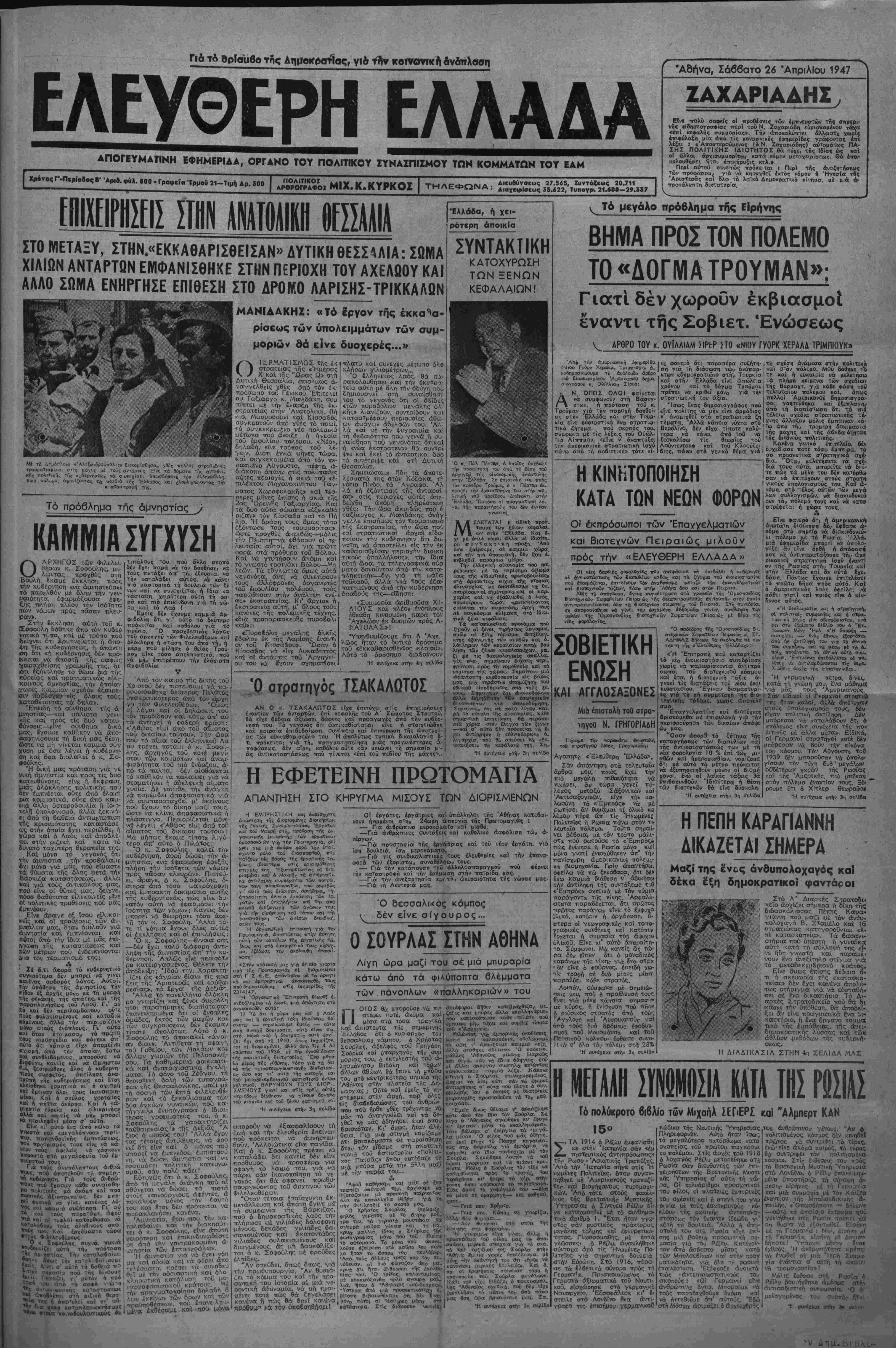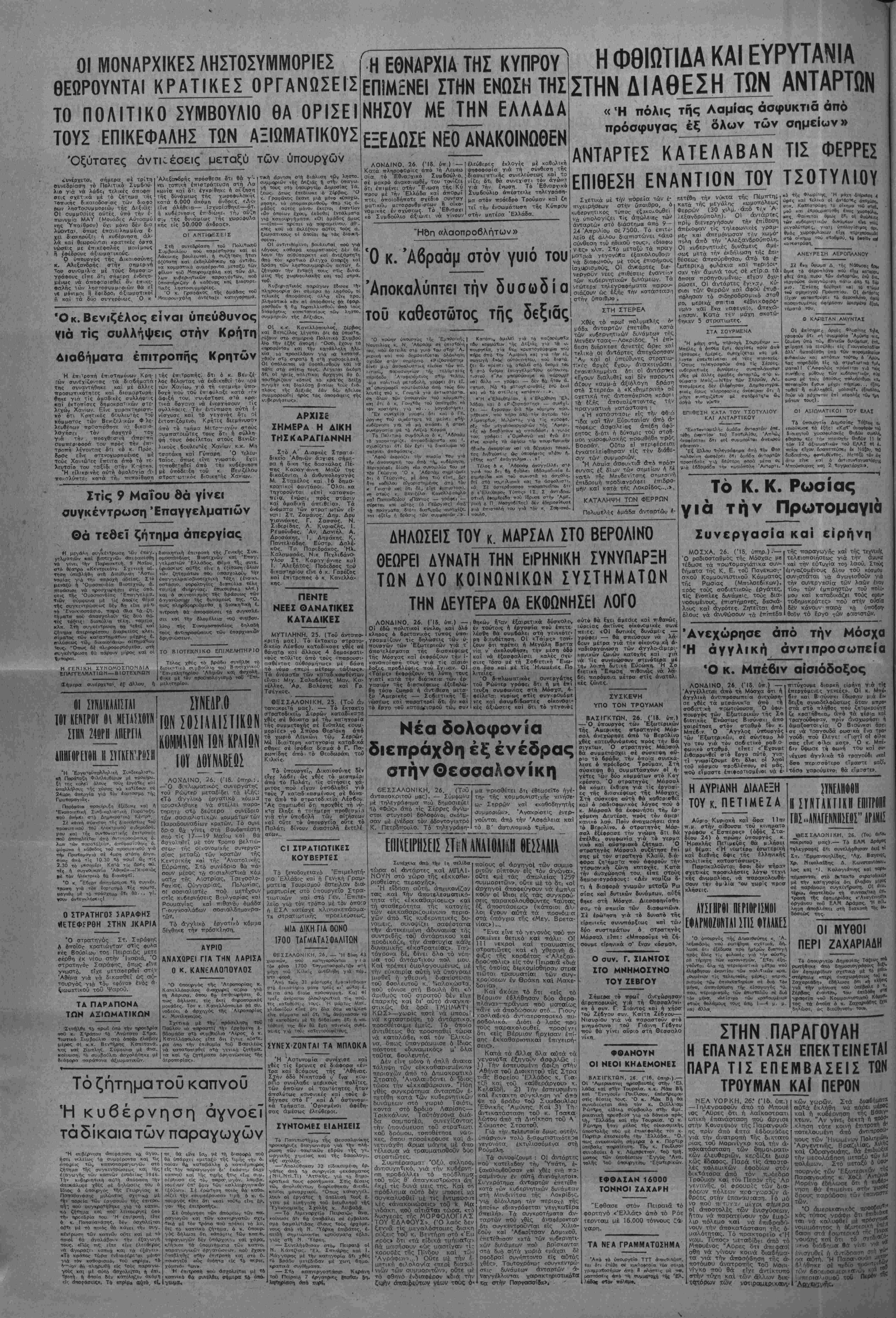 ΤΗΛΕΦΏΝΑ; Αιαχειρίοεως 35.<22, Τυπογρ). 21.<0σ-2».»»7 | 'Α8ήνα, Σά66ατο 26 Απριλίου 1947 ΖΑΧΑΡΙΑΔΗΣ ^ ΈΧ-Μ ττθλυ σαφεΐς οί νροθίσεις των έμ—νευοτΔν τη1» σημερι¬ νήν (Ιοησεογραφίας περΐ τοθ Ν. Ζαχαριαδη ευρισκόμενοι/ τάγα «έττΐ κεφαλής συμμορίας». Την άποκαλύτττει αλλωσΤβ χωρις έτη·υλαξηΐ μϊα Από τίς μονσονκές έφηιιερίδες γράφθντας επί λέξει ι «Άττοο-τερούμενος (4 Ν. Ζαχαριάδης) αυτομάτως ΠΑ¬ ΣΗΣ ΠΟΛΙΤΙΚΗΣ ΙΔΙΟΤΗΤΟΣ 6α τύχε, της Ιδίας ώς καΐ οί άλλαι άρχισυμμορΐται κατά νόμον μεταχειρϊσεως. ©ά είτα- κολονβτίσει ήτοι, έτπκήρυξις; κτλ.» ΠιρΙ βώτοΰ συνεπώς — ροκεται Ι ΠερΙ Της άναζτττήοιως των πρβφάσεω» γιά νοι κηουχβεϊ έκτος νόμου Α Ήγεσίβ τίς ΑρισΤεράς και δλο τό λαικό Δημοκρατΐκό κίνημβ, ηΐ μιά ά- προκάλυτττη δικτατορίβ. ΜΑΝΙΑΛΚΗΙ: «Τό έργον της εκκαθα¬ ρίσεως των ύπολειμμάτων των συμ- μοριών θά είνε δυοχερές...» Μι τ4 άτμόττλο,ο «ΆλΓξανβρούιτολιςΛ $ιεκομ(σβησαν χ5ές πολλαί στροΓ,ώτε; τραυμαΤισμενο, στις μαχΐς με τούς αντάρτίς Είνε τα θυματα τής άντιθνι. κης πολιΤικής τής κυβερνήσεως νά σ ι/νεχίσει όττωσδή—τι τον έλληνοελλη. νικό ττολεμο, άψίχνΐζοντας τα τταιδιά τής Ελλάδος καΐ ολοκλι^ρώΛντος την κ «τ/τ«7 τρσφή της. Τό ττρό6λημα τής άμνηστίας ) κΗασϊγχυση ο ΑΡΧΗΓΟΣ των Φιλελευ θέρων κ. Σοφούλης, μι· λώντας προνθές στΠ ΙΒουλή, έκαμε έκκληση τιοός χήν κυδέρνηση «να άμνηστεύσεΐ ΐτό παρελθόν/ μέ όλην την γεν- υαιότητα, εφαρμόζουσα εφε¬ ξής -πλήρη πλέον την Ισότητα των νάμων πρός πάσαν τιλευ- ράν». Στήν Ικκλτ>ση αυτή τού κ.