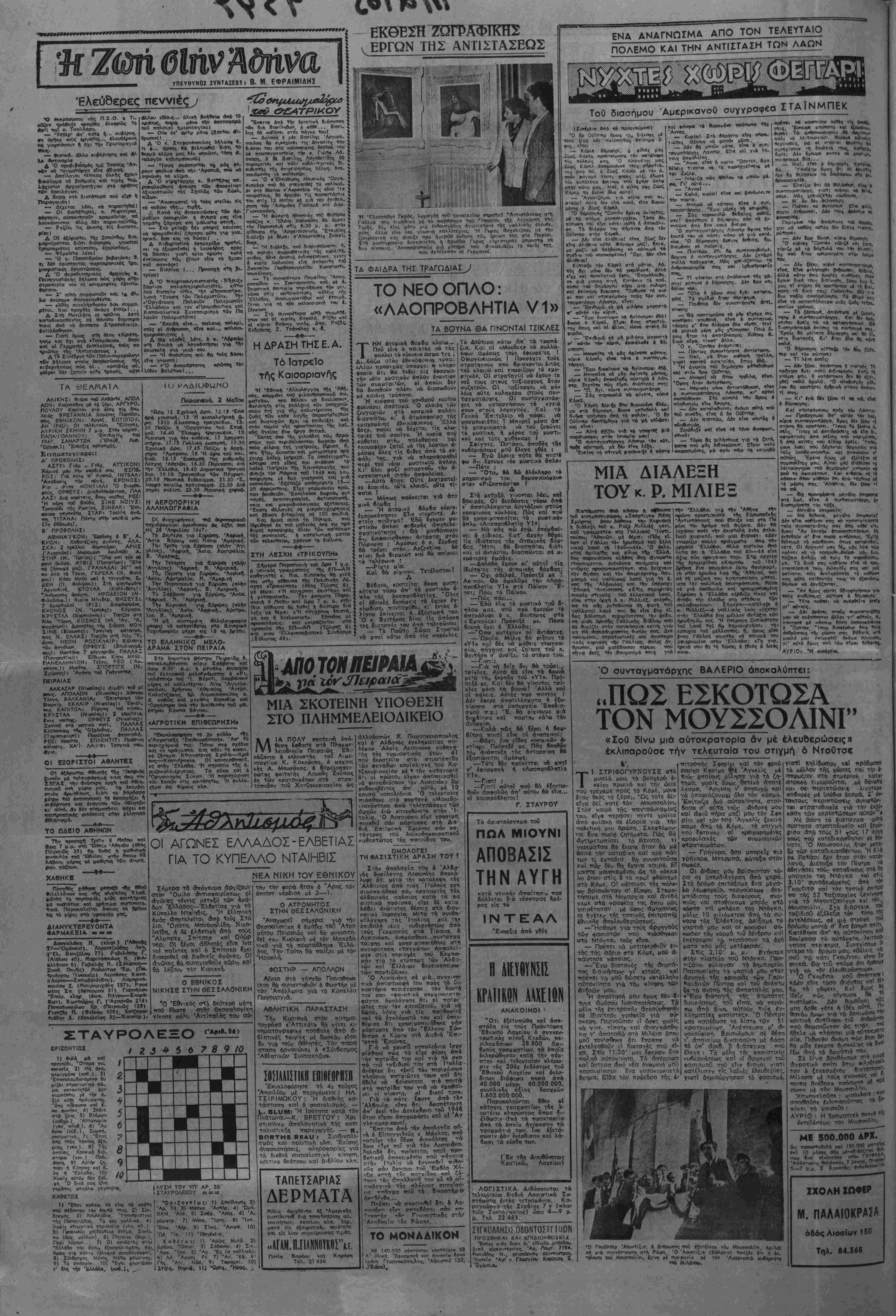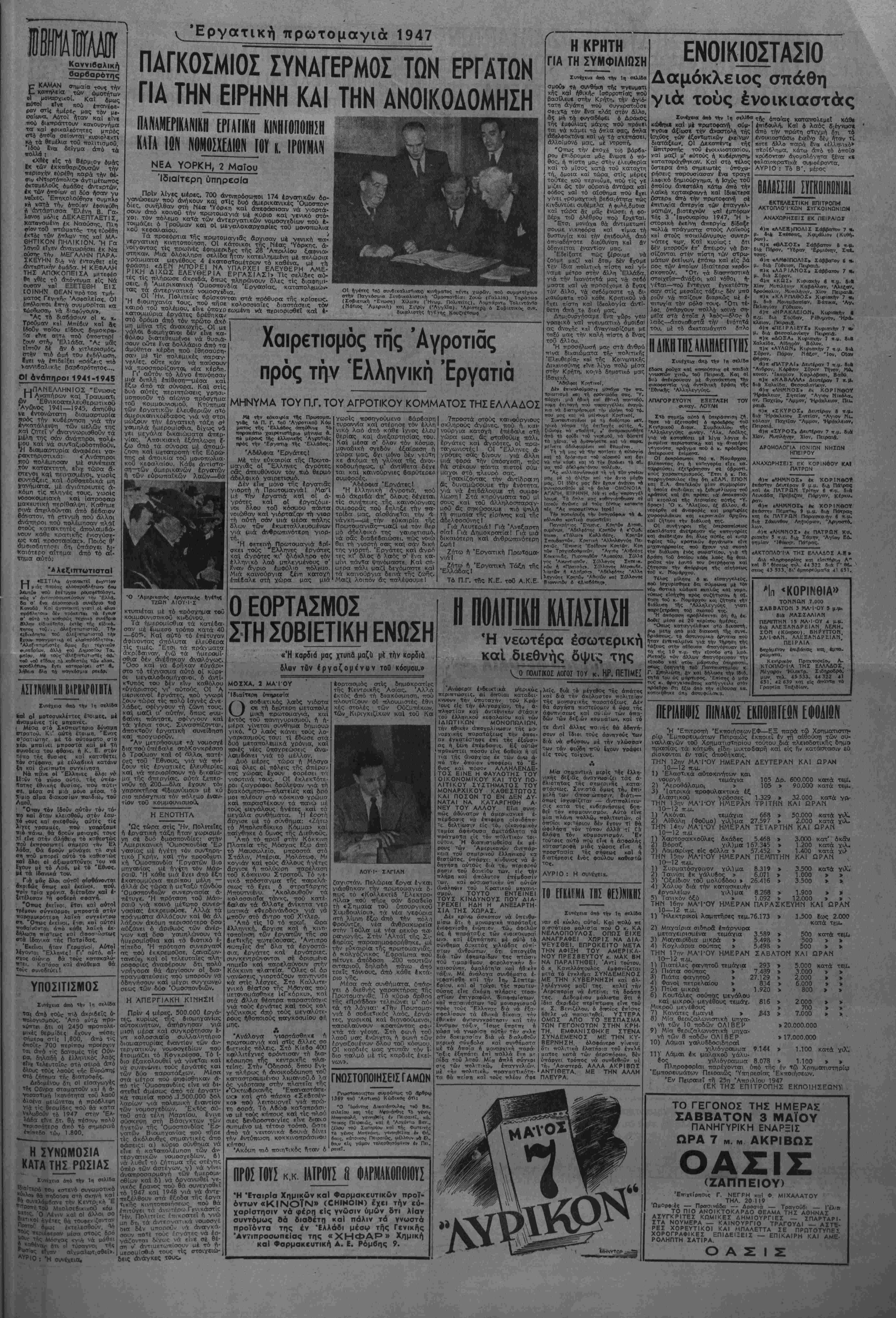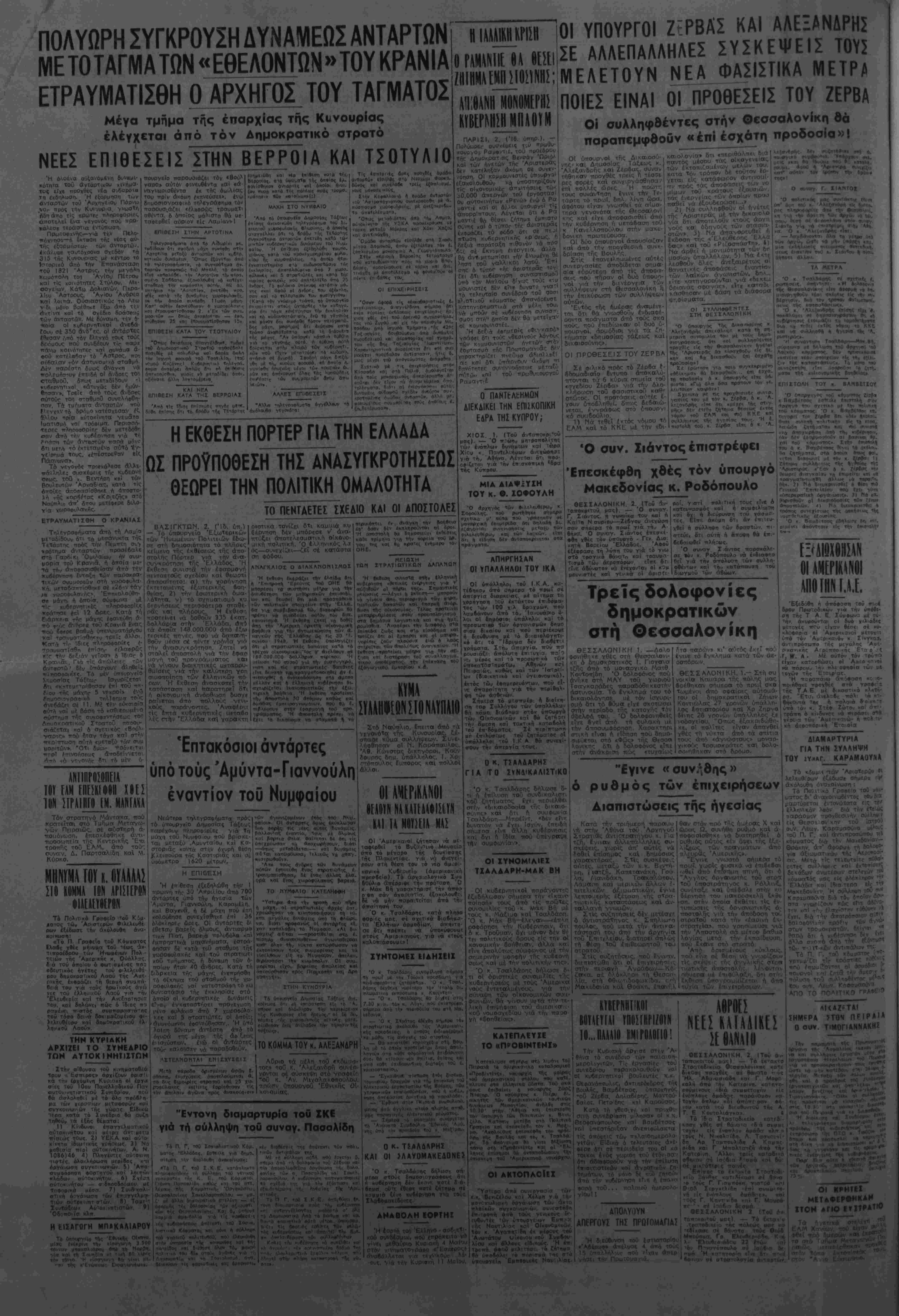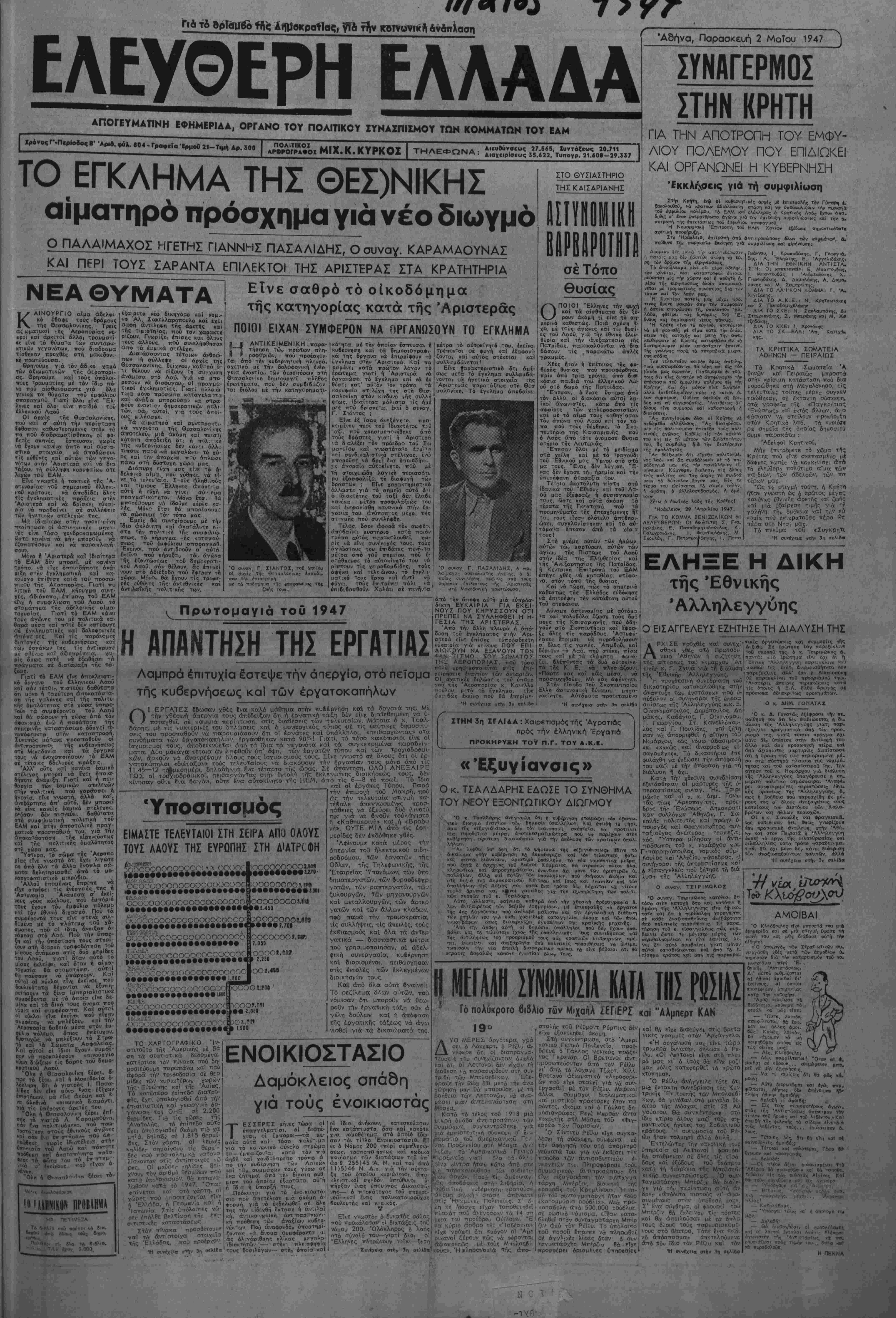 Γιο το βρΤβαβο ΐη<» ΑΐίαοκροτΤας, γΤσ -την Κδϊνίίνΐκη ανσπλαση ΕΛΕΥΘΕΡΗ ΕΛΛΑΑΑ ΑΠΟΓΕΥΜΑΤΙΝΗ ΕΦΗΜΕΡΙΔΑ, ΟΡΓΑΝΟ ΤΟΥ ΠΟΛΙΤΙΚΟΥ ΣΥΝΑΣΠΙΣΜΟΥ ΤΩΝ ΚΟΜΜΑΤΩΝ ΤΟΥ ΕΔΜ 'Αδήνα, Παρασκευή 2 ΜρΤου 1947 Ι Χρόνος Γ·.Π«ρΐ88ος Β' Άρ,ο. »ύλ. 604 - Γραφεϊα 'ΕρμοΟ 21- Τιμή Δρ. 300 αΛΟρο?Ϊ2ο« ΜΙΧ.Κ. ΚΥΡΚΟΙ ΤΟ ΕΓΚΛΗΜΑ ΤΗΣ ΘΕΣ)ΝΙΚΗΣ αίματηρό πρόσχημα γιά νέο διωγμό Ο ΠΑΛΑΙΜΑΧΟΣ ΗΓΕΤΗΣ ΓΙΑΝΝΗΣ ΠΑΣΑΛΙΔΗΣ, Ο συναγ. ΚΑΡΑΜΑΟΥΝΑΣ ΚΑΙ ΠΕΡΙ ΤΟΥΣ ΣΑΡΑΝΤΑ ΕΠΙΛΕΚΤΟΙ ΤΗΣ ΑΡΙΣΤΕΡΑΣ ΣΤΑ ΚΡΑΤΗΤΗΡΙΑ Αιευθύναε«ς 27.5«5, Συντόμως 20.711 ΑιαχβιρΙβεως 35.622, Τυπογρ. 21.601-29.337 ΝΕΑΟΥΜΑΤΑ Κ ΑΙΝΟΥΡΓΙΟ αΐμα άδελ»ι κό έ'βαψε τοΰς δρόμους _ _ τής θεσσαλονίκης. Τρείς άς υματικοί τής 'Αεροπορίας νε- κροι καί άρκετοί αλλοι τραυματί- •ς είνε τά θύματα των συνΐαρα- κτικών γεγθνοτων. πού διαδραμα τίσβηκαν _ προχθες στή μακεδονι- κη πρωτεύουσα. ^ Θρηνουμε γ ά τόν άδικο χαμό των αξιωματικών τής άεροπορι- ας. Θρηνοϋμε και τοϋς υπολοί¬ πους τρουματίες μέ τόν Τβιο πά- νο πού αίο-θανόμαστε για δλα γενικά τά θύμαΤπ τοθ έμφύλιου στταραγμρύ Γιατί δλοι είνε "Ελ¬ ληνες κβί 6λο_ είνε παιδία τού έλληνικοΰ Λαοΰ ΟΙ αοχές της Θεσσαλονίκης, ττού καί σ' αυτή την πΐοίο-ταο-η ΐΦθοσαν καθυστερημένες στόν τό ττο ποΰ δ σδραμ«τιοτθηκαν οί φθ· βερές σκηνές, έσπευσαν, νωρΐς ν ά ίχουν κανΐνοτ άτττό καί οΰσ β- στικό ^στοιχεΐο νά άιτοδώσουν τίς εύθΰνίς καϊ αυτών των γεγο¬ νότι στήν 'Αοιοτερά καί νά δια τόξον» τη σύλληψη κορυφαίων ότε λεχών τού ΕΑΜ ΕΤνε γνωστή ή τακτική τής Ά- οτυνομίας τθΰ σημεριναί; έλλην - ι οθ κράτους. νά αποδίδει βλ^ς τίς ίγκλημοτικές πράξεις στήν Άριοτερά καΐ νά βρίσκει εϋκτι- ρί_α νά προβαίνει σέ συλλήψειο των ήγετικάν στελενών της. Μά Ιδ αίτρρα στήν ποοκτ ττ^οίπτωση ο! άίττυνομικές μηγτ 'ές είνε τόσο χονδροκαμτομένες ς ν όσο ωστε κανένα να ρμμ μττορθΰν να λ ε αέα να μη μττορΰν ν ίξα— ατησουν καΐ νά τταθβττλανη σοιι». Μόνο ή Άρ'.στιρα καί Ιδιαίτεοα το ΕΑΜ δέν ιιπορεί. μέ κανένα τρόπο να <·Ϊχγ όττοχτδήττοτε άνά- μιξη στήν έγκλημοίτική κσΐ κ«- κοϋρνο έπίθίση κατά τοί> ττοοσιο-