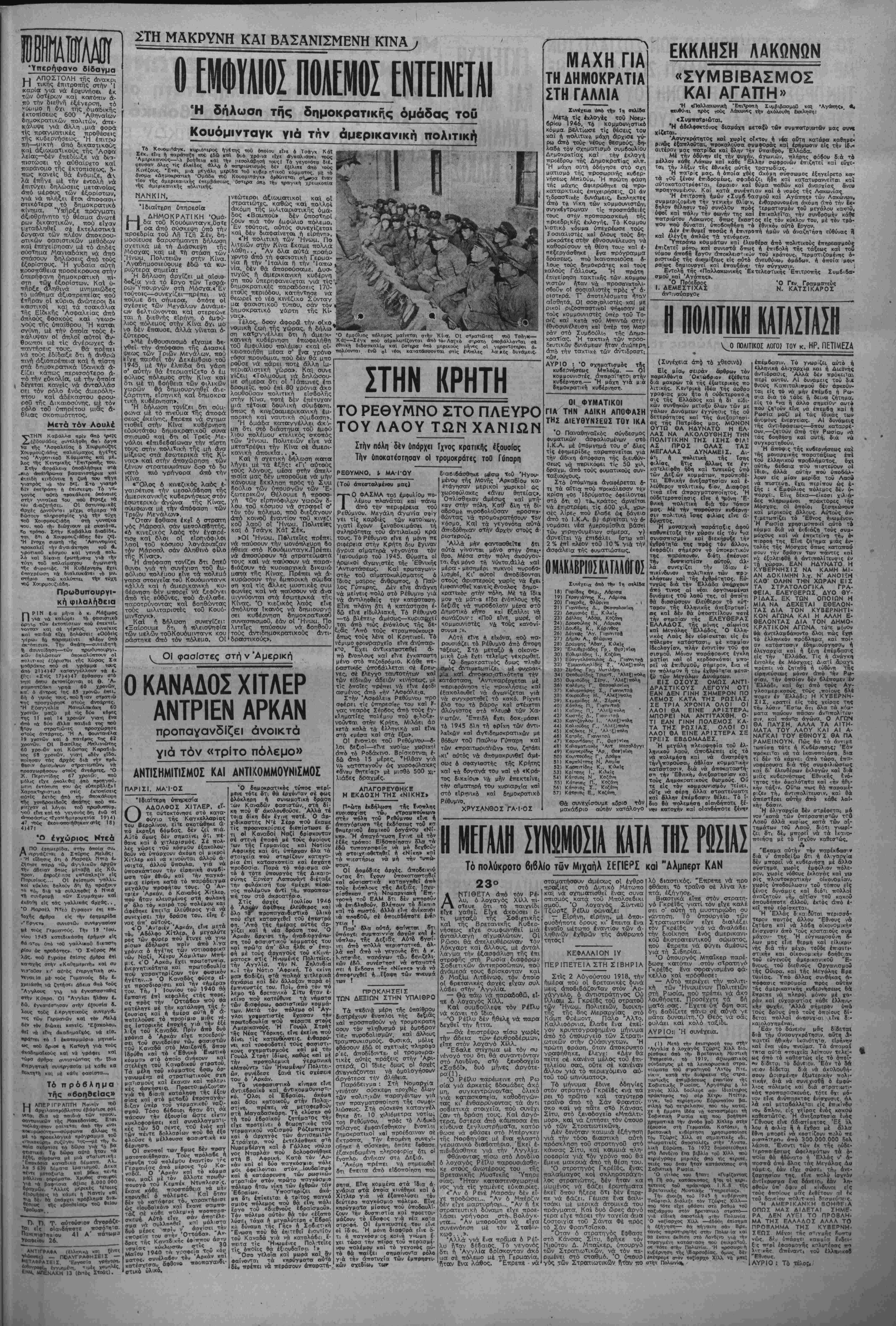 κατηγορημοπικές καί ίπίσημες <υ 6ερνητικές δηλώσεις. ^ Ή άντιπροσωπεία έπέσΤπθί την προσθχή τού κ. Βενιζέλου καί τόνισε τήι, Ιδιαίτερη εύθύνη τοβ γιά την κατάσταση στήν Κρήτη, οπου τά κρατικά όργανα σέ σονι-β γασία μέ «έθνικόφρονας» παράγον τεςκαταβάλλο^, συστηματική πρη σπάθεια^ νά μεταφέρουν καΐ έκεϊ το» έυφύλιο πόλεμο. ΟΙ συλλήψϊ,ς κσΐ έκτοπίσρις αΰτές — τόνισΛ — των σΓελίχών τού ΕΑΜ Χανίων, καθώς καϊ ή σύλληψη τού στοοττη- γοΰ Μάι/Τοκσ μέ άπόφαση Υ'ά έκ· τόπιση. προκοτλθΰν τή δ'κβιολογη- μένη έξεγερση τοθ λαβθ καΐ οί- χνουν λάδ·. στή ΦωΤιά. Προετοιμάζεται ή «δευτέρα φάσις» τής εκστρατείας , Σύμφωνα μέ ίπίσημες πληροφο ρίες «έντβς) των ημερών, άρχίζε, ή δευτέρα Φασις Των μεγάλων έσρι νών £κκατ)αριστ(κών ίτίιχειρήσεΜ^ εναντίον των άνταρτών». Μετά τήν άποτυχΐα τής πρώτης φάσεως τής έαρινής έξορμήσεως οί άρμο διοι τ.3 Έτπτελείου άπθφεύγουν νά όμιλοΰν μέ εμφαση γιά τίς νέ ες επιχειρήσεις, ίσχυριζονται δ- μως 'όΧ; θά είνε «εΰρυτότης εκτά¬ σεως καϊ. θά γίνουν πάλιν μέ συνεργασίαν άεροπο^ίος καΐ στό λου». Ήμέρα^ τής ενάρξεως ■■ών νέων επιχείρησιν δέν άνακοινώ νεται. Σέ παρατήρηση τοϋ συντά κτθυ μας 6'τι ή μερά εΤνε Χ καΐ ή ώρα Ω οί άρμόδΐοι δήλωσαν ότι αύτοι είνε χαρακτηρισμοΐ των δή μοσιογραφΜν. Σύμφωνα μέ Τα σιιμερινά τηλε- γραφήματα πρός τό Γεν.κόν Επι τελεΐο Στρατοΰ οί ίπιτεθένες χθές τή νύκτα κατά τοΰ έξω^ερι- ΰ^ φυλακίου των Γρεβενών ήσα^ δυνάμεως τΡ'-ώνσυγκροτημέντο», λό χων. Σήμερα τό πρωΐ άνοχωοϊϊ Υ'ά την Πελοπόννηοο ό ύποστρά- τηγος κ. Στανωτάς, ποΰ άνεκλή θηκε άπό τό Β' πίνακα γιά νά διευθύνει τίς _ επιχειρήσεις έκεϊ. "Ο κ. Στράτος. μί"Τά άττά Βιά- φορες συνεργασίες. πού εΐχε μέ στρατ'ωτικους παοάγοντες αετίδη σΤό Γραφεΐο τής Γίνΐκής Έπιθεω ρήσεως Στρατοϋ δ'πθυ προήδοευ σε τοϋ Ανωτάτου ΣτρατιιοτικθΟ Συμβουλίου. 'Η στρατολογία των 6 χιλιάδων χωροφυλόκων 4Ο Ζέρβας κατά τού Ιτράτου Στίς 12.30 τό μεσηυέρι 9ά νπγοΰς καΐ Ιδιαιτέοως στόν ύ· συνεΛ.«ει τό ΠΟΛιτικό Συυιβου- πουργο των Στρατιωτικών κ. λιο. Μεταξύ των θειαάτων πού θά συζητήθοϋν είνε καΐ τό θέ- αα τοθ τρόπου άντι-αετωπίσεως των δυσκολιών, πού προέκυ- Φαν γιά την κυδέρνηση άπό τήν άρνηση τοϋ "ΑΥΥλου έαπειοο- γνώιαονος της Μοο,ισαατικης Έ τΐιτροπής κ. Γκρέγκορυ, νά έγ· κρίνει την πΐστωση γιά την κσ· τάταξη 6 γιλιάδων γωροφυλα- κων. Χ) κ. Γονατάς εδήλωσε 8τι δέν εζήτησε νά δρΐ τόν κ. Μάκ Βίϊ καΐ δτι συνεπώς δέν προ- κείται νά συναντηθεΐ Ιδιαιτέ¬ ρως μαζί τού, έκτός εάν 6 Ά- υερικανός πρεσδευτής τό ζητή σει. Συμπληρωμστικές πληροφο- οίες άττό τη γθεσινη συνάντη->η
