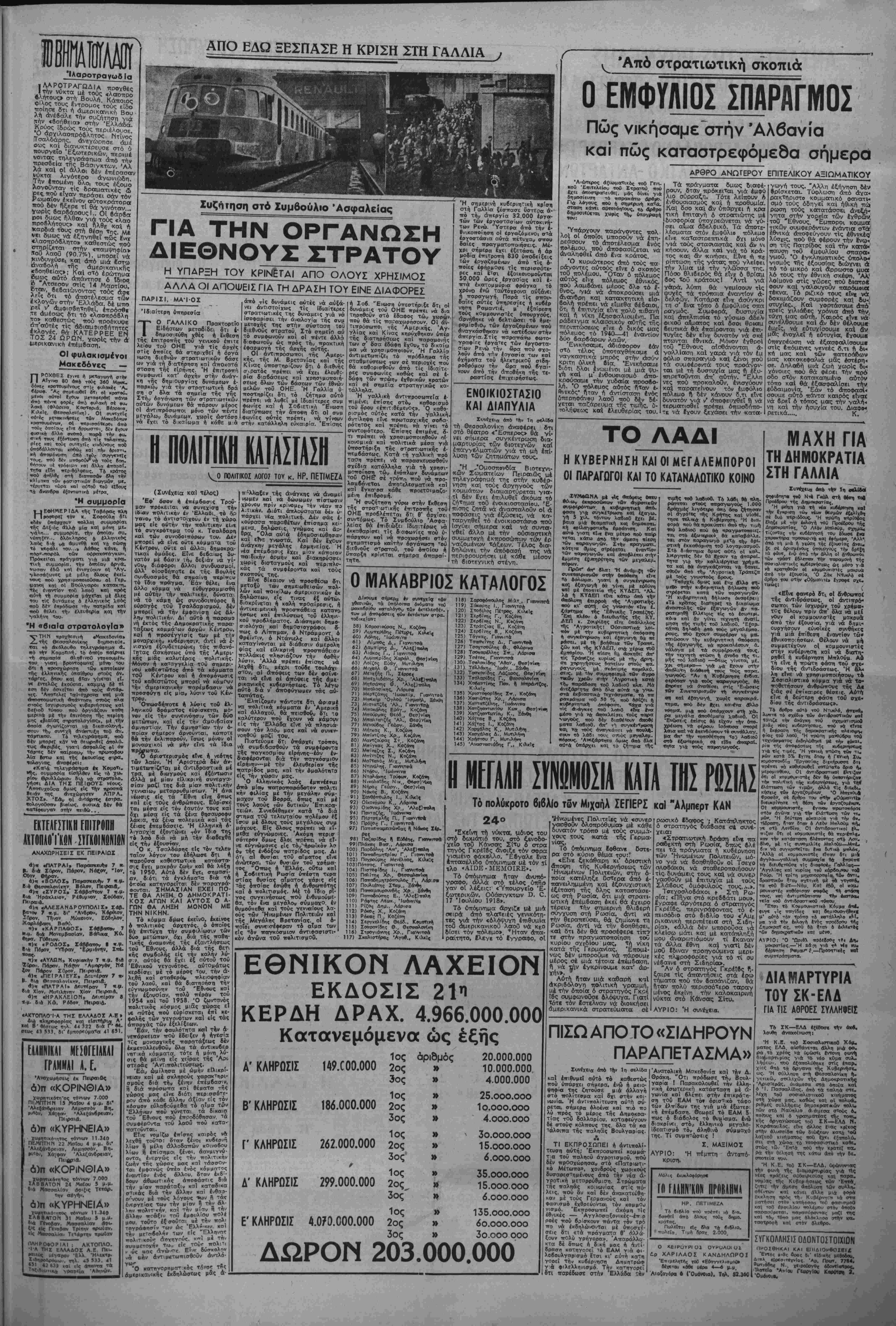 Κατέττλευσί *ιτδ την Άμερικ<| *. τμοιτλοιο μέ 20.000 δέμα". Τή Δέ"· τέρα άιαμένεται να φθάσει βλλο *· τμόηλοιο μέ 30 000 δέματβ κ«1 Τ?» Μοίνιο τρίτο Ατμόπλοιο με ΐ2·00β ΠΔΡΑΜΕΝΕΙ ΣΤΗΝ ΟΥΖΙΑ Η ΓΑΛΛΙΚΗ ΚΥΒΕΡΝΗΤΙΚΗ ΚΡΙΣΗ ΤΑ ΑΠΩΤΕΡΔ ΣΧΕΔΕΑ ΤΗΣ ΔΕΞΙΑΣ Ή στάση των Λημοκρατικών Κομμάτων ΠΑΡΙΣΙ, 8. Πδ. ύπ.).— ·ς. γαλλικός τύτΐος άφιερώνει τά άρθρα τού στή γαλλική κρϊση. Τό γενικό συυπέρασμα είνε δ τι ή άπόφαση ποΰ πηρε τό Συμ δούλιο τοΰ Σοσιαλιοτικοϋ κόμ ματος, μέ άσθενέστατη τΐλειο- ψηφία, διγάζει τό αέτωττο της δημοκρατίας, 'νώ άπό τό ό;λο αέρος δέν έξασφαλίζει κυδτρ νητική εύστάθεια, "Ογι μόνο οί έφημερίδες τής άριστεράς, άλ λά καί ξένοι συντηρητικοΐ άν ταποκριτές έκφράζουν τό φόβο δτι ή δεξιά θά Ρελήσει νά ίκ ιιεταλλευθεΐ την άδιοναιμία τιϊΰ Ραμαντιέ, γιά νά κ,αταφέρει πληγμα ατΐς δημοκρατικές χά τακτήσεις της έθνικοποιήσεωΓ κ. ά. Πολλοί τησΤεύουν δτι κή καΐ όδηγεΐ σέ κυδέρνηση ουντηρητική υπό τόν Μπιντώ. ΦΡΟΥΡΟΣ Η ΑΡ1ΣΤΕΡΑ Στήν κρίσιμη αυτή στιγμίι παραμένει φρουρός ή άριστεοα —τόσο τ6 Κομμουνιατικό 'κόμ μα δσο κα{ ή αενάλη ιαάζσ του σοσιαλιοτικοθ κόμματος, ή ό ποία δέν έγκρίνει τή στάση τού Ρσιααντιέ καΐ τού Μπλ,οΐηι Στήν εφημερίδα «Οΰμανιτέ» -Ί Ζώοί Κονιό γράφε( 8τι «στό ιιέλλον, δτΐως καΐ στό τιαοελ ίΐόν οί κουυ.ουνιστές θά προσψί οουν τήν ύποοτήριξή τους σ' 3 λα τά μέτρα της κυβερνήσρωΓ υπέρ της έργατικής τάξεως» χαι ό 'κουμουνι—ής ήνέτης Ν κλό εΐπρ: «ΕΤνε ήλίθιοι . ,· ·· · -ννυ ϋΐπρ: «ε,ινε ηΜΒΐοι δσοι τελευταία, λύση είνε, μεταβατι μιλοθν σήμερα γιά γενική ά —-ργία. "Αν καΐ δέν μετέγοο ή δέ θά άμου ργ Αν καΐ δέ μ με στήν κυδέρνηση θά κάμ ιιε δ,τι μπορουμε. γιά νά τή 6ο ηθήσουμε νά λοσει Ικοη/σποιτΐτι κά τίς δίκαιες άπαιτήσεις των 'ογατών». Ή εφημερίδα «Φο?ν Τιρέρ» κατακρίνει τή στάαπ τηζ υικράς πλειοψηφίας τοΰ Ε.°ν1 κου σοσιαλιστικοΰ βυμδουλίου, ή όίθά £ ι° σσΰ ή όττοία—γράφει—θά χ 6αρ6ττατες συνέττειες στό λον. "Οσον άφορα τή ·έση ίργατών εΐναγνωριζεται π σκολη οΐκονοαική θέβπ καΐ θεωρίΐται άδύνοττσν οτ. Ραμοντιέ θά μττορέσει νά σει αέ συνατ—ισμό κέντρου κ δξάς τα έκά ττροδλ σμό ρξς τα έργατικά ρ τα πού δέν θέλησε νά λύσει τήν συμιαετογή των κομμ°υνι στών στήν κυδέρνηβτι.