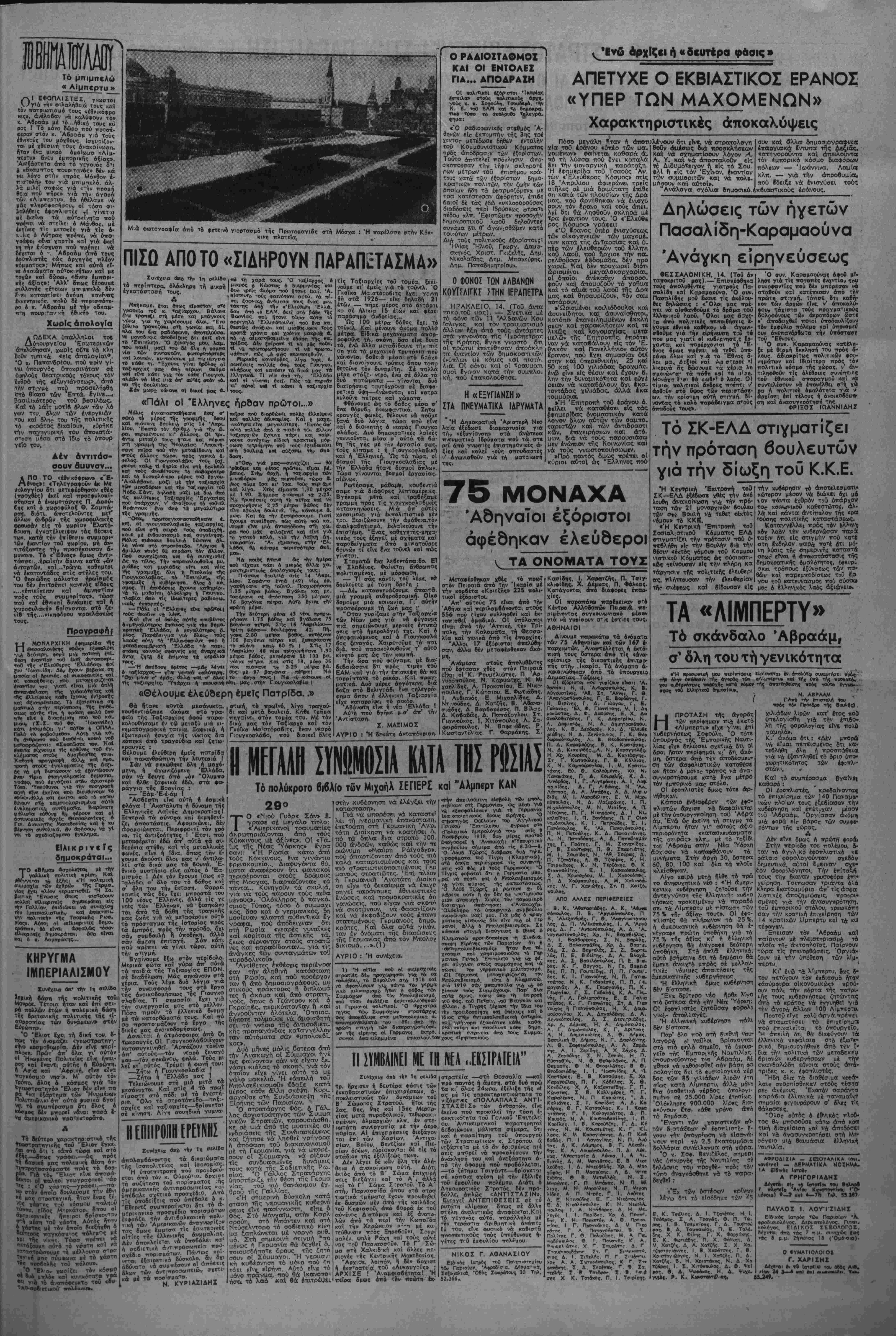 λύψουν τό έκ 1000 χιλιομίτρ<ον ^θλληπτο μήκος τους. Ενδιέτριψε έπιμόνως βτόν προσφιλή στοΰς μο νσρχ κοΰς μύθο τής «έξωθεν έν·. σχυσεως και εΐσόδου οτνμμορι- τών», άγωνιζόμενθς νά αίτιθλογή- σει τή» τεραστία αναπτύξη τιϋ Δημοκρατικοϋ ΖτρατοΟ ποθ.πάει νβ διπλασιασθεϊ, όπως έτόνιζε τό χθεσινό άνακο νωθέν τού Αρχηγεί ου Θεσσαλίσς τού ΔημοκραΤ'.κοΟ Στροτοΰ, μετά Την «έκστραΤΐ-'α τής ημέρας Χ καΐ τής ώρας Ω». Καΐ πόνω άπ' δλα άρνήθηκε την εναρξη τής εκστρατείας τοΰ «Λυ· καυνοΰς». Την ιδία περΐπου στιγμή & Σωμ^τά'χης Λαρίσης κ Καλογε- ρέπουλος δχι μόνο έπι6ε6αίωσε την έ'νβρξη τής εκστρατείας, άλ λά παρεΐχε και λεπτομέρίΐες τόσο γιά Τϊς δυνάμεις πού μίΐέχοψ» σ' σύΓην, οοο κα'ι γιά τα έδάφη στα όποϊα κινοθντα καΐ τέλος γιά τοΰς άντικειμενκοΰς σκοπθύς ποϋ «έπττελοΰν» (;) «ΕΠΙΣΗΜΩΣ ανεκοινώθη, τονί- ΐουν τα σημερινά τηλΕγοσφήμστα άπο τη Λάρισα δπ άπό τής ΙΐΓς "Η συνεπεία στήν 3η σελΐδβ ΚΗΡΥΓΜΑ ΙΜΠΕΡΙΔΛΙΣΜΟΥ «Ή Άμερική είνε ήπειρος και όλος ό άλλος κόσμος είνε ίνα παγκόσμιο νησί...» ('Απ'» τό βΐβλίο τοΟ ΤΖ. ΕΛΙΟΤ: «Ή δύνσμη πού χρειάζόμσστε») ΑΠΟΚΑΛΥΠΤΙΚΗ ΚΡΙΓΙΚΗ ΤΟΥ ΡΩΣΟΥ ΔΗΜΟΣΙΟΛΟΓΟΥ Β. ΤΣΕΠΡΑΚΒΦ Α'. ΣΤΑ ΜΕΤΑΠΟΛΕΜΙΚΑ δη· μοσιεύματα των "Ηνωμένον Πολιτειών ολο καΐ μεγαλύ- τερη θέση καταλαμβάνει ή προπα γάνδα τοΰ μιλιταρισμθύ. Καθημΐ|Πρίν άττ' δλα, είνε νά φοβίσει «ΕΚΤΟΣ ΝΟΜΟΥ»! ΕΝΩ ή άντικουμμουνιοτιχή άρθρογρσφία τού κυβερ νητικοθ τύπου, έφθοοσε νά ττάρει τή μορφή έκδηλώσε^ν ύρκής ονοαία ή τά ρ ή μρφή ύστερικής μονομανίας, ή οάι τήζ κυδΕΡνήσεος έ'ναντι'της προ τάσεως ποϋ ΰπέβαλαν οί είκοσι 6ουλευτές νά κηρυγθεΐ έκτός ν6μου τόΚθμμουνιστι-κό 'ΚΟμμα, «παραμένει μέγρι τής στιγμάς ά καθόριστος. Άφότου άπέτυγαν οί πρώτες κατά των άνταρτών «έκκαθαριστικές» έπιγειρήσεις ικατεδλήθη προσπαθεία νά συγ καλυφθεΐ ή αποτυγία >μέ τή δι