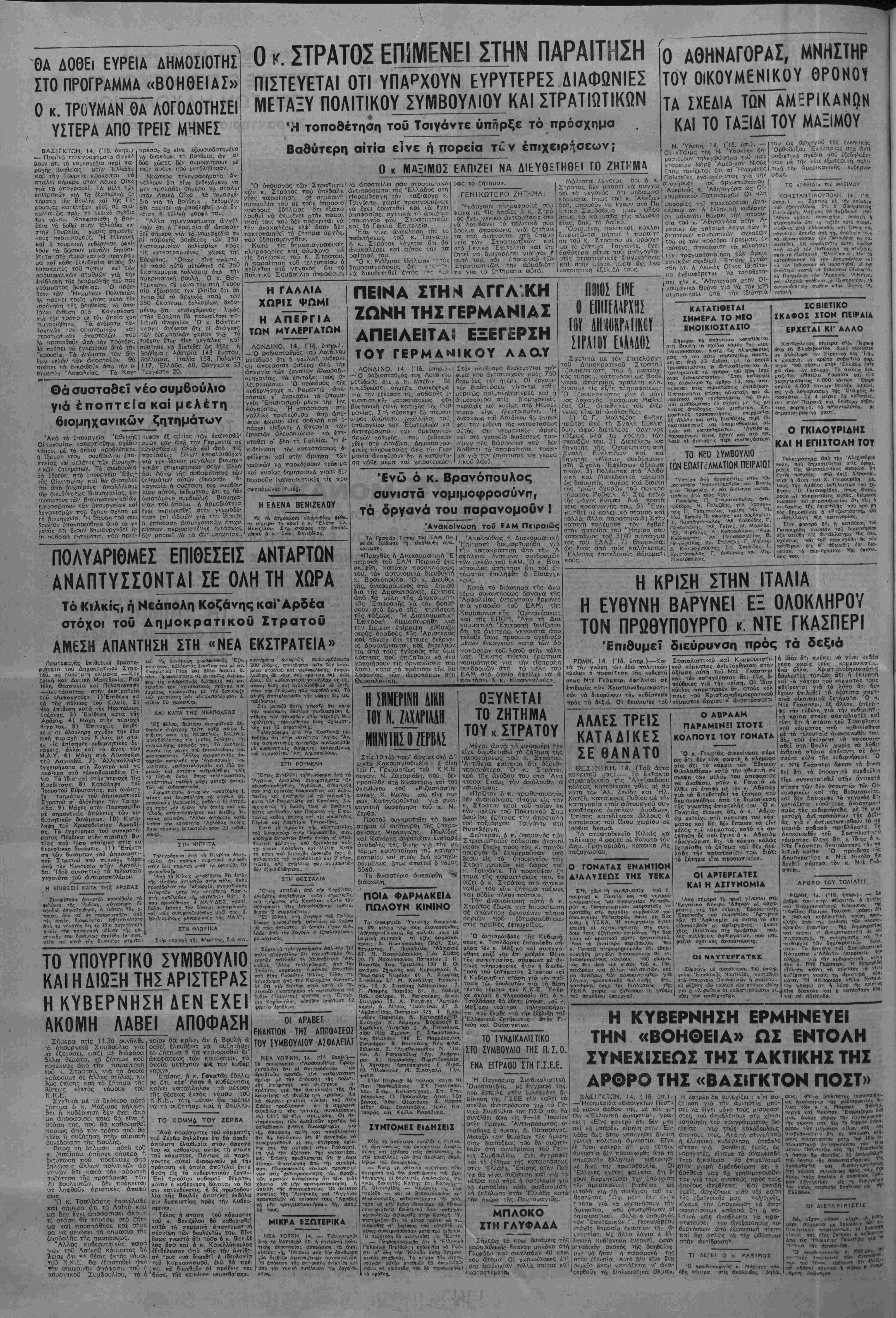 τοθ Κομμουνιστικαί) Κόμμοϋιθί τ*<1 "Ιταλίας Παμϊρο ΤολιόβτΤι ·,·ραφΕι °τς ή ΙϊαλΜίή κυΡερηΤική κρίοη ιρ°Ε- κλήθη άπ6 ττι,. έηίθεστ, των τΐλουτο- κρατών ίναντίον τή,; ΔημοκραΓΙσΐ καΐ ττρέττει ν' 4 τιμίτωιΐιοθ-ϊ μέ '*ν τ-·ασπισμ6. τή συνεργασίο καΐ 'γ ιτειθαρχία Των δημοκροτικΛν δι/να. αεοϊ·. Τί» δργανο τοθ Σοσιαλοτ""»0 Κόαματος «'ΑΚανΤι» 4ιτιρρΙι»-ει Γύβόντ» νι4 την κυΒερνητικί) σόν κ. Ν τί Γκά—ερι. Ή ίφΐ.. . «Τίυ—» «Ανει τη σθσ»βση ι* Υΐ.ν« κυΓέρνηση γωοΐς τ« άριστερά ιιατίτ. "Η «ίΚοοριέοε ν'ίλα νέ» γοαφει 5^ι ίι λύση τ?Κ εΐνί δύσχολτι καΐ Α κατοσΤαση βοτ). νεΐ σέ <*5ιέίοδο. Η ΚΥΒΕΡΝΗΣΗ ΕΡΜΗΝΕΥΕΙ ΤΗΝ «ΒΟΗΘΕΙΑ» ΩΣ ΕΝΤΟΛΗ ΣΥΝΕΧ1ΣΕΩΣ ΤΗΣ ΤΑΚΤΙΚΗΣ ΤΗΣ ΑΡΘΡΟ ΤΗΣ «ΒΑΣΙΓΚΤΟΝ ΠΟΣΤ» ΒΑ,ΣΙΓΚΤΩΝ, 14. (Ίδ. ύττ.). —Ήέφημεριδα «Βάσιγκτων Πόστ» σέ κύριο άρθρο της, μέ τόν τι- τλο «Έλληνικ,ή άμνηστία*, γρα- φεΐ : «ΕΤνε ψανερό δτι δέν μτο ρεϊ νά ΰπάρξε, εΐρήνη στήν1 Έλ¬ λάδα ^ως ότου χορηγηθεϊ δί/ί.ιιη γενι/ή πολιτική άμνηστία. Είνε ί'ί Τσου Φανερό δτι μιά τέτοια άμνηστία δέν προσεφ£ρθη άττό τή ή έλλή μη δέ ρ σημερινήν έλληνΐκή μέ δική τη^ πρωτοδθυλία. λ έ ί ί ΟΊ μ ή η^ ρ. "Ελληνες ήγέτες φαίνεται δτι έ- νούν διερμηνεύσει τ·^ν ύπό^χ^ση τήη άμερικανΐκ.'ι. βοηθείας ώς ΐΛτολή για τή συνεχίση τού κχ· θεστώτος. Όχΐ μόν- ίέι· ενΓί Τ ττοτα γιά νά χορηγήσουν τήν άμνηστία, ττοΟ ΰποσχέθη/.αν γ.1 δημοκρατικοΐ, άλλά ό ύττθυργός των 'Εσωτερικών Γ. Παπανδρέου ίτάχθη. δημοσία εναντίον τήΓ ά- μνηστιας. Μέ άλλα λόγια Λ έ- ληνΐνή κυ6?ρνηση ένεργεΐ, ώσάν μ-ναδικΟΓ Οκθΐτός τής βοηθείας μ χ* νά ήταν ή τταραμονή της στήν έξοιοσία. ΑΊτό δέν είνε Μνα σημρϊο δττου χρριάζεται ν' άνα- θθ τα δΐπλωμοτ^κά ΙΘιμα». Η έΦημερ.δα ουνεχίζει : «Ή συ· ζητήση γιά την άμνηστία μπο¬ ρεΐ νά θίγει μόνο τούς μΐσθφασί στες πού άποδλέττθυν στή χρηοι μοποίηση τού ττρογράμματθο βο η&είας γιά τούς κακόδουλους σκοπούς τους. Άττό τή στΐγμήπού ή έλληνικη κυδέρνηση ύτιέβχλε αίτηση γιά βοηθεία, εμείς, ώ; γορηγητές, βίναμε τό άναμφΐσβη τητο δ'.καίωμσ νά έττΐμείνουμε οτήν μΐκρή δια6εβ«ι'ωση δτ, ή βοηθεία μας θά χρησΐμοποιοθν- ταν γιά τούς σκθττούς. ττρός τούς όποίθυς άπέδλεπε. Καί έττειδή εείς άρίζθ α έ ά ς εμείς, άρχίζθυμε μίαν νέα φη τήζ έξωτρρΐκή; μας ττολιτ,.κής, ρ'χαμε τήν ΰττθχρέωση νά άπο- σαψηνίσουμε καθαρά δτι ή ττο- λιτική μας άΓ.οβλέττει νά προ- στατεθσει τγ,ν άνεξαρτησία κυ- δερνήσεων άπό έξωτερΐν.ή ιτίεπη καϊ δχι όπτλώς νό την ώθήσουυι» στήν αντιδράση». ΤΙ ΛΕΓΕΙ Ο κ. ΜΛΞΙΜθε Ό ποωθυποι*>γ6ς «. Μάζιμοο «ρο.