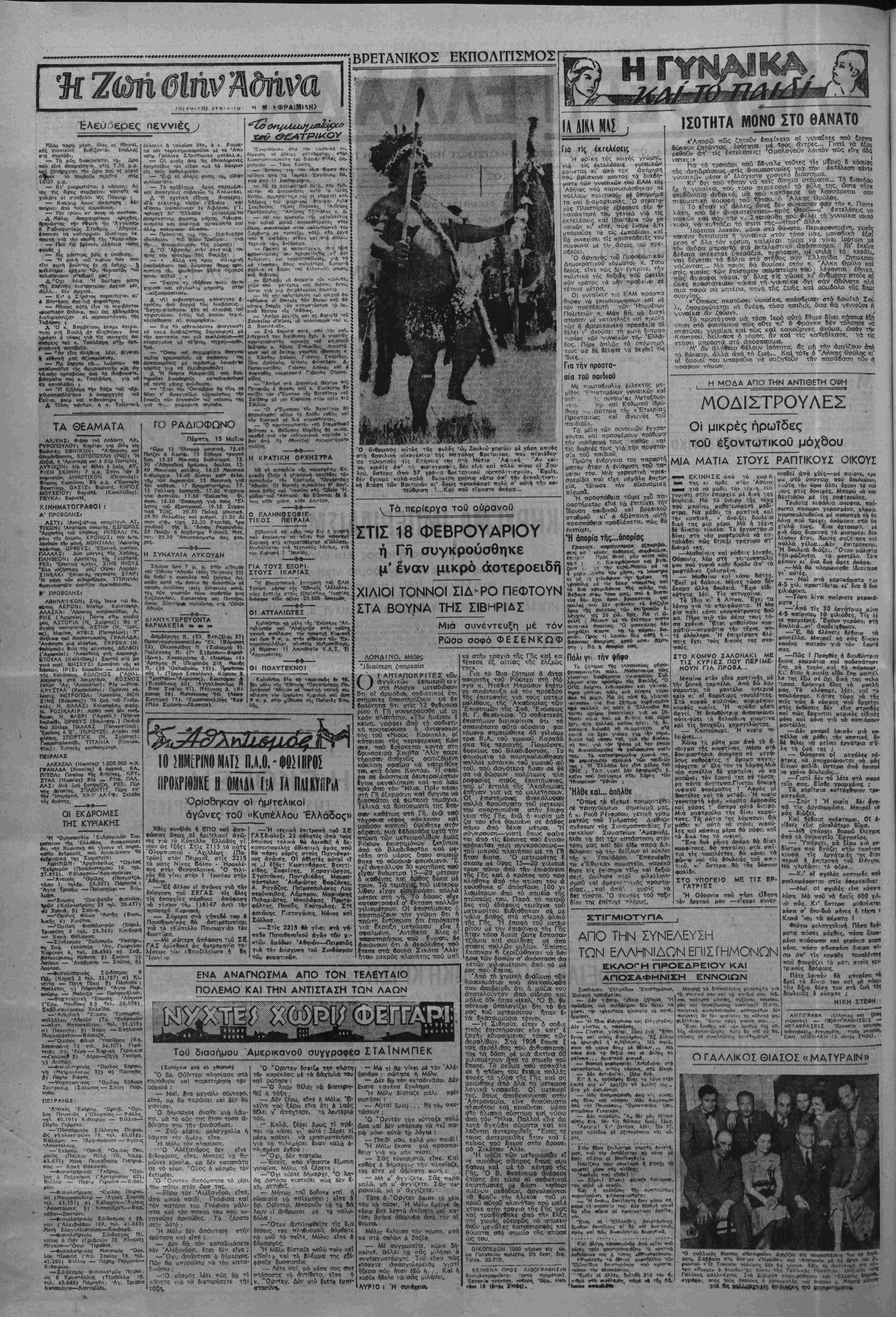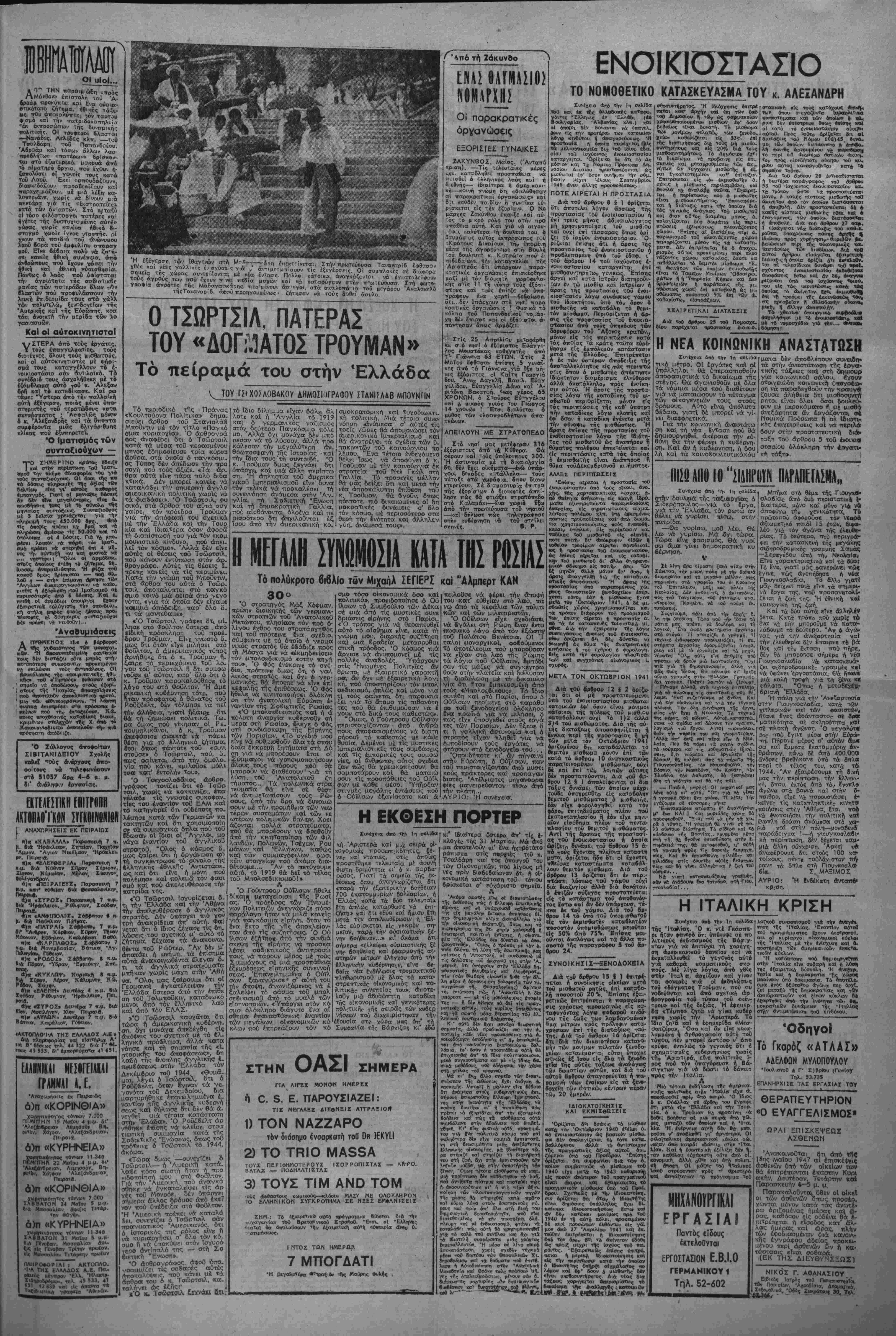 λή, δέιι είνε 6ί6<ΐιο δ» 9ά ί'νε Λ Πβοβ. σκευή Ι) Τ6 Σο.06ατο — αν έννοΕΪΤαι δέν κσθιοτ^ήσπ σκ&μη ττιο πολύ. ΧΙΤΕΣ ΕΞ«=ΤΙ=ΛΕΓΑΝ ΕΝΑ ΓΕΡΟ 63 ΧΡΟΝΟΝ ΚΑΛΑΜΑΤΑ— Τή νύχϊβ τί|ς ),η Μοίου χΐτες ϊνοπλοι {ζίτέλεοοιν οτ* χ<ορι& Νερομυλθο Πυλίθς τον γέ^β ΉλΙο: Κοττσί&α, μπροσ'Α σΤή γυναί· χά τού κσΐ τό πσιδί τού. Την ιδία ή. μρρομηνία τοθ 1944 τσγμαΤ<χσ'{κΑ1'*ς ΐ ίκτελίση έτιιυης κοΐ |ναν 4ϊ4 νυιο.ις τού. επεΓαΊη μετεφερι βιβλια του εαμ Χθές τό βράδυ συνελήφθη &τ}|»· Κοκκ.νιά ό Κ. Ρέιιττας έιτειδή υϊ τέφερε_ 6ι6λί« τού ΕΑΜ. Στό 5ο τμήμα δπου όδηγήθηκε. ίκβ- κατβνομή βά γίΛι ϋη(, τή, Ι6ιβ επι. κοττοιήθη καΐ Τού έκράτ.ησαν χά τροττη'. βιβλία. , Σημερινό ανακοινωθεν γιάτιςέπιχειρήοεις Άττό τίς έδώ άρμόδιες στρα τιωτικές άργ&ς εδόθησαν σήυ.^ ρα οί εξής άνακοινώσεις: «Είς Ολόκληρον την εύρεΐαν πρριο γήν Χασίων — Άντιγασίων καί "Ορλιακα αί ιδιεξαγδμεναι έ πιγειρήαεις δαίνουν επιτυχώς. Τα στρατίίύματα κινοΰνται συν κλίνοντα πρός τούς καθορισθέν τας χώρους έν περιφερειακή έ τταφή. {Ότά την χθεσινήν ήαέ ραν εγένοντο έπαφαΐ μετά: 4μ.ά δών συμμοριτών 'καθώς κα'ι έ ξκρευνήσεις. "Εσημειώθη σφο δρά δράσις τ.ης άεροπορίσς είς την περιοχήν Σαμαρίνας, δπου κυριολεκτικώς άνεσκάφη τό Ι δαφος διά βομδών καί ρουκ&τ των. Γενικώς αί μέχρι σήυ,ερον * ζηκριβωιμέναι έξ έπισήαων σνα φορών απώλειαι είς την άνωτέ ρω πεοιυγή'. άνέρχονται είς 56 νεκ,ούς, Ρ1 τραυματίας, 37 αΐγ μαλ'οτοο;. έν οΐς 21 (χνήκοη:·-? είς την σγιοάμυναν». Άτίό τ,ούς στροττιωτικούς κ·Ί κλους τί'ρεϊται γαρσκτηριστικ·Ί έπιφυλσκτικότης κα έττίμονη ά ττοφυγΐι ογολΐων γιά τίς διεζσ νόιιενες έτιιχειρήσεις. ΟΙ έφέσεις ττού εκαναν οί Α- Βηναΐοι πού συνελήφθησαν στίς 3 Μαρτίου καΐ έκτοττίσθηκαν στήν Ίκσρία βρίσκονααι στό Πταιο-μΛ τοδικ,είο (Εύπόλιδος 8) γιά νά έξίτασθοθν οί μάρτυρες ττού Ι- χούν ττροτει'νει. Ο! συγγενεϊς τώνν έξορίστων ττρεττει νά στείλουν ά- μέσως τούς μάρΤυρες —ού ΐχουν ιτροτείνε1. ^ νά έξετασθο0.ι» γιρτΐ οί δικθγοοτφίες μέχρι τή Λει/ΐέρα ββ κλείσουν. Η ΕΠΙΤΡΟΠΗ Τ Ο ΑΚΤΟΠΛΟΐΚΟ ΖΗΤΗΜΑ ΠΑ Τ6 Σάδδβτο τό' άπόγευμα. θά «ι /ι υπό Τόν δΐΕυθυντή τοΰ ύπθυΡγείθυ ■"Εμπορικής ΝαυτιΑ.ίας ίπηροττή σιήν 6. •ποία £χε, ποραπεμ»θεϊ ή ρυθμίση Τ3θ ά'Τσπλο'(κθϋ ζητήματος. Κατά τή συζη¬ τήση 4 άντιττρόσωπος Τοθ Άνωτάτβυ ΟΙκονοαικοΰ Συμδθυλίθυ κ. 'ΑγαπητΙ. Εης θά άνατιτύξει τό ττρώτο μέρος τής μελέτης που άναφερεται στΐς μέχρι τού¬ δε λθσεις ττθΰ προτόθηκαν γιά τό άκτο. ηλο'(κ6 ζήΤημα. χ Στήν έππρθπή μετέχθυν ίκτός τ&ν ανωτέρω κα| οί κ. Έξσρχάκης κα] Δπ^. λσμαγκσς τθθ ΓενικοΟ Λβγιστηρίου, Κ. Γουναράκης κοβηγηΤής τού Πολ^τεχνεϊου, Π Γιηννουλάτος ίκπρόσωπθς τής ΆκΤο. πλο'[κής Ενώσεως, ττλοίαρχος τού Πό. λεμικοϋ Νουτικοϋ, καΐ Δ. Παπαμΐχβλό. ΤΌυλος, ιδκηγόρθς, «■ΘΝΙΚΟΦΡΟΝ» ΔΟΜΛΟΓΟΣ. ΙΝΝΕΡΓΑΤΗΣ ΤΟΥ ΒϋΒΟΛΙΝΗ Συνεχίσθηκε σήμερα οτην σΤ- βοΐΛτα τών *Φίλ«ν τού Λαου» ή δίκη τού μεγαλοδοο-ίλογθυ Ξβνθό ιτουλου στενού σκνεργάτη των Γερμανών πρώην Διευθυντού Τεν/νι κων ύ—ηρεσιών ' τού Δήμου Π*- ρσιώς. Κατά τή χθεσΐνί» ήμέρα τής δίκης απεκαλύφθη δτι ό καΤη νορούμ£νος τό 1940 εΐχε έκτθπι σθεί σάν πράκτορας τών Γερμα νών γ·ά άπόττειρα σαμττοτάζ στο άγγλικό ττλοϊο «Σαμΐρ» που με- τέφερε πυρομαχικα στό μέτωττο. Μετά την καταρρεύση ό Ξανθότου λος ανέλαβε τ#ΐν σιιντήρηο·η τών άερθδρθμίων 'Ελληνΐκοΰ, Ελευ¬ σίνος, Λάρ σας, Θεσσαλονίκης, κστασκεύαζε τσιμεντόττλοια στό Πέραμα καί όχκοωματικά #Ιργαι σττίν Κόρΐνθο καί άλλοθ. Σήμεο3 έξετάσθηκε ό μάρτυρας ΰπεροσττί ο-εως Πόθος ύττάλληλος τού Ξαν- θόπ