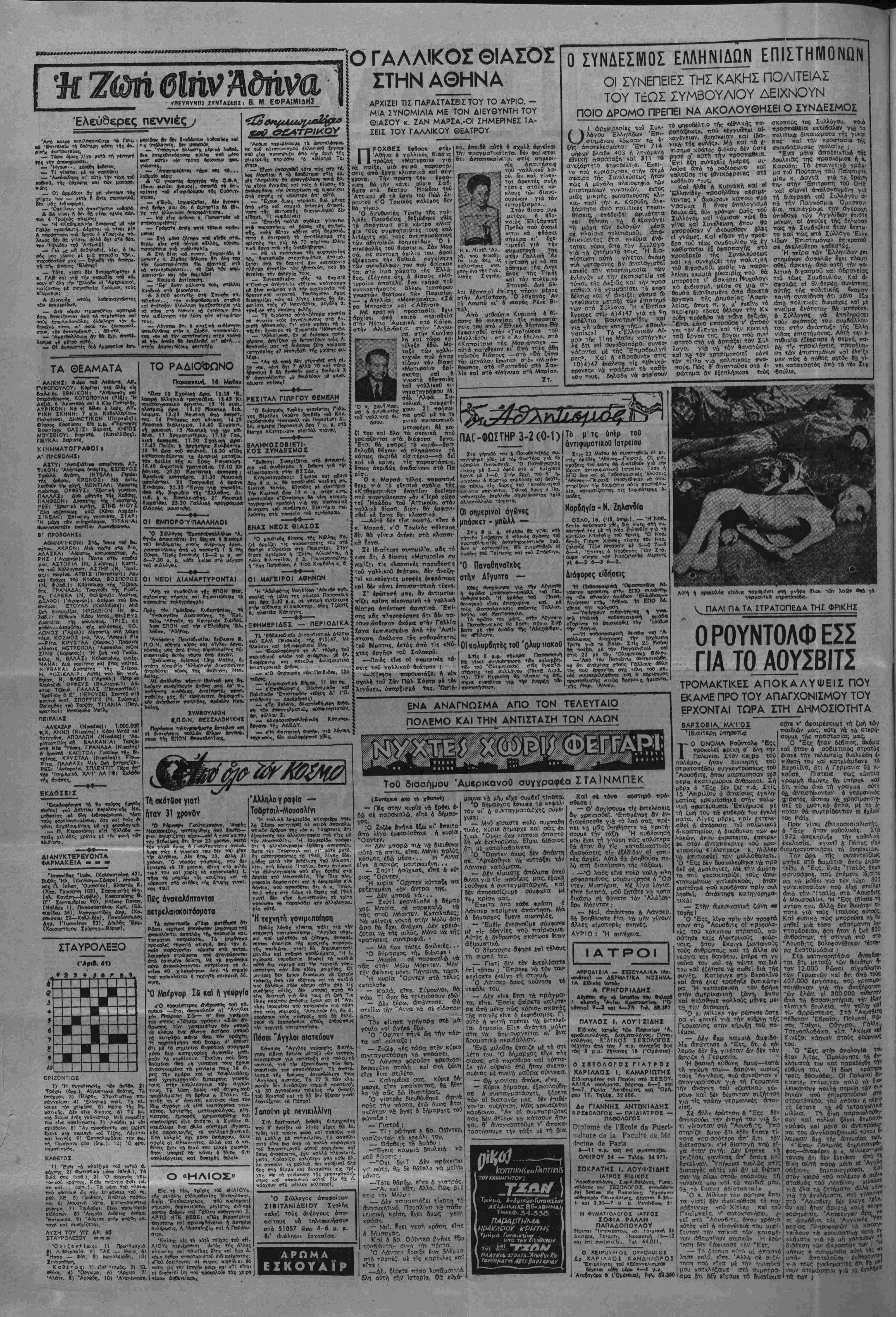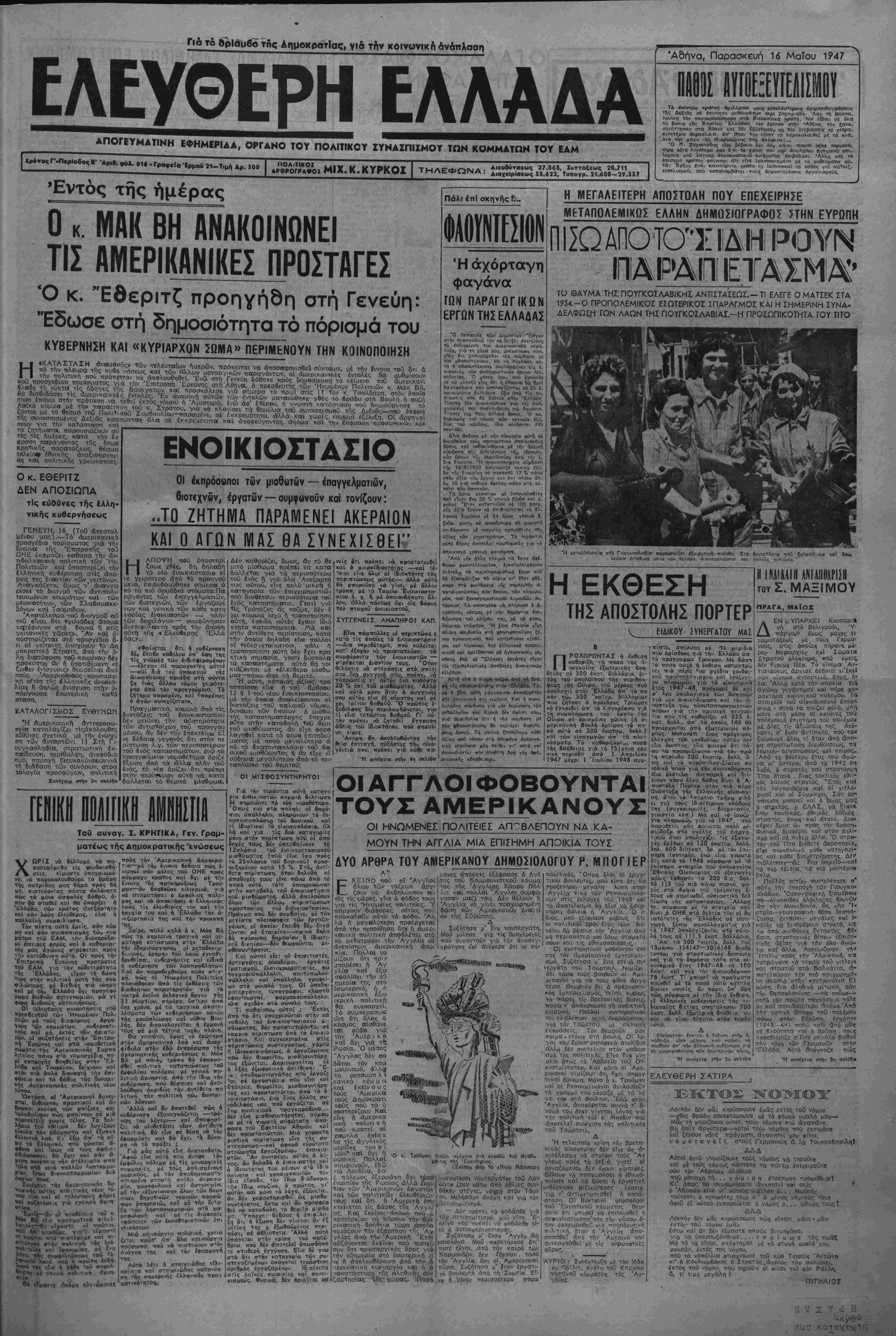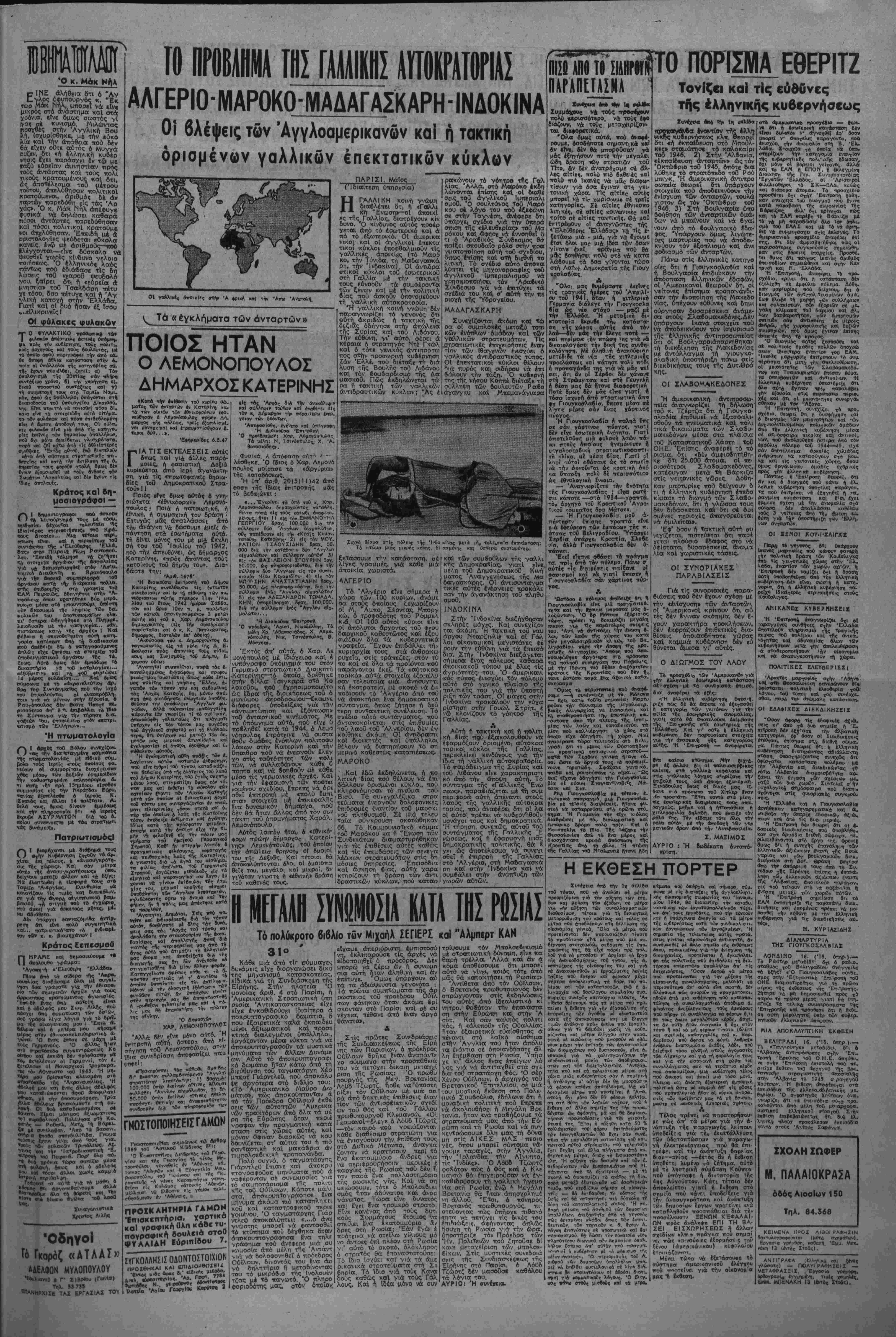 δέ» έξσρτόται <Απο«λειστικο άττό τις β- ποοτολές αύτίς. ΝΗΝΚΟΖΑ.ΝΠ ΛΤΟ ΕΚΓΕΑΕΣΕΙΣ ΚΑΙΛΪΟ ΟΜΙΚΕΠρΐΙ,ι.1 ΚΟΖΑΝΗ, 16. — 'Εξετελέσθη σαν χθές οί καταδικασμένοι αέ θάνατο Γεώργιος Τσαμτΐούρ·.ις καί ^ Αθανάσιος Ζέρβας. Τό ϊκτακτο Στρατοδικεϊο κατε δίκασε έξ όίλλου σέ θάνατο τού Χα'ίτίδη καΐ Παπαγεωργίου, μ την κατηγορία τής όργανώοε<ο (νόπλων όμάδων. Η ΔΡΑΙΤΗΡΙΟΤΗΙ ΤΩΝ ΑΝΑΚΤΟΡΩΝ Χβίς 6 Πσθλος δέχθηκε τ*ν κ. Λ. Μπενβκη. τό/ ΜητροπολΙαΐη 'Αζώμης κ. Νικόλαο 1<ϋ τόν άρχηγό τού «ΓΗε- οο κόμματος» κ. Μαρκεζίνη. 'Υπ6 την τιροεδρίο: τής Φρειδερίκης χθές σόσκεψη σΐην ότΛία ϊλα. Ρ μέρος οί κ.κ. ΜάξιμθΓ Χέλμης καΐ ΚόΤσισνος, <| κ. Λίνο: ΤσαλΛάρη, 6 διευθυντής τής Έλληνικής Πολεμι. κης ΠΕριθσλψιως κ. 'Λμτΐέρνεβυ 6 άντιτιρόεδρός της κ. Ξανθάκης, 6 πρό ίδρδς τοθ ΠατριωτικοΟ Ί6ρύμα·ΐΌς κ· Νιχολΐτοας. ο κ. Λήντ καΐ 6 κ. Στ. Πεσμστζόγλου. Στή σύσκεψπ ίξε'Λ- σθηκε τό πρόβλημα έξευρέο*ως γά. λακτος γιά τσ. ιταιβιό:. Η ΔΙΚΗ ΤΗΣ «ΕΛ. ΕΛΑΑΔΑΣ» _ Στ6 ΠενΤβμελές %Εφετεϊο δΐκάζοντσι σήμερα 6 ττθλιτικδς αρθρογράφος μσς σν.ΐ'αγ. Μ. Κύρκθς καΐ ό τότε ύπεθθυνος συντάκτης μος συνοτγ, Γ. Ροβίθης μέ τήν κοτηγορία δτι... διίδωσα» άνησυ- χ&στικές εΐδήαεΐς κσ) έκλόνισοτν τήν ίμ. τιστοσύνη τοΰ λαοΰ οτόν «έβνικό σΤρβ. τό», γιατ| έγράψαμε ότι συμτττύχβηκσν όρισμένοι στσθμοΐ χωροφυλακής καΐ δτι ϋφϊ—οτΤαι ψθορά ό στρατός στϊς μάχες μέ τοΰς άντάρτες. ΖΟΒΙΪΤΙΚΟ ΧΑΡΤΙ Κ—ότλευσε στόν Πειρσιδ σήμερα β ό Μ λέϊ 4 οβ.ική φρνν Μ<τ '-Ότλέϊ» 4- τή Βλβδιρόστ«»κ μέ φορτ» δημο- σιογααφικοθ χαρ^ιοθ. Τ0«ΑΥ0ΟΡΜΗΤ0» ΣΥΛΛΑΛΗΤΗΡΙΟ ΤΗΣ ΒΕΡΡ01ΑΣ Πρό ημερών 6 μοναρχικός τύπθς δ τυμπάνιθί ϊνα δήθεν «οώθορμηΐο» συλ λαλΓ)Τήριο πού Εγινε στή Βέρροια «ένςτ. τίο» τών άναρχικών». Πληροφορίες ττο μάς ήρθοη» από τή Βέρροια δείχνθυν ττώ όργανώθηκε τό περίφημθ «ούθόρμηΤυ συλλαλητήριο. Σ' όλους τούς τοίχθυι τής πόλεως εΐχε τοιχοκολληθεϊ ή άκό λουθη διακηρύξη: «Κατόπιν διαταγής τοθ διοικητού χωροφυλακής Βερρθίσς, άττα ς'άτταντες οί κάτθικθι τής τιόλεως ν€ ουγκεντρωθοΰν στό» ττερίβολο τής έκκλη, σισς τοΰ Άγίου Άντωνίου». Τή» όρι ΰμένη ώρσ χοΰ «συλλαλητηρίου» διετά¬ χθη τό γενικό κλείσιμο τών κσταστημά Τω», τρομοκράτες δέ έπίεζο, τόν κόσμθ νά μεταδεΐ στό» περίβολο τής έκ»λη. σίας. Σ' δσους συγκεντρώθηκσν ϊΤσι μί τή δία μίλησαν ό δόυλευτής Σαρρής (ού. τος εΤχε Τηλεγραφήσει —ήν κυβέρνηΜΐ δτν μετά Την έπίβεση τδν άνταρτώ» κα τα τής Βερροίας «άττειλοθντσι άντίττ3ΐ νο») κα) δ μητροττολίΤης Βίρροίος. Ό Σαρρής πρότεινε στόν κόσ-μο νά τιλιοβίΐ κσ) »ά πάρει μέρος στό» έμφθ. λιο πόλεμο, ΟΙ συγκε»τρωμένθι δμως το1 άττεδοκίμασα», Τό ϊδιο άττεδθκιμάσθη κη ό μητροττολίτης, ιτθϋ ζήΤησ£ ίνταθη τοΙ άλληλο—σραγμθΰ. Καΐ οί δυό όμιλητέι ττθύ θέλησαν νά ρίξουν λάδι στή φωικ τοϋ έμφυλίου ττολέμου, φροντίζουν νά II1 βηίσκονται τδ» περισσότερο καιρό ατί βέρροια, άττό τό φόβο γιά τή ίωή τθ"' 0 δί βθυλεστής Σαρρής ίχει άπό ττολ, λούς μή»ες μετσφέρει σέ άλλο μέρος οΐκθγένειά τού. ΓΠΕΙΓΟΥΣΑ (ΙΙΙΙΙΙΟΙΒΣΗ ΟΙ (ΙΕΣΕΙ! ΤΙΙΝ Ι: Οί έφέσεις πού Μκαναν οί Ά θηναΐοι πού συνελήφθησαν στΐς 3 Μαρτίου καΐ έκτοπίσθηκαν στήν Ίκαρία βρίσκονται στό Πταισματοδικεϊο (Εΰττόλιδος 8) γιά νά έξετασθοΰν οί ηάρτυρες ■πού Ιγουν προτείνει. ΟΙ συγγε νεΐς τών έξορΐστων ττρέπει νά στεΐλουν άμέσως τούς μάρτυ ρεο ττού ί-γουν ττροτείνρΐ νά έξε; τασθοΰν γιοτ'ι οί δικογραφίες μέχοι τή Δευτέρα θά κλείσουν, ΗΡΑΚΛΕΙΟ, 1β. (Τού άνταπο ριτού μας). — Πληροφορίες ά- τα Χανιά άναφέρουν ό'π -ρί δυ άμεις Τοϋ Γύπαρη, ποΰ έπεχείρΐ] α