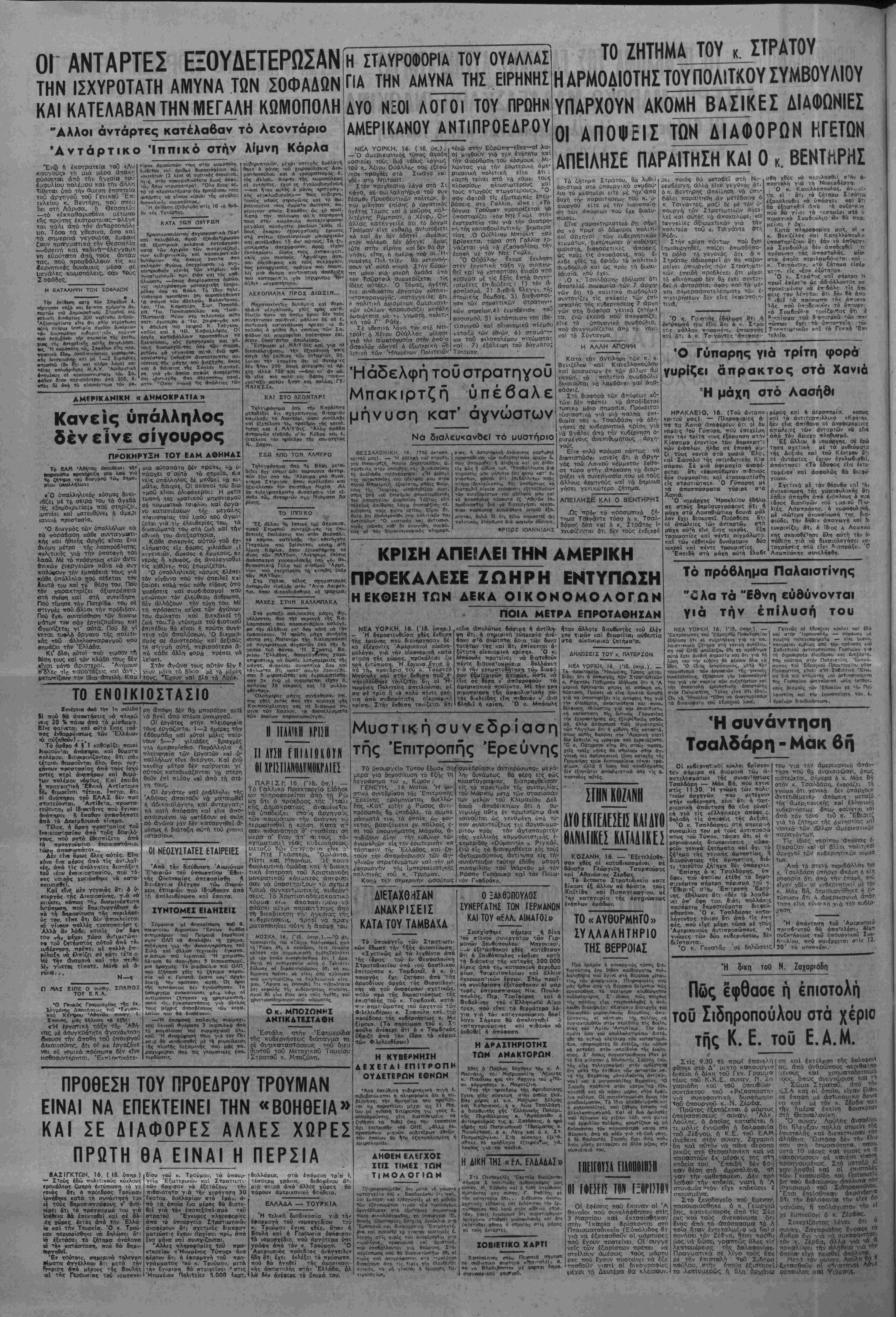 ση διά τού στόματθς τού <3ινΤιπροσώτϊου Της Γκρομύκο άνεγ»ώρισΐ ,οΰς Ιστθρι. κοΰς δεσμοΰς των Εβραίων μί την Πα- λαιστίνη καΐ την Ικανθττοίηοη τών ί. δραίκών διεκδικήσεω»». Ή ουνάντηση Τσαλδάρη - Μάκ βη ΟΙ κυβερνητικθΐ κύκλοι βρίσκον Τχ'ν σήμερα σέ άναμονή των «· ποτελεσμάτων τής συναντήσεως Τσαλδάρη — Μάκ Βή, πού εγινε στΐς 11.30. Ή γνώμη τών πολι¬ τικών αρχηγών. ποΰ μετέχουν «Πήν κυβέρνηση, είνε δι ι ή άι·ί- ρικανική απαντήση θά είνε εύν«ί- ι;ή γιά τίς «έλληνικές» άπόψε.ς, δηλσδή τίς άπόφεις της Δεξιάς. Ό κ. Τσαλδόρης. στή σημερινή συνομιλία τού μέ τούς άντιπροσώ ττθυς τοΰ ΤΟπου, τόνισε δτι οί ά- μερικανικές διευκρινίσεις ^ «άφο- ροΰν γενικα ζητηματα καί οχι τβ ζήτημα τής γενικής άμνηστίας, ή οιευρύνσεως τής άμνηστίας, διό¬ τι τοιούτον ζήτημα δέν ύπάρχει». Έπίσης ό κ. Τσαλδάρης. ΰπ δψει τού όποίου ετέθη τό δημο- σιευόμενο σήμερα πόρισμα τοΰ <■ "Εθεριτζ στήν Έπιτροπη Ερεύ¬ νης, εδήλωσε ότι «δέν τό λσμδά- νει ΰπ' όψη τού, διότι ιτολλάκις παρόμθα δημοσιεύματα διεψεύ- σθηο-αν». Ό κ. Τσαλδάρης καΓα- ληγοντας τόνισε δτι άπό τίς ίττ-ϊ φές, ττού εΤχε μέχρι τώοα μέ τθΰς Άμερικανούς άντιττροσώττους. οί γνώμες των δύο κυβερνήσει δέν διίαταντα'.. Ό κ. Γονατάς σέ δηλωσεις τού νιά την άμερΐ/.ανΐκή άπαν· τηση πού θά άνακοινώσβι, όπως πιστεύεται, σήμερα ό κ. Μάκ Βή στόν κ. Τσαλδάρη, έκφράζει τή γνώμη δτι γενικά δέν ύττάρχθιιν άντιτιθέμενεΓ άπόψεις μεταξύ τής άμερ;κ*νικής καΐ έλληνικής κυέερνήσεω; δπωΓ φαίνεται χαϊ άπό τόν τόνο τού κ. "Εθεριτί γιά τό ζήτημα ^ άμνηστίας χαι νενΐκά των αλλων άμερΐκανικών παραγόντ«ν. Τίς ίδιες περίττου άττ6Ψεις (-· ξέφραζαν καΐ οί δλλοι πολιτι.κοΐ άργιιγθΐ των κυβερνητικήν ν.ομμά τω». ,Από τδ στενό π«ρι6άλλθν το5 χ. Τσχλδάρη ΰπήρχε άκόμη ή πλη ροφορία δτι άπ6 τήν έπαφή, ποΟ είχον χθέ^ Οί νΐ'δερνητικοΐ μέ τόν κ. Μάκ Βή, δηιιΐθυργήθηκε Λ ?ν· Τύττωση δτι ή άμερΐκανΐν.ίι Οπάν τηση είνε εύνΌ-κί, γ,ά την κυδέρ- 'Η απαντήση Τού Άμεοικονοϋ —ρεσβ'υτθθ θά άττοτελέσει θέιιβ θυϊη^ήσεως τοθ ύπθυργικοΰ Συ«· ί)"ΐιλίου, ττου συνίρχετβι στ'^ 12. 30' ό έ τό 'Η δ>κπ τού Ν. Ζαχαριάδη