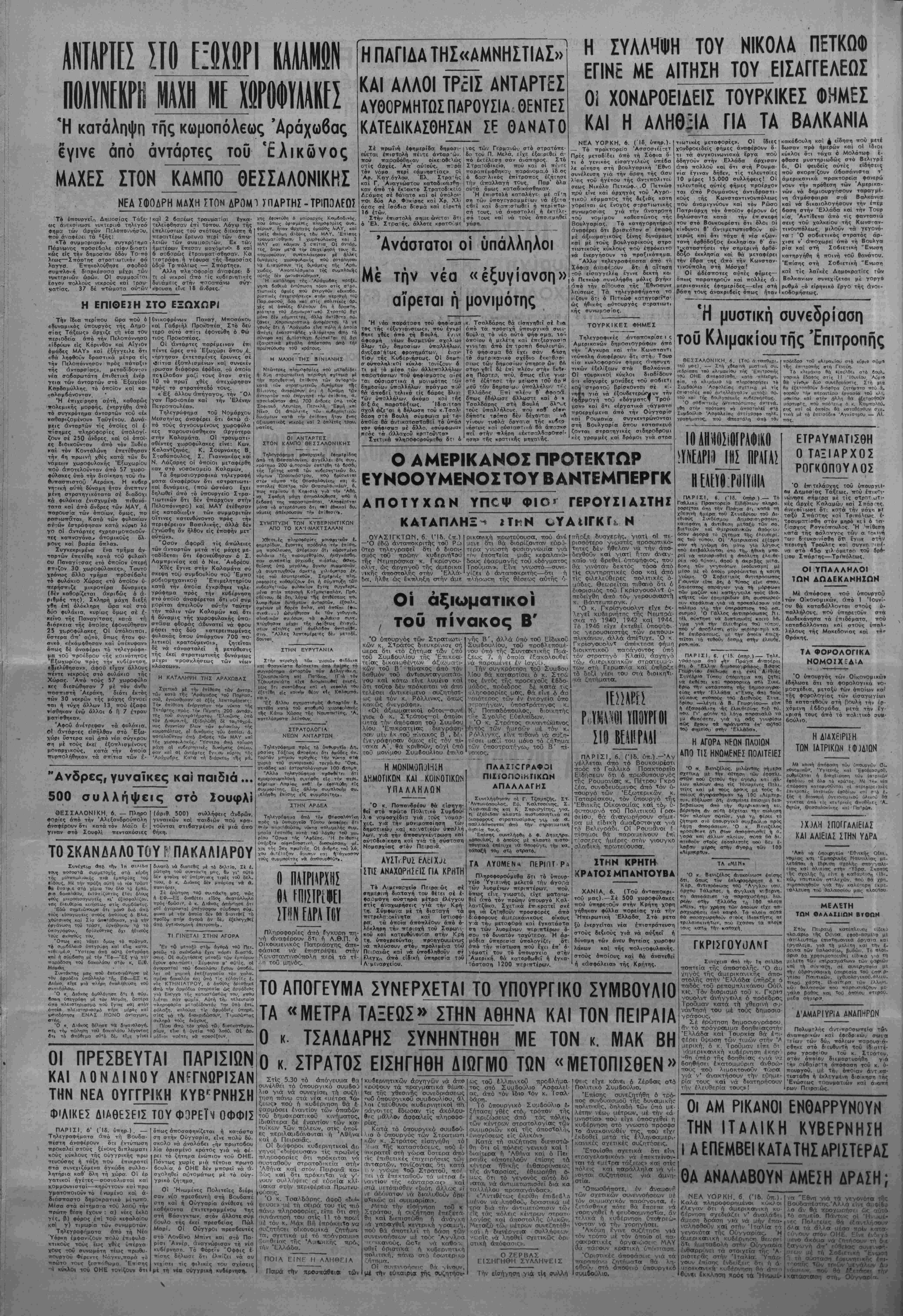 ",<ΗΐθΓίας τής Άμβρικής τιρόι, την Ελλάδα. ΠΟΙΑ ΕΙΝΕ Μ ΑΛΗΘΕΞΙΑ Πεψά την προσπαθεία των κυβερνητικών άργηγών νά άττο κούψουν τα τΐραγμοττικά θέαα- Τα τής γ,θεσινης συνεδριάσεως ι·ϋθ ΰπουργικοΰ συμδουλίου, αΧ λοι ιΐπεύθυνοι ικυδερννιτικοΐ πά οάγοντ^ς έδωσστν τίς ακολού¬ θως μάλλον άσφαλεΐς πληροψο- Κατά τό ΰπουρνικά συμδού- ιο ό ΰττουργός των Στρατιωπ κων κ. Στρατος ε'ιοηγήθη τό :? αα Της καταστάοεο^ς, πού ί- Ίτικρατεϊ στή γώρα ϋοτερα άττο τίς έπιθετικές έπιγειρήσεΐς των (ίΐνταρτων. τονίζοντας ότι κατά ι. ν γνώμη τοϋ Στρατοϋ. Τίθί1 ~ει ν ά έττεκταθοΰν τα μέτρα ε¬ ναντίον τής «άνταρσι'ας» καί στά υττόπισθρν «-διότι άλλως ϊϊ νέ αδύνατον να διαλυθοΰι; όρι- οΤικώς αί ουιιμορίαι». ιΓΛετά την εϊοήγηοη τοθ κ Στρατου. ή ουζήτηση έπείετΊ- θη καΐ οιετηστώθη ή άνάγχη -ά χαροιγθεΐ κεντρική γραμιιή, πού θάάττοτελεΐ τή 6άση'των συνεννοήσεων υε τούς Άγνλοα ΐΓ·-ικανούς, ώοΤρ νά καβο<. οθεΐ όριστικά ή κυδερνητκή πολιτική. ιτάνω στό έσωτερικο ζή μ Οί σιιντΛ·οήοεις Θά -γίνουν, μ* την εύκαιρια της βυζητήσΐ:· ως τοΰ έλληνικοΰ προδλήμα- τος στό Συμδούλιο Ασφαλεί¬ ας, άπό Τόν ϊδιο τόν κ. Τσαλ· 6ά οη. ίό ϋττουργικό Συμβούλιο ε¬ ξήτασε νθές «τό,. τρόιτον της έ κριίώσεως άπό τάς ττάλειι, των κέντρων στρατολογίας των συμμοριών κσ'ι τής άττοσΤοληι, ένισγι'-'οεως είς ΰλικΛν», Κατά τή συζήτη<τη διεπιστώ¬ θη δτι οί πόλεις γενικά καΐ ! διαίτερα ή 'Αθήνα καΐ ό Πει ραιδς «άτιοτελοΰν έτιίσης τα κέτ:ρσ ήθικής ένθσρρυνσεως της άνΤαρσίας, εθεωρήθη 6- ΐ-ΐο."ς δτι τό γεγονός αΰτό δύ νσται_ νά άντιμετωπιοθεϊ διά κα ταλ,λήλου προπαγάνδαν. «Αντιθέτως εκρίθη ίπιδεδ1 η ιιέιθν νά ληφθούν δραστικά αέ ΊΓ>α διά τήν άντιυετώπισιν τ<7»»' ^ΐς τάς πόλεις κέντρων ατρατ,■ λογίσς καΐ άποοτολης υλικών. Μετσξΰ τών μέτρ<<>ν συνεζητήθη