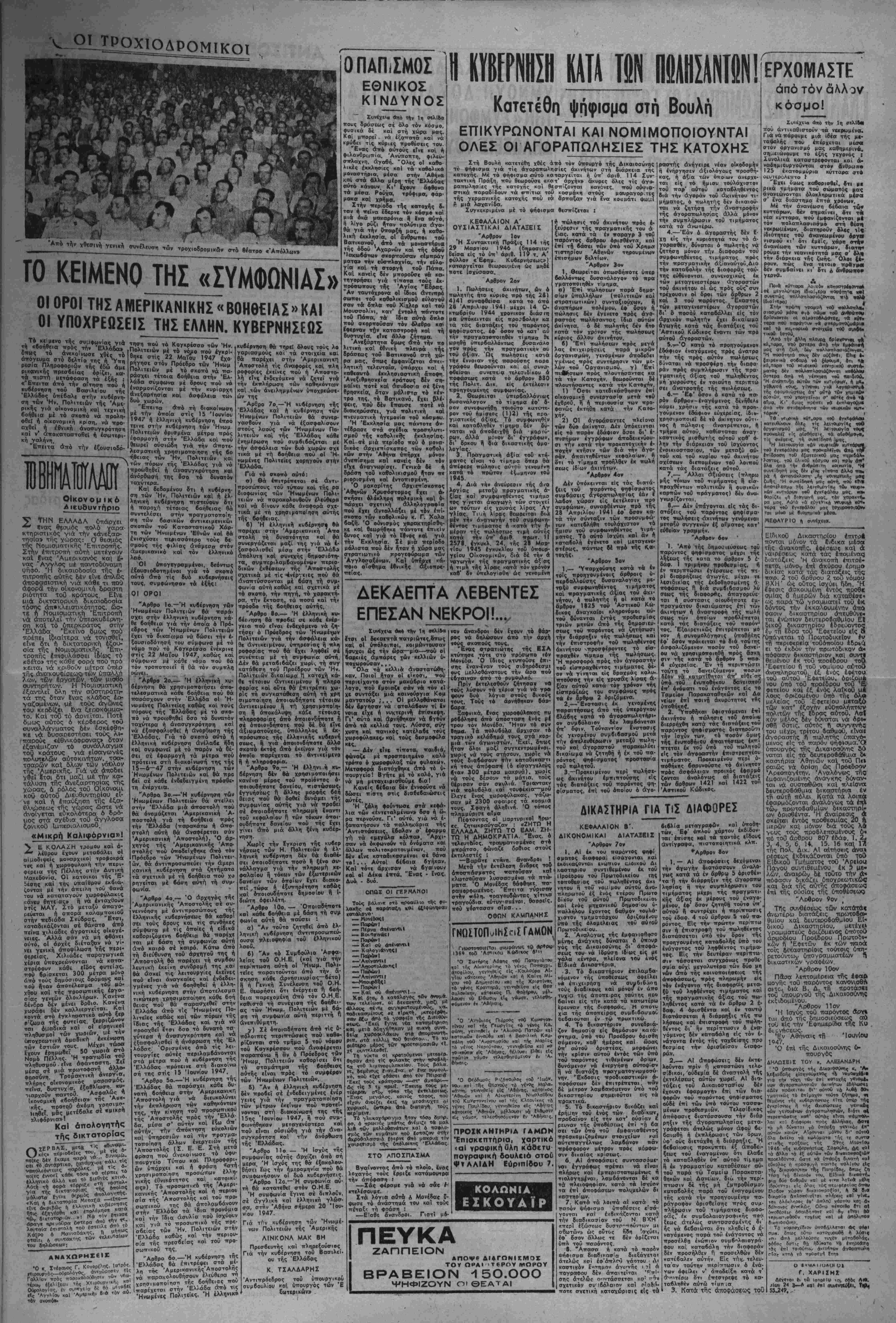 <£ΐ τόν τρόπο τής παροχής τής άμερικανικής βοηθείας. Στήν έλληνική Βουλή δέν κατετέθη ιτοτέ άλλοτε πιό καταττληικτικό ίγγραφο. Μα καΐ ποτέ άλλοτε δέν βρεθή κη ηιό άνάξια κυδέρνηση, πιό δου λική, ώστε νά δεγθεΐ νά βάλει την ύπονραφή τής Ελλάδος κάτω άπό Μνα τέτοιο κείμενο. Ό νόμος μέ τόν όττοΐο, ΰοτε 'ρα άττό την γρεωκοπία χαΐ την ηττα τού 1897 Ι&ρύθηκε ό δια- βότττος Διεθνής ΟΙκονοιμικός "Ελεγγος, ώγ,ριδ μπροοτά στό νβεσινό Ιγγραφο. Ή σομΦω- νΐα τού Λονδίνου τοΟ 1946 τιαΐρ νει τη μορφή θοοιτεΐοχ;, ϋστεοα άπό τή ,γθεσινη συμφ&Λ/ία Καΐ οέ τουτα τα κείμενα επρόκει¬ το ττερΐ ρυθιΐΐσεως τταιληών ό- Φειλων καΐ λήψεως νέων «ένι- Βτγύσεων»·, ένδ ή γθεσινή συμ- Φωνία άττοβλέιτει μόνο οτά ττΰς θά διατεθεΐ ή «βοηθεία» ιτοΰ ΘΑ μδς δώσουν οί Άμερικα- νο(. Ο5τβ γώρα ήμιανρια, -τού δέν εγει συνεΐδηστι της 'Ανεξαρ τηοΐας της καΐ της έθνυκής της αξιοπρεπείας. Οθτε χώρα ήτ- λις οί βιατάΑεις της είνε, ή μιά νίΐρότερα άπό την ώλλη, οεαμευτικές της χυβερνητικής βλϊυθερίας, χατα(λ.υ-ικές τής έ- θνικής Άνεξαρτηισίας, προσ- βληίτικές τής έθνικής άξιθποέ- πβιας! Καΐ ή #Ελλσ)δα πού ύπογρά φβι αυτή τή συμφωνία είνε τοι- ρα .σομματγος των Ήνωμένων ΓΤολιτειωνΙ Είνε γώρα ττοΰ ττή· ρε μέρος στόιν πόλειμο καΐ νίκη σε. ΕΤνεή νώρα ττού κατέπλη- ςε τόν σύμπαντα κόσμο μέ τούς ηρωΐκούς αθλους τοΟ Λαου της, ιμέ την αύτοθυσία τού, μέ την βτιαοάμιλλη άντίστασή τού οτούς κΐσβολεΐς καΐ τούς κατα «τητές. Είνε ή γώρα -ού ώ έ η άί νοδουλίου. "Ομως οί λαοπρό&λητοι τΐ- νβ συνεπεϊς. Καΐ σάν πολιτικοϊ ΐ καΐ σάν κόμματα χαί άν τομα, οί ττερισσότερο·, πούλησαν καΐ πρόδωοαν την 'Ελλάδα χαΐ τό Λα6 της στούς Ίταλούς καΐ τούς Γερμανούς ικαΐ Οστερα στούς "Αγγλους. ΓιατΙ, τάγα, δέν θά Εκαμαν τό Ιοιο καΐ μέ τούς ΆμερικσΛΌύς. άφοΰ τώόα τιιά οτ* αύτούς άπο κλειοτικά στηρίζονται οί έλπί- δες της νά άποφύγουν νά δω σουν λόγο στό Λαό, γιά τα ά- ττειράιριθμά τους έγκλήμαια καΐ ν« συνεγίσουν νά τόν έκ μεταλλεύονται, δτΐως μέγρι σή μερά; ΧωρΙς την άμ-.ρικανικη έπέα βαση τό καθεστώς τους θά εί· χε καταρρεύσει μέσα σέ εΐκοσι τέσσαρες ώμες, κάτω άπό την έξέγεροΓ τοϋ έλληινικοϋ Λαου. 16 είπε ό τφόεορος Τροΰααν σ-ιό διάγνελμά τού. Πως λοι- πόν νά μην τα παραδώσουν ό λα στό σωτήρα τους καΐ πώς νά μίι γειροκροτήσουν δταν ή ύτιοδοόλωση τοϋ Λαου μας έ ξασφαλίζει τή δική τους έλευ θερΐα νά τόν ληστευουν, νά τόν βασανίζουν καΐ νά τόν δολοίο νοϋν, χωρίς καμμιά όλλη γι' αύτούς ( συνέττειαΑ παρά την ά νετη χώνεψη των προΐόντωιν των χιλοττών καΐ των ληιστε«ών τους Ι Α ΕΙν* δμ«ς πραγματικαί ή συμ- Φωνια τέτοια τού την έμφανιζου με; Δέν ιτρΟΜΐται έδω να άνα)ύ- ο·οι>μ( μιά πρός μιά τίς διόφο-