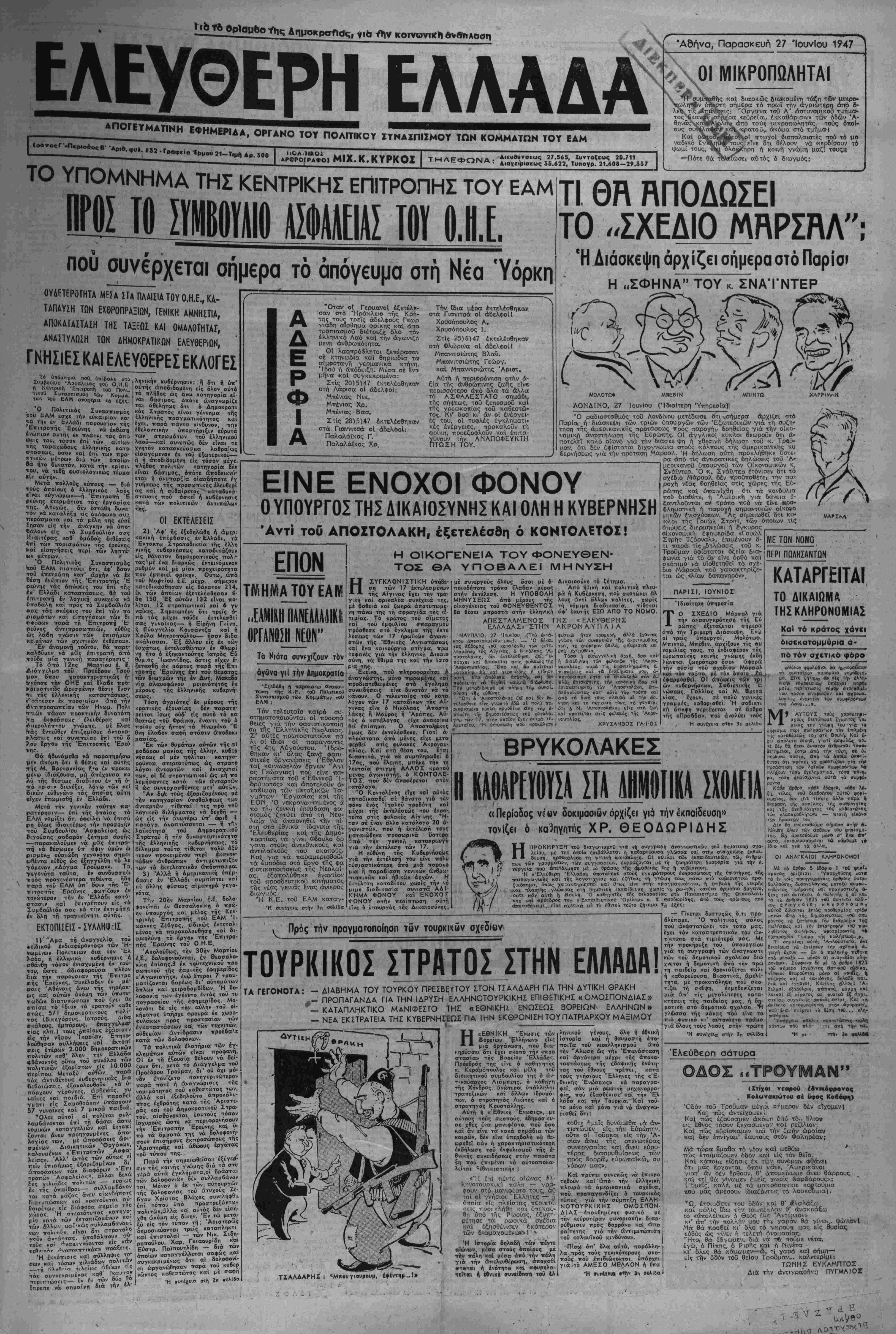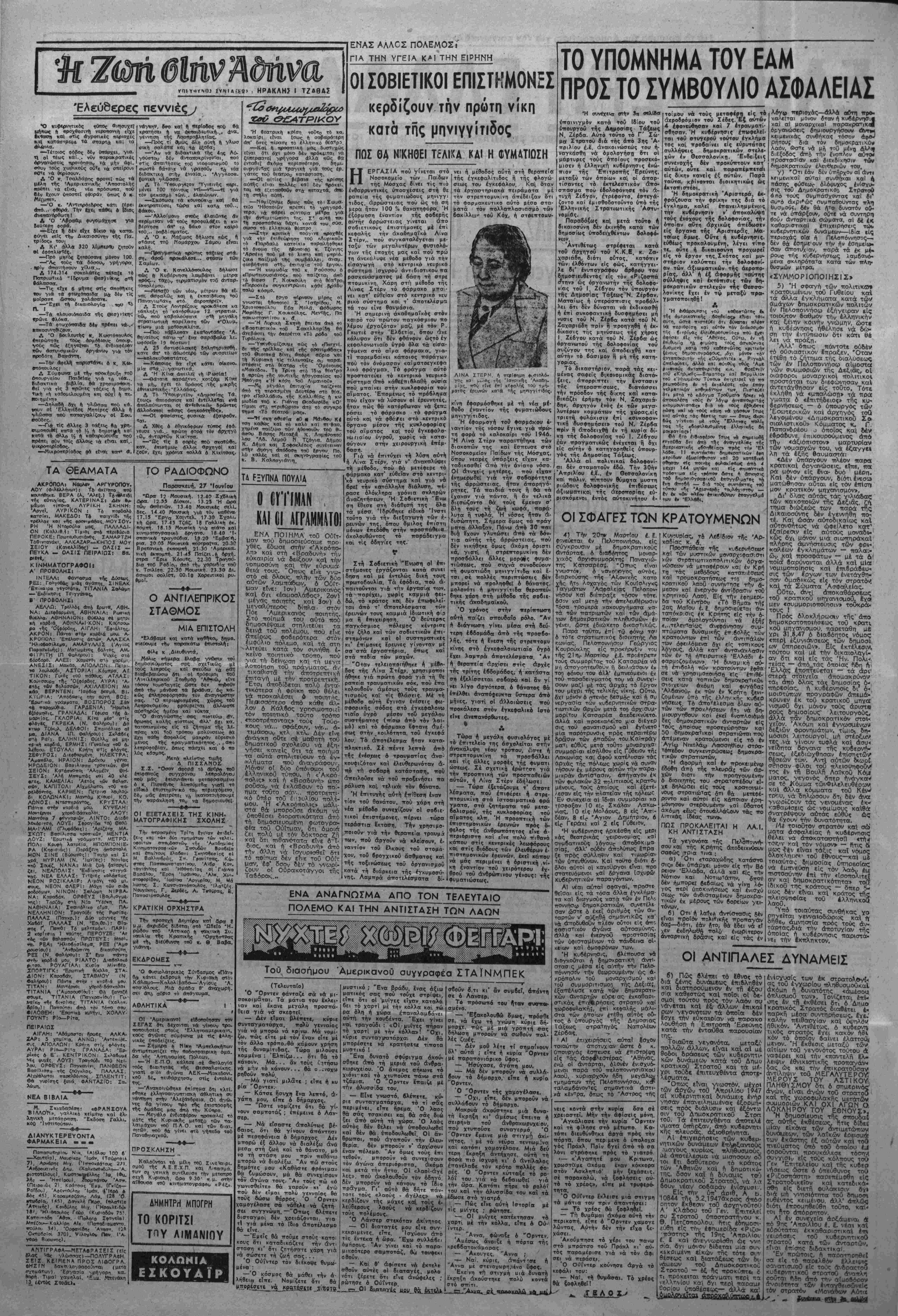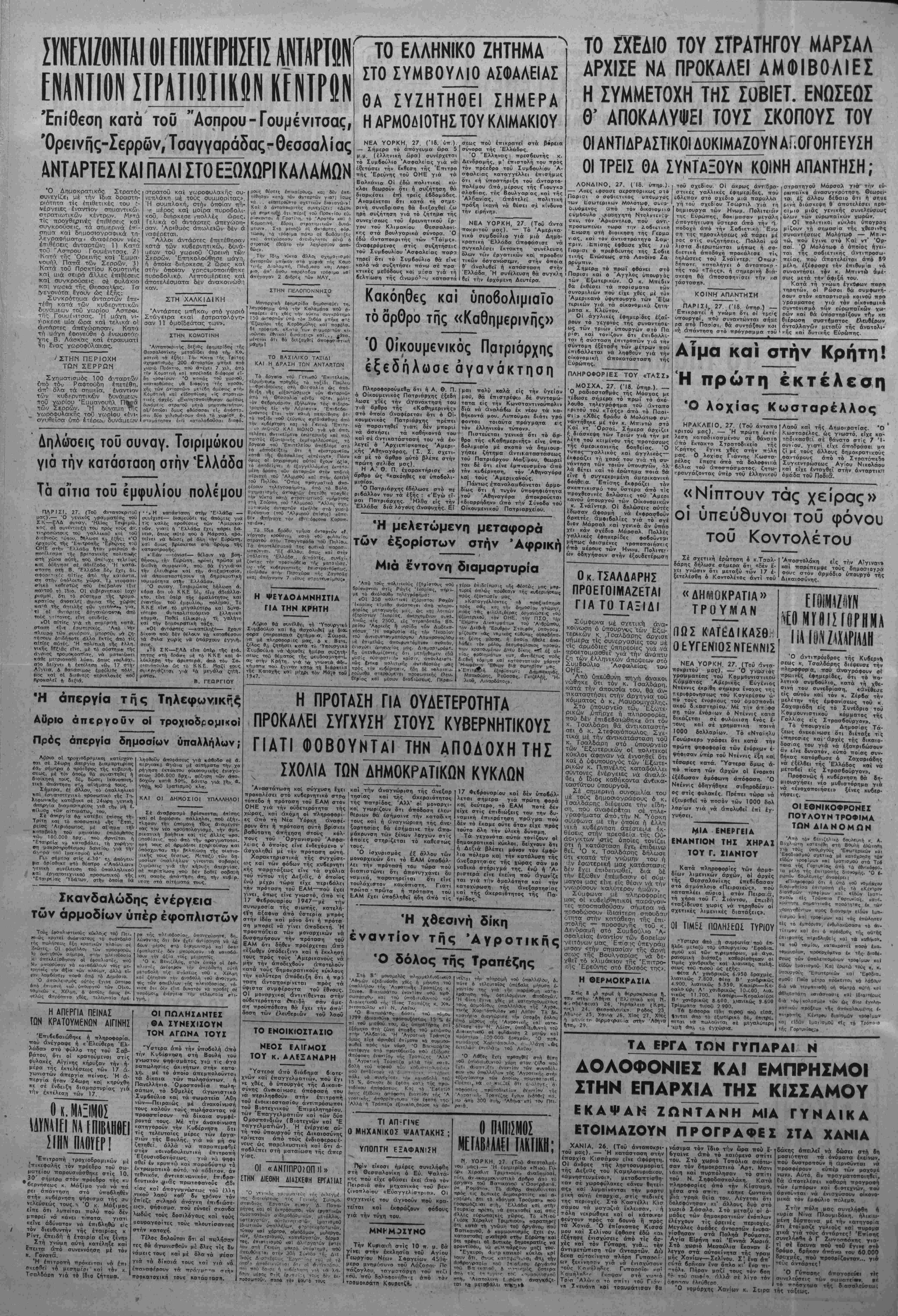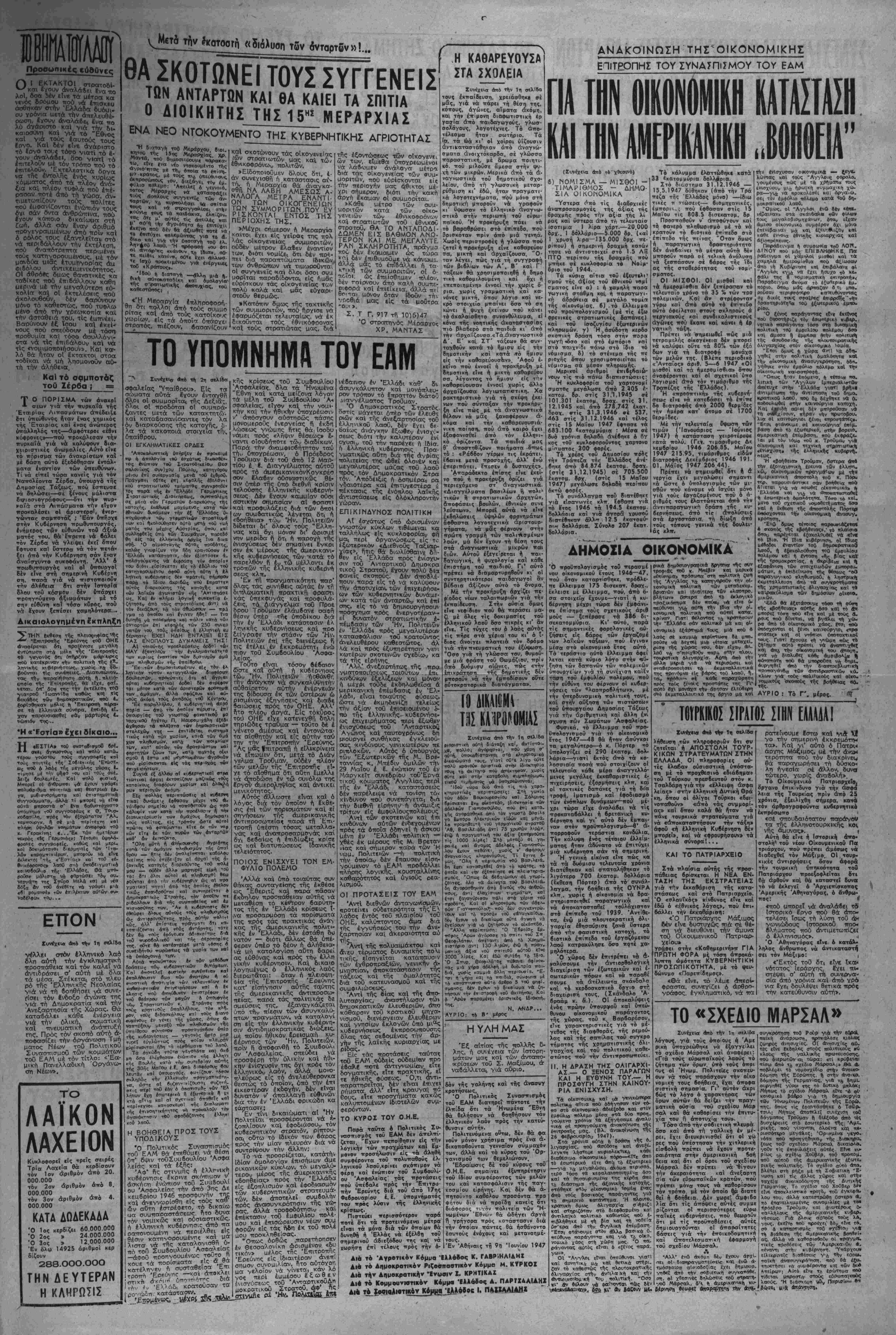 Ονοίς Διασκέψεως Έργΐ-- Ιας <ό μΐ τ δ ς ψς ς ττθ'ο οπτοδεικνύετθι δτι οί ττοι ΤΓβυ δριστ ή κυβέ^νηαη Υ'Α νΆ Λονν μίρσς βτϊς έρ/β^!-.ς τους δί-ν Ο ποοά τ6ν 4βντ6 τους έκ· ΕΑΜ έ'χει ύποδληθεί ήδη άπό τίς τρίδος. 17 Φεβρουαρίου και δέν ύποβόλ- λεται σήμερα γιά πρώτη φορά καί όεύτερο, τό ΕΑΜ ττοτέ δέν είχε στΐς έπιδιώξεις τού την ου- νσμική επικρατήση ττραγμα ποΰ δέν τό έκαμε οϋτε ό'ταν είχε ττρός τούτο ό'λη την ύλική δύναμη, Τά γϊγονότα αύτά τονίζουν οί δημοκρατικαί κΰκλοι, δείχνουν δτι ή Δεξιά βλέπει μόνον τόν ΐμφύ- λιο πόλεμο καί τήν κατάλυση τής άνεξαρτησ.ας της χώρας σάν μο ναδικό στήριγμά της, ένφ ή Ά¬ ριστερά είνε έκείνη ττού άγούν'ζε ται γιά τήν όμαλότητα καί τήν κστοχύρωση τής σνεξαρτησίας καΐ τής όκεραιότητος τής Πά- Ο κ. ΤΣΑΛΔΑΡΗΣ ΠΡΟΕΓΟΙΙτΙΑΖΕΤΑΙ ΓΙΑ ΤΟ ΤΑΞΙΔΙ Σύμφωνα μέ σγετική ανα¬ κοινώση ό ύπουρννς των Εξω¬ τερικών κ. ,Τσαλδάρης άρχισε σήμερα τίς συνεργασίες τού υέ τίς άρμόδΐες Οπηρεοίες γιά νά προετοιμασθεϊ γιά την ανάτπυ ξη των έλληνικων αποψεων στό Συμβούλιο Ασφαλείας τού ΟΗΕ. , Άπό ύπεύθυνη πηγή εχνακοι νωβηκε δτι τόν κ. Τσαλδάρη. κατά τήν άπουσία του, θά άν¬ τ» κσταστήσει στήν άρνηγία τοϋ κόμματος ό κ. Μαυρομιγάλης Στό υπουργείο τών Έξωτκ ρικων .ύπήργε ή πλιιροφορία, πού δέν έπιβεδαιώθηκε δτι τύν κ. Τσαλδάρη θά άντικαταστή- σει ό κ. Στεφανόττουλος Σχε¬ τικαί μέ τήν άντι·κατάσταση τοΰ κ. Τσαλδάρη στό ύπουργεϊο των Εξωτερικών οί πολιτικοί κύκλοι άφηναν νά έννοηθεϊ δτι κα'ι 6 ΰΦυπουργός τών "Εξωτε¬ ρικών κ. Πιπινέλης καταδάλλει σύντονες ένέργειες νά άναλά- 3ει ό Ιδιος καθήκοντά ανίικα- ταστάτου ύπουργοβ. Σέ σημερινή συνσμιλία του μέ τούς δημοσιογράφους 6 κ. 1 σαλδάρης διέψευσε τήν είδη- ση, πού άναφέρέται σέ τηλε- γραφήματα από.την Ν. Ύόρκη συαφωνα μέ τήν όποία ή έλλη νίκη κυδέρνηση απέστειλε ίκ- θέσεις στήν πρεσβείσ τής Ού- άοιγκτων ,στίς οποίες τονίζει ότι ή κατάοταση £γει έπιδεινω θεΐ. Ό κ. Τσαλδάρης δήλωσε ότι <κατά τήν ννώμην τού ή •έν έσωτερική μας κατάστασις δέν Ι'χτι έπιδεινωθεϊ, διά δέ την έξωθεν επέμβασιν οί σύμ- μαγοι μας είνε είς θέσιν νά την γνωρϊσουν Καλύτερον ημών». Σόμφωνα μέ πλτιροφορίες μας οί κυ6είρ*»ητικθί τταράνον- τες προοτΐαθοθσαν σή.μερα νά _ Σέ σχετική ερωτήση ό κ.Τσσλ- δάρης δήλωσε σίμιρα δτι «δέν 'έ- νει γνώσιν δτι μεταξύ τών 17 έ- ξετελέσθη ό Κοντολέτος άντί τοθ 'ΑτΓοστολάκη είς την ΑΤγιναν» κ«ί τταρέττεμψε τους δημοσιογρά Φους στόν άρμόδιο ϋττοι/ργό τής Δικαιοσύνης. «ΔΗΙΜΟΚΡΑΤΙΑ» ΤΡΟΥΜΑΝ ΠΩΣ ΚΑΤ-ΔΙΚΑΣΘ ΟΕΥΓΕΝΙΟΣΝΓΕΝΝΙΣ ΝΕΑ ΥΟΡΚΗ. 27. (Τού αντα- ποκριτού μας). — Ό γροτμματέας τού Κομμθυνιστικοΰ Κόμματος Άμερικής Εύγένιος Ντέννις εκρίθη σήμΐρα ενοχος της τ.εριφρονησεως τού Κογκρέσου υ¬ πό τούς ένόρκους τού όμοσπονδι ακοθ δ.καστηρίου. Μέ την άττ'φσ ση τών ένόρ<ων ό Ντέννις κατα δικάζεται σέ φυλακίση ενός ί- τους καί σέ χρηματική ποινή 000 δολλσρίων. Τό «Νταίηλυ Όυώρκερ» γράφει ότι κατά τήν πρώτη ψηφοφορία τών ένόρκων ί- ψήφΐσαν υπέρ τοΰ Ντέννις έξη καί τέσορες κατά. "Υστερα δμιος ά- πά πίεση τών άρχών οί ε'νορκοι ξέδωσαν όμόφωνη άπόφαση. Ό Ν*έννις όδηγήθηκε σιδηροδέσμι- ος στίς φυλακές. Πρέπει τώρα νά ιξευρεθεϊ τό ποσόν των 1000 δολ αρί<ον γιά νά άπολυβεΐ επί έγ- γυήσει. 'Η χθεσινή δίκη εναντίον της Αγροτικάς 'Ο δόλος της Τραπέζης Στ6 Β' μονομελές ττλημμελε,οδικίχθ Αθηνών ί,ξεδικάσθη χβές ή μήνυοη τού ύτταλλήλου τής Άγρθτικής Τραπέζης κ Ξενοφ. Βικτωράτου εναντίον τθθ ττρθ' σωττάρχθυ κα| τού ΰττοδιευθι^ντοϋ τοθ ΔιοικηηκθΟ τής ϊδιας Τρα