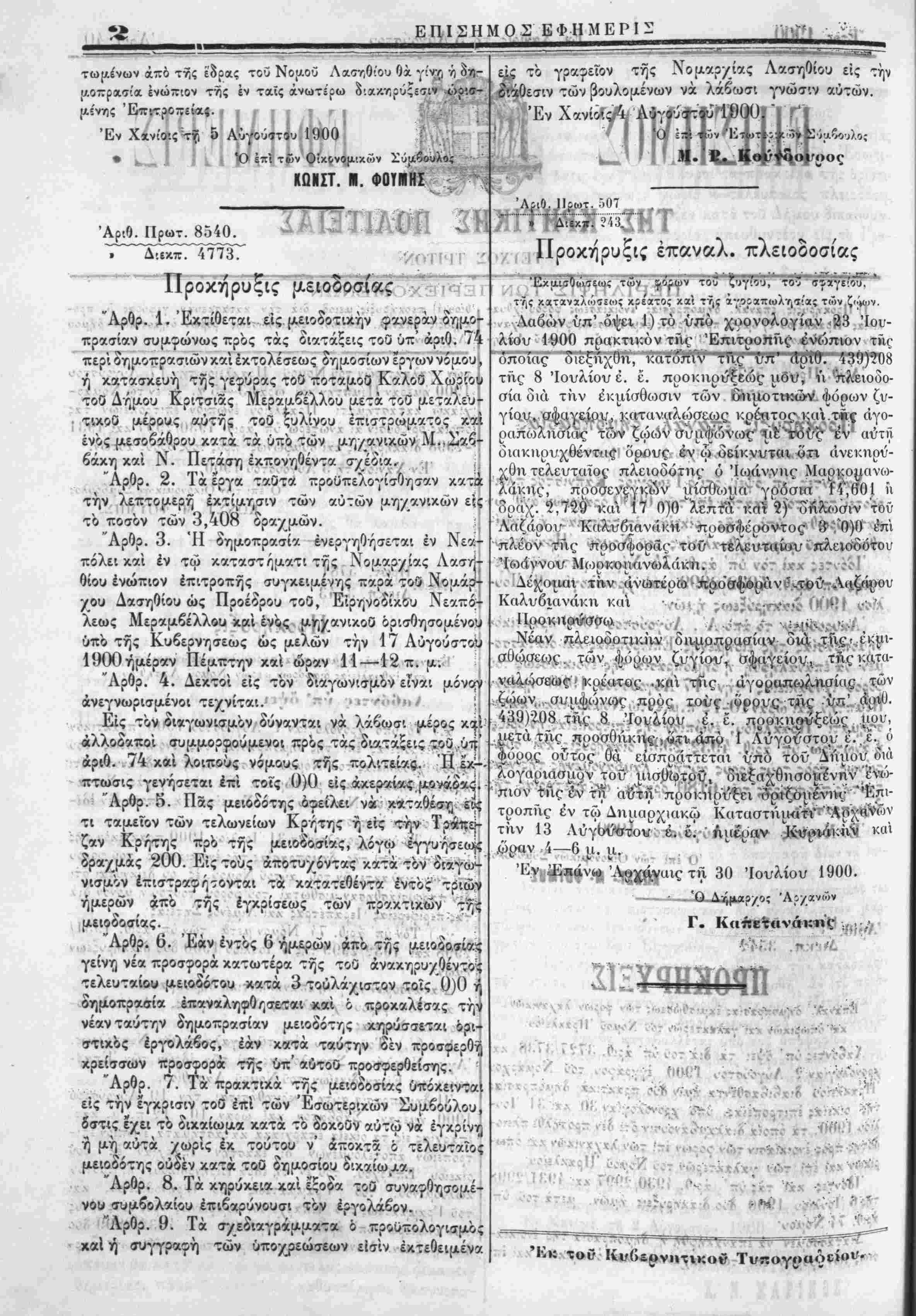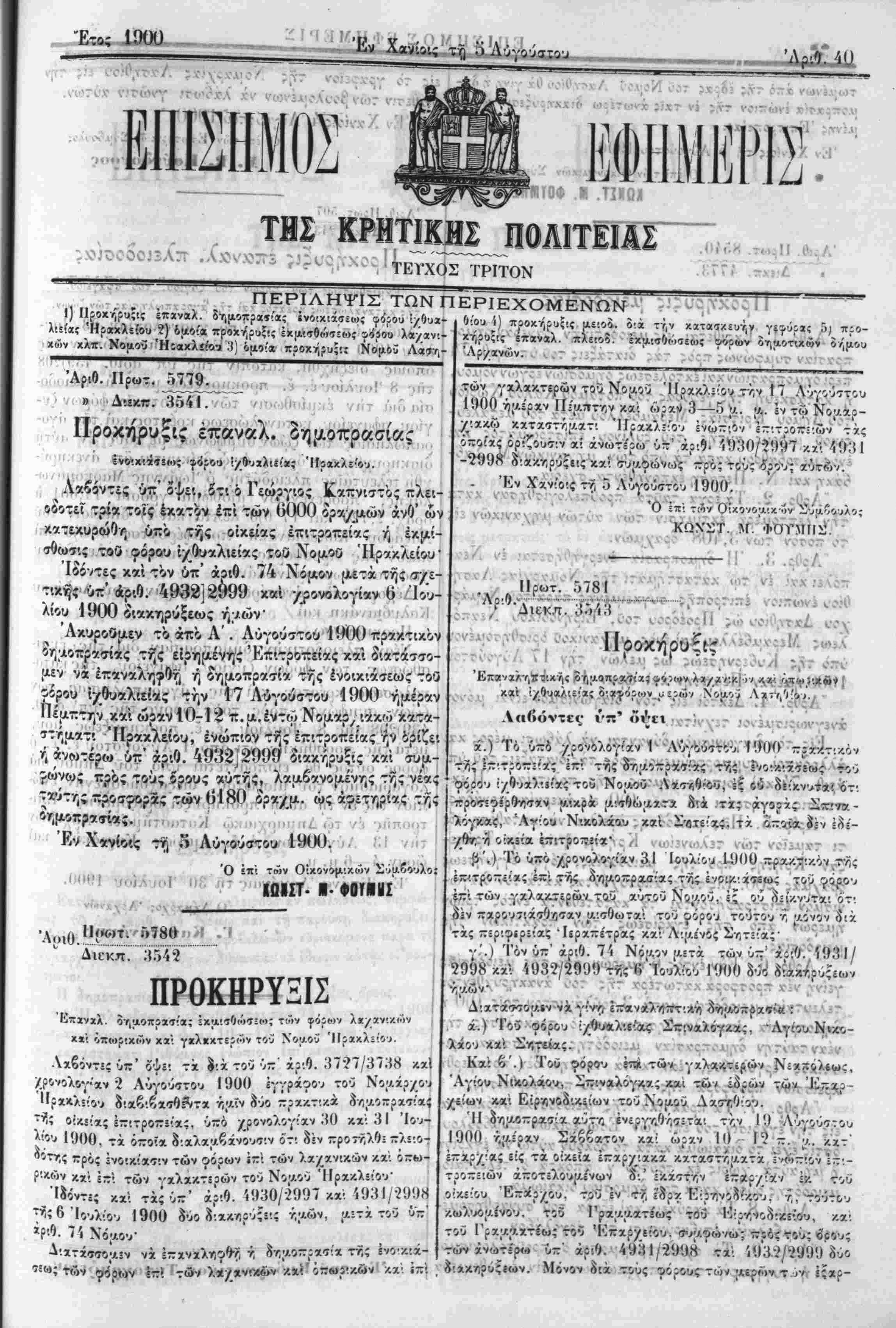 Λαβών υπ' όψει 1) τό υπο χοονολογίαν <23 Ιου¬ λίου 1900 πθακτικόν τΓΐς Έπιτροηίις ένιοπιον τϊκ οποίας διεξήχθη, κατόπιν της υπ' άο'ιΰ. 439)?Ό8 της 8 Ιουλίου έ. ε. προκηυύξεώς ηδυ, ή πλειοδο- σία διά τίιν έκηίσθωσιν των βΐψοτικών φόροον ζυ- γίου, σ^αγείου, κατιινιιλώσεως κρέΗτο_ρ κίΐΐ ^« άγο- ραποοληαίικ; των ζωων συιιφώνωζ^ίιε τοϋν τν αύτη διακηρυ^θέντίΐς δρους έν ώ δείκνυται δή ανεκηρύ¬ χθη τελευταϊος πλειοδόΐης ό Ίωάν.νης Μαρκο^χινω- λάκης, προσενεγκών ιιίσΟΐο|>ΐΓΓ'γρδσιη;"'1ίί,θ*ΟΙ ίι